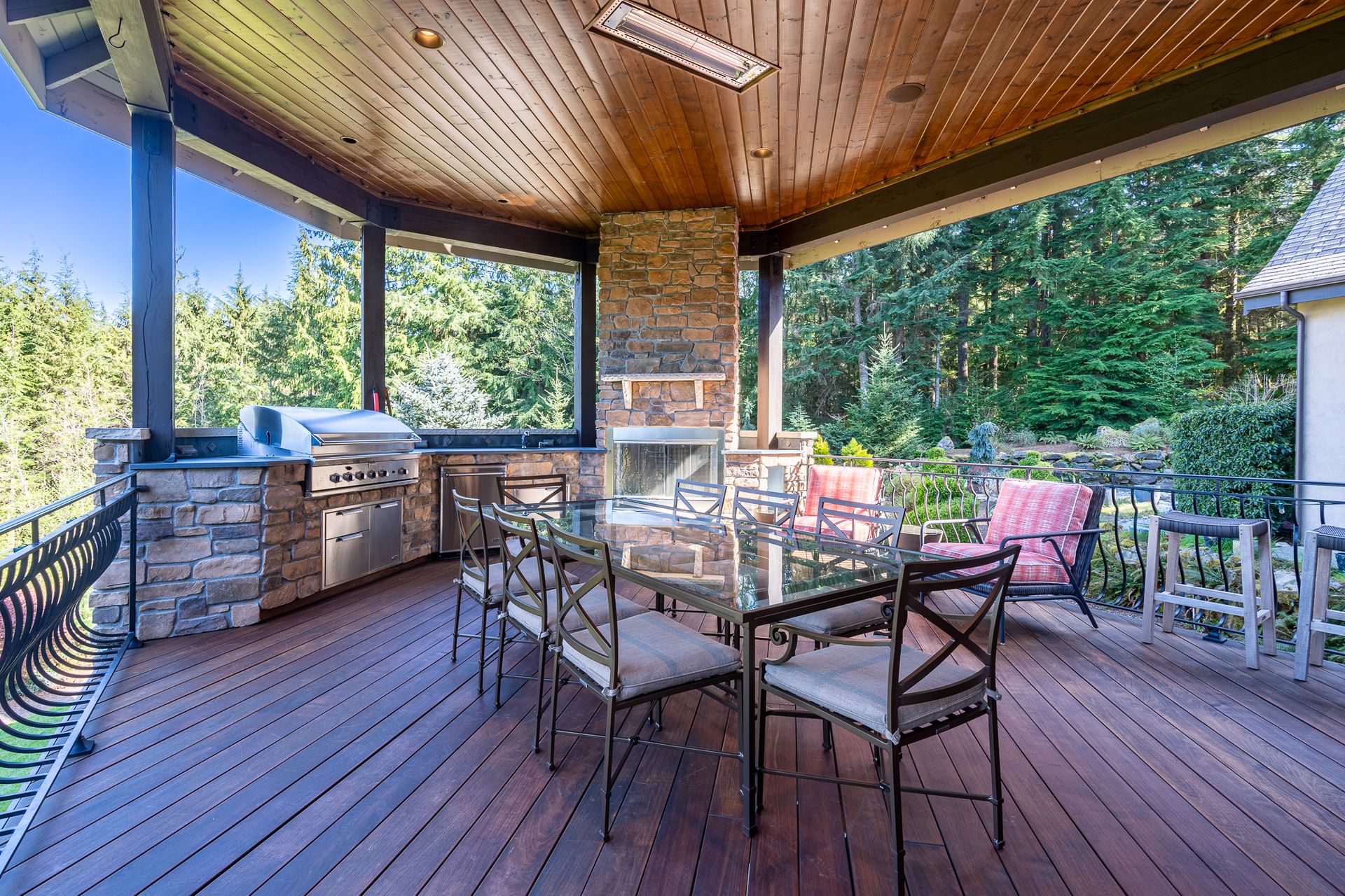 Outside, a Brazilian Redwood deck awaits, offering the perfect setting for al fresco dining under the stars. With heaters, a fireplace, and a gas BBQ, every outdoor gathering is transformed into a memorable experience.