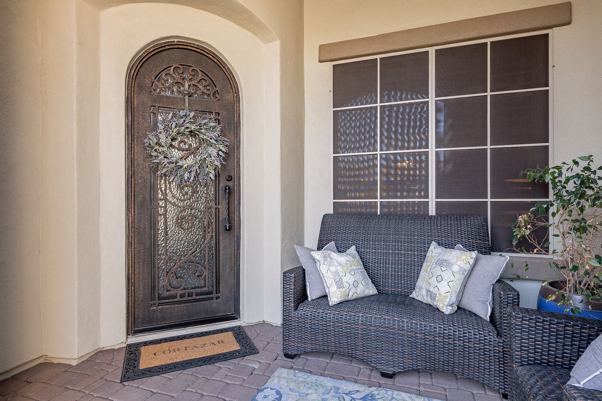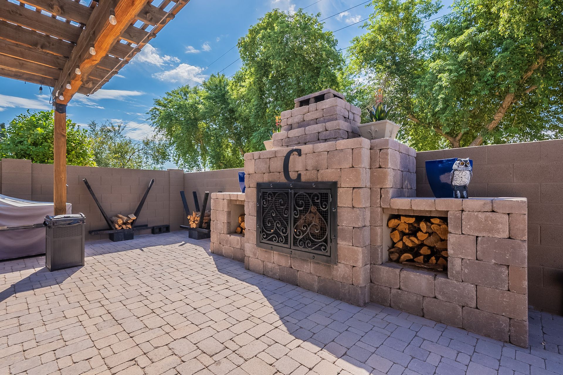 Experience cozy evenings by the custom exterior fireplace or relax in the serene ambiance of your yard. The exterior is equipped with WiFi porch lights and even WiFi-enabled holiday lights, allowing you to create a festive atmosphere with a touch of your smartphone.