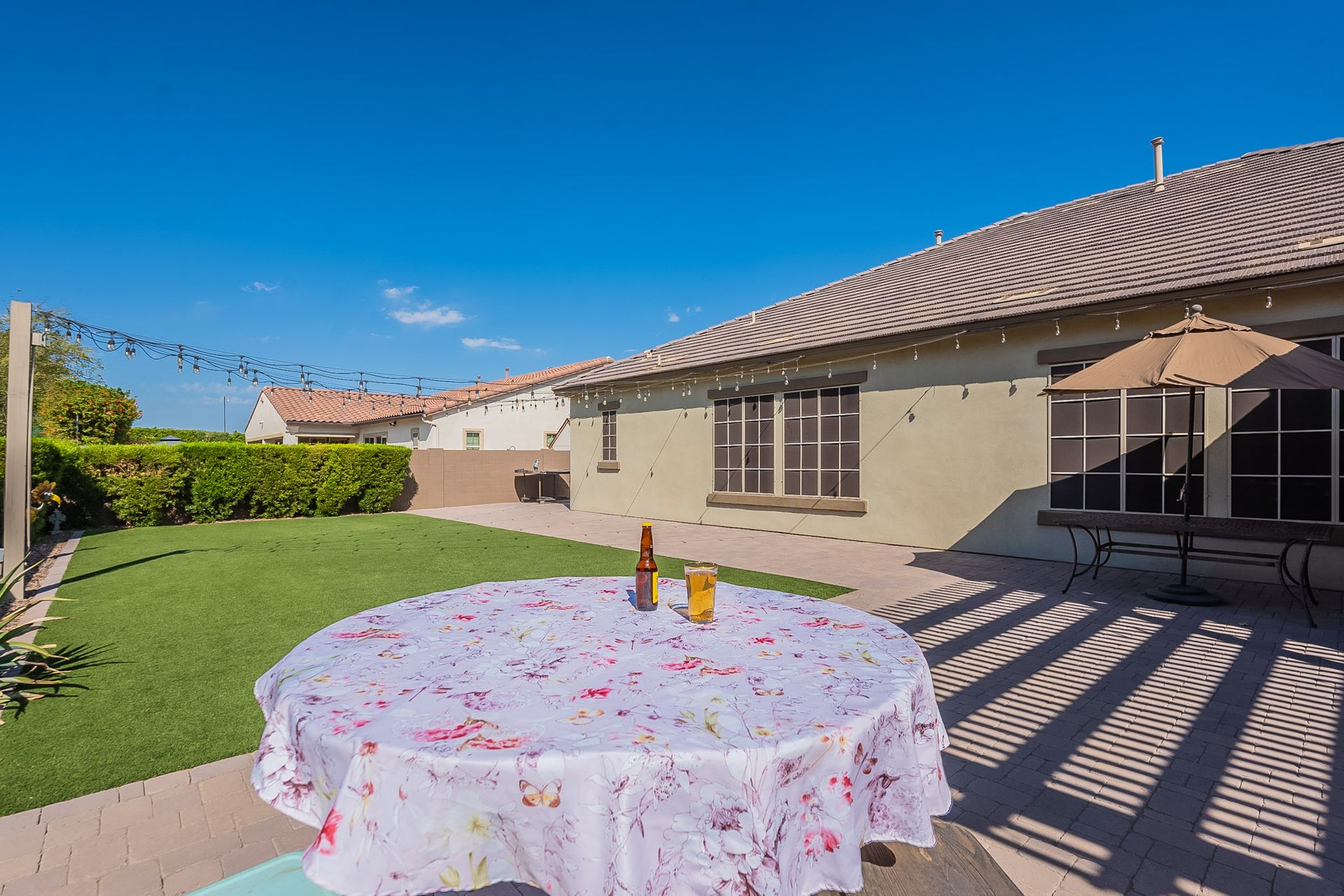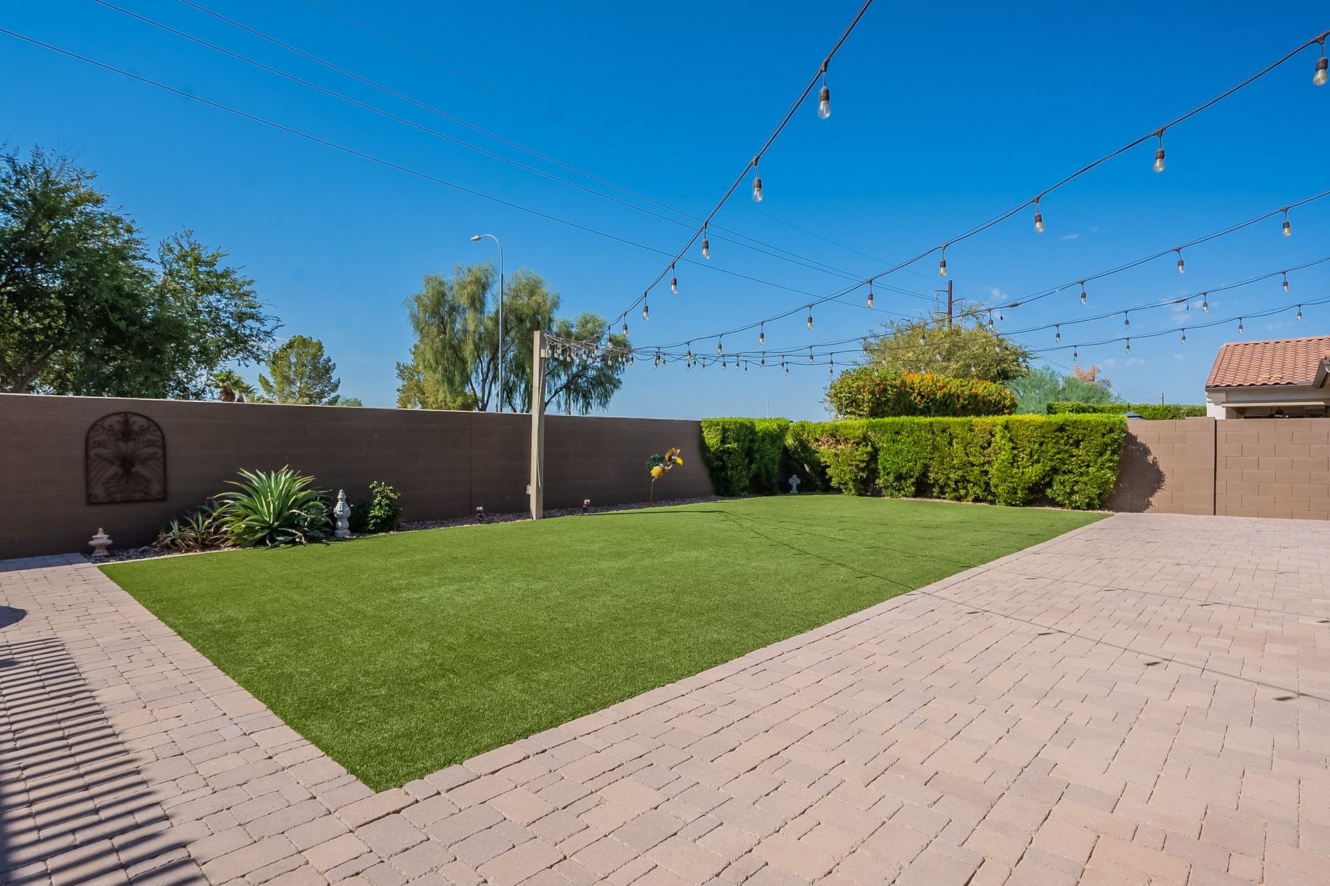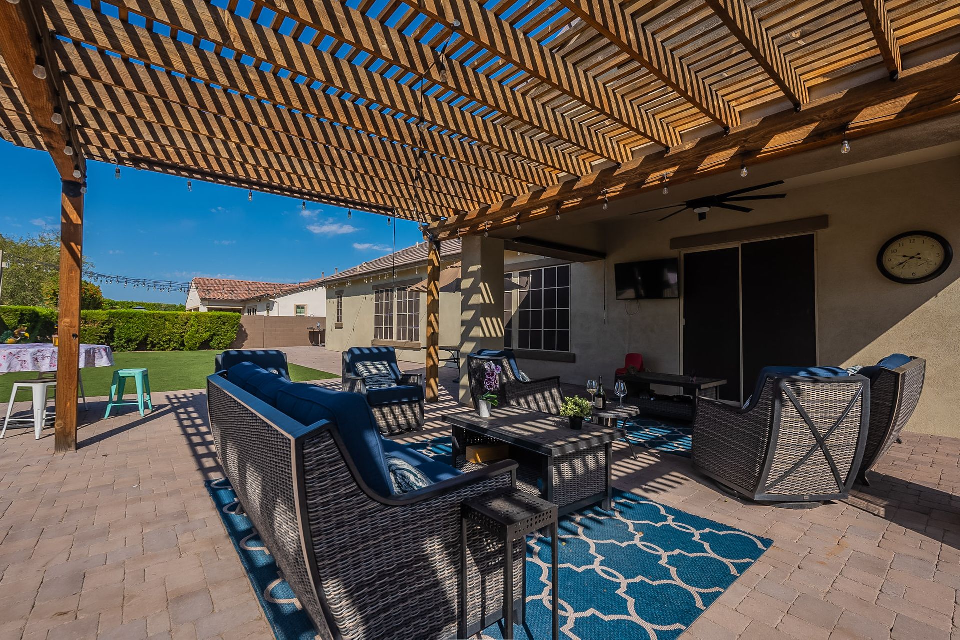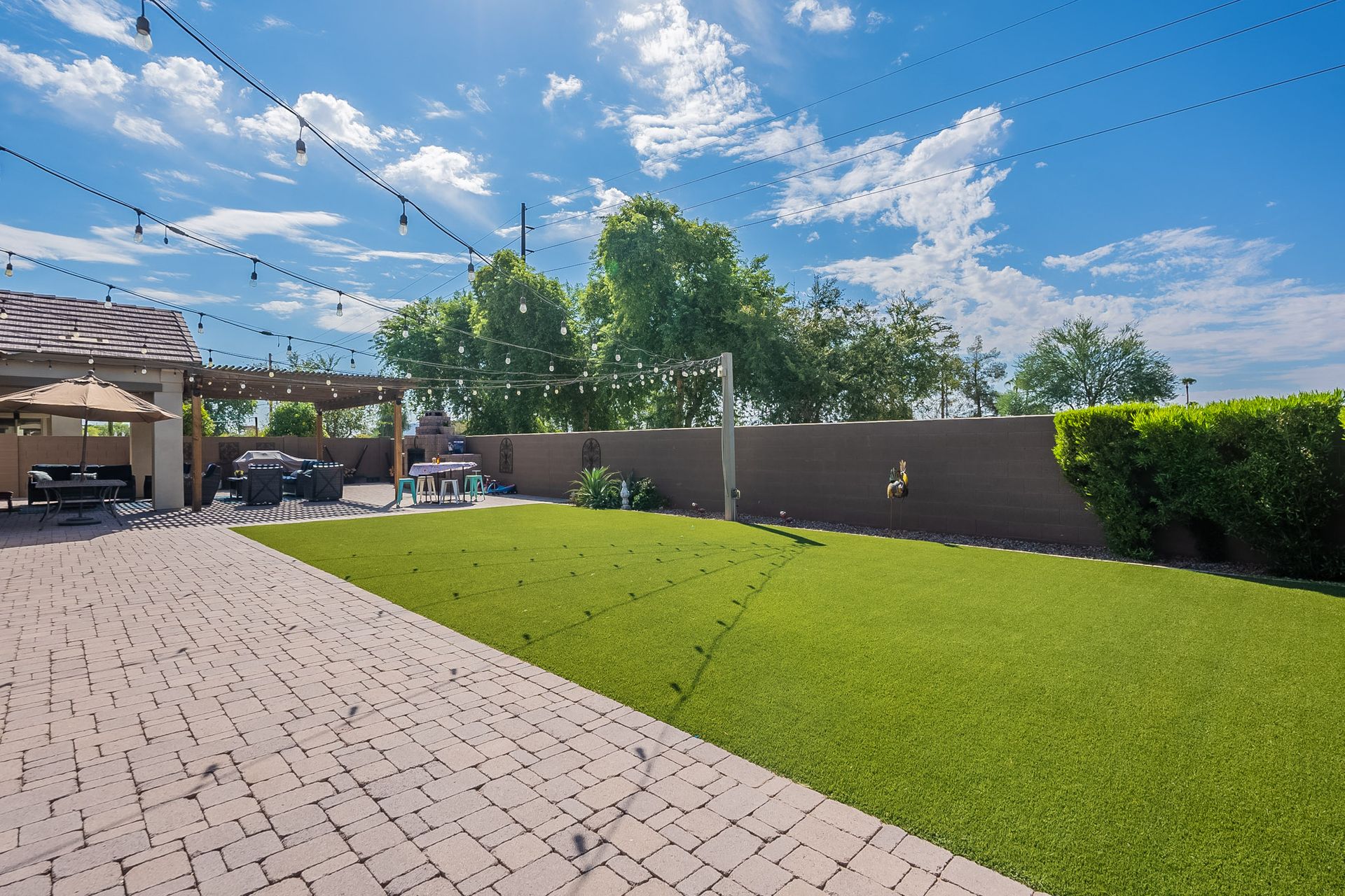 Step outside to your own private paradise. The synthetic grass front and back yard are not only low-maintenance but also eco-friendly. Enjoy the Arizona sunshine under the large pergola, complete with a professional mister system to keep you cool during the summer months.