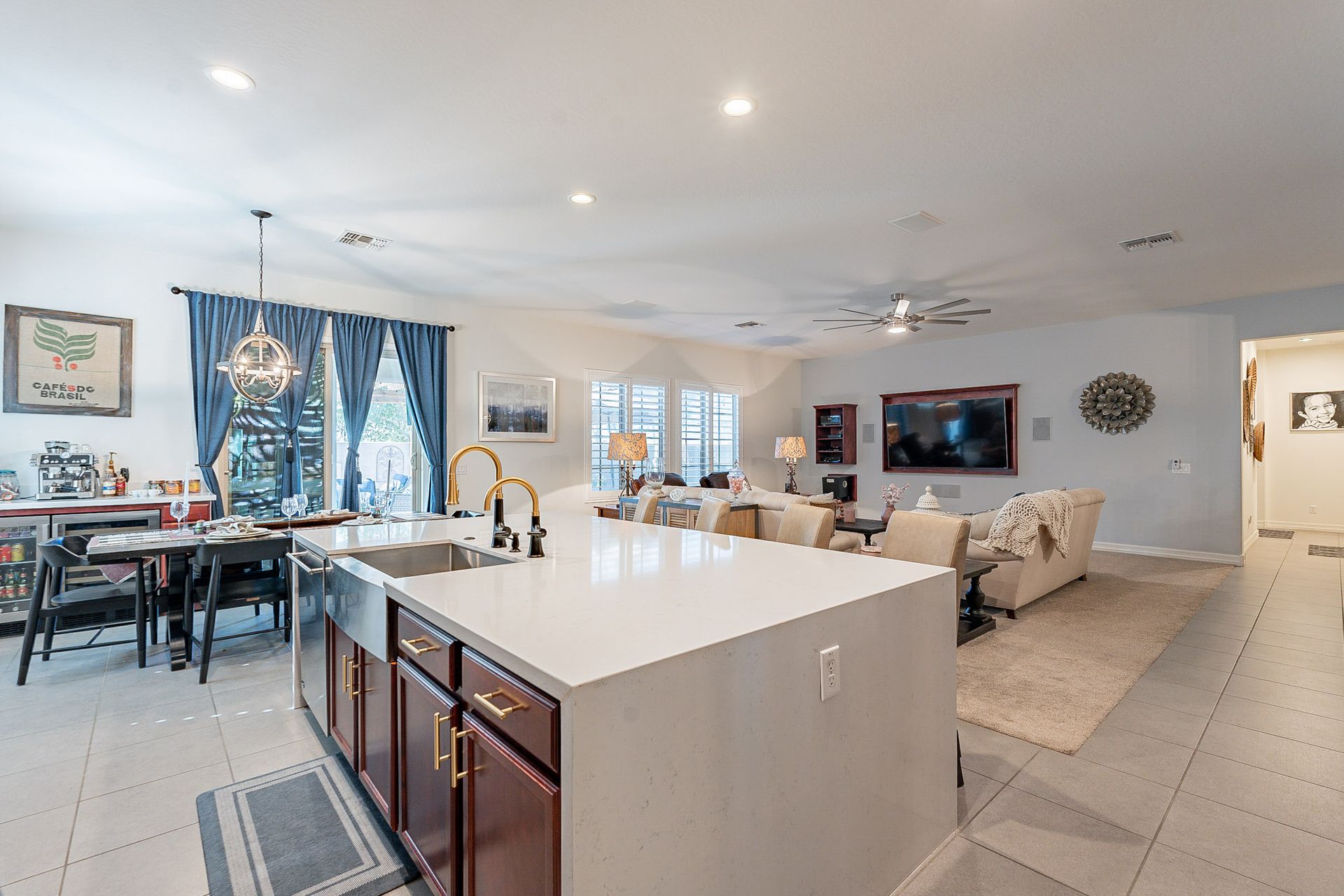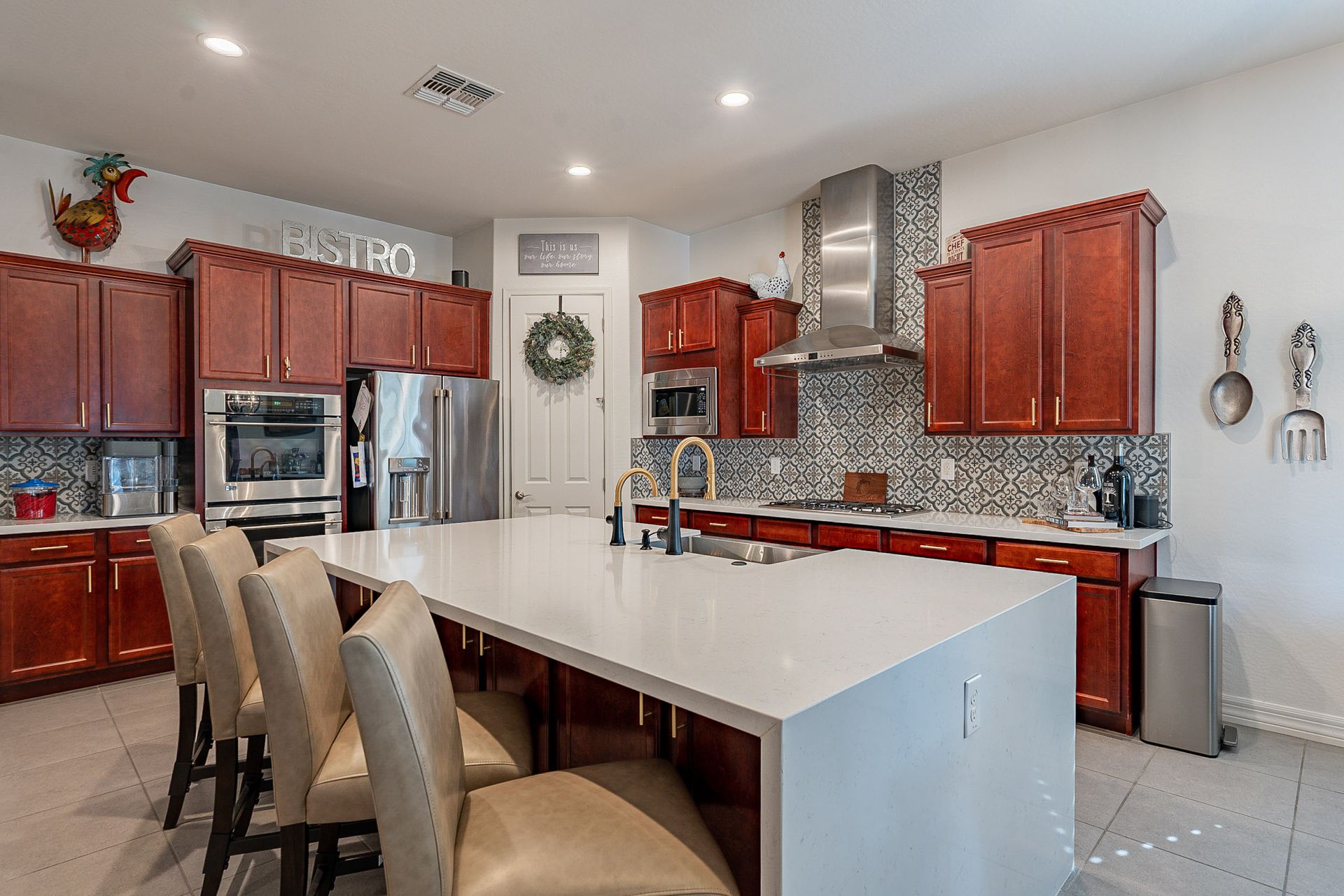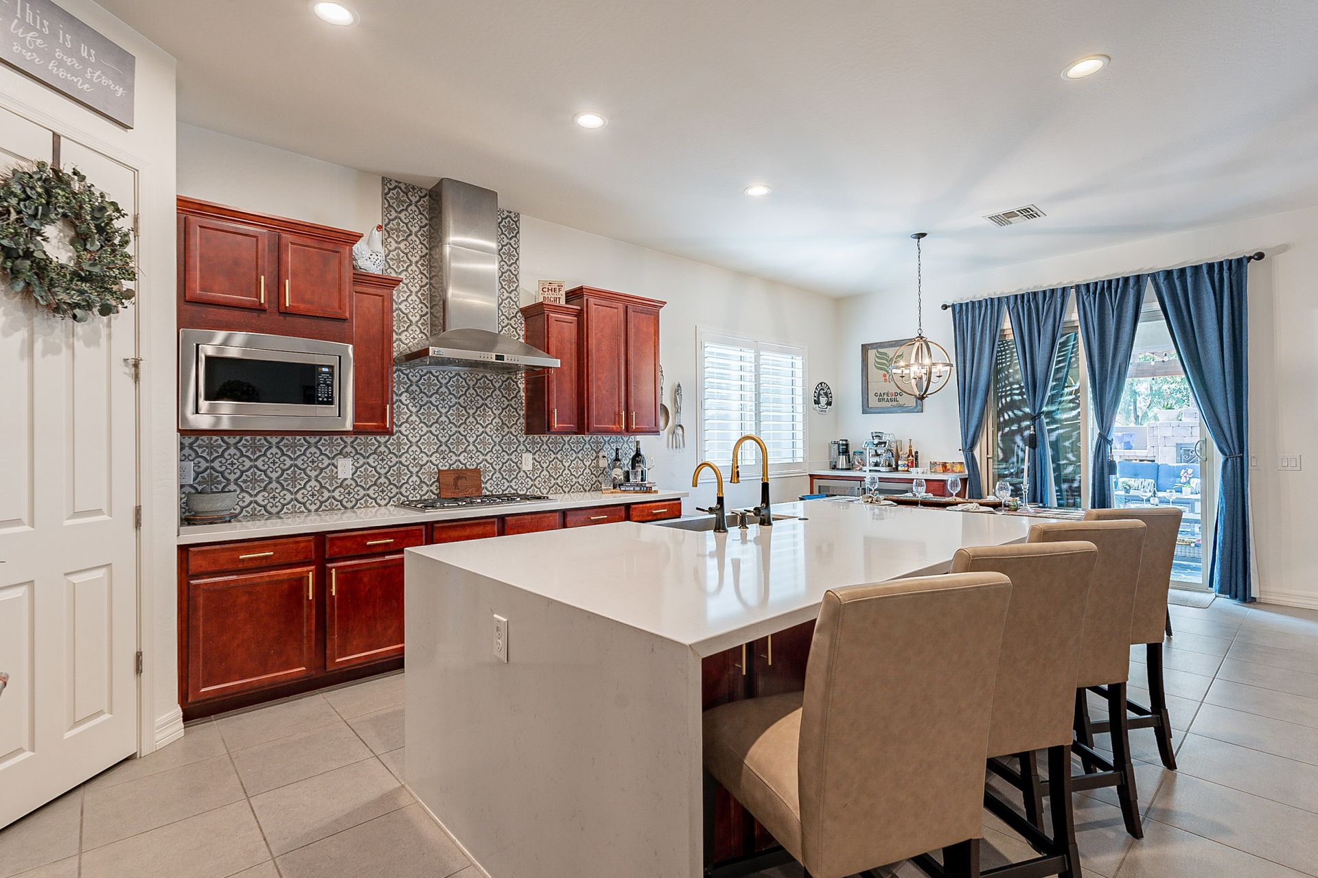 The gourmet kitchen is a chef's delight with waterfall quartz countertops, accent backsplash walls, and top-of-the-line Kohler kitchen faucets. It's perfect for entertaining or preparing meals for large gatherings.