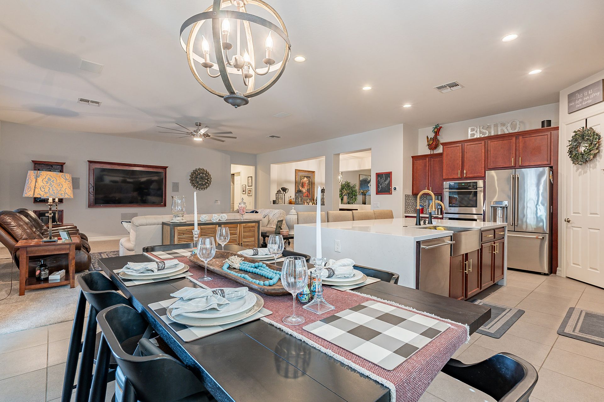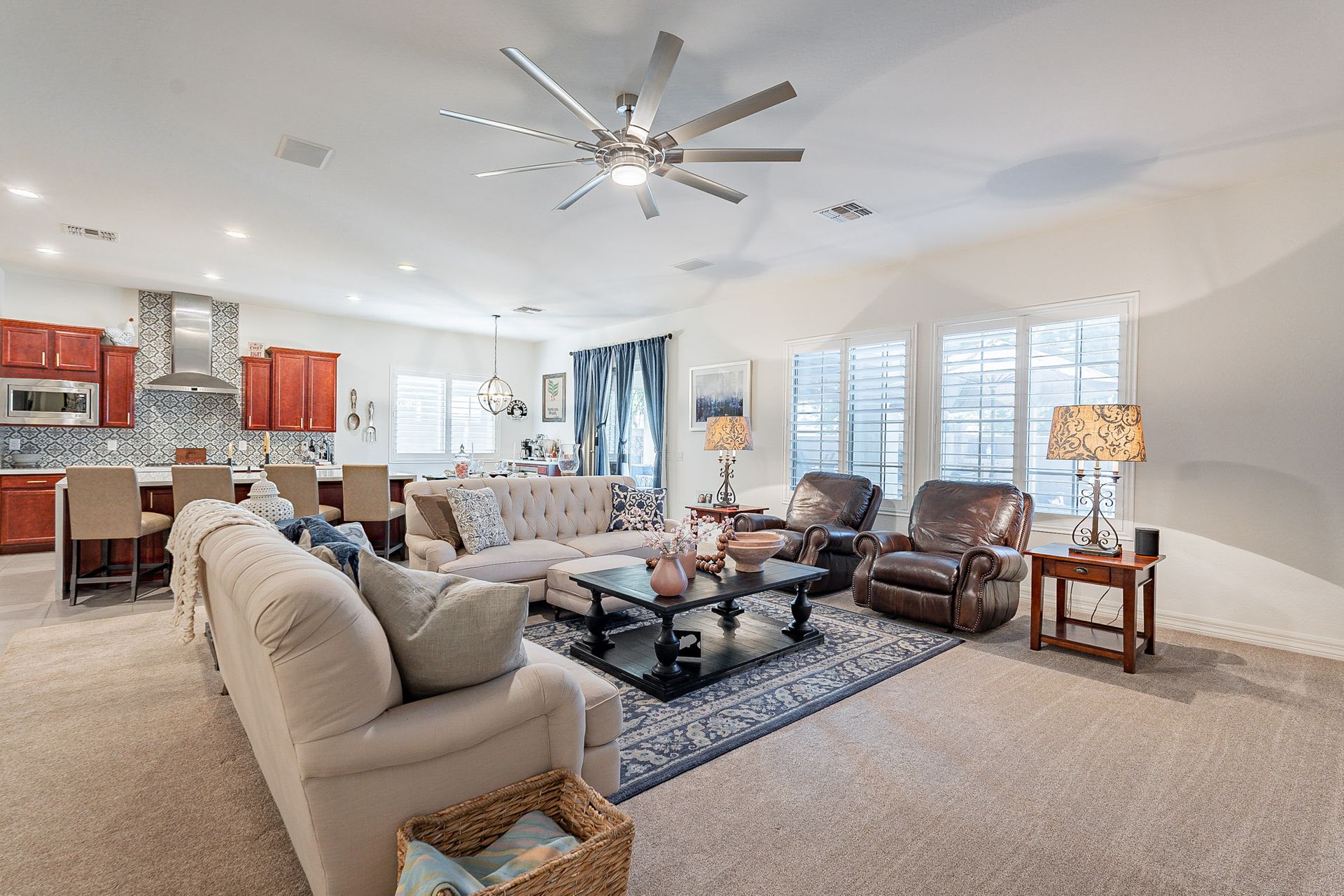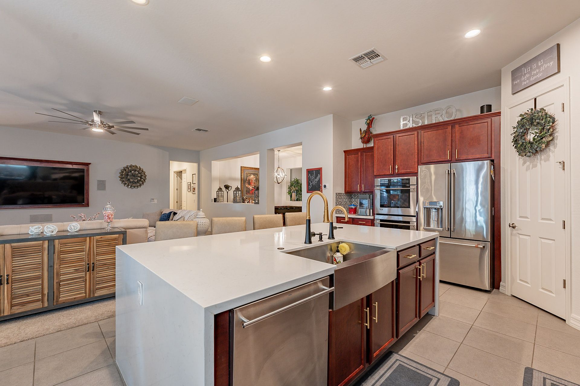 The gourmet kitchen is a chef's delight with waterfall quartz countertops, accent backsplash walls, and top-of-the-line Kohler kitchen faucets. It's perfect for entertaining or preparing meals for large gatherings.