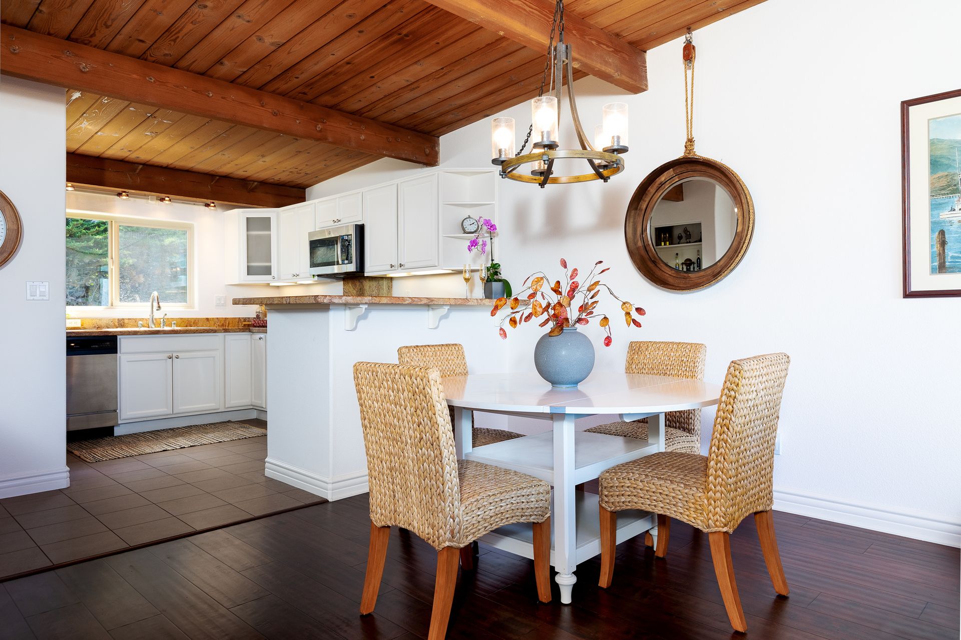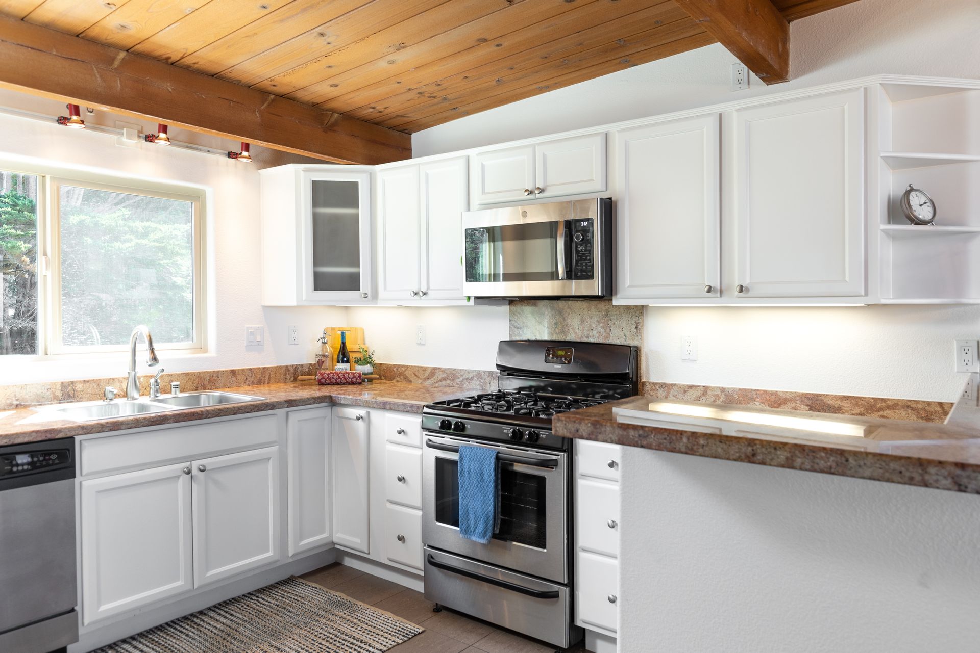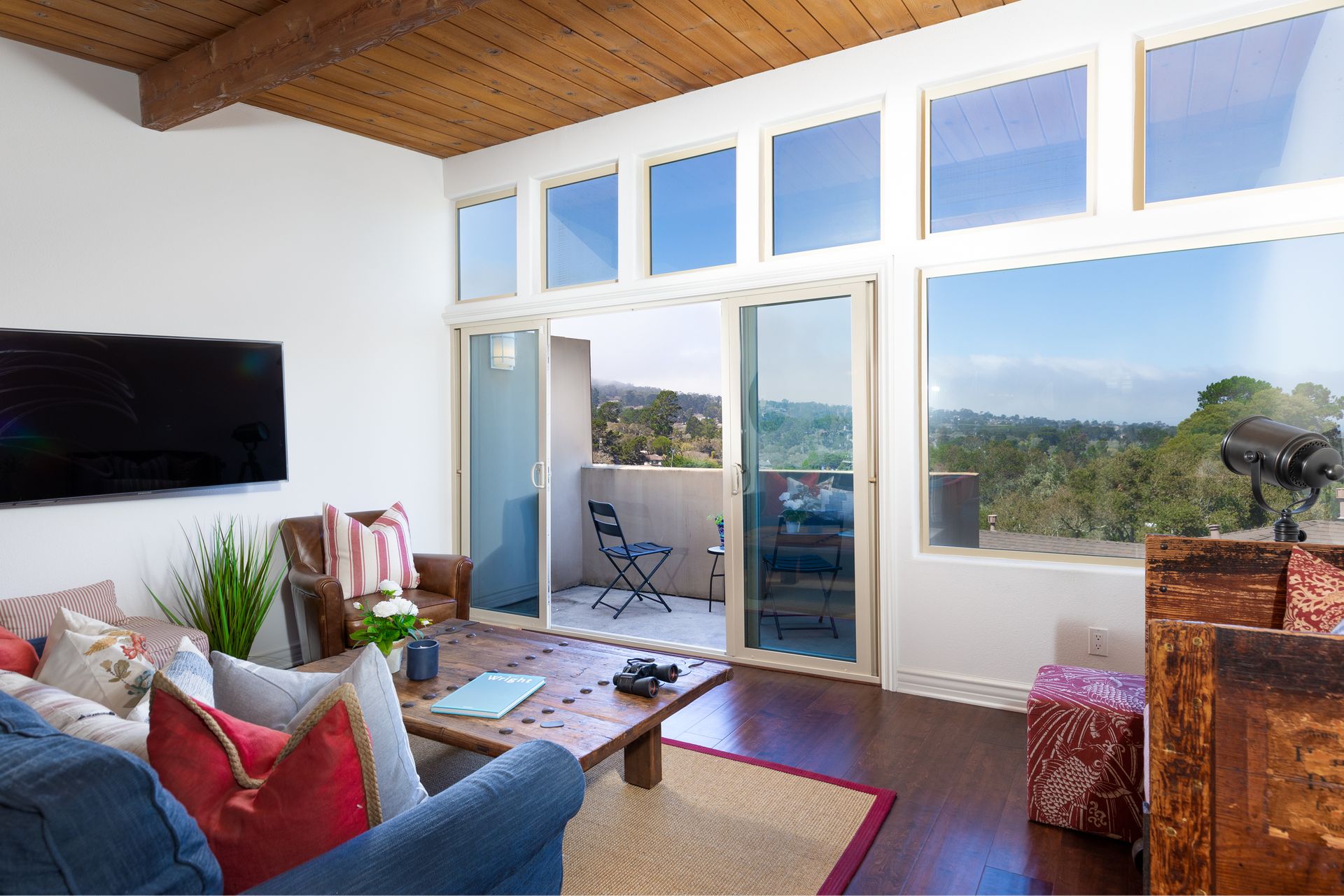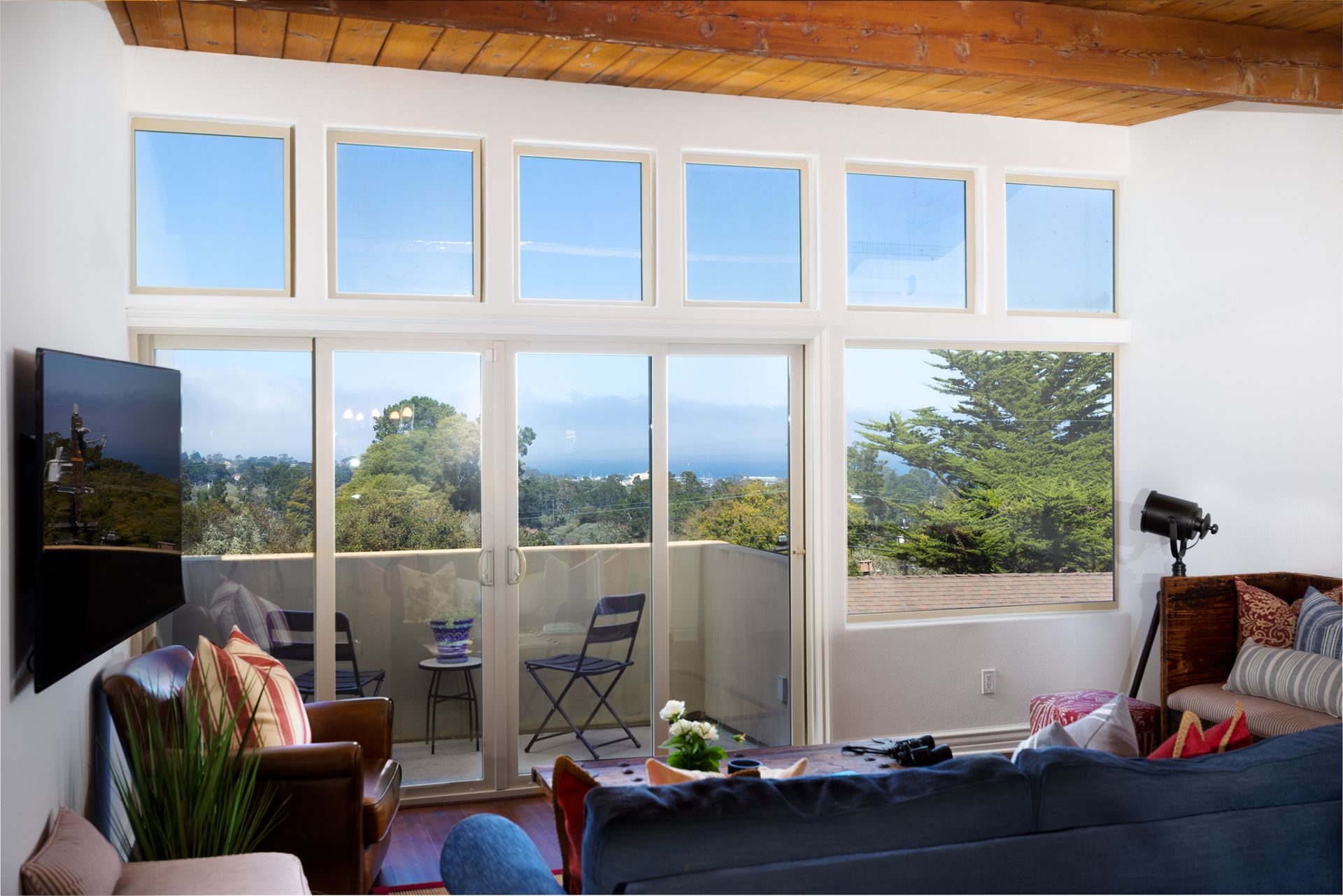 VIEWS, VIEWS, & more VIEWS! This bright 2 bed 1.5 bath Monterey condo offers the laid-back coastal living you deserve. As you step inside the two-level layout, crisp white tones tastefully contrast the new dark engineered hardwood flooring on the main level. Upstairs, a stunning display of exposed wood-beamed ceilings spans your seamlessly connected entertainment areas, anchored by a wall of large glass sliders and windows that usher in brilliant sunlight and panoramic ocean & forest views. Enjoy cocktails on the balcony before sharing meals in the chandelier-lit dining area. Steps away, a well-sized kitchen equips you with SS appliances, tons of cabinetry, and a multi-seater breakfast bar. Retire to the comforts of your private bedrooms on the main level, one with an exclusive deck that commands scenic city light views. Additional perks are a stackable washer/dryer, storage room, tankless water heater, and 2 covered parking spaces. Just a short walk to Del Monte Shopping Center!