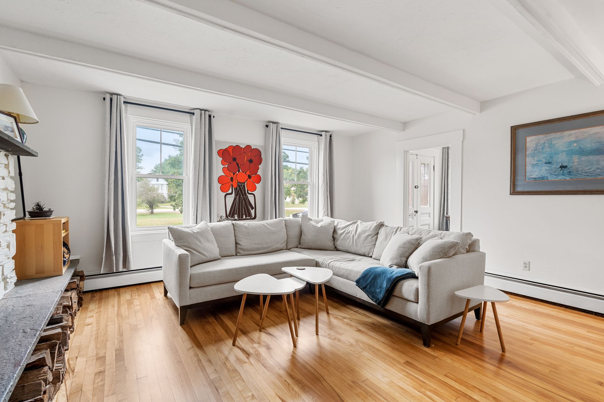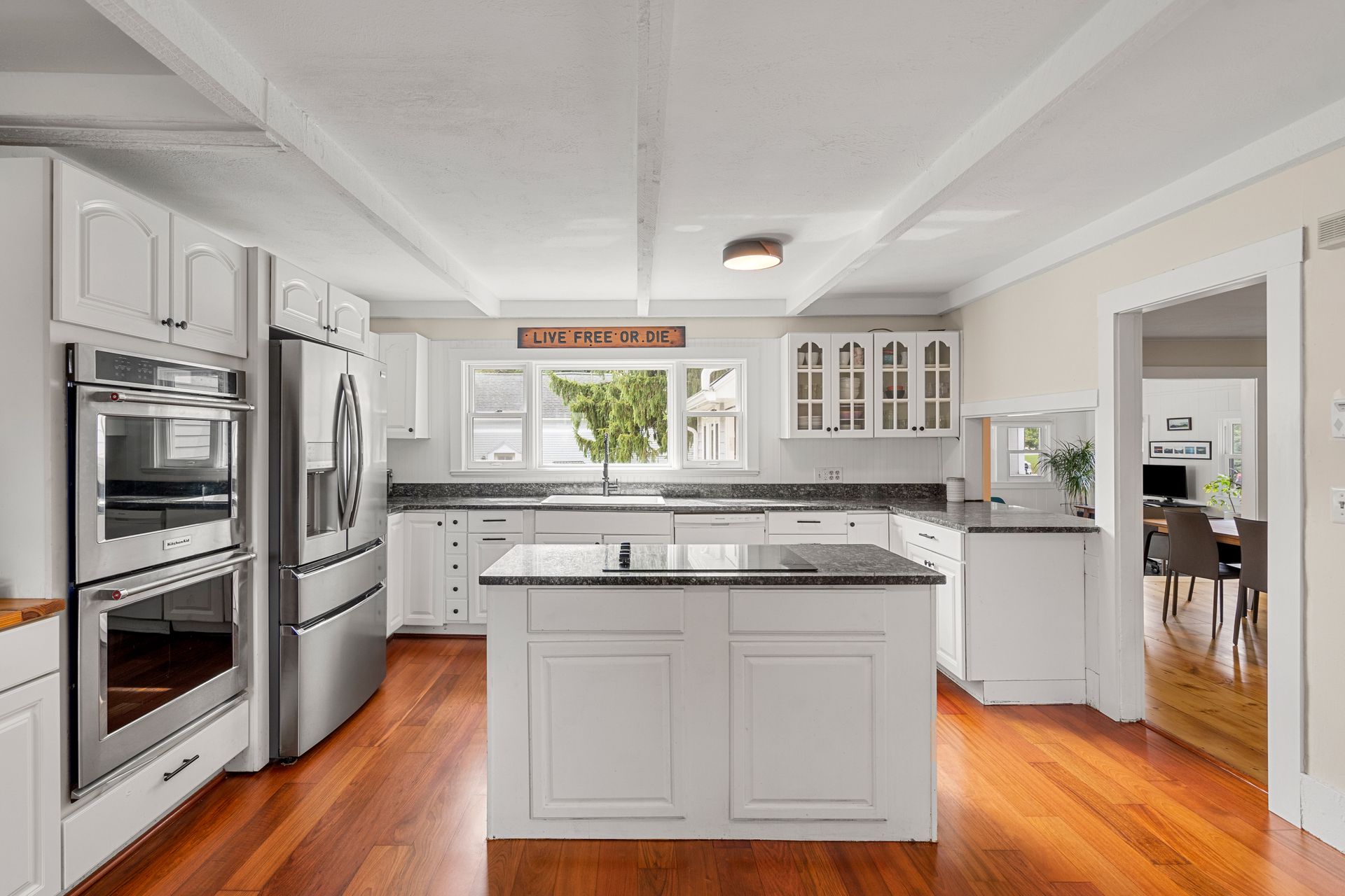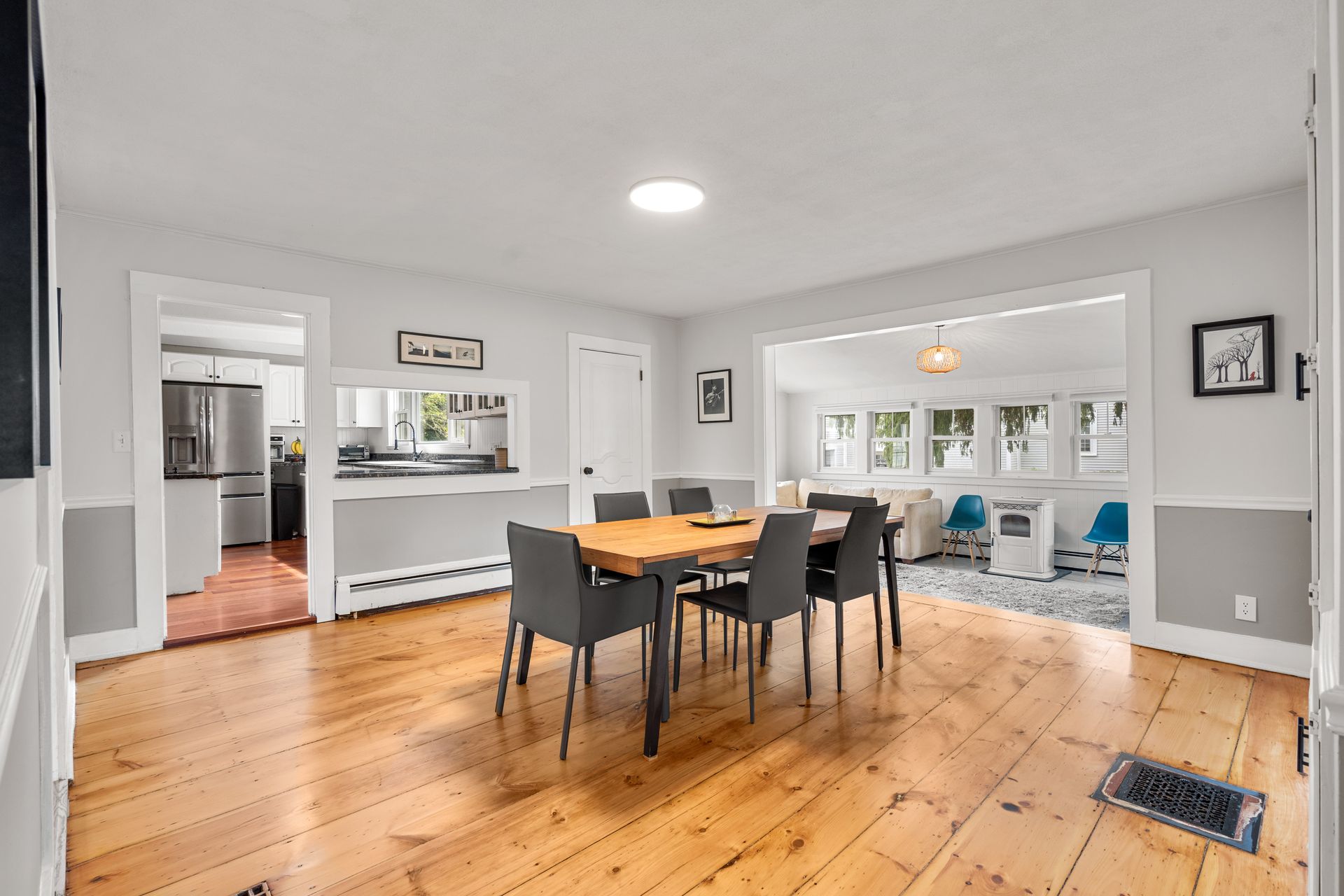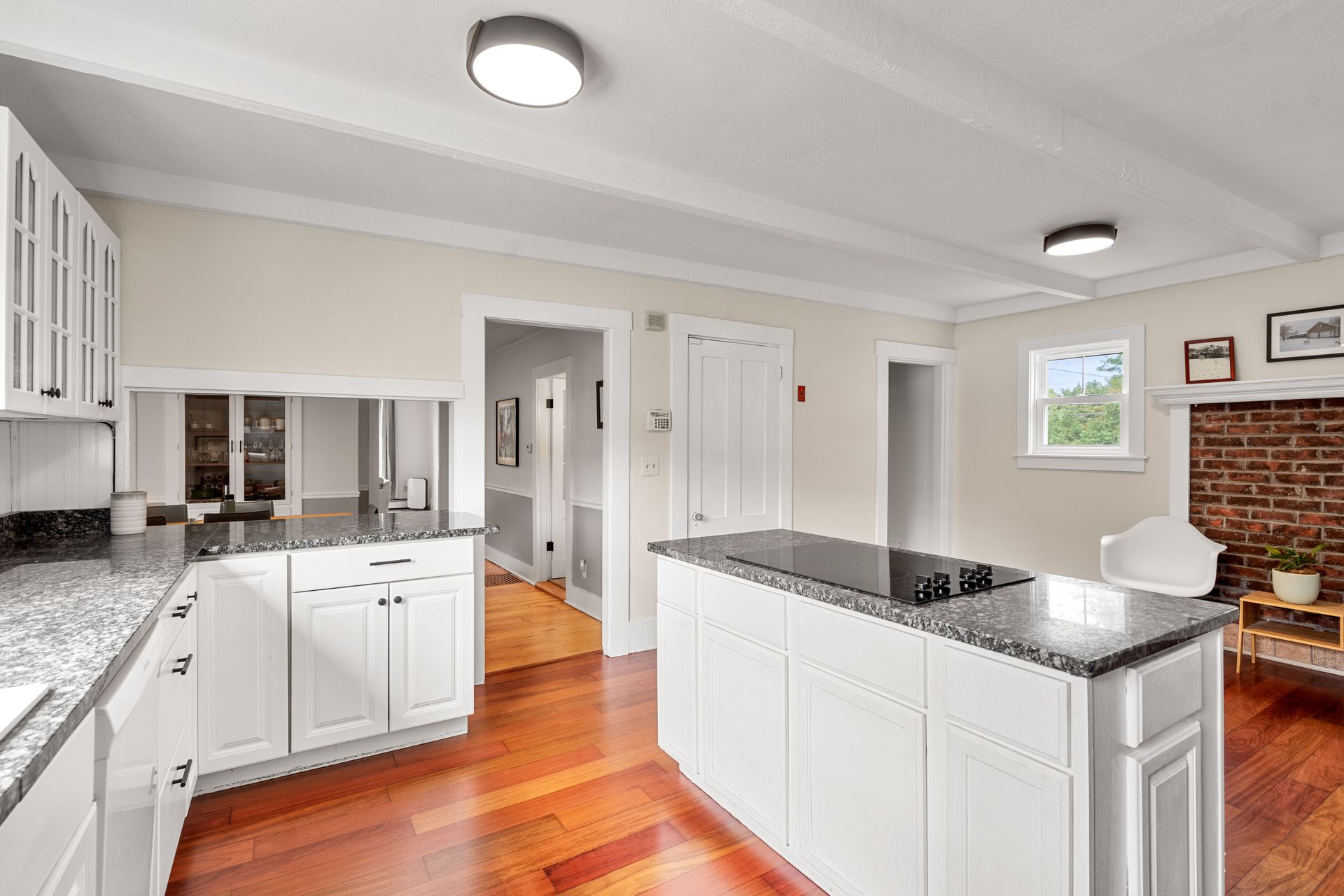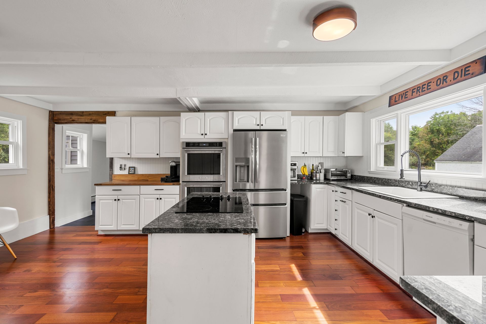 Located on half an acre on the Kingston Plains, this picturesque New England home features about 2,947 finished square feet, three-bedrooms, two-baths, and many updates for modern convenience. The first floor has an oversized, eat-in kitchen with a center island, granite countertops, an abundance of cabinets and counter space, and recently refinished cherry hardwood flooring. An open-concept formal dining room with original wide-pine flooring and built-ins leads into the sunroom with exposed original shiplap. The front living room has a woodstove (chimney liner added in 2022) in the fieldstone fireplace. The first floor is rounded out with a primary bedroom tucked away from the main part of the house, a completely renovated full bathroom with laundry, a large mudroom, and a home gym. Upstairs includes two additional bedrooms, a front office, wide-pine flooring, and a spacious 3/4 bathroom. Pull down the attic ladder for ample storage or potential expansion. The attached expansive attached garage is completed with a large workshop area. Ideal for potential ADU conversion or in-home business with plenty of parking. Some major improvements include roof replacement this September 2024, heating system replacement in 2021, hot water heater replacement in 2022, and a septic line replacement in 2021. A more complete list of upgrades is included in the attachments. Conveniently located near shopping, schools, restaurants, Kingston State Park, and major routes 125 and 101.