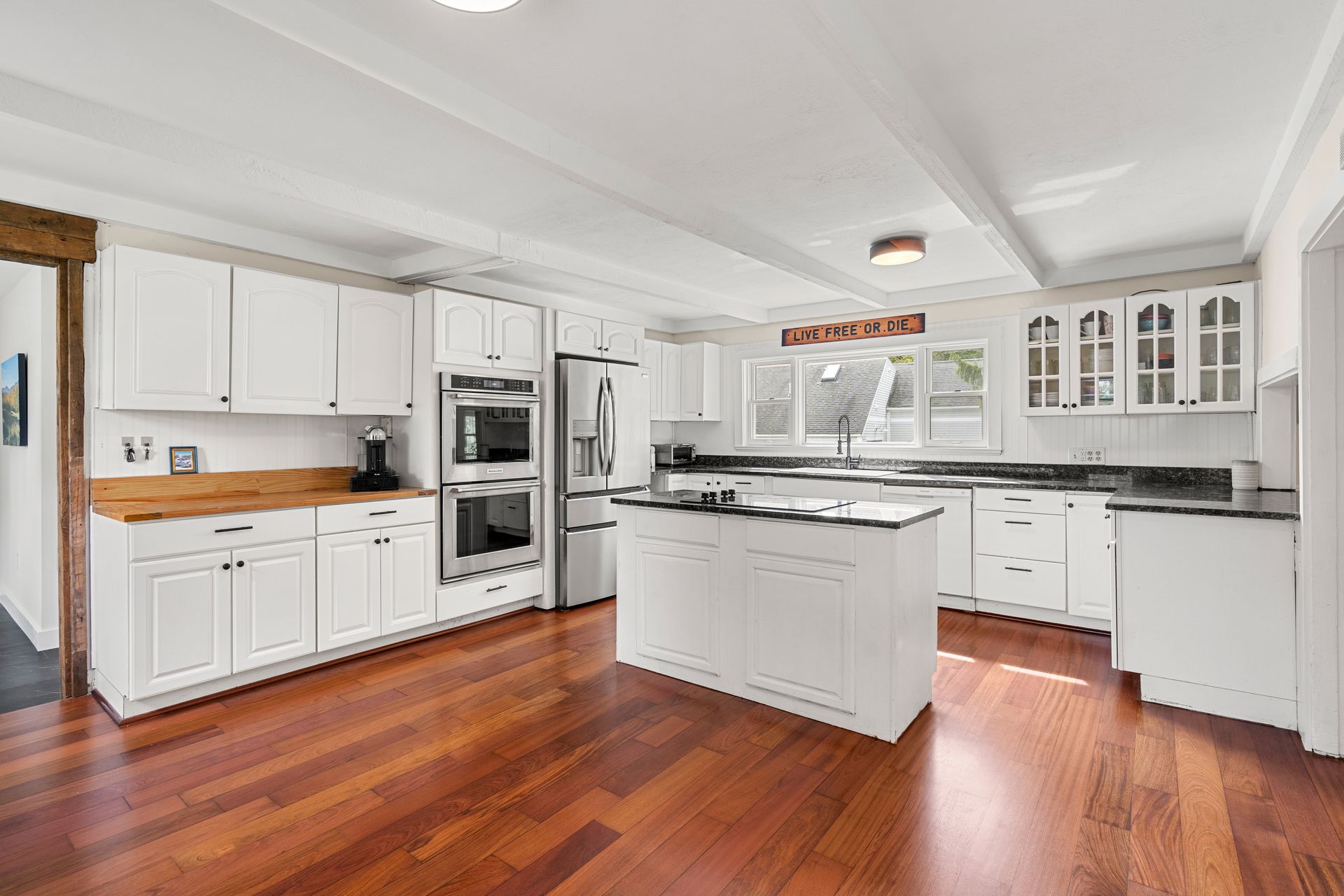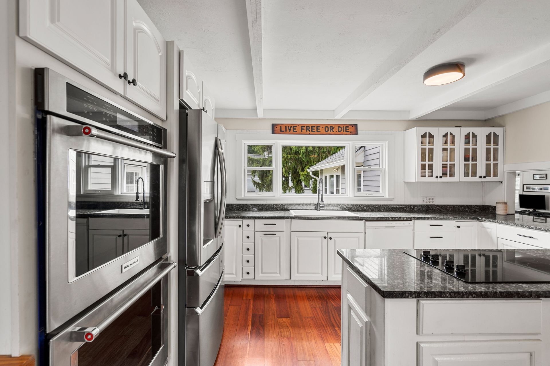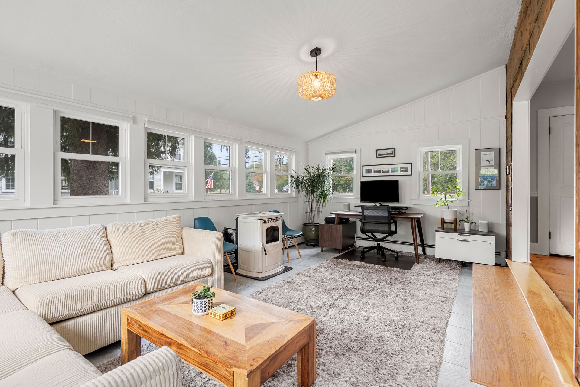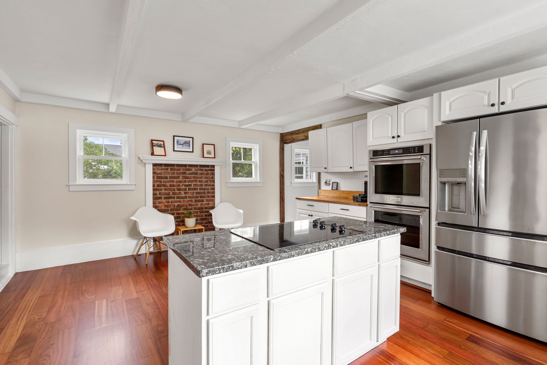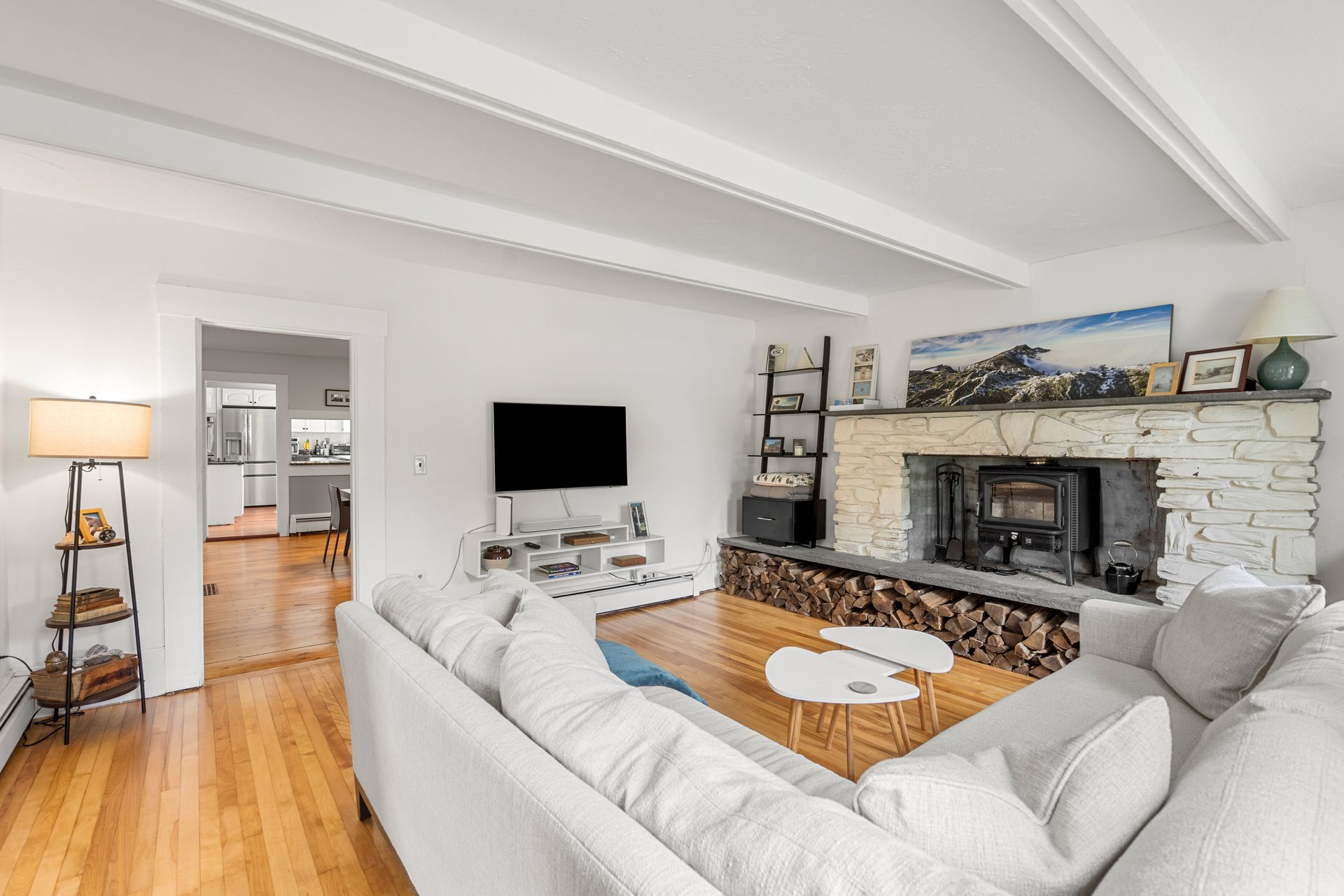 Located on half an acre on the Kingston Plains, this picturesque New England home features about 2,947 finished square feet, three-bedrooms, two-baths, and many updates for modern convenience. The first floor has an oversized, eat-in kitchen with a center island, granite countertops, an abundance of cabinets and counter space, and recently refinished cherry hardwood flooring. An open-concept formal dining room with original wide-pine flooring and built-ins leads into the sunroom with exposed original shiplap. The front living room has a woodstove (chimney liner added in 2022) in the fieldstone fireplace. The first floor is rounded out with a primary bedroom tucked away from the main part of the house, a completely renovated full bathroom with laundry, a large mudroom, and a home gym. Upstairs includes two additional bedrooms, a front office, wide-pine flooring, and a spacious 3/4 bathroom. Pull down the attic ladder for ample storage or potential expansion. The attached expansive attached garage is completed with a large workshop area. Ideal for potential ADU conversion or in-home business with plenty of parking. Some major improvements include roof replacement this September 2024, heating system replacement in 2021, hot water heater replacement in 2022, and a septic line replacement in 2021. A more complete list of upgrades is included in the attachments. Conveniently located near shopping, schools, restaurants, Kingston State Park, and major routes 125 and 101.