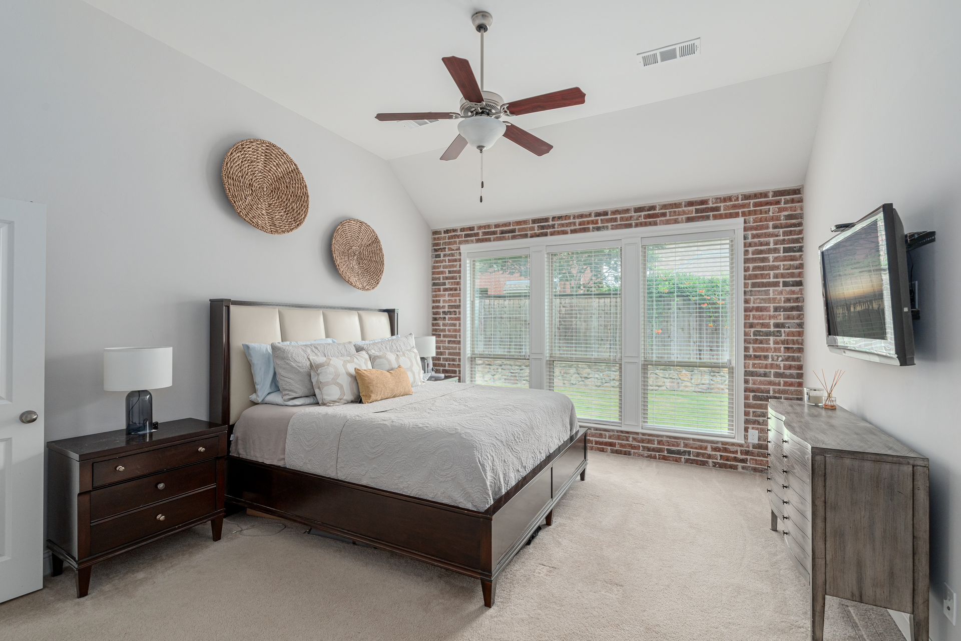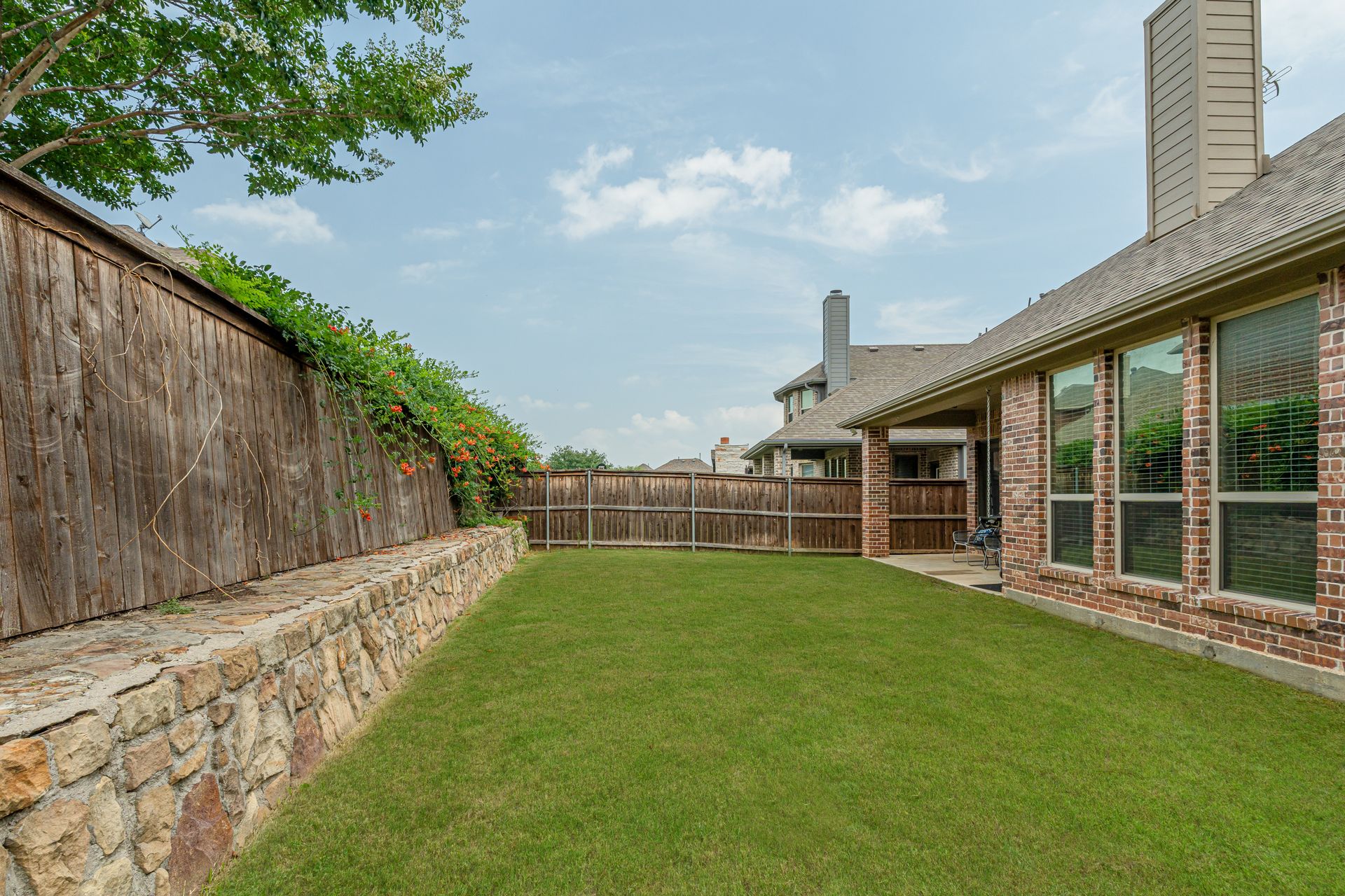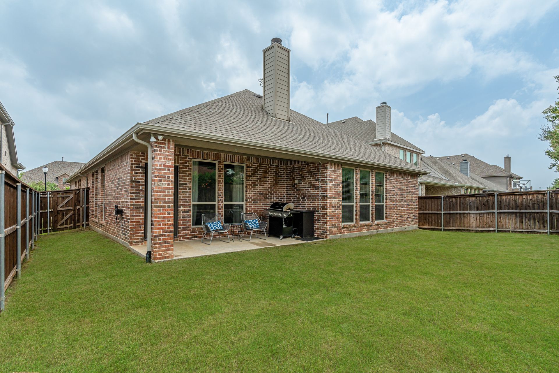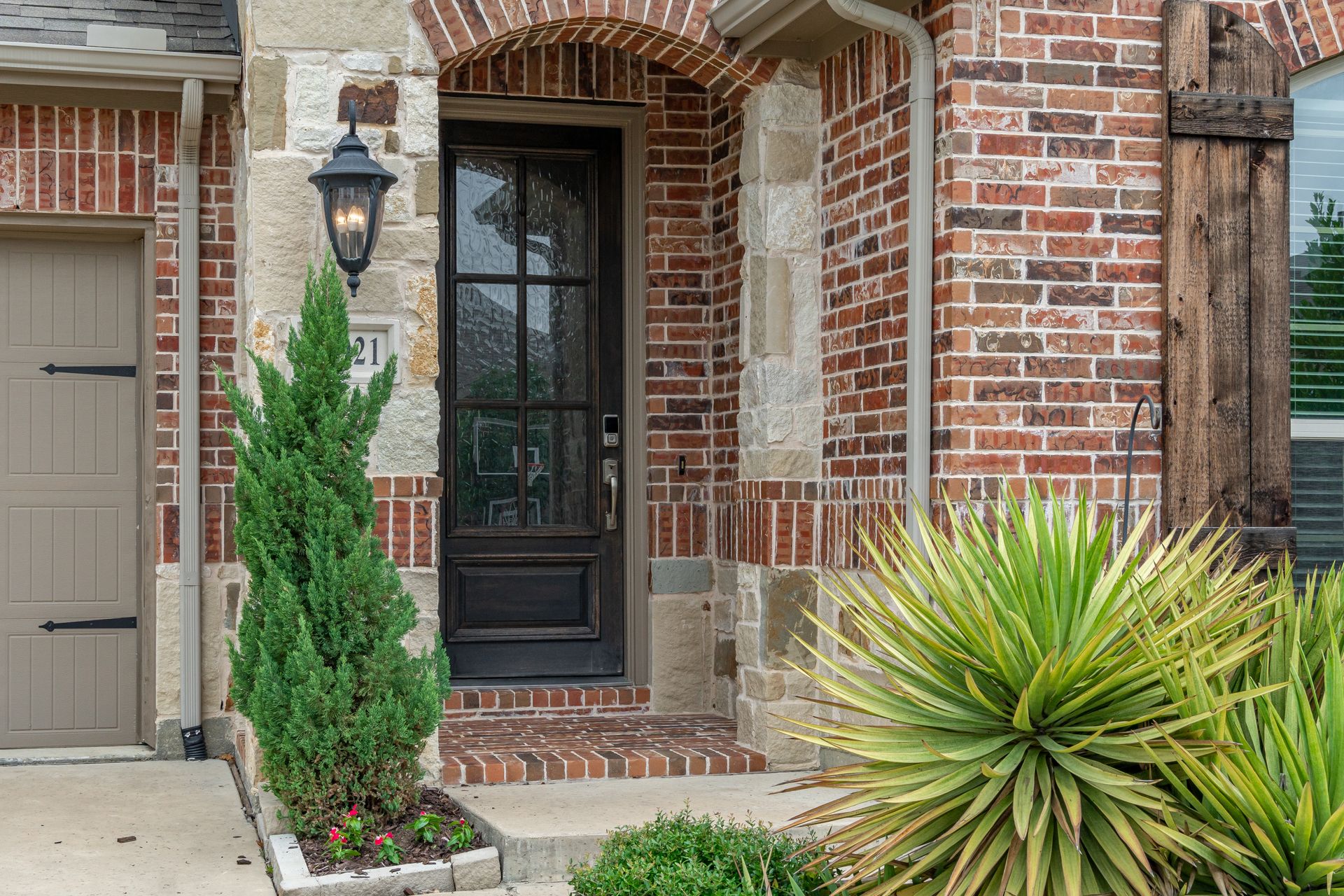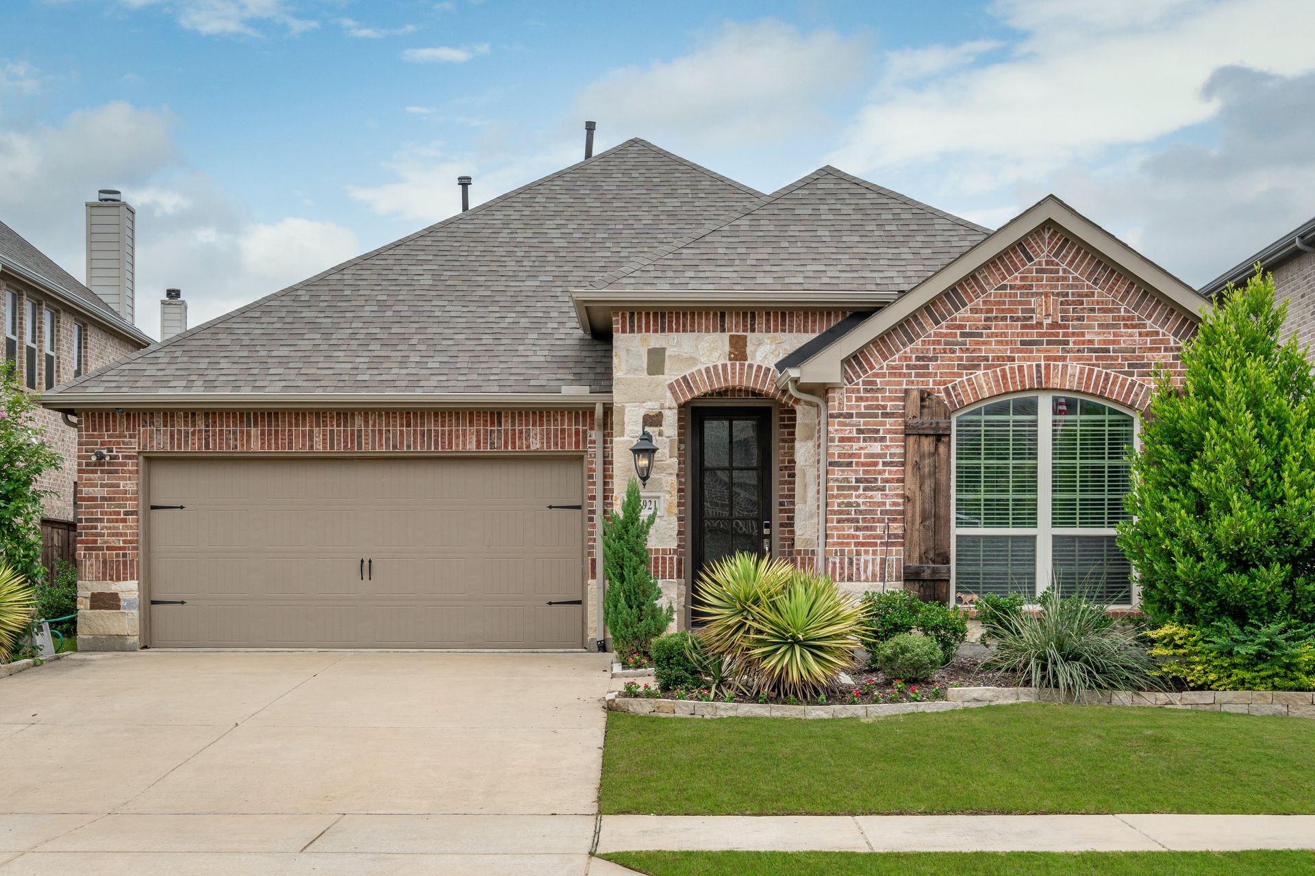 Truly custom and minutes from PGA, don't miss this Prosper beauty with upgrades galore. Enter through the glass front door to find hand scraped nail down hardwood flooring. Wood encased doorways and windows in addition to flat wall paint create a rich and unique interior. The master bedroom features a beautiful brick accent wall. The layout includes three bedrooms with each having their own bathroom. The office with barn doors could easily be converted to an extra bedroom. Kitchen opens to the dining and living area and is perfect for entertaining with granite counters, apron sink, water purifier, custom cabinetry, cabinet hardware, upgraded lighting, large oversized pantry and a built in bar area with a pet kennel underneath. A wood burning fireplace with cedar mantel warms the living room in the cold evenings. The master bathroom is spacious with his and her closets, granite, frameless shower and upgraded tile. The oversized garage is perfect for a golf cart and the utility room comes with sink. Prosper ISD.