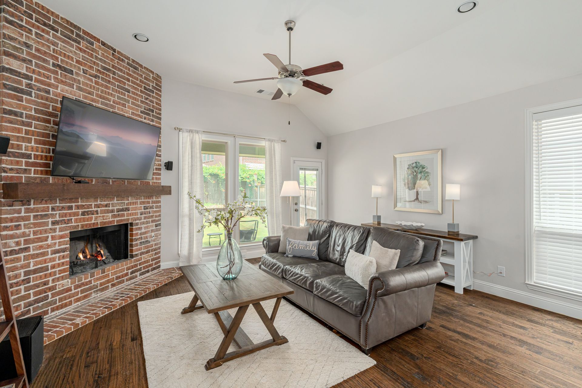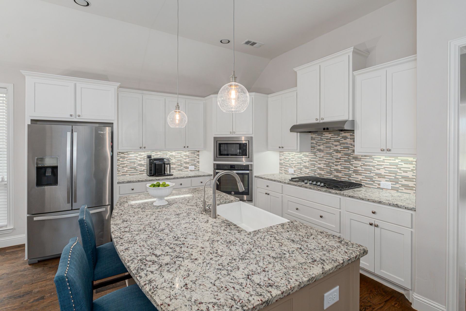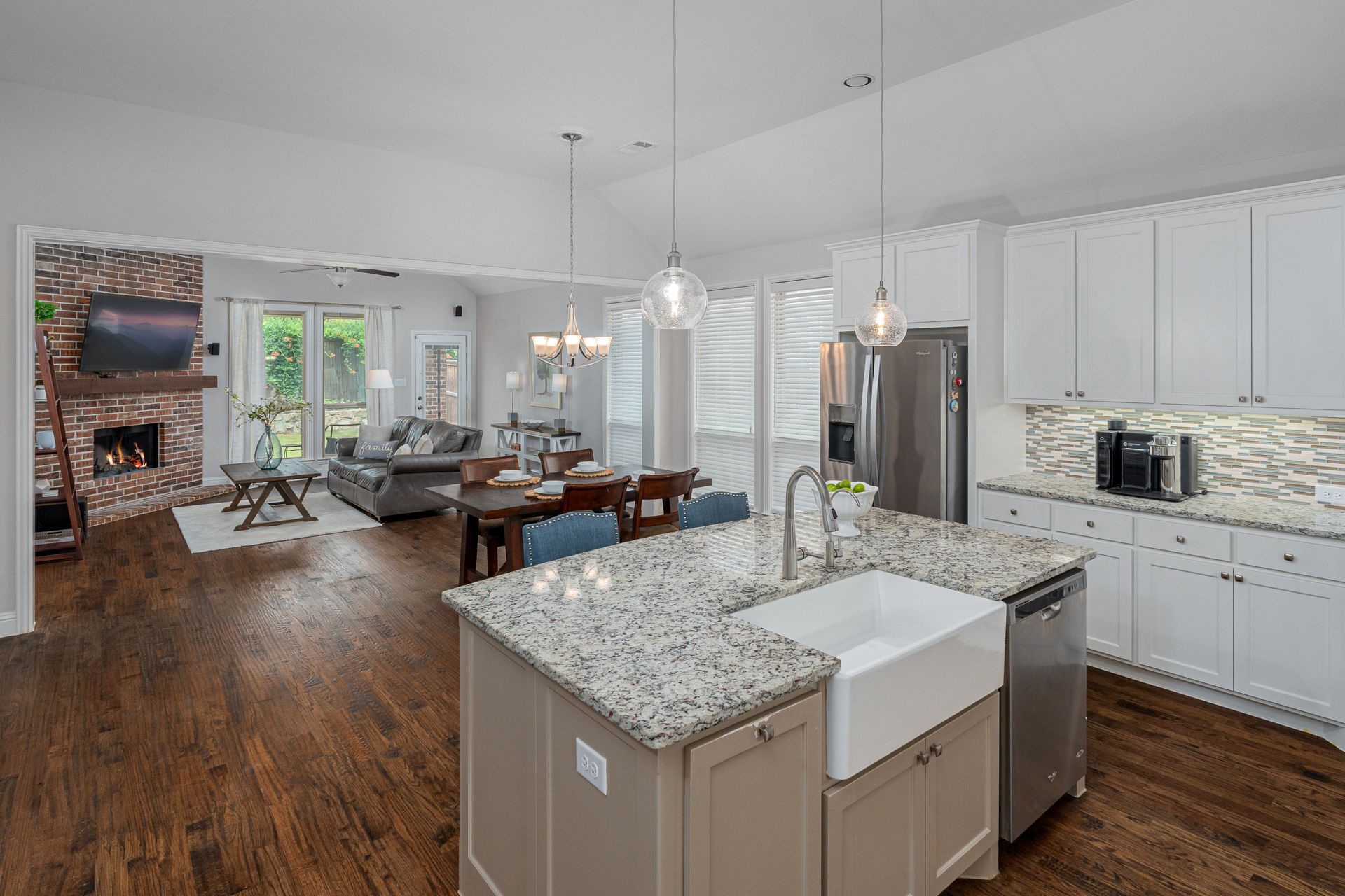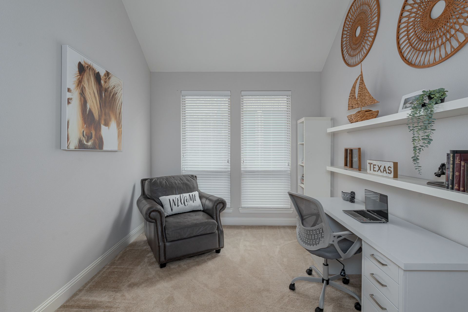 Truly custom and minutes from PGA, don't miss this Prosper beauty with upgrades galore. Enter through the glass front door to find hand scraped nail down hardwood flooring. Wood encased doorways and windows in addition to flat wall paint create a rich and unique interior. The master bedroom features a beautiful brick accent wall. The layout includes three bedrooms with each having their own bathroom. The office with barn doors could easily be converted to an extra bedroom. Kitchen opens to the dining and living area and is perfect for entertaining with granite counters, apron sink, water purifier, custom cabinetry, cabinet hardware, upgraded lighting, large oversized pantry and a built in bar area with a pet kennel underneath. A wood burning fireplace with cedar mantel warms the living room in the cold evenings. The master bathroom is spacious with his and her closets, granite, frameless shower and upgraded tile. The oversized garage is perfect for a golf cart and the utility room comes with sink. Prosper ISD.