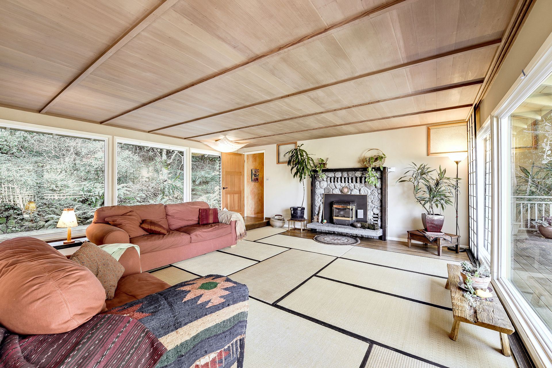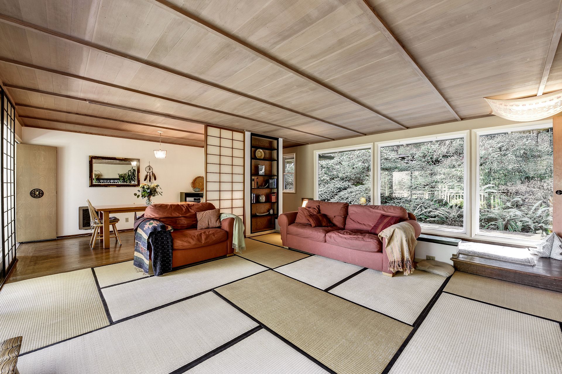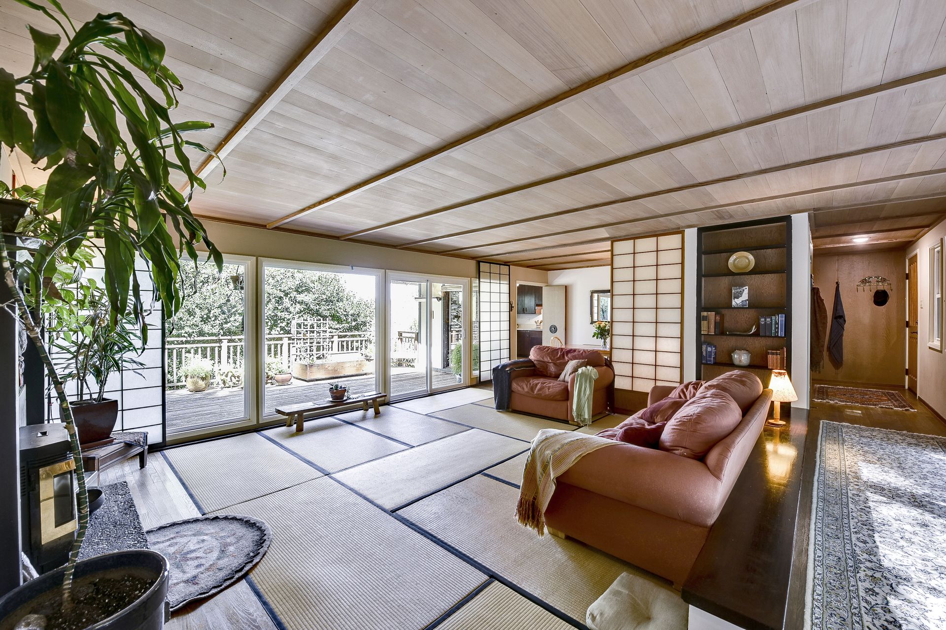 • Beautiful living room with custom padded tatami mat flooring, flanked on either side by floor to ceiling windows that frame the surrounding gardens & ridgeline views off the deck