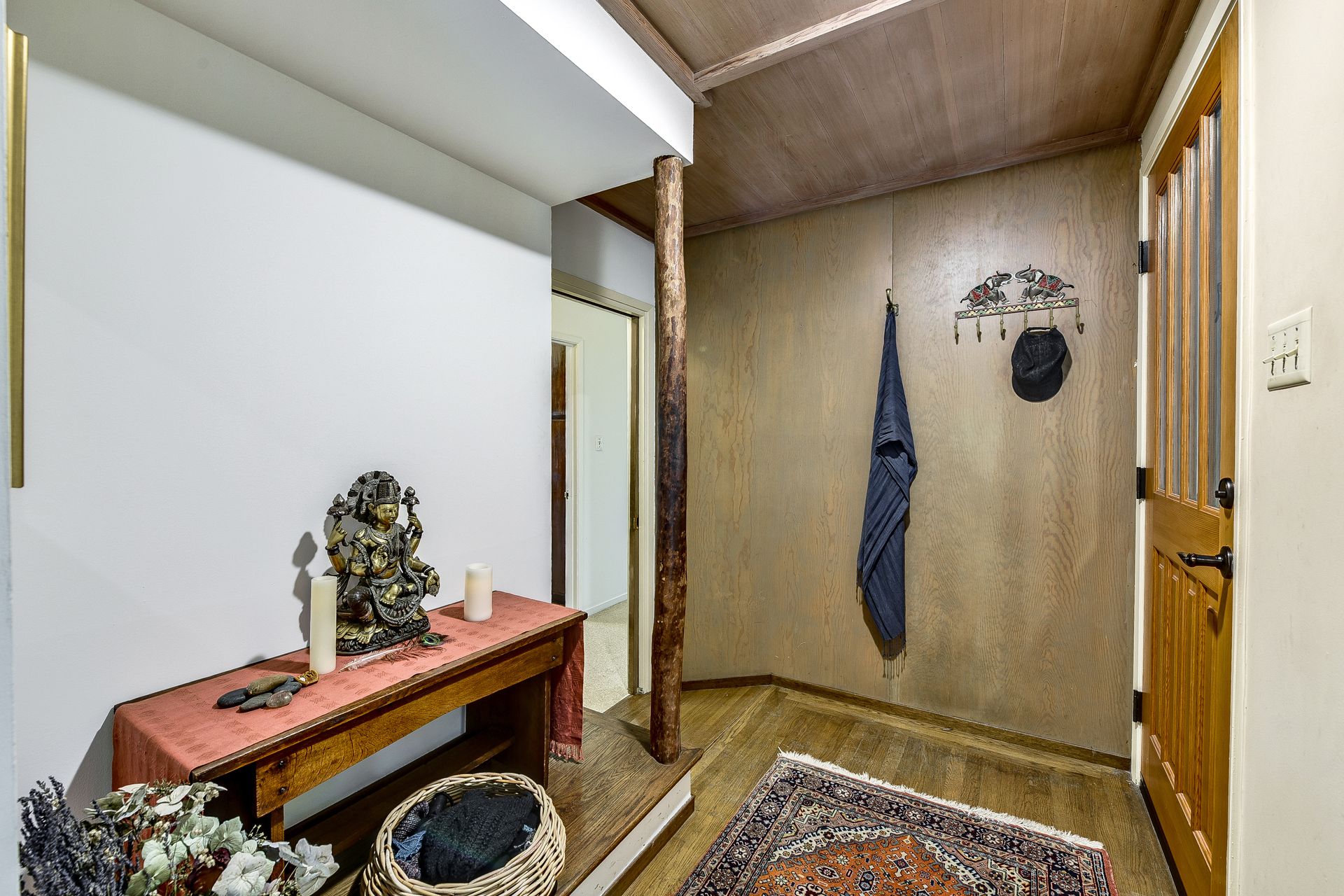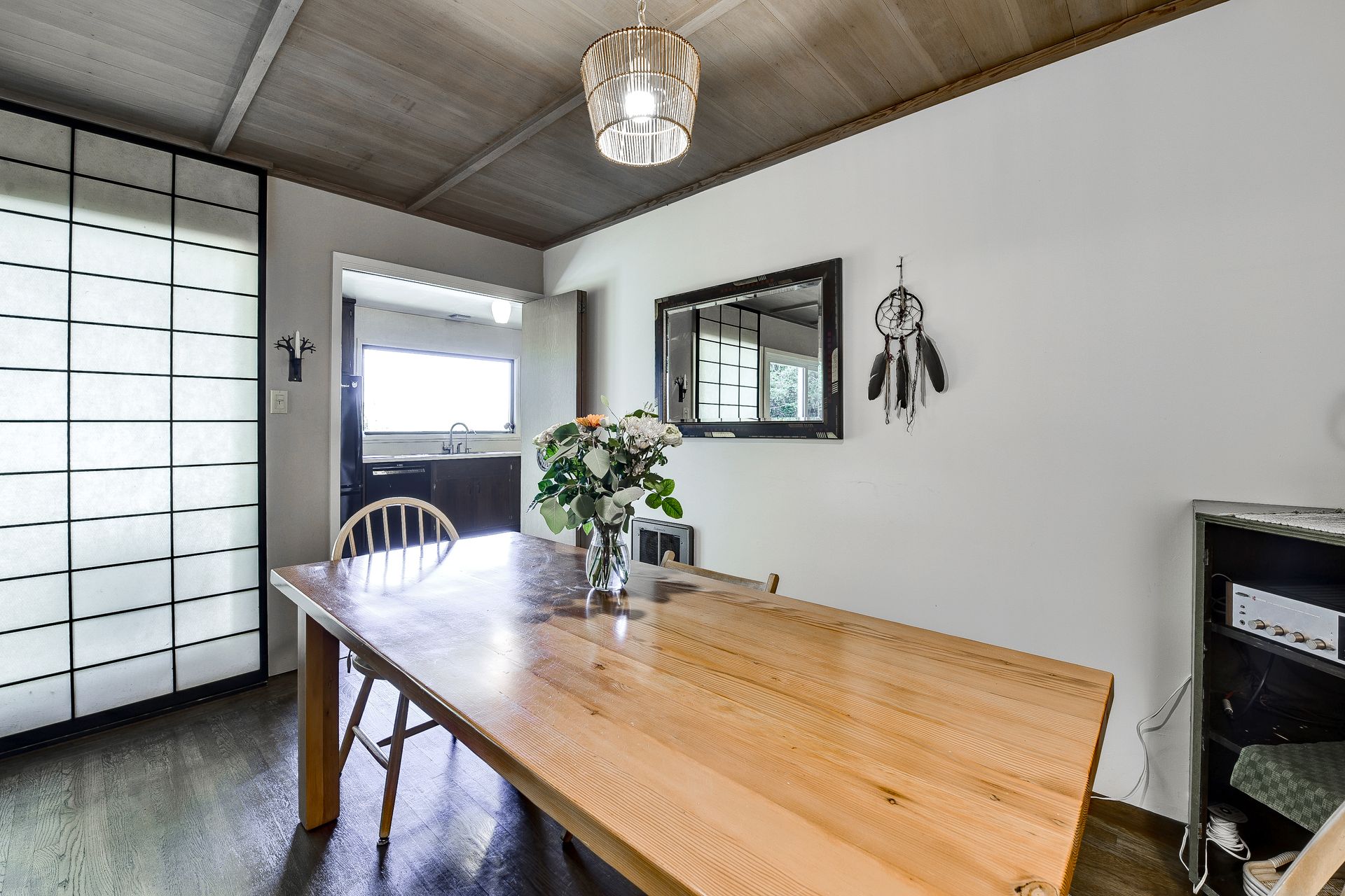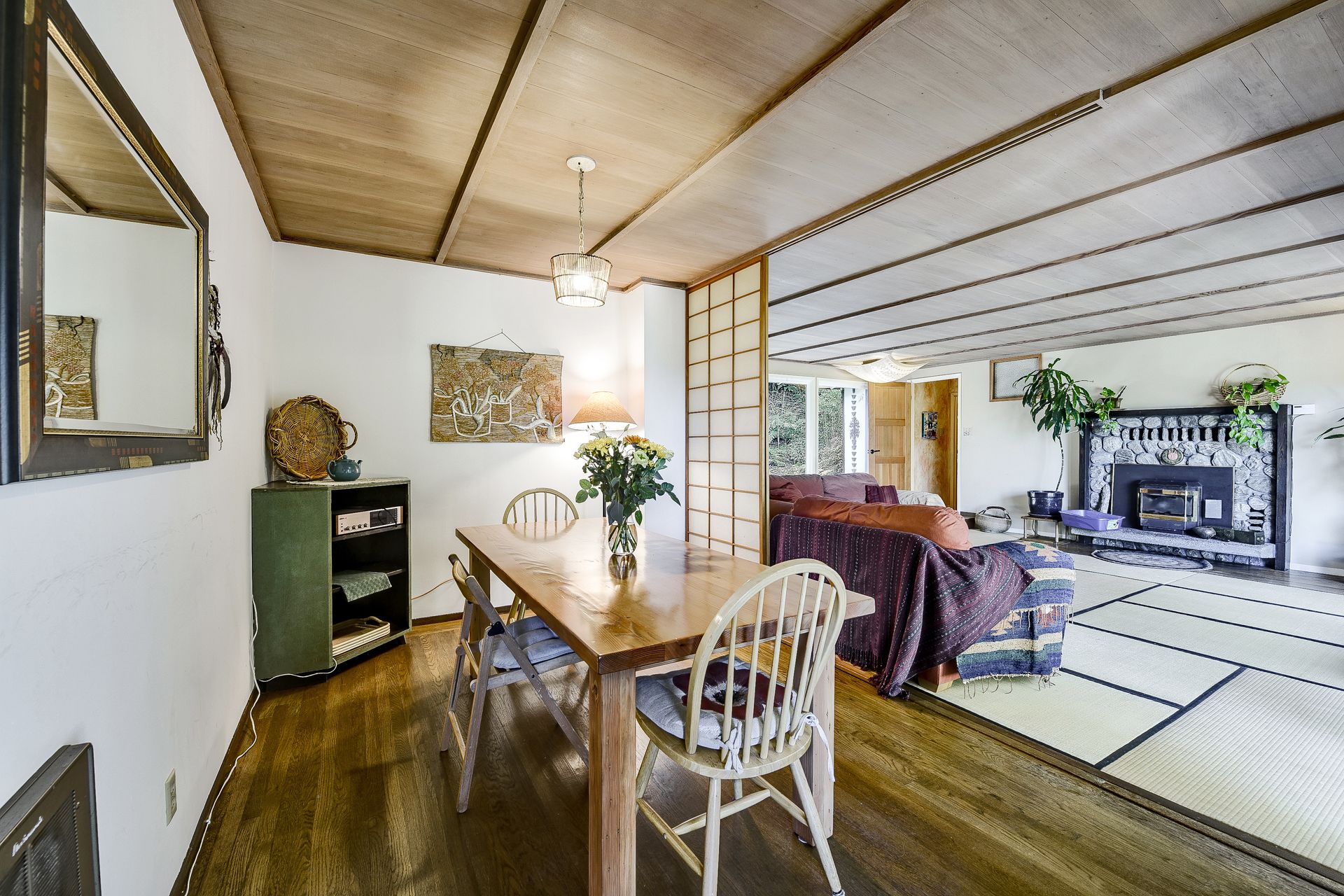 • Beautiful living room with custom padded tatami mat flooring, flanked on either side by floor to ceiling windows that frame the surrounding gardens & ridgeline views off the deck