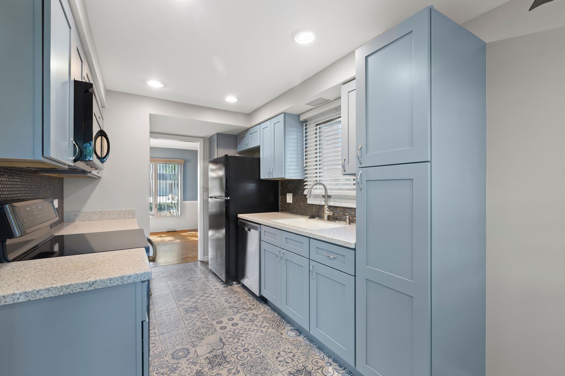 Desirable Regent Park! This fabulous home has three generous sized bedrooms, two full bathrooms, and two half bathrooms, a finished basement and an attached garage. No carpet here...the foyer has a black slate floor and leads to the huge living with hardwood floors and a brick fireplace with gas logs, recessed lights and a wall of patio sliders leading to the backyard patio. The kitchen was updated in 2018 with beautiful gray cabinetry featuring two pantries, solid surface counters, tile backsplash and gorgeous porcelain tiles and recessed lighting. There is also room for a breakfast table. The stove and refrigerator- 2018. The dishwasher and disposal -2017. There is a separate dining room off the kitchen with hardwood floors and chair rail. Leading up to the second level there are hardwood floors on the stairwell, hallway and three bedrooms. All bedrooms have closet space galore, plus two hall linen closets. There is also a guest bath and an owner's suite bath. The finished basement has porcelain floors, a built-in entertainment center, recessed lights. The laundry area includes a washer and dryer -both- 2016, a laundry tub and a half bath. There is an extra room for a workshop or craft area. Other extras...White doors and trim. Faux wood blinds. This home has a great cul-de-sac location and yard. There is a community pool, tennis courts and pond. Convenient to parks, Metra and downtown Arlington Heights.