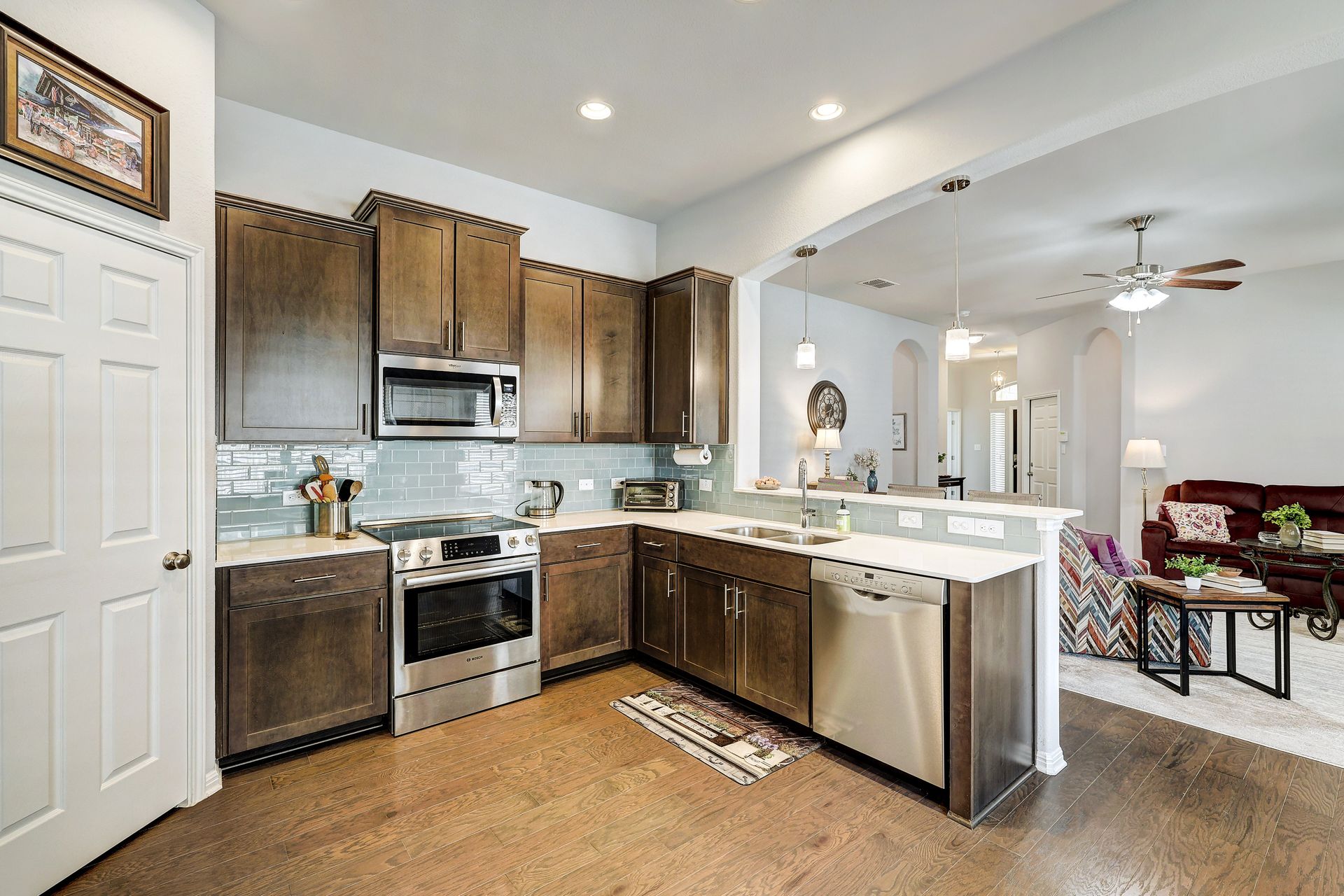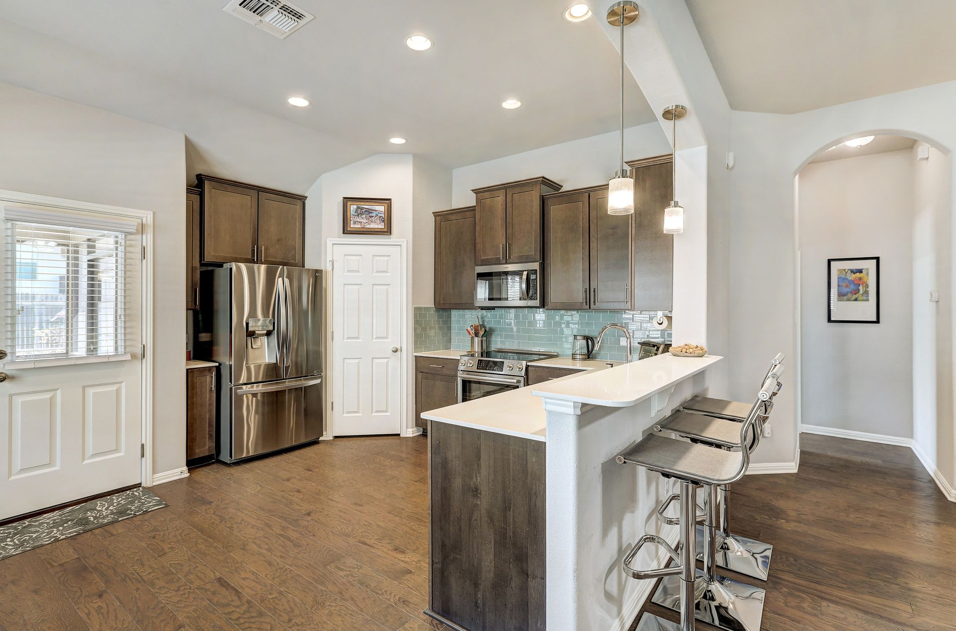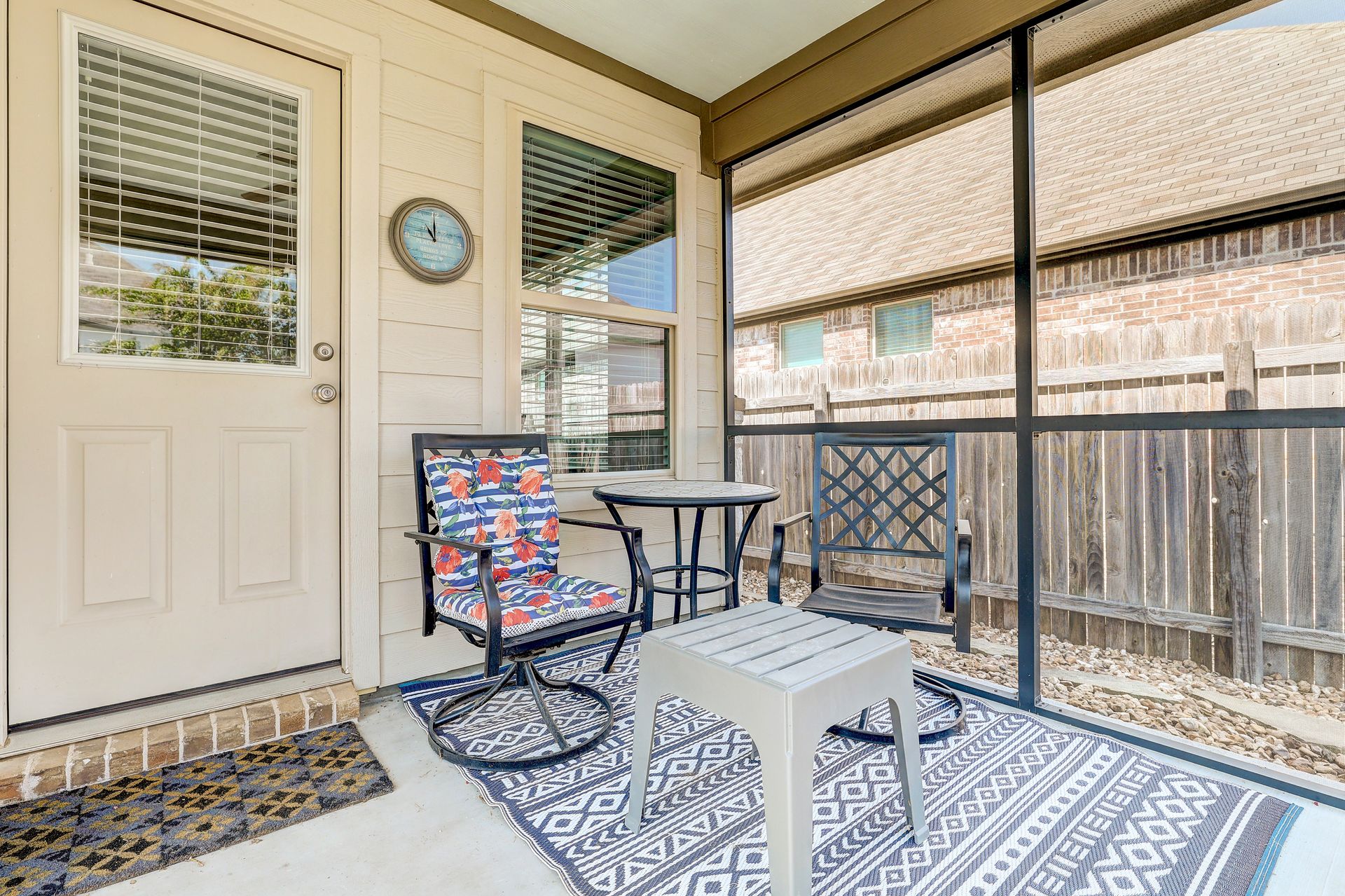 The inviting front porch guides you into the home, setting the tone for the warm and welcoming atmosphere. The backyard screened porch, accessible from the kitchen, allows for enjoyment of the beautiful landscaping and outdoor environment, providing a seamless indoor-outdoor living experience.