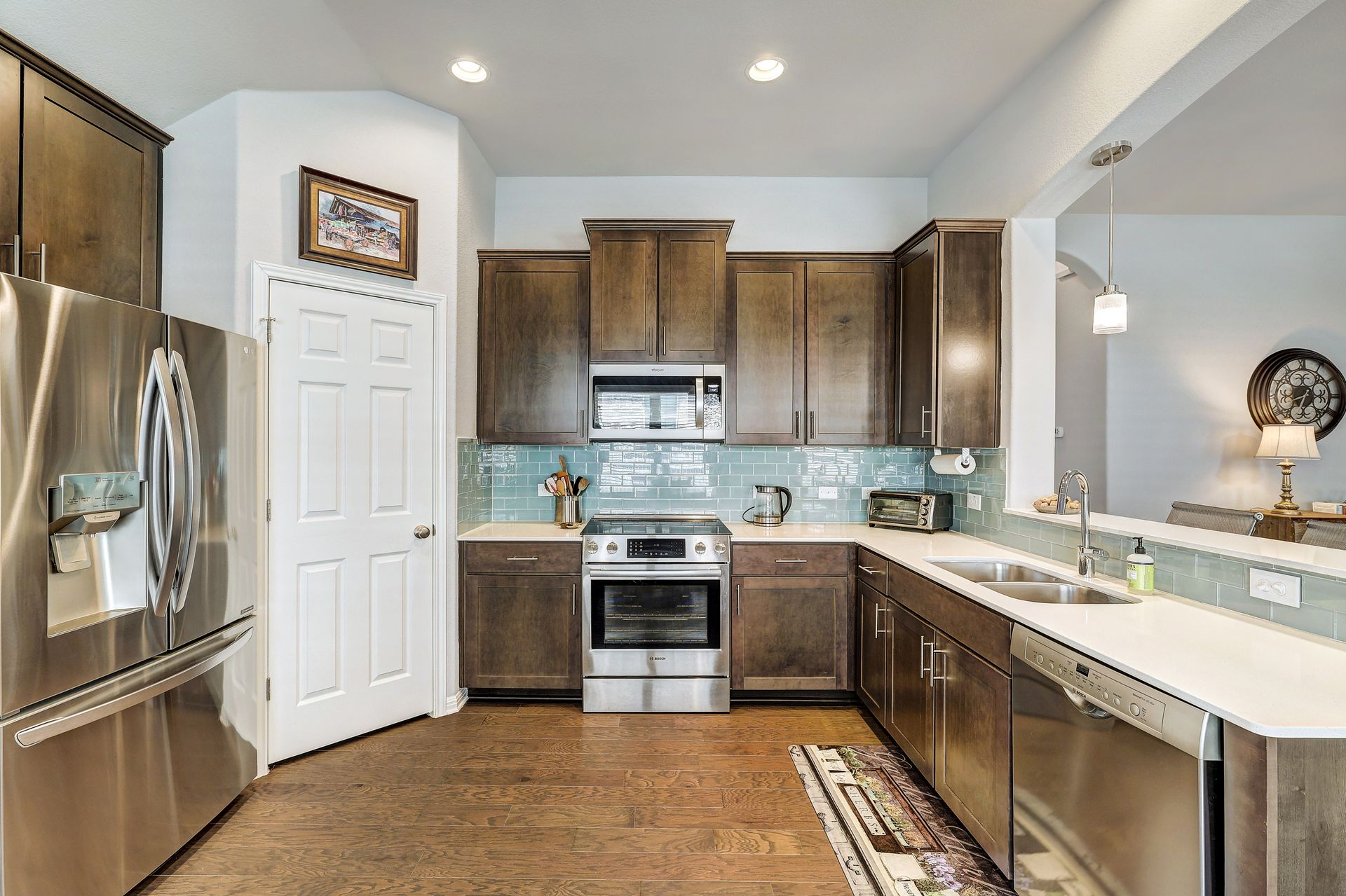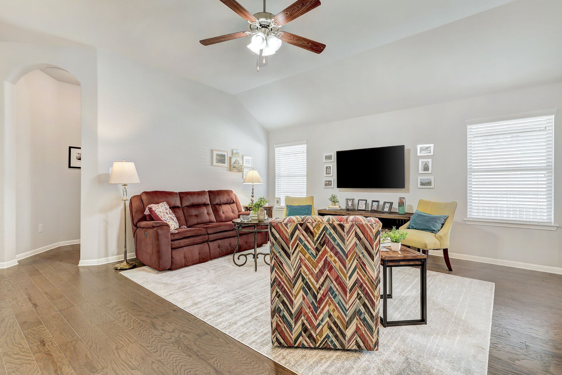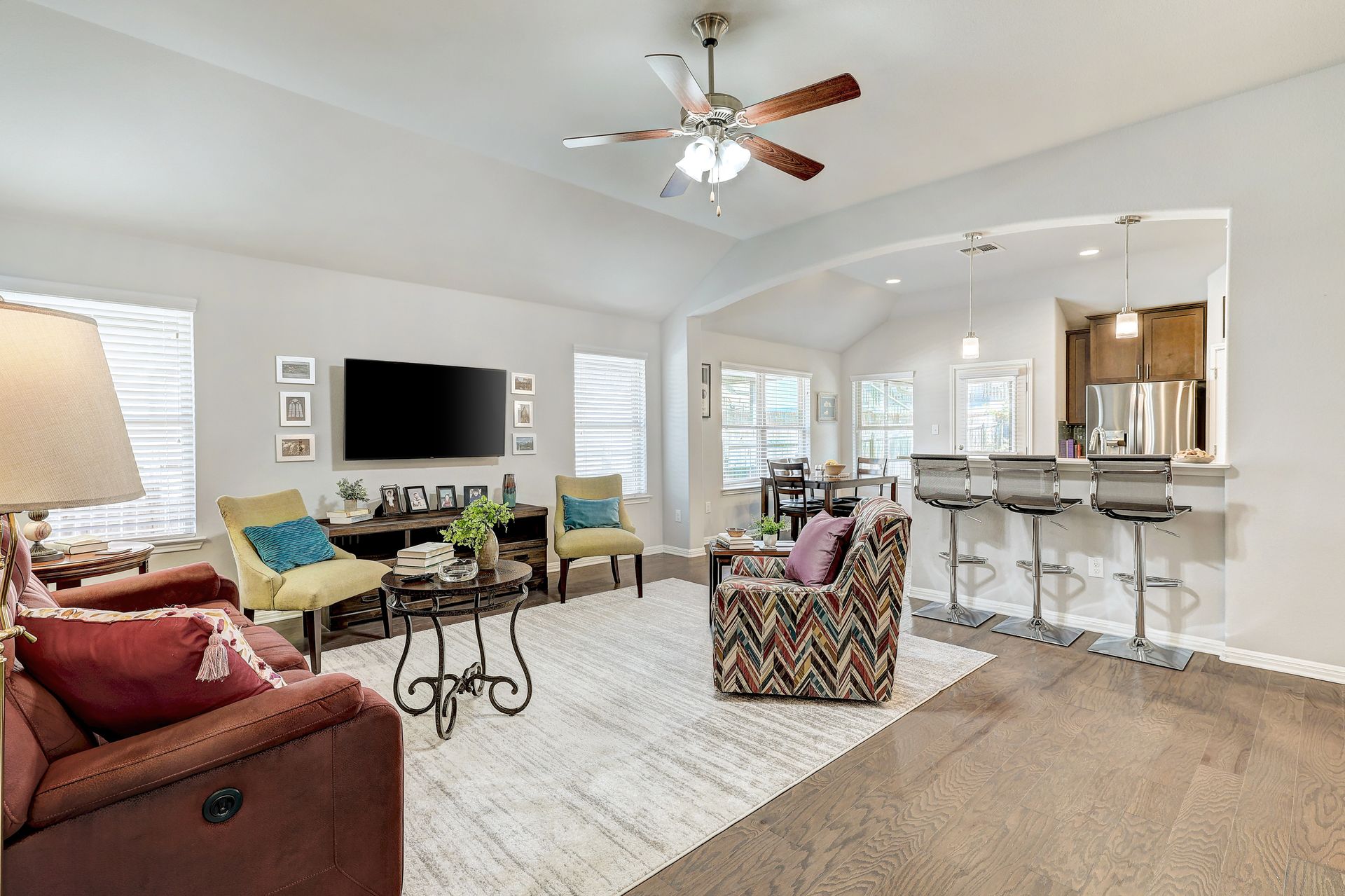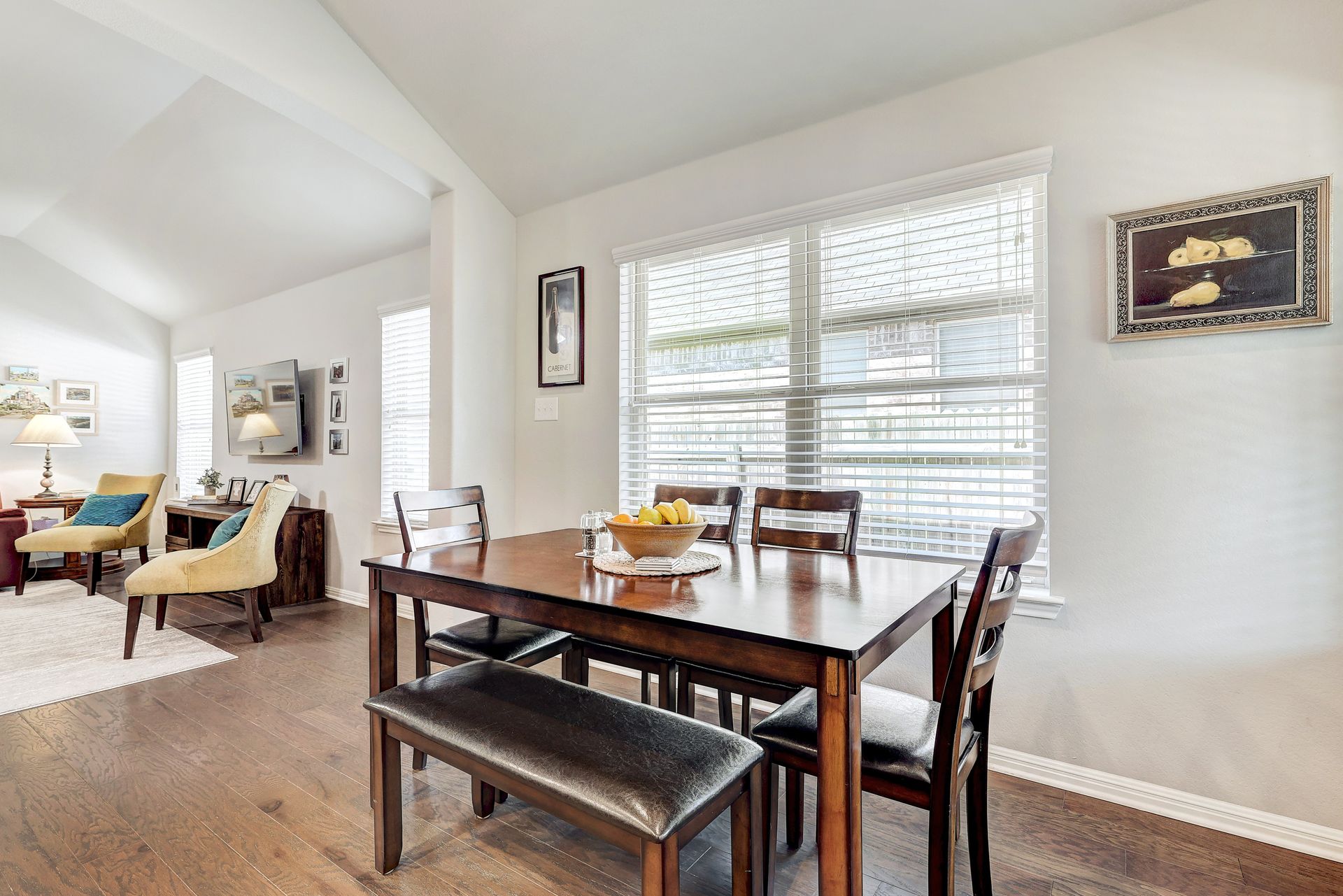 The inviting front porch guides you into the home, setting the tone for the warm and welcoming atmosphere. The backyard screened porch, accessible from the kitchen, allows for enjoyment of the beautiful landscaping and outdoor environment, providing a seamless indoor-outdoor living experience.