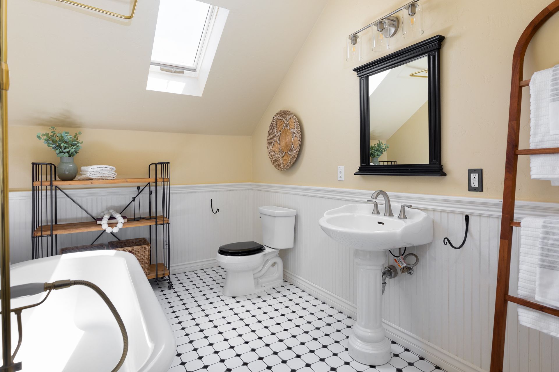 baths, one adorned by a frameless glass shower and the other with a vintage roll-top