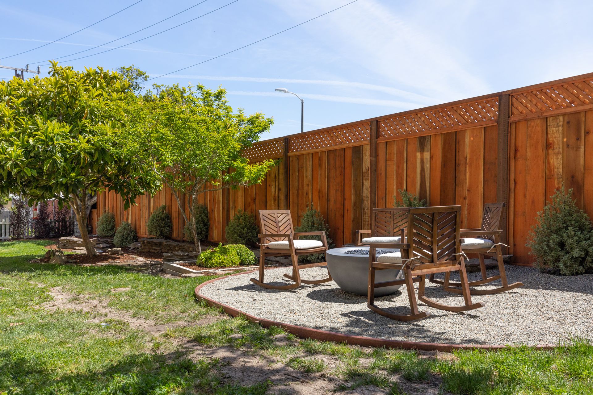 tub. With a new fence, fire pit area, and flourishing landscaping, the secluded backyard