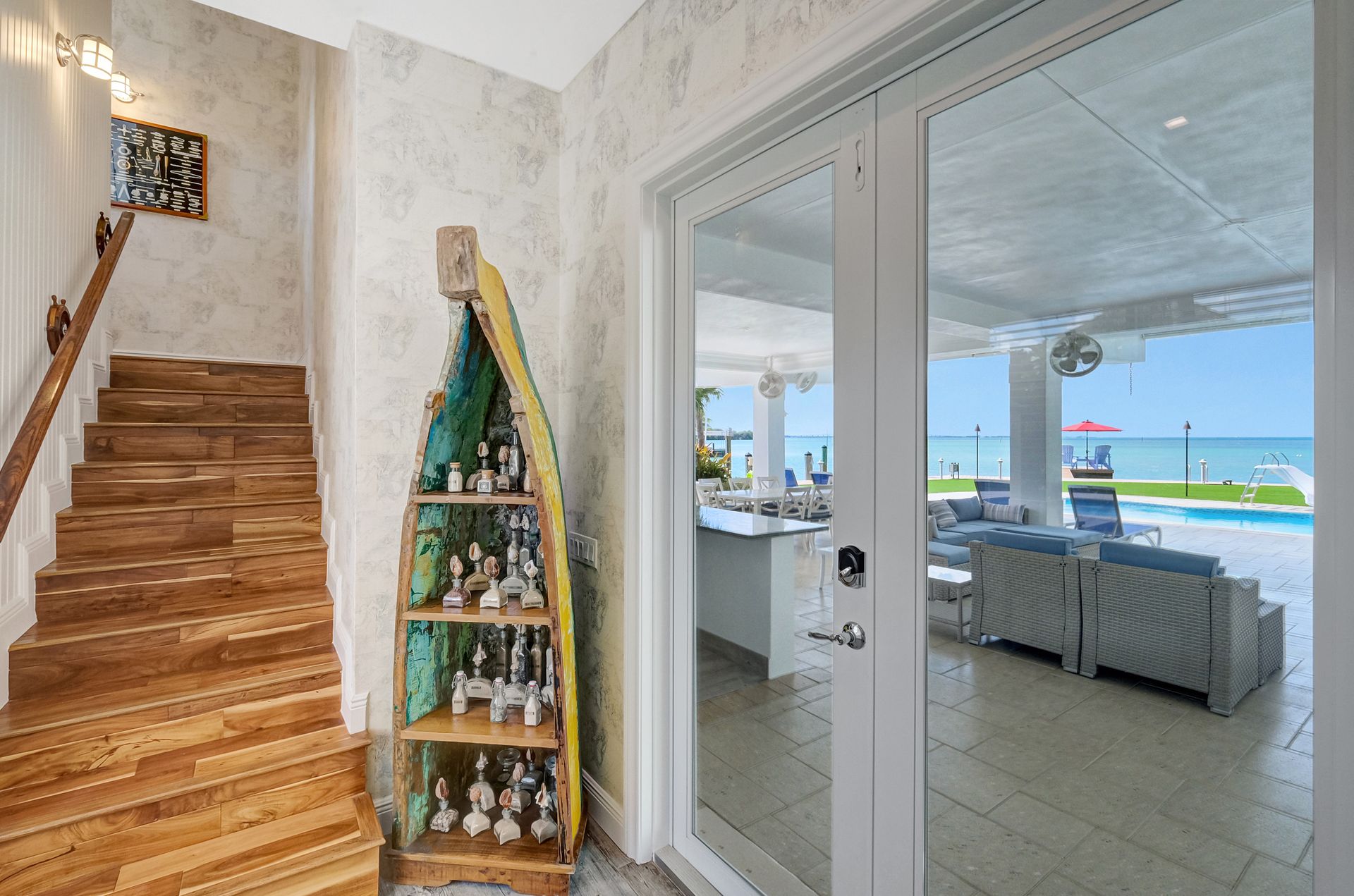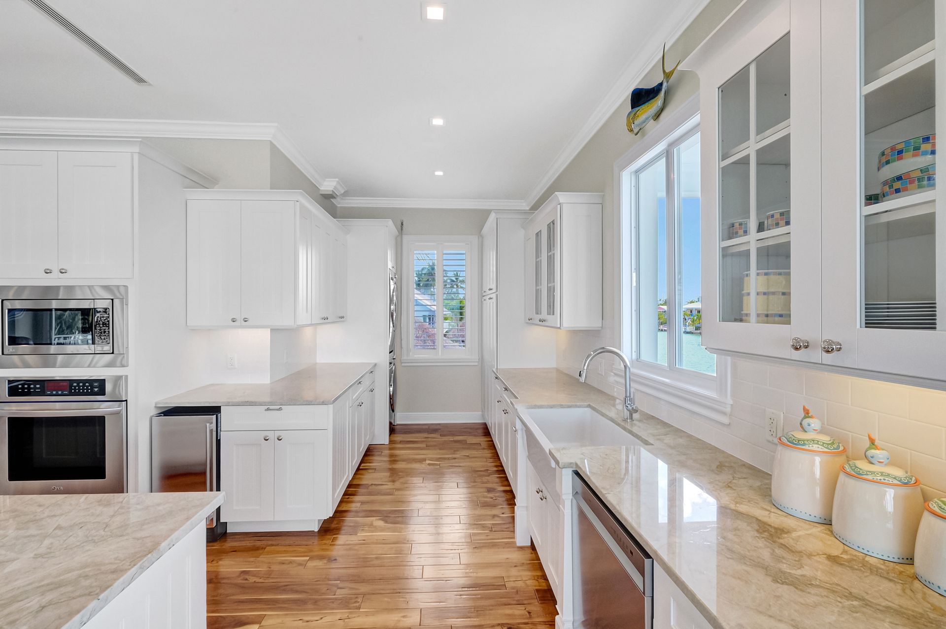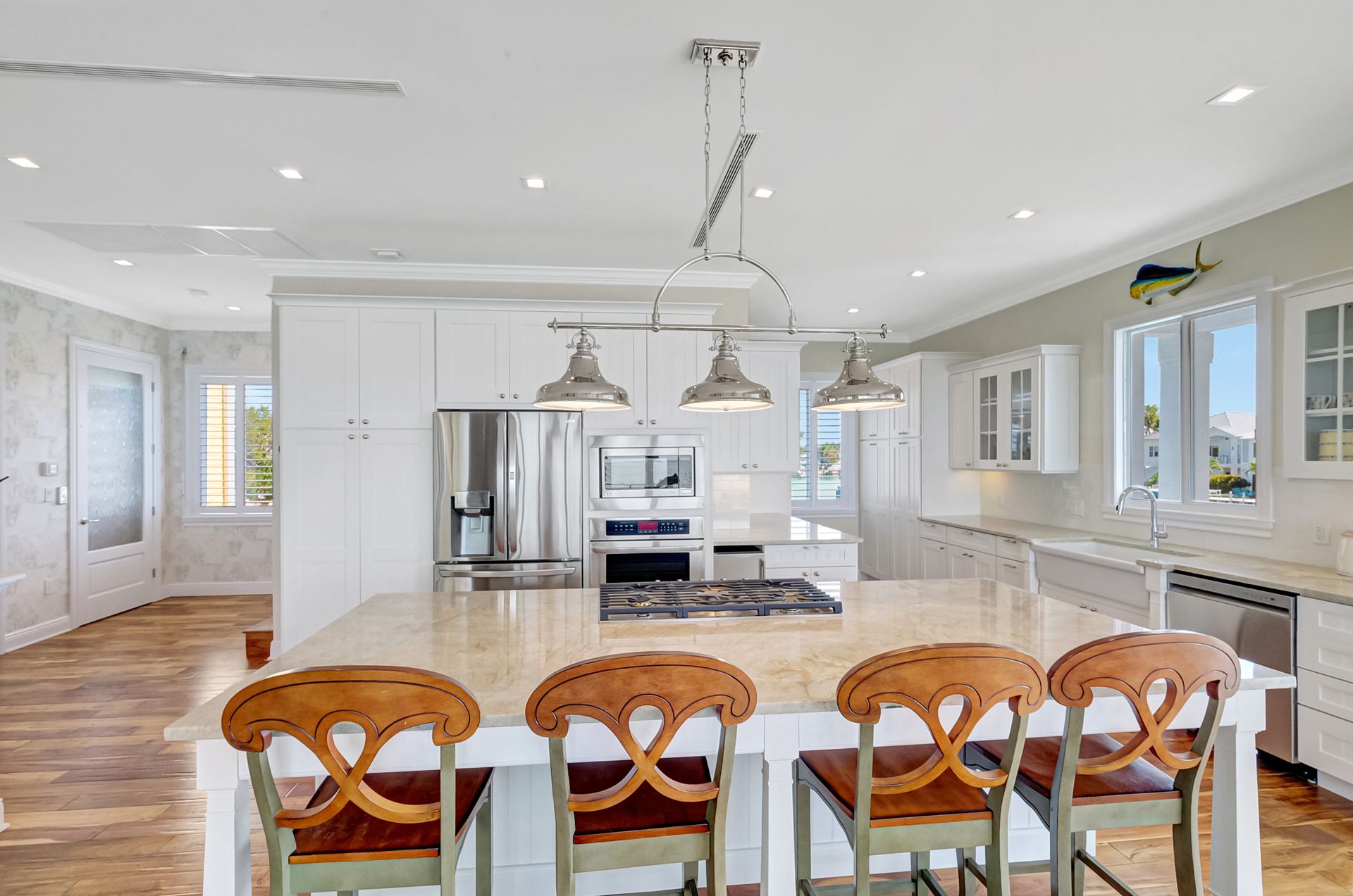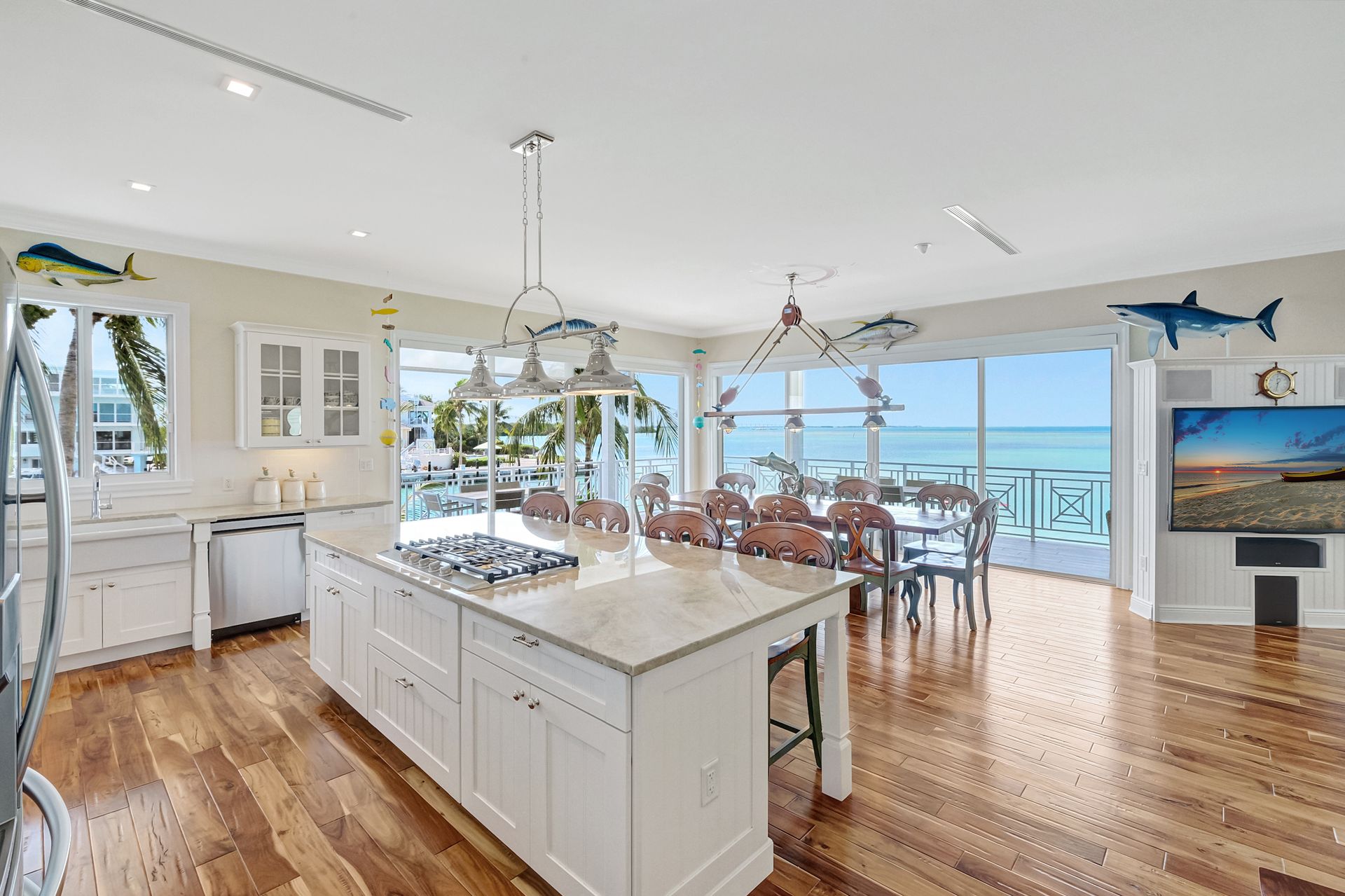 Inside, the home features eight spacious bedrooms, each with its own en-suite bath, plus two additional half baths for convenience. The primary suite is a private sanctuary with a spa-inspired bath, while the open layout showcases spectacular water views through impact windows and sliding glass doors. An elevator ensures effortless access to all levels, and the large balcony invites you to savor the views. The gourmet kitchen, complete with high-end stainless steel appliances and gas cooktop, is a chef’s delight, complemented by an outdoor kitchen for alfresco entertaining. With its seamless indoor-outdoor design and unmatched location, this property is the epitome of luxurious Keys living.