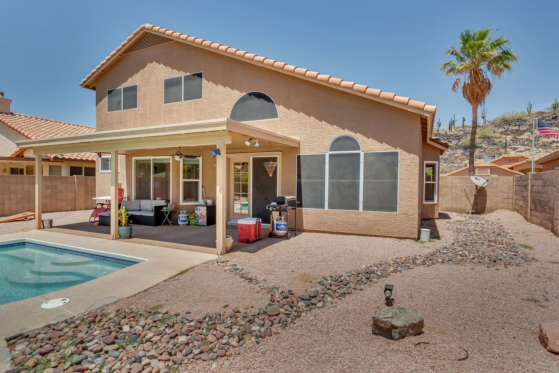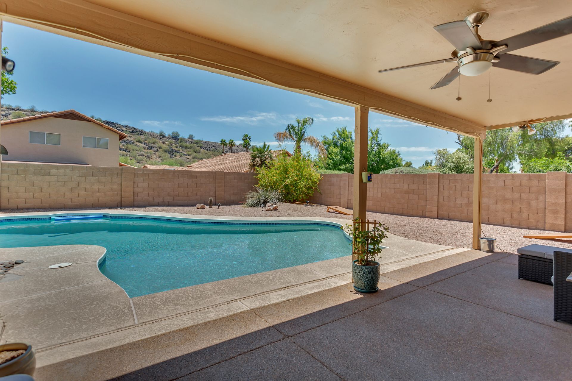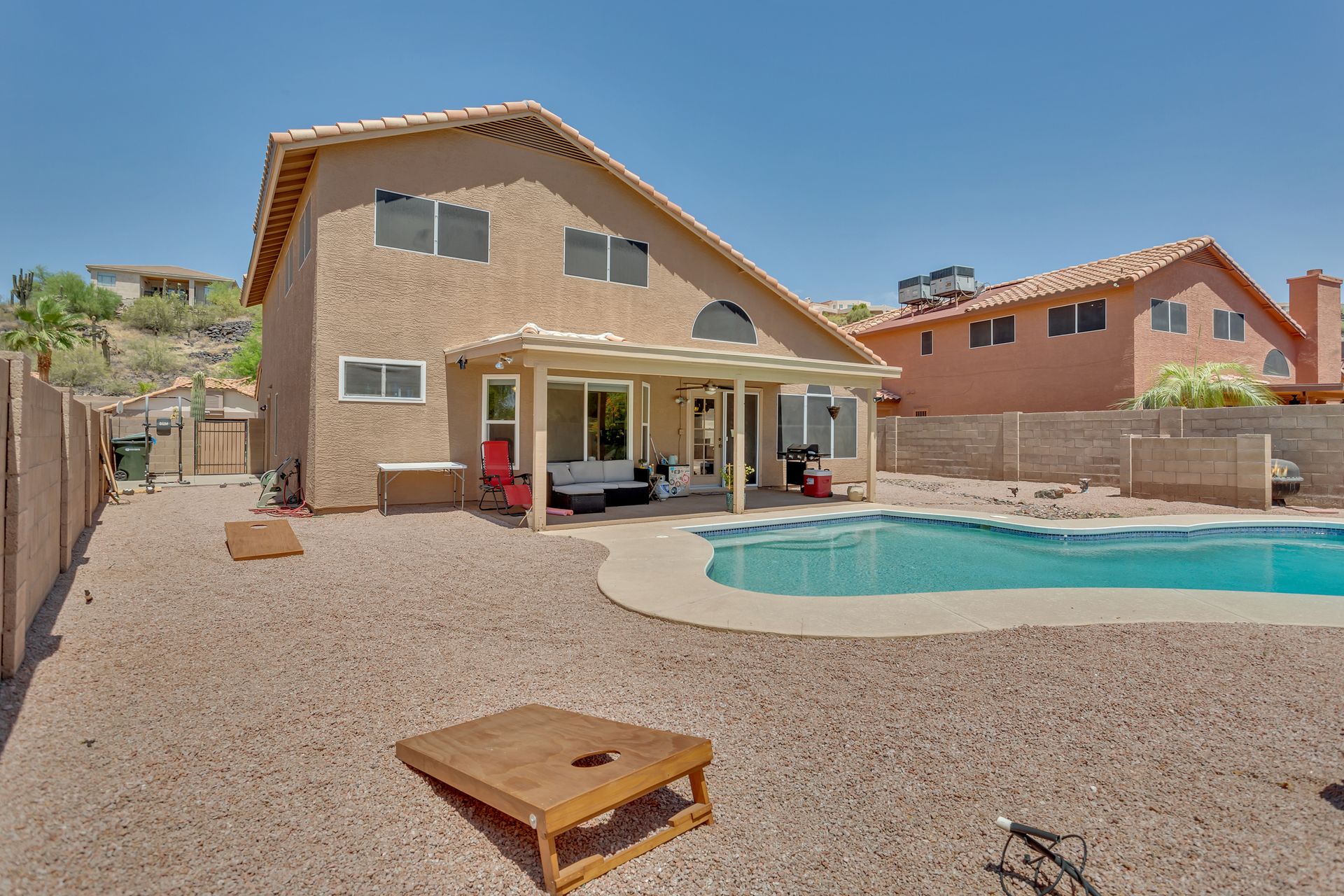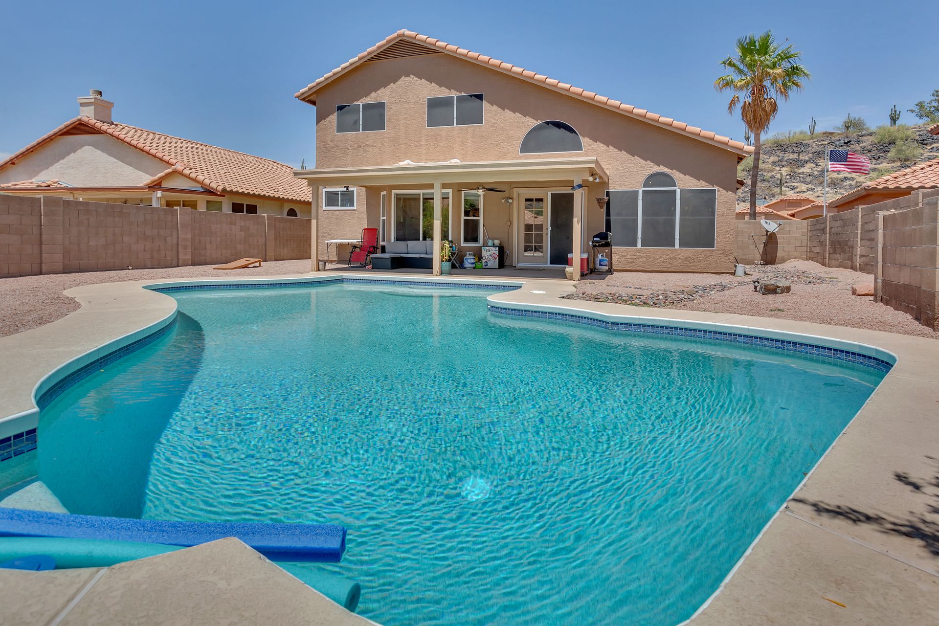 Enjoy dazzling mountain views from every angle of this desirable Moon Mountain Vista home! With three bedrooms, two and a half-bathrooms, and more than 2,200 square-feet of livable space, this home has been well-maintained and features soaring vaulted ceilings, and a large great room that flows into an eat-in kitchen. Bay windows have been placed throughout the home, including the rare downstairs master suite which looks out to the rear yard. The remaining rooms and full bathroom are located upstairs off the sizable loft. Enjoy outdoor living in the backyard with a covered patio for relaxing and enjoying the Arizona weather, and the private pebble tec pool to cool off during those hot summer days. The possibilities are endless, come use your creative mind to build your dream home!
