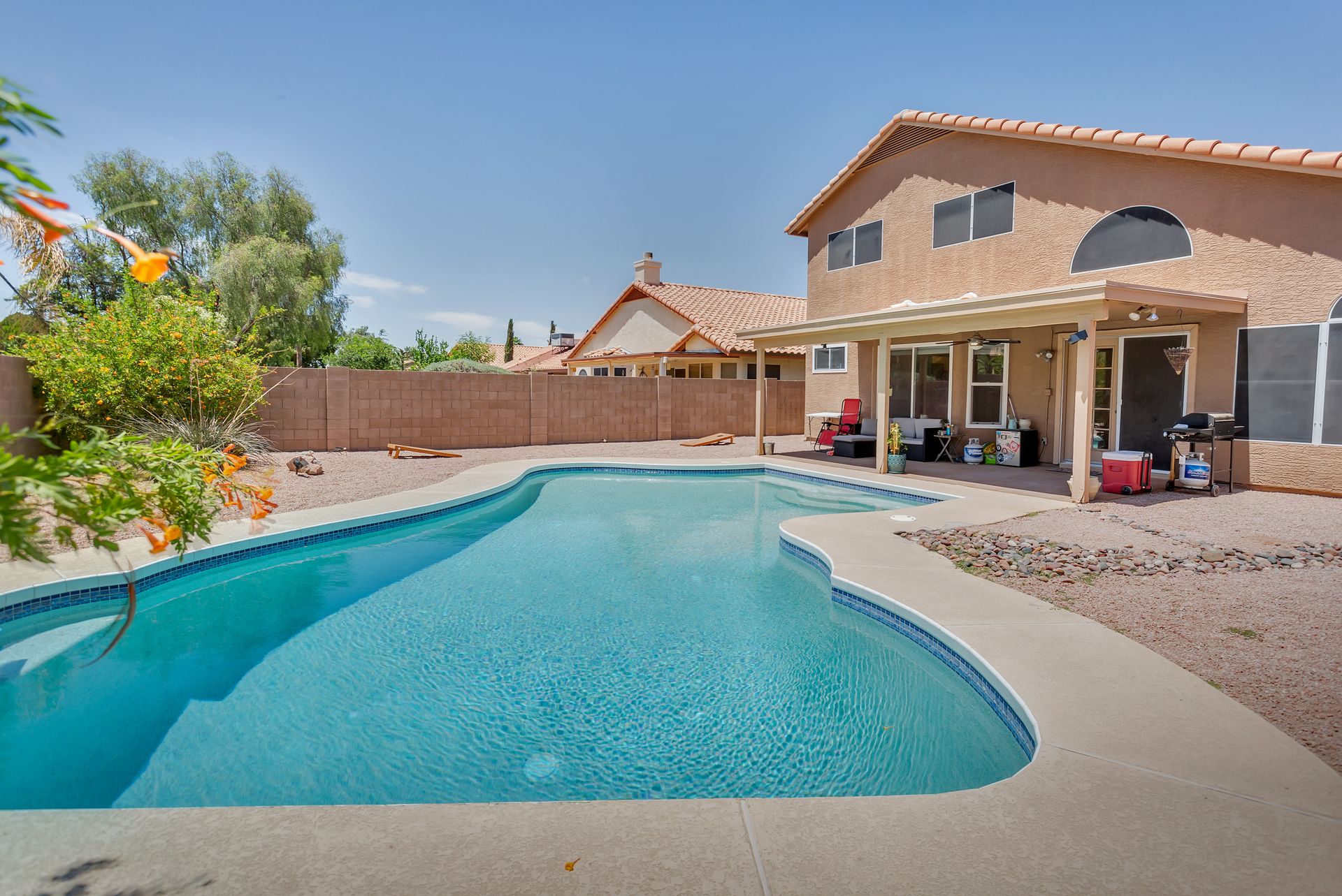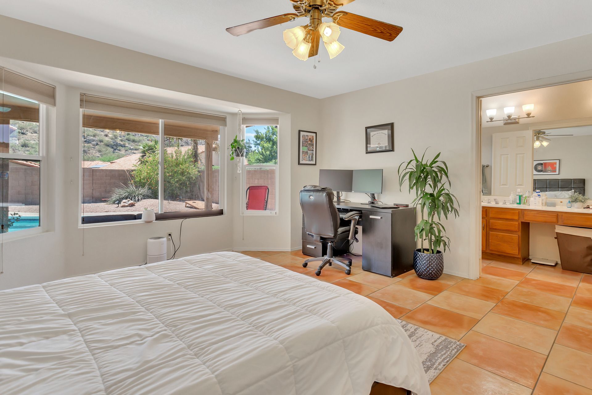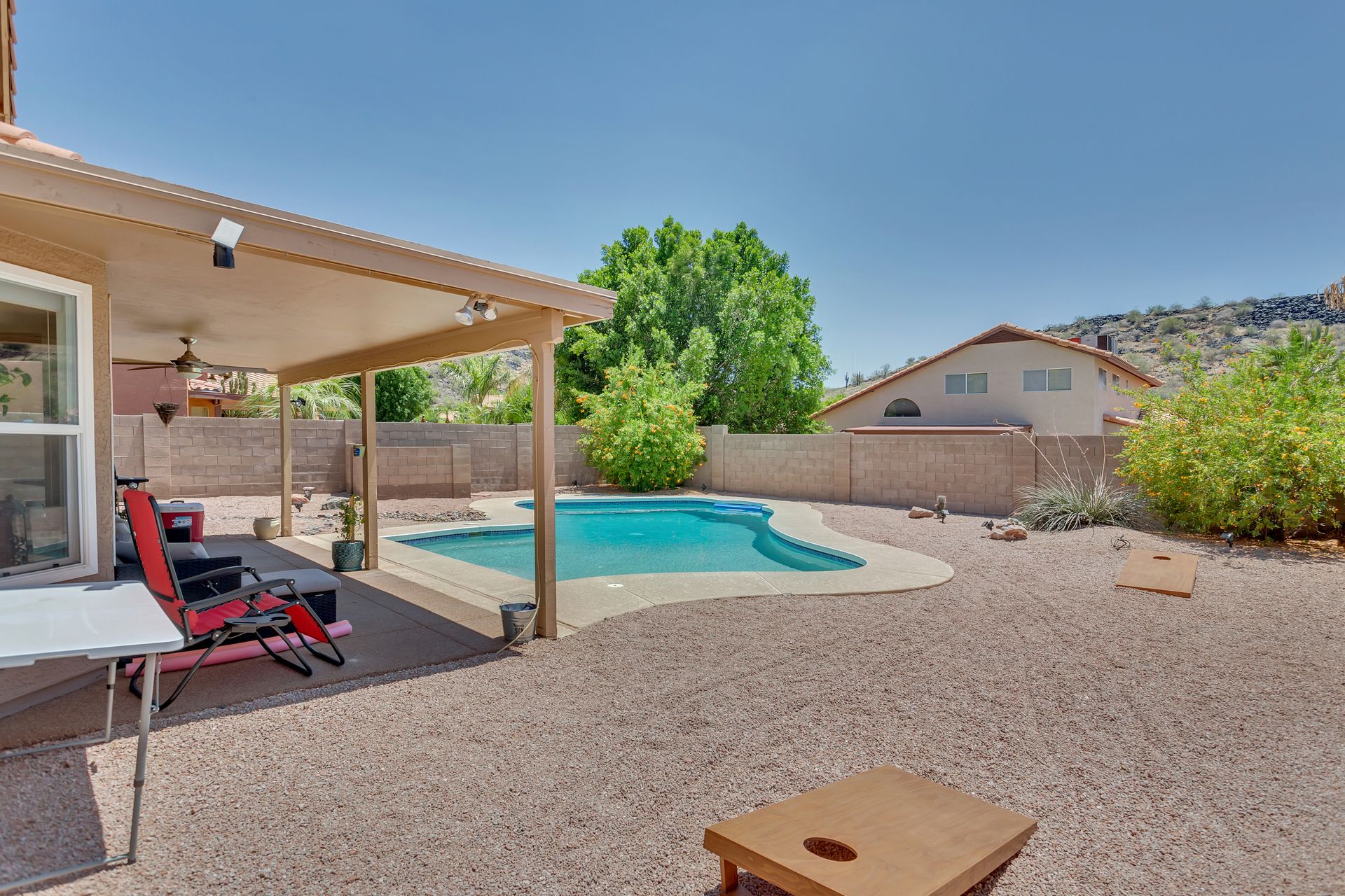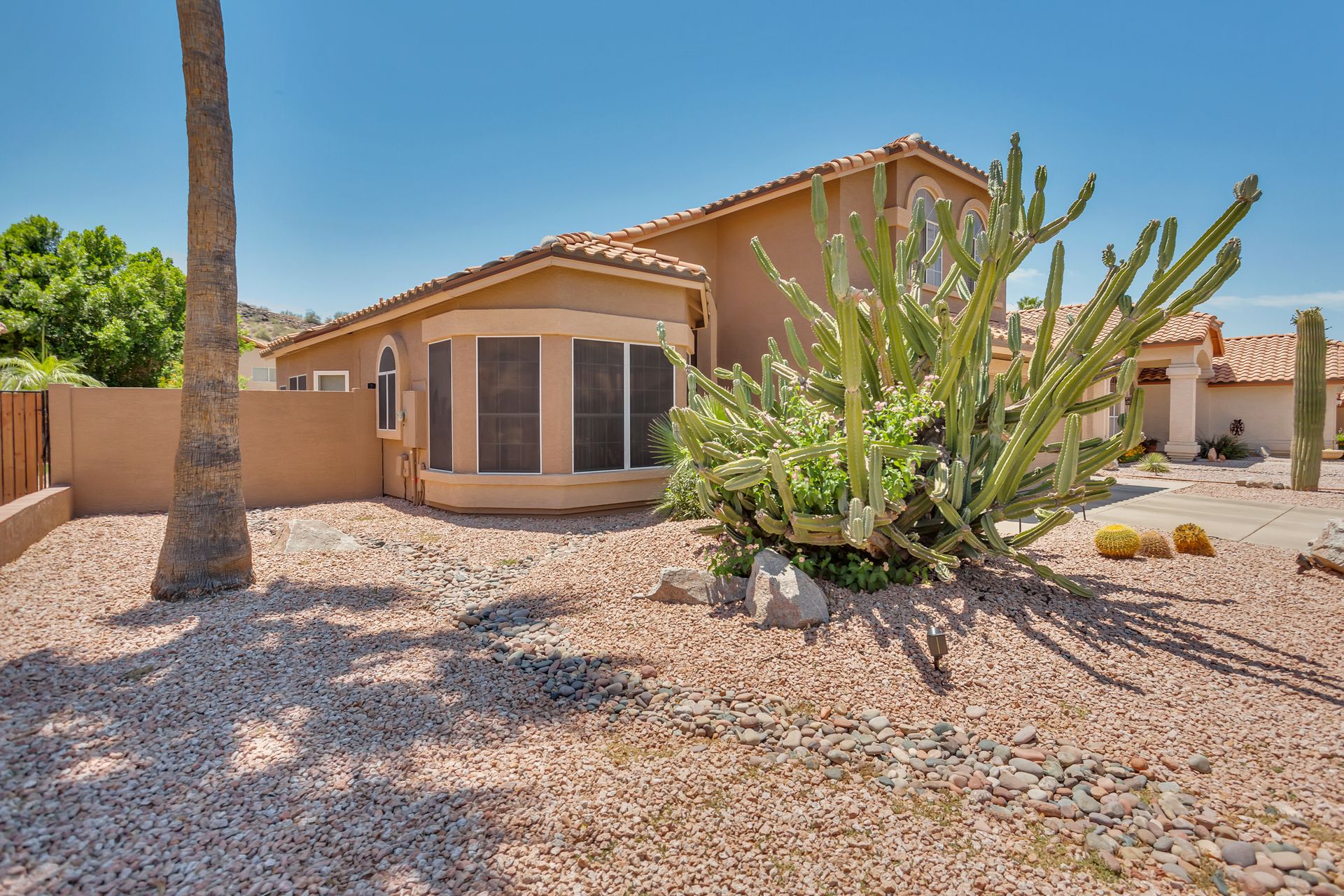 Enjoy dazzling mountain views from every angle of this desirable Moon Mountain Vista home! With three bedrooms, two and a half-bathrooms, and more than 2,200 square-feet of livable space, this home has been well-maintained and features soaring vaulted ceilings, and a large great room that flows into an eat-in kitchen. Bay windows have been placed throughout the home, including the rare downstairs master suite which looks out to the rear yard. The remaining rooms and full bathroom are located upstairs off the sizable loft. Enjoy outdoor living in the backyard with a covered patio for relaxing and enjoying the Arizona weather, and the private pebble tec pool to cool off during those hot summer days. The possibilities are endless, come use your creative mind to build your dream home!