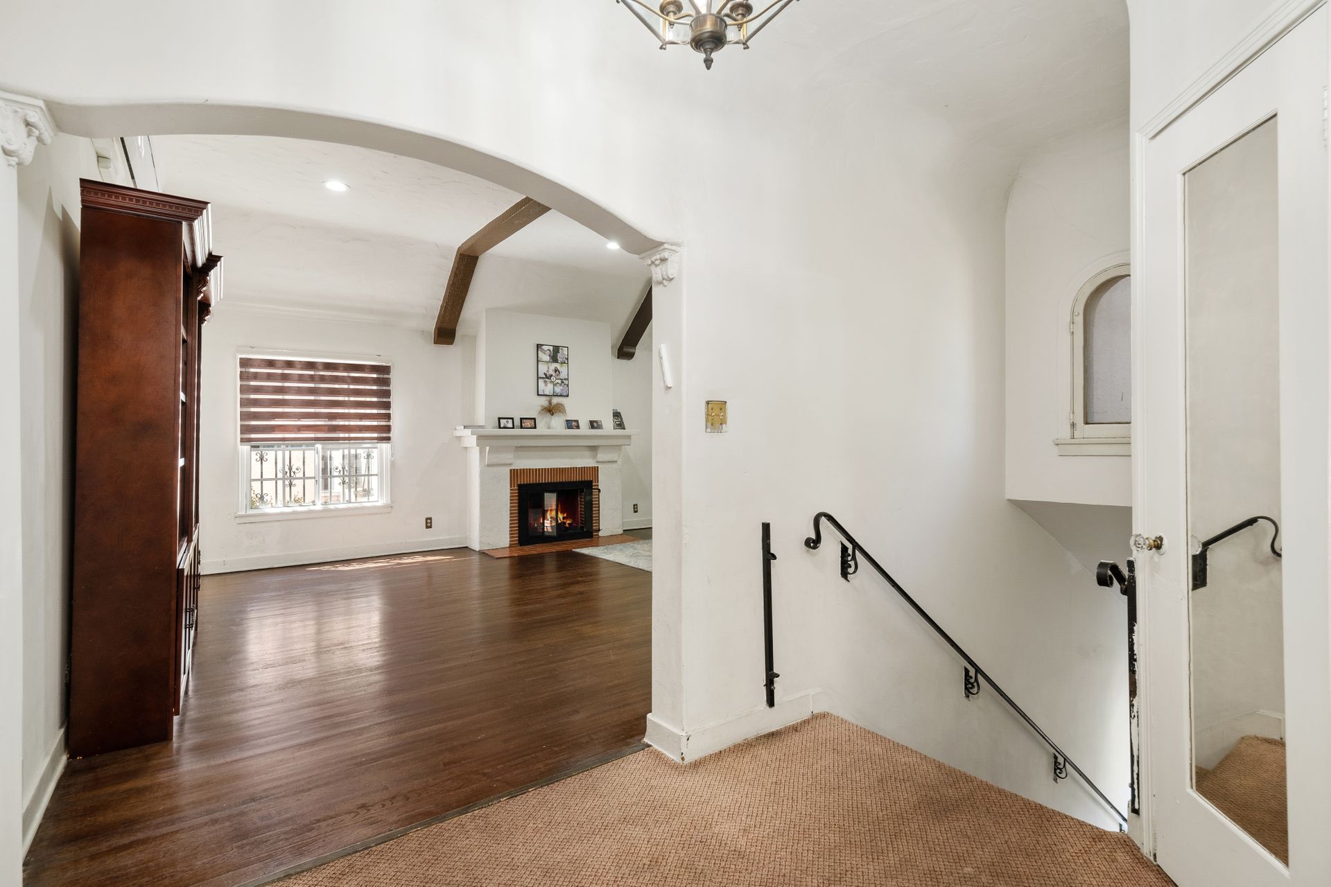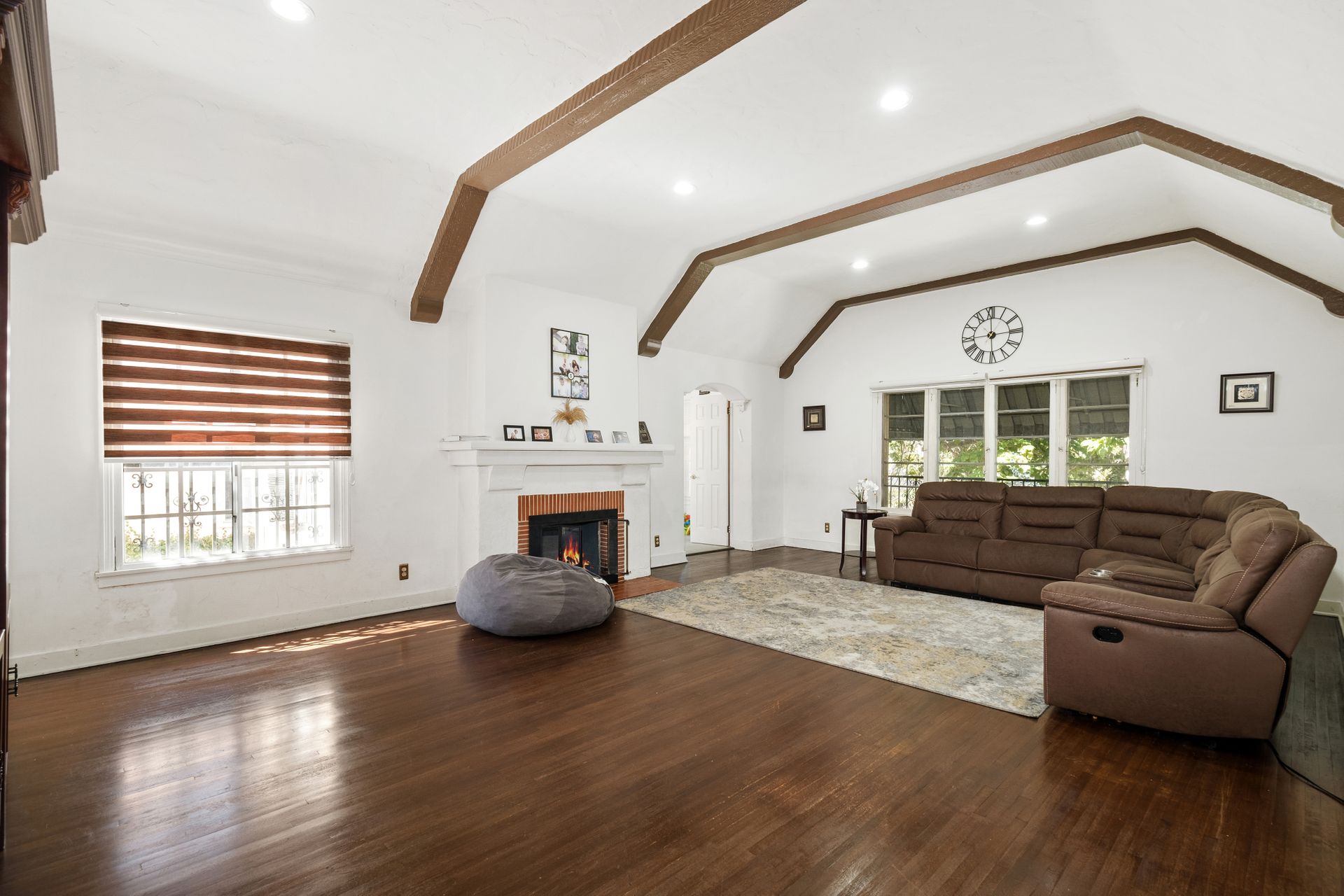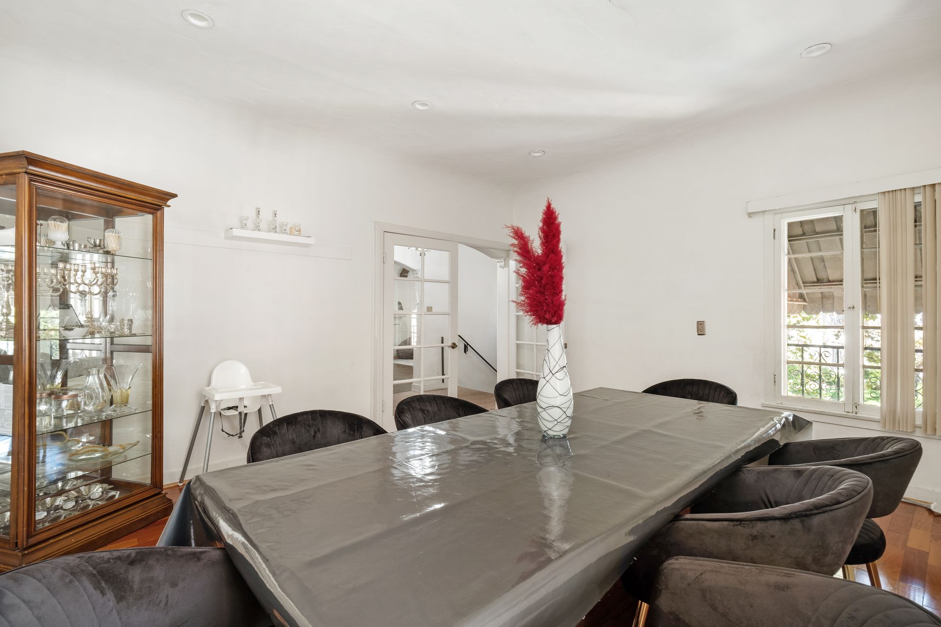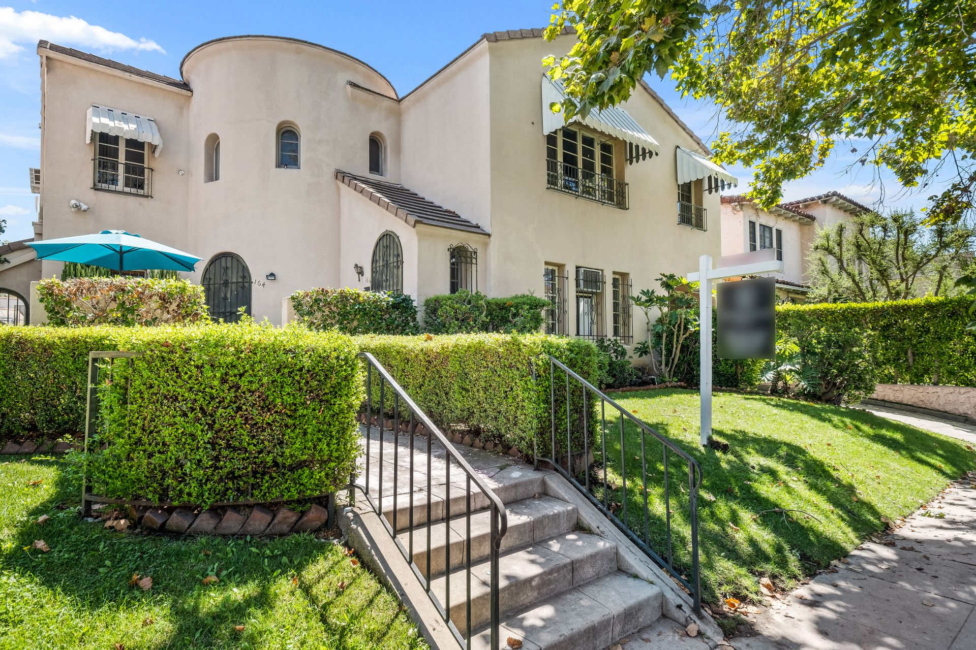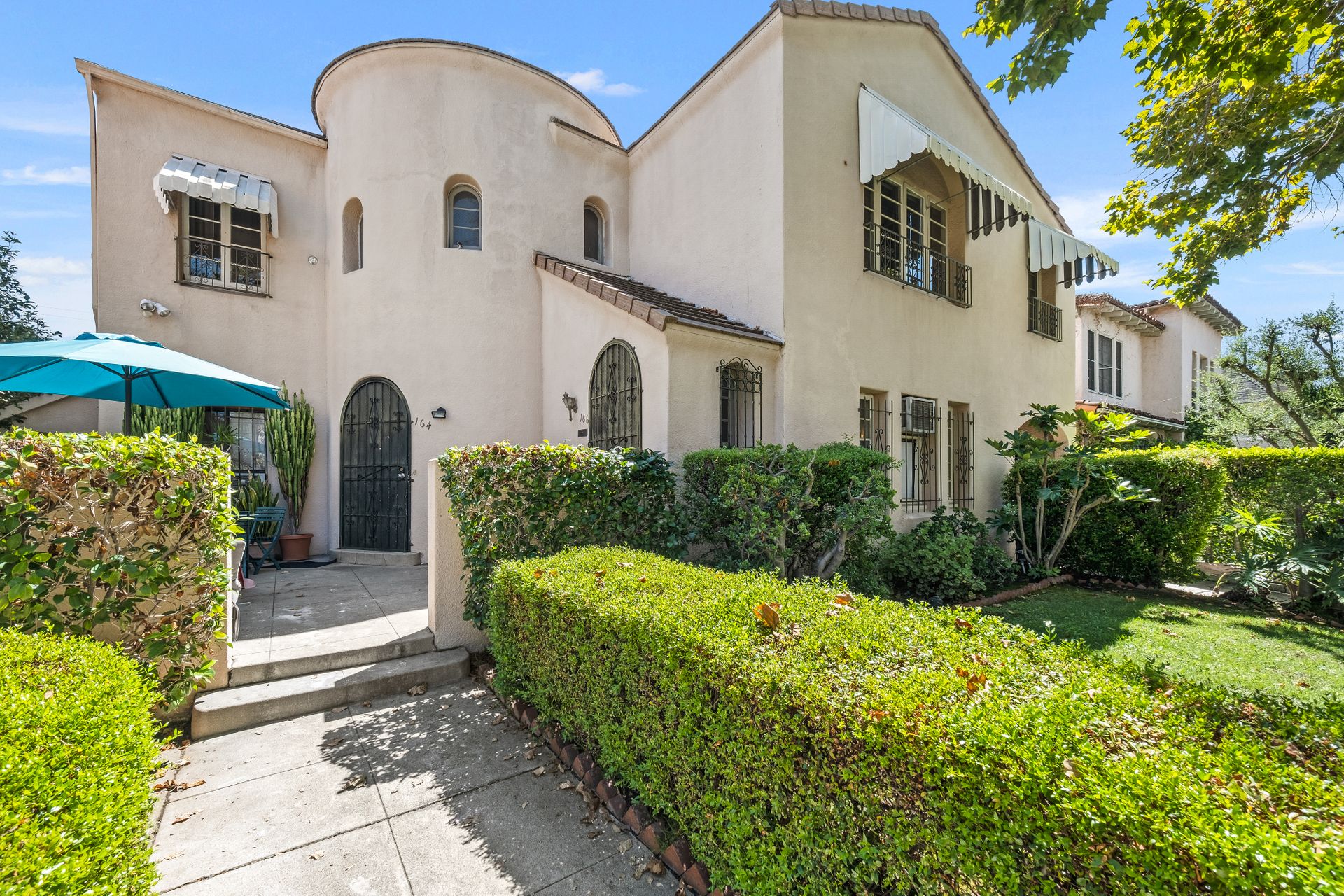 Spanish-style Duplex spanning over 5,000 square feet located on the sought-after Mansfield Avenue. This unique property showcases its original floor plan, with each unit boasting three spacious bedrooms and two baths, while the upper unit offers an additional fourth room above the driveway, a little office in the front tower and a powder room. The upstairs living room is adorned with high ceilings with wooden beams and a character-rich fireplace. Adjacent is a generously sized formal dining room. A well-appointed kitchen, abundant in storage, connects to a breakfast room on one side and a laundry room on the other. The property features two double-car garages and a charming yard.