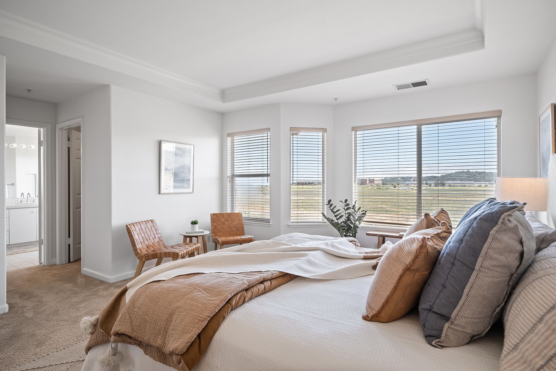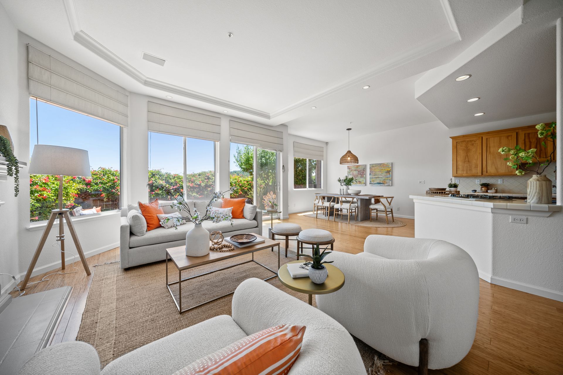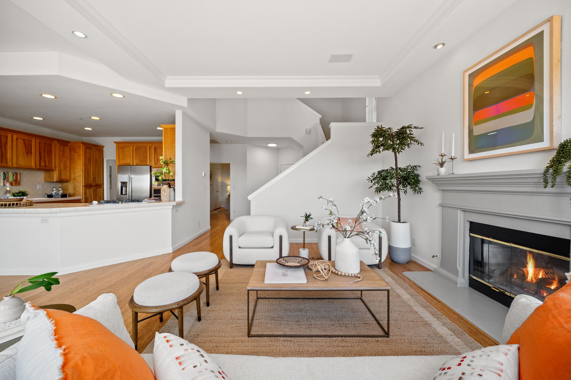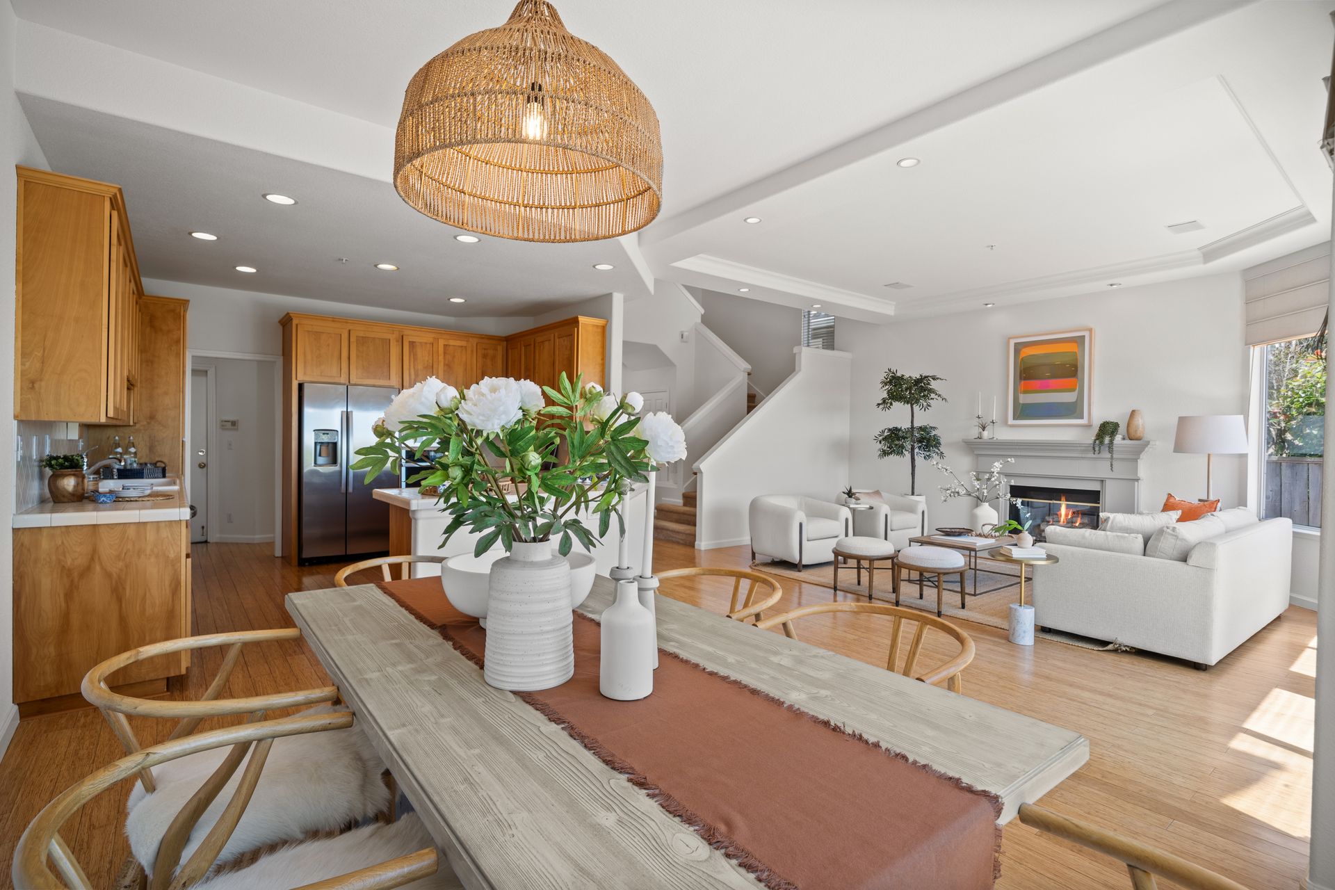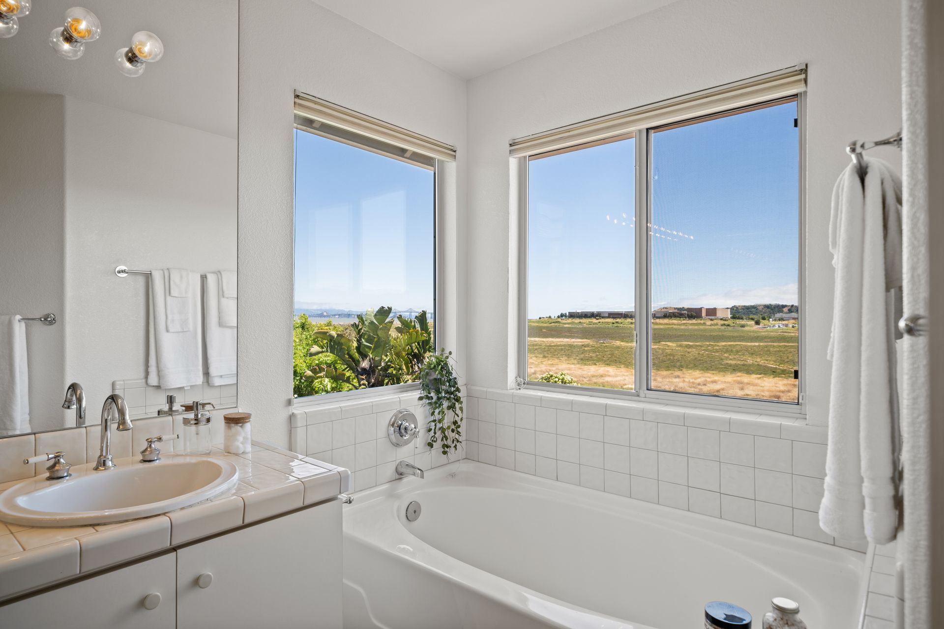 This chic, two-story contemporary townhome is located in 'The Peninsula' phase of Baypoint Lagoons. You'll feel right at home from the minute you enter into this tasteful and comfortable home. Enjoy the extensive BAY VIEWS, live and breathe the salt air and watch the sunrise and moonrise above Richmond Bridge from both levels. The spacious open floor plan with tall windows bringing in the natural southern light and expansive vistas. Don’t miss the cathedral ceiling, recessed lighting, a gas fireplace, bamboo floors and custom drapery. A large chef's kitchen offers a newly installed stainless steel refrigerator, a stainless steel oven and microwave and newly installed furnace. The dining area opens to the rear yard for easy entertaining and BBQs. The beautiful and peaceful low-maintenance backyard features a brick patio, babbling fountain and lush trumpet vine. The primary suite has expansive views from the bedroom and bathroom. The primary bathroom has a two-sink vanity, a soaking tub with a bay view and a stall shower with a circular window, bringing in fabulous light. There are dual walk-in closets. All three bedrooms are generous in size and have full bathrooms. The well-maintained PUD features resort-like amenities with a community heated pool, spa and clubhouse (across the street), tennis and two-car garage.