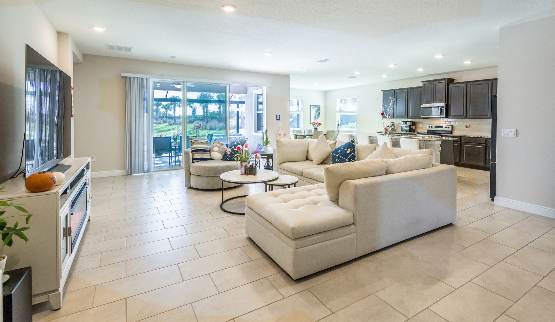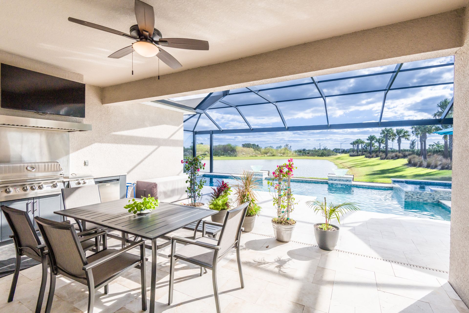 The property includes a salt water pool, spa, and outdoor kitchen, providing ample opportunities for recreation and entertainment. The three-car garage offers abundant storage space.