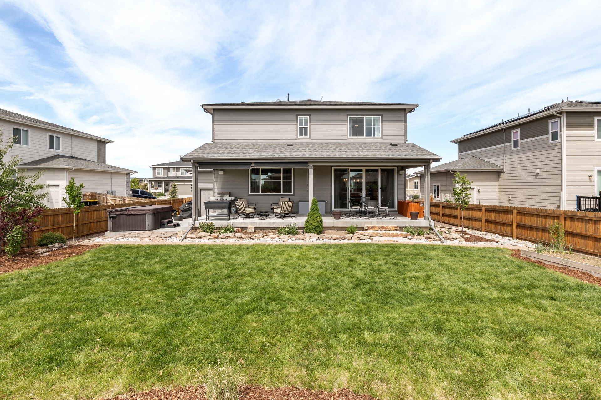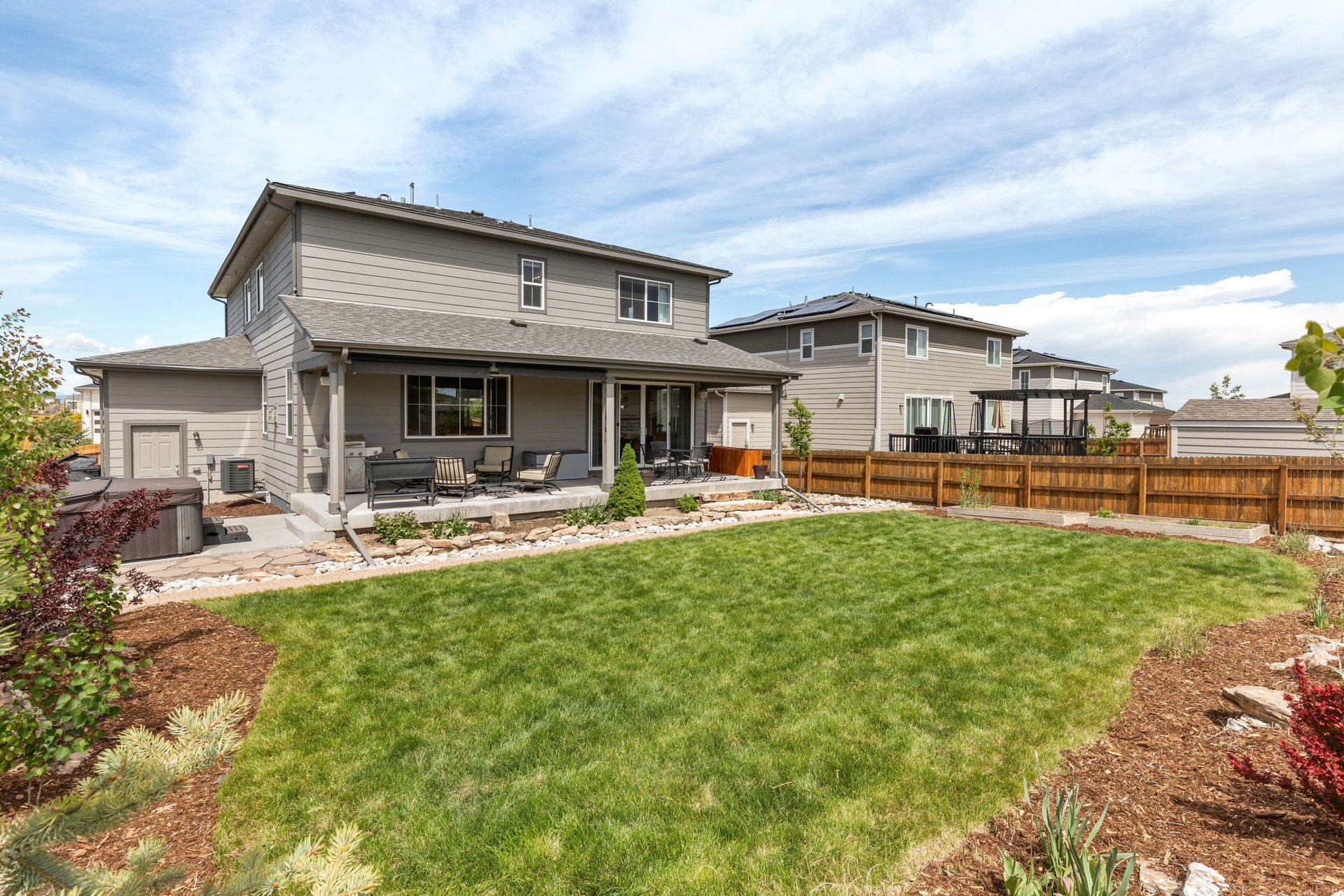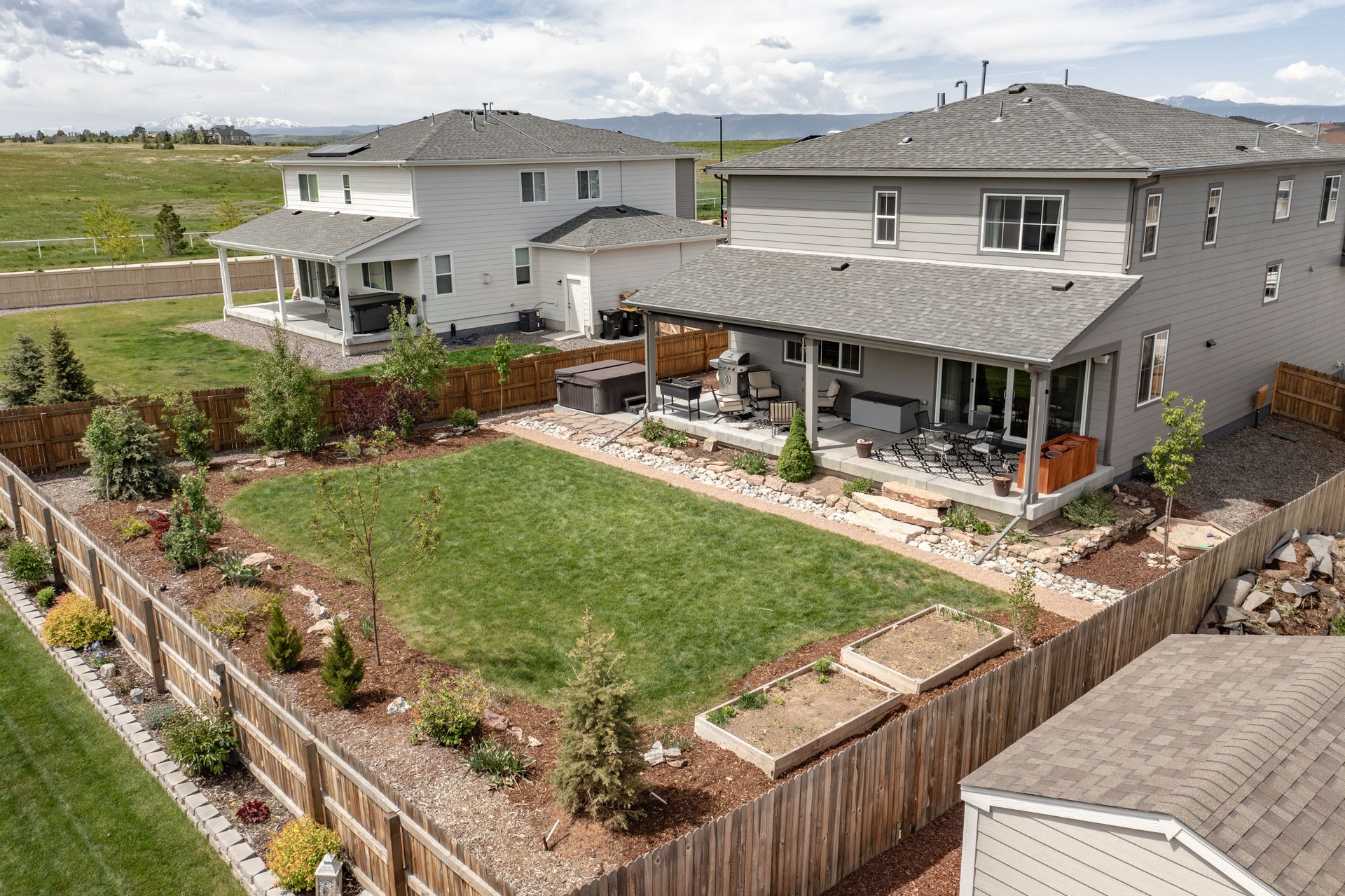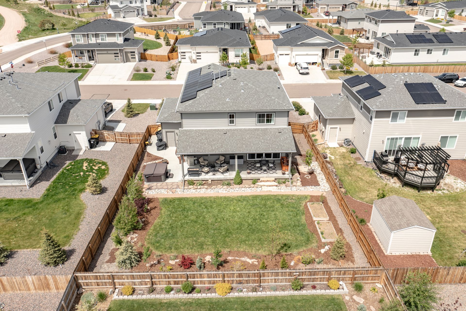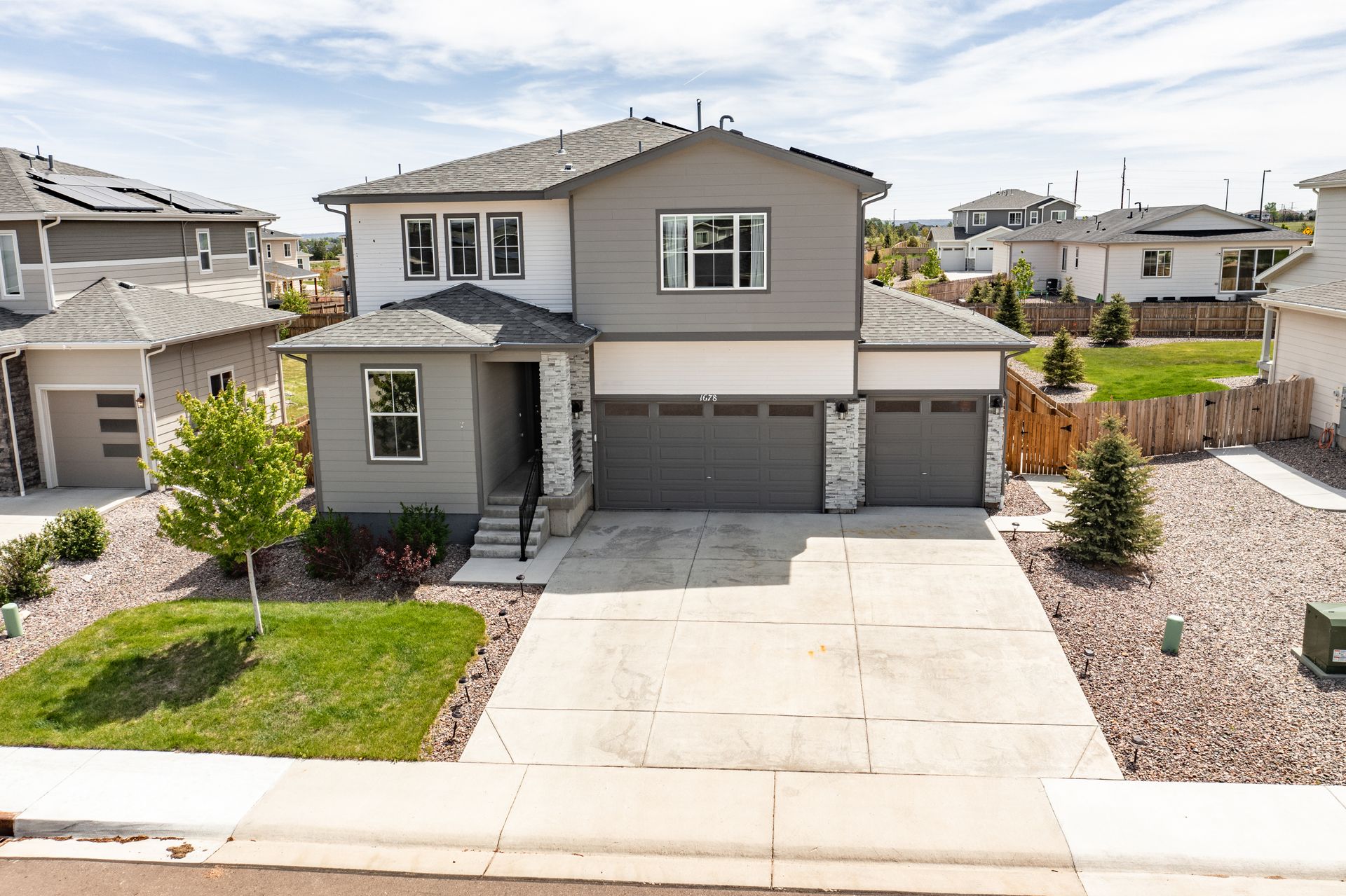 This picture-perfect home is one of the largest in the neighborhood and features a large lot complete with french drain, flagstone walkway, raised garden beds, and numerous trees and shrubs along the perimeter of the fully fenced back yard. Outdoor living is at its best with a convenient hot tub area, and an impressive covered patio running the full length of the home with recessed lights, sun shades, gas line for a grill, and built-in speakers. Inside the home, a foyer with high ceilings and beautiful floors sits at the base of the staircase. A main floor bedroom, currently used as an office, and full bathroom allows for many options for work, guests, or other living arrangements. Within the open concept living area awaits a light and bright kitchen with tiled backsplash, stainless steel appliances, gas range, pantry, built-in speakers, and quartz countertops. The living area features a modern linear fireplace aside the dining area which leads seamlessly through double 8' slider doors to the covered patio. Upstairs, an airy loft with tons of natural light and mountain views creates an additional living/work/recreation space. A large laundry room and linen closet sit conveniently outside of the primary suite. The private primary suite is accompanied by an enormous walk-in closet, and bathroom with raised vanities with double sinks and Corian counters. A thoughtful third full bathroom with double sinks, and three additional bedrooms grace the upper level, one with a large walk-in closet. This home was upgraded beyond the builder's options after move-in. Additional features include a whole house humidifier with two-zone damper system, a full crawl space, solar lease with low monthly payment, and transferable structural warranty. Polishing off this fantastic home is the oversized, insulated, and drywalled 3-car garage with floor coating, 220v, hanging storage, and access to the backyard.