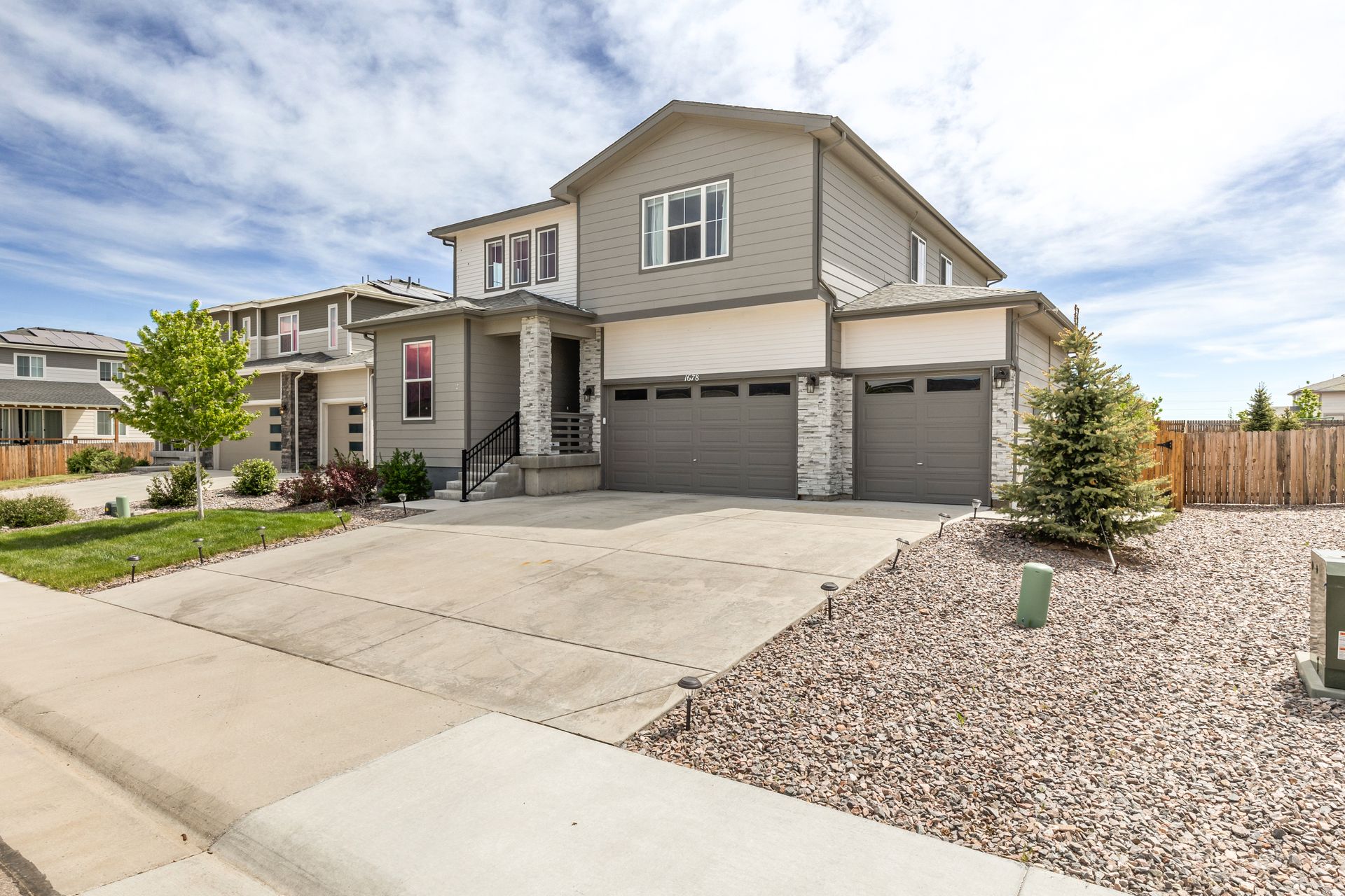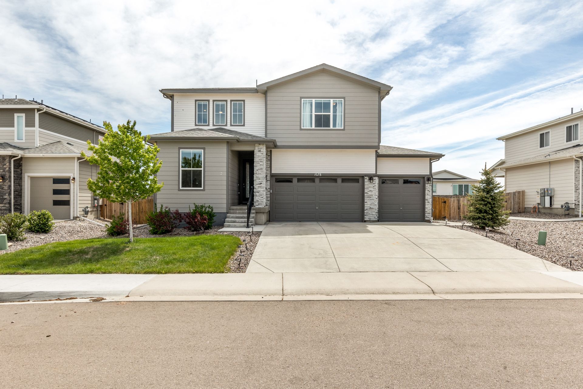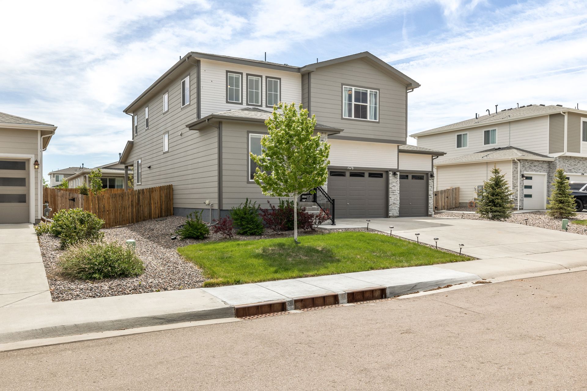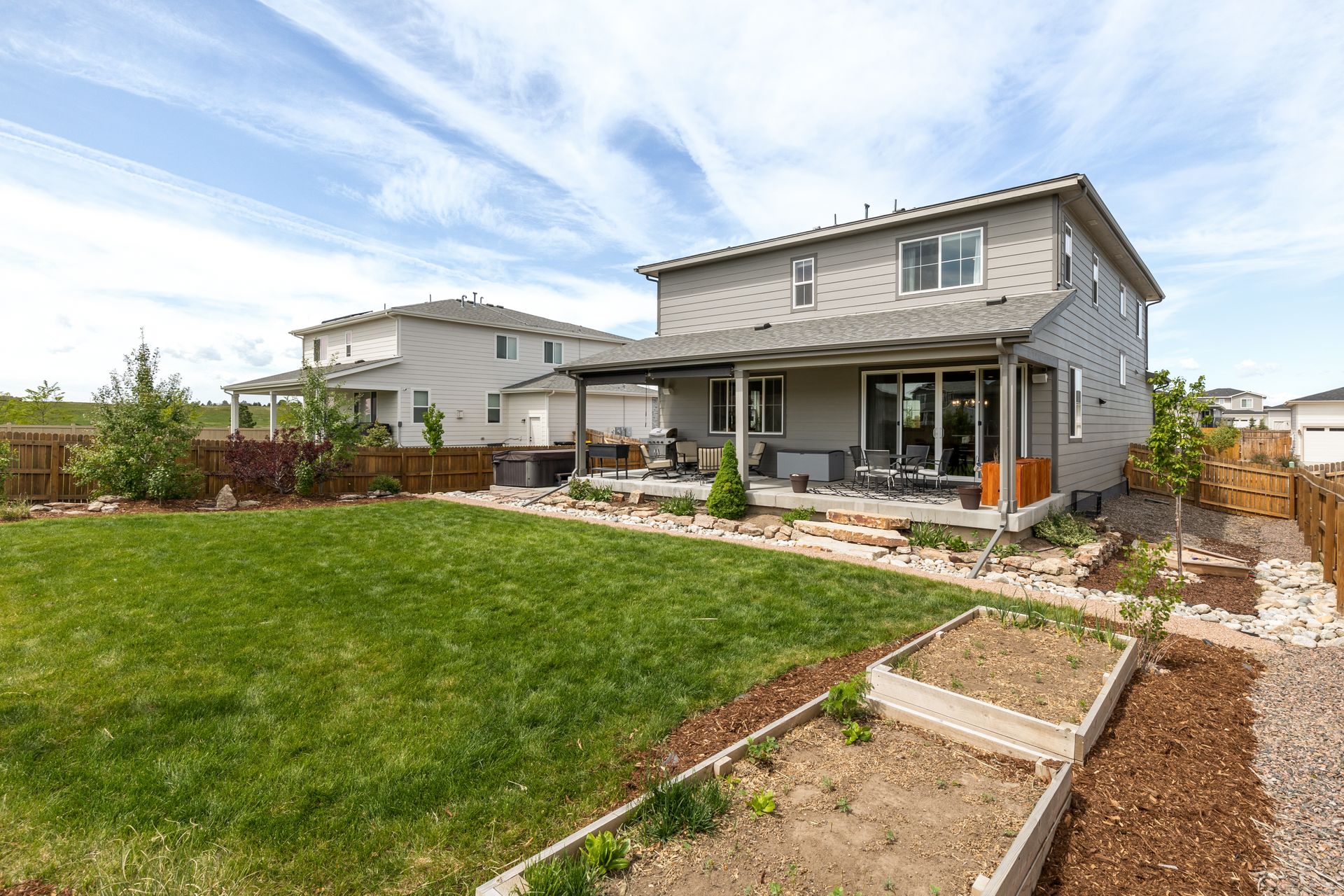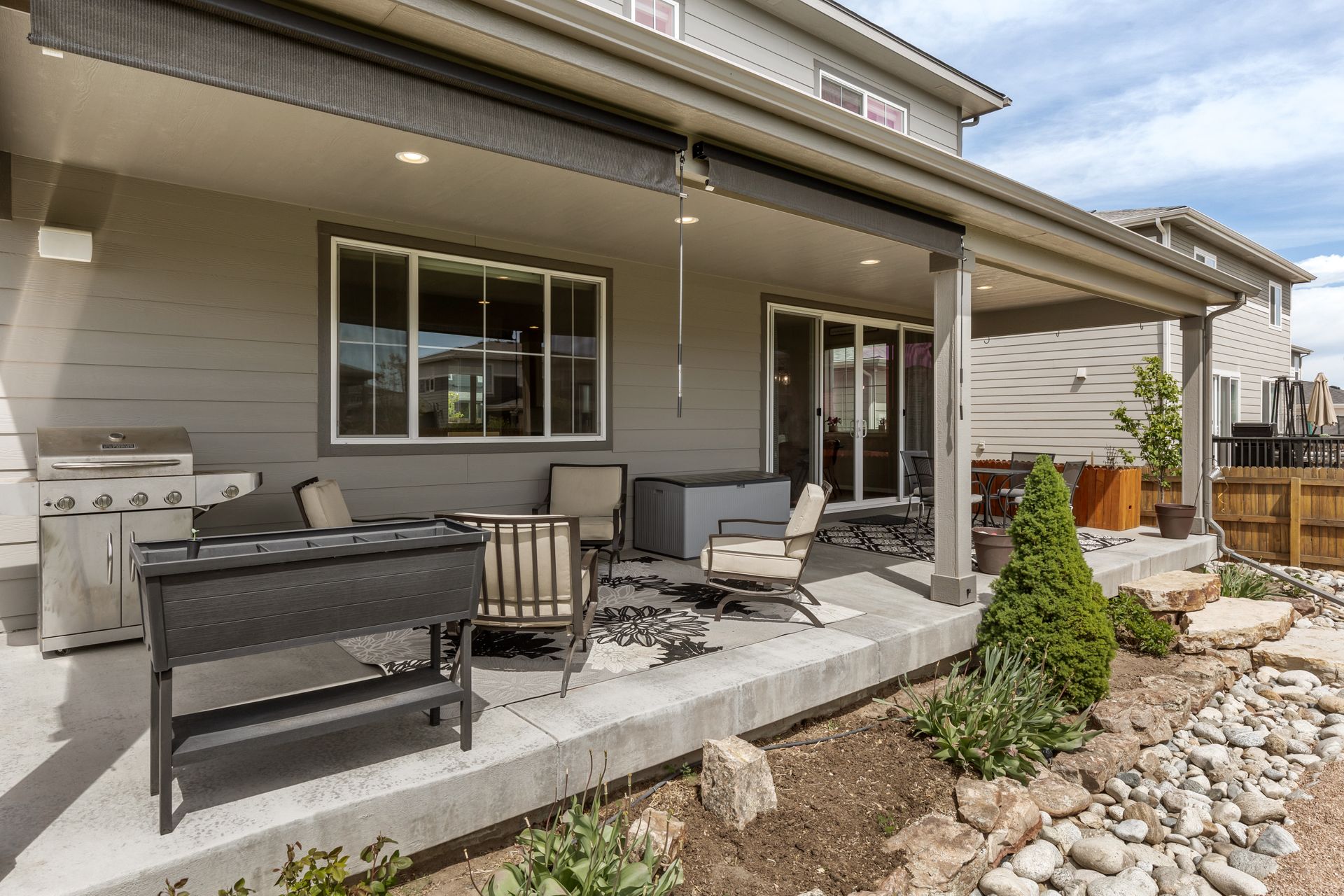 This picture-perfect home is one of the largest in the neighborhood and features a large lot complete with french drain, flagstone walkway, raised garden beds, and numerous trees and shrubs along the perimeter of the fully fenced back yard. Outdoor living is at its best with a convenient hot tub area, and an impressive covered patio running the full length of the home with recessed lights, sun shades, gas line for a grill, and built-in speakers. Inside the home, a foyer with high ceilings and beautiful floors sits at the base of the staircase. A main floor bedroom, currently used as an office, and full bathroom allows for many options for work, guests, or other living arrangements. Within the open concept living area awaits a light and bright kitchen with tiled backsplash, stainless steel appliances, gas range, pantry, built-in speakers, and quartz countertops. The living area features a modern linear fireplace aside the dining area which leads seamlessly through double 8' slider doors to the covered patio. Upstairs, an airy loft with tons of natural light and mountain views creates an additional living/work/recreation space. A large laundry room and linen closet sit conveniently outside of the primary suite. The private primary suite is accompanied by an enormous walk-in closet, and bathroom with raised vanities with double sinks and Corian counters. A thoughtful third full bathroom with double sinks, and three additional bedrooms grace the upper level, one with a large walk-in closet. This home was upgraded beyond the builder's options after move-in. Additional features include a whole house humidifier with two-zone damper system, a full crawl space, solar lease with low monthly payment, and transferable structural warranty. Polishing off this fantastic home is the oversized, insulated, and drywalled 3-car garage with floor coating, 220v, hanging storage, and access to the backyard.
