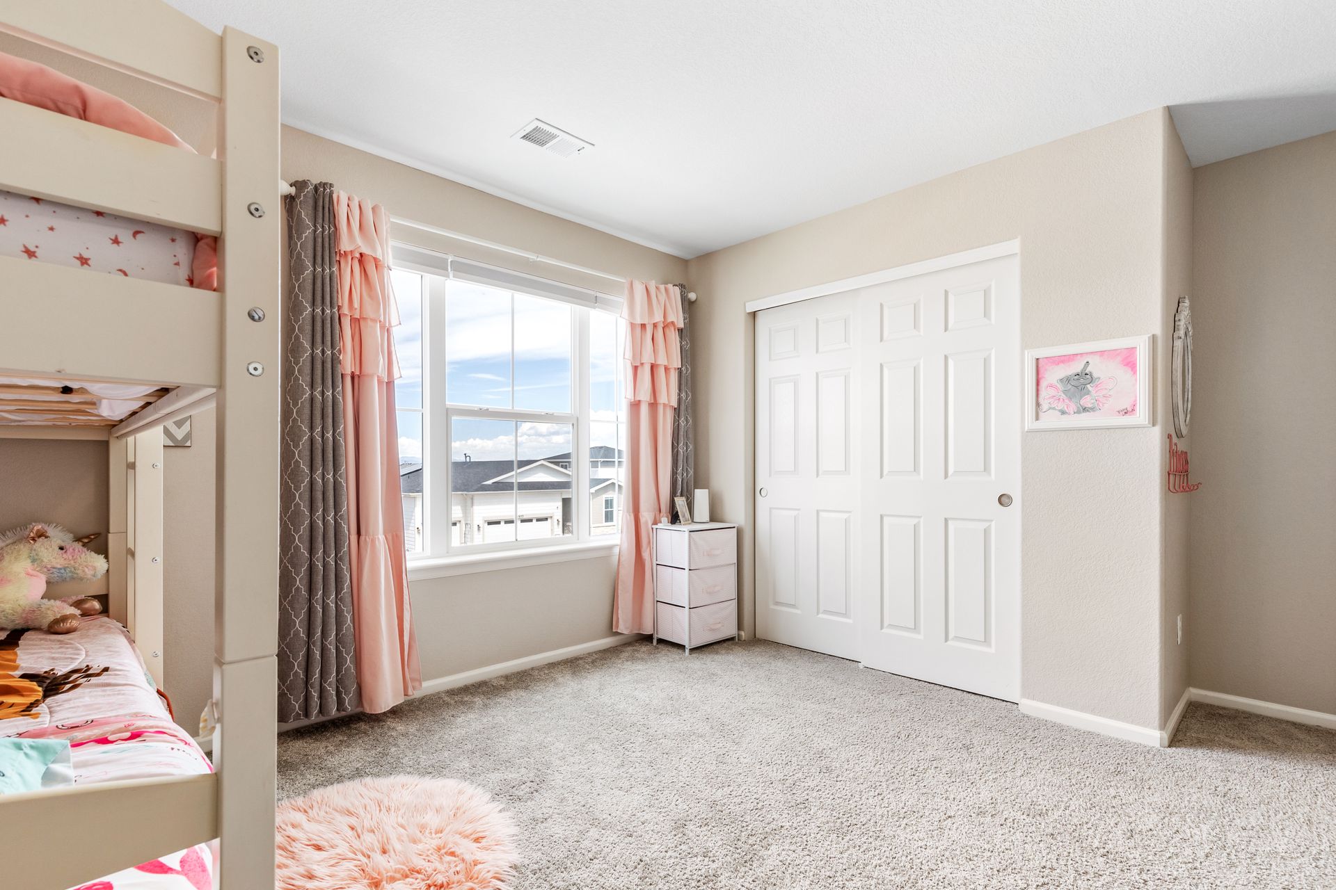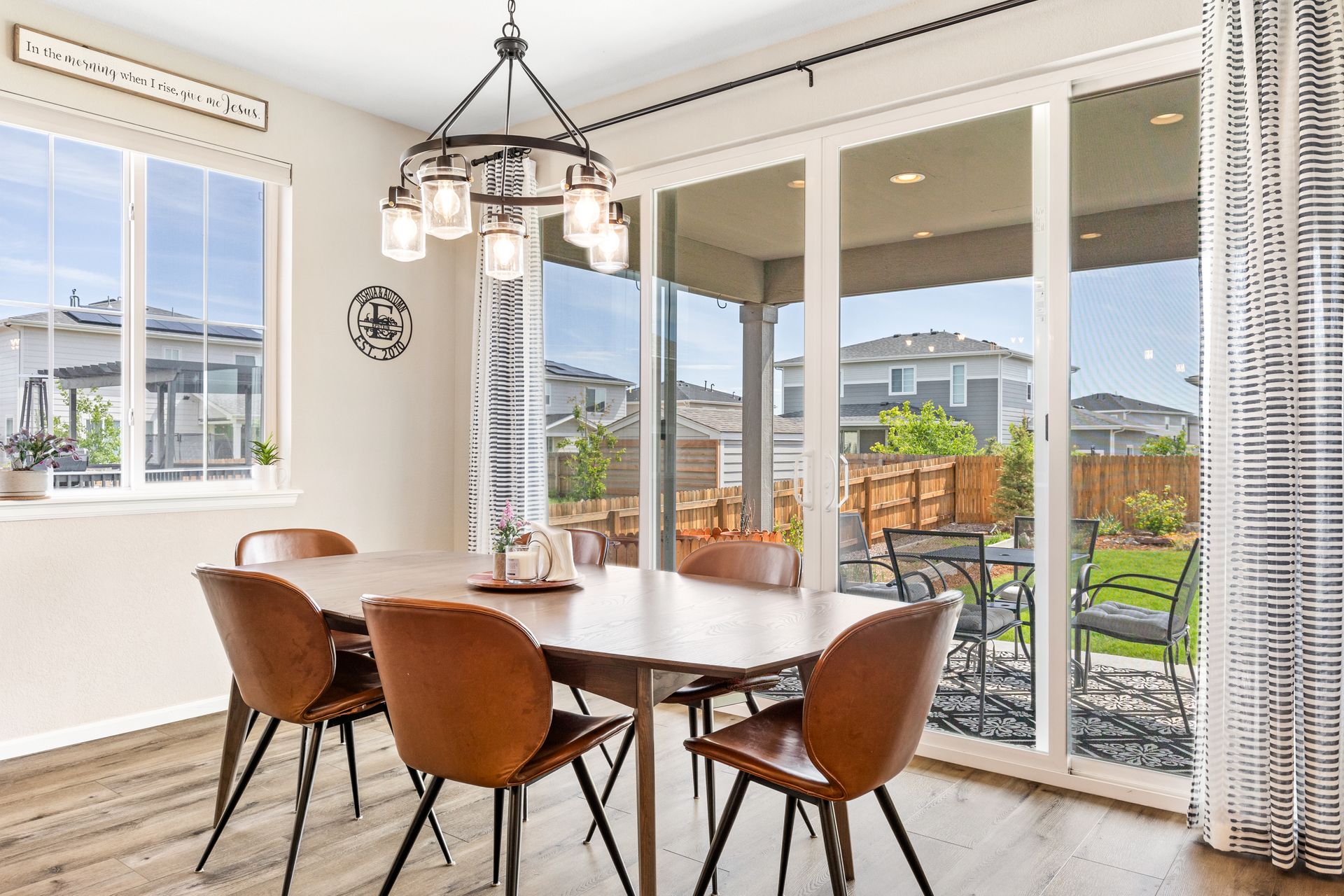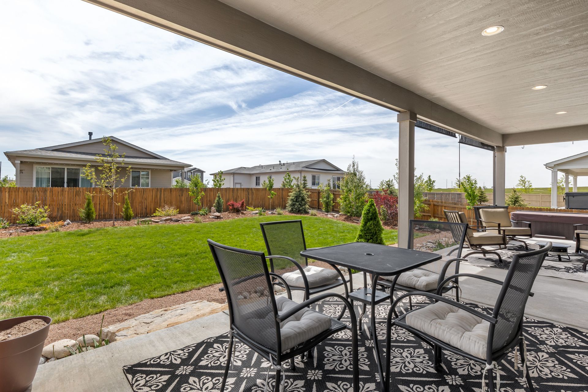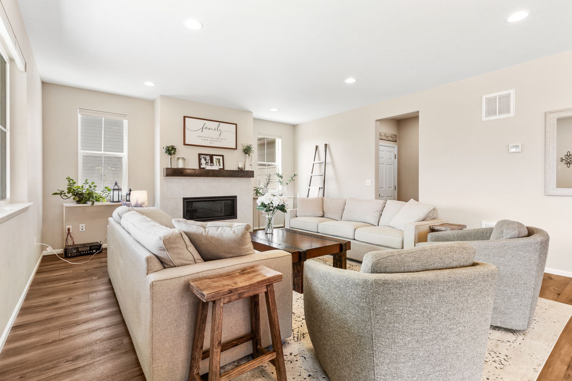This picture-perfect home is one of the largest in the neighborhood and features a large lot complete with french drain, flagstone walkway, raised garden beds, and numerous trees and shrubs along the perimeter of the fully fenced back yard. Outdoor living is at its best with a convenient hot tub area, and an impressive covered patio running the full length of the home with recessed lights, sun shades, gas line for a grill, and built-in speakers. Inside the home, a foyer with high ceilings and beautiful floors sits at the base of the staircase. A main floor bedroom, currently used as an office, and full bathroom allows for many options for work, guests, or other living arrangements. Within the open concept living area awaits a light and bright kitchen with tiled backsplash, stainless steel appliances, gas range, pantry, built-in speakers, and quartz countertops. The living area features a modern linear fireplace aside the dining area which leads seamlessly through double 8' slider doors to the covered patio. Upstairs, an airy loft with tons of natural light and mountain views creates an additional living/work/recreation space. A large laundry room and linen closet sit conveniently outside of the primary suite. The private primary suite is accompanied by an enormous walk-in closet, and bathroom with raised vanities with double sinks and Corian counters. A thoughtful third full bathroom with double sinks, and three additional bedrooms grace the upper level, one with a large walk-in closet. This home was upgraded beyond the builder's options after move-in. Additional features include a whole house humidifier with two-zone damper system, a full crawl space, solar lease with low monthly payment, and transferable structural warranty. Polishing off this fantastic home is the oversized, insulated, and drywalled 3-car garage with floor coating, 220v, hanging storage, and access to the backyard.