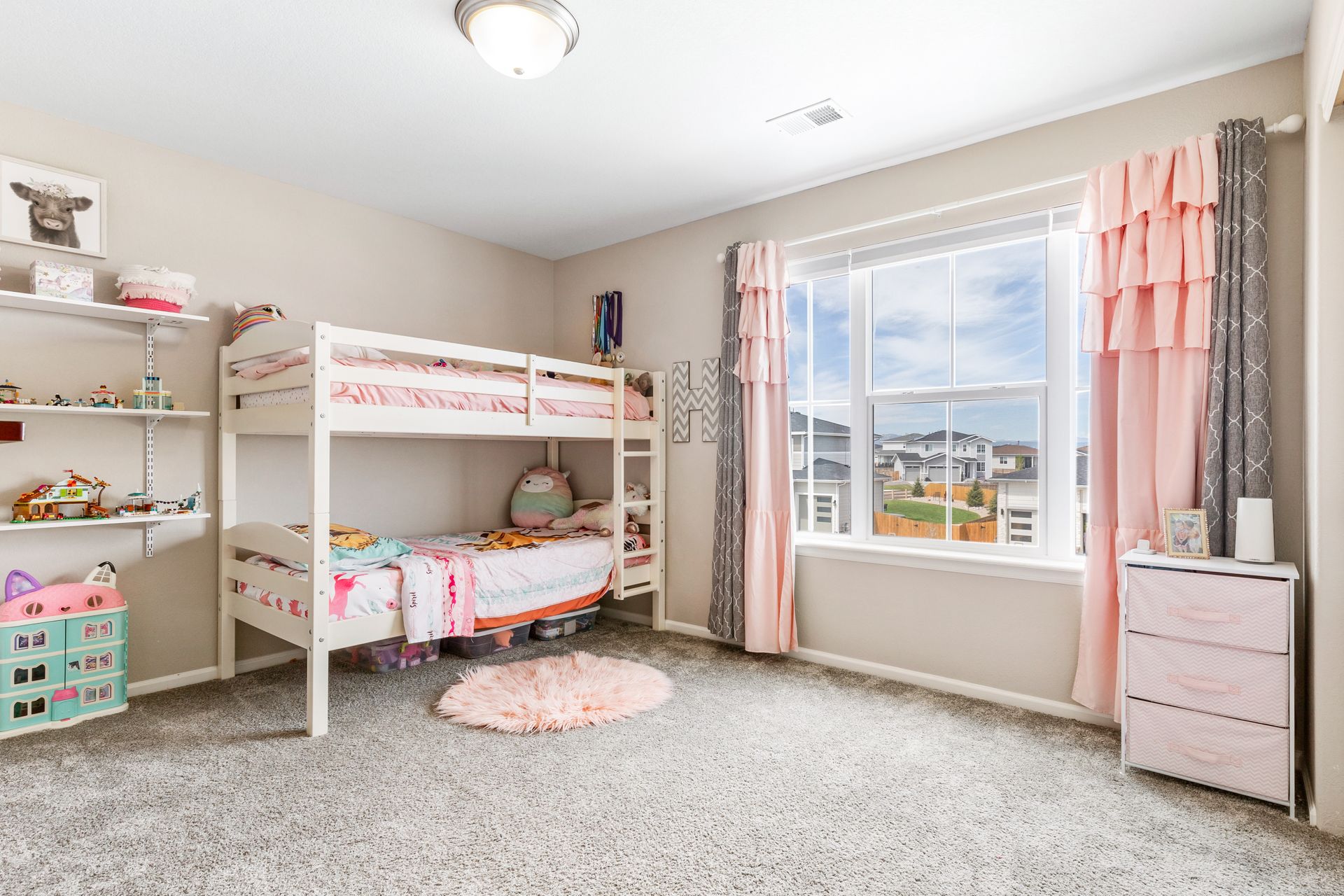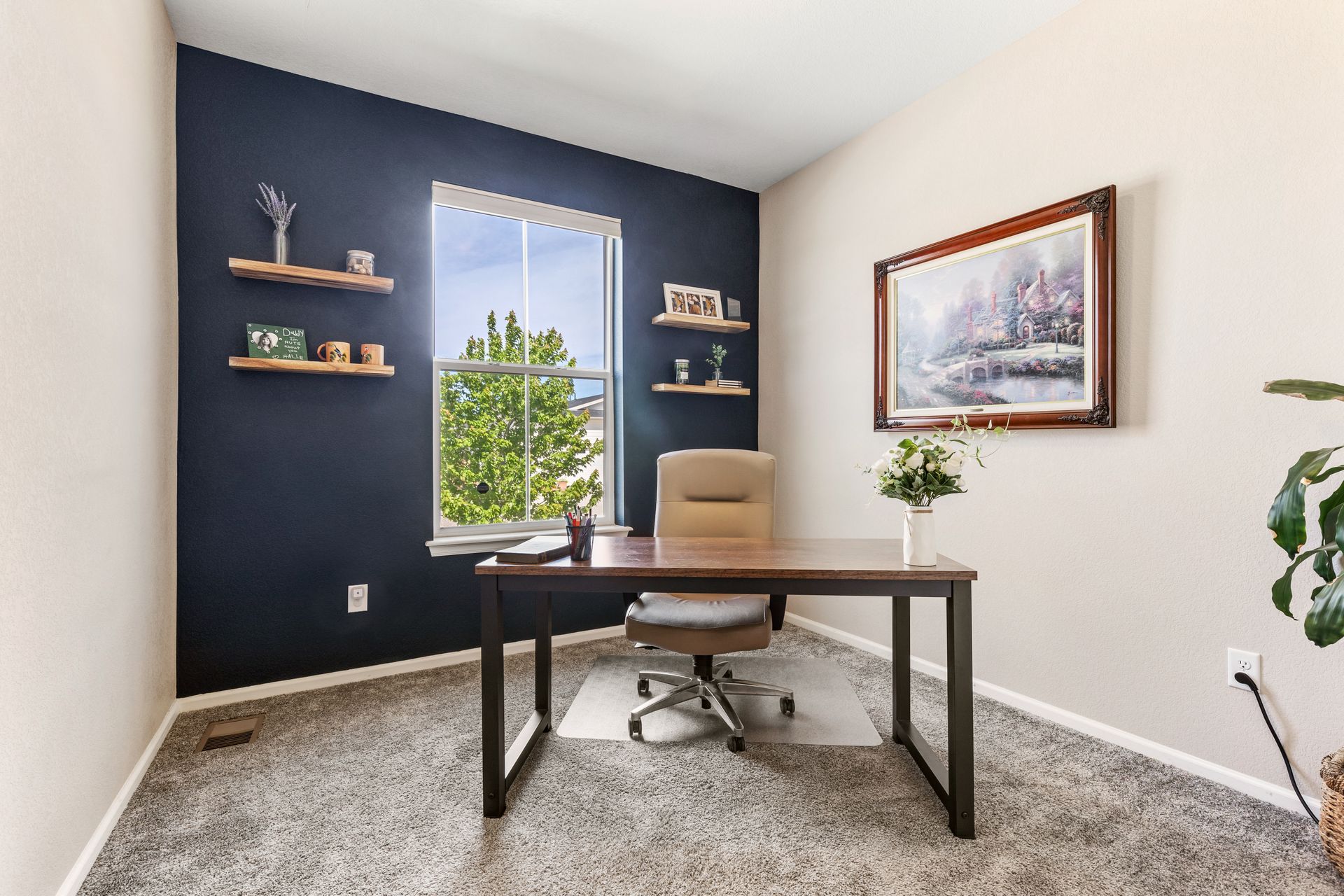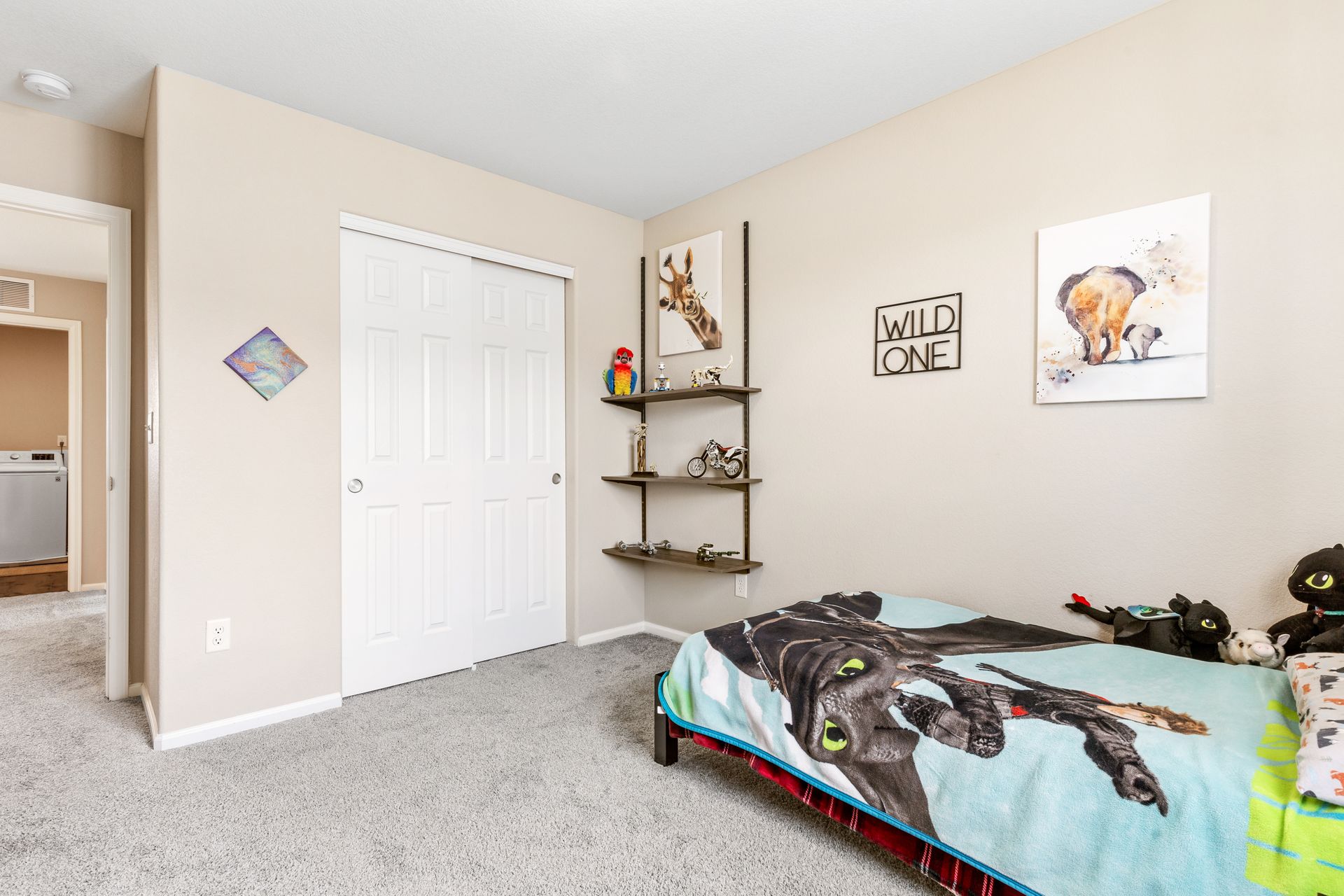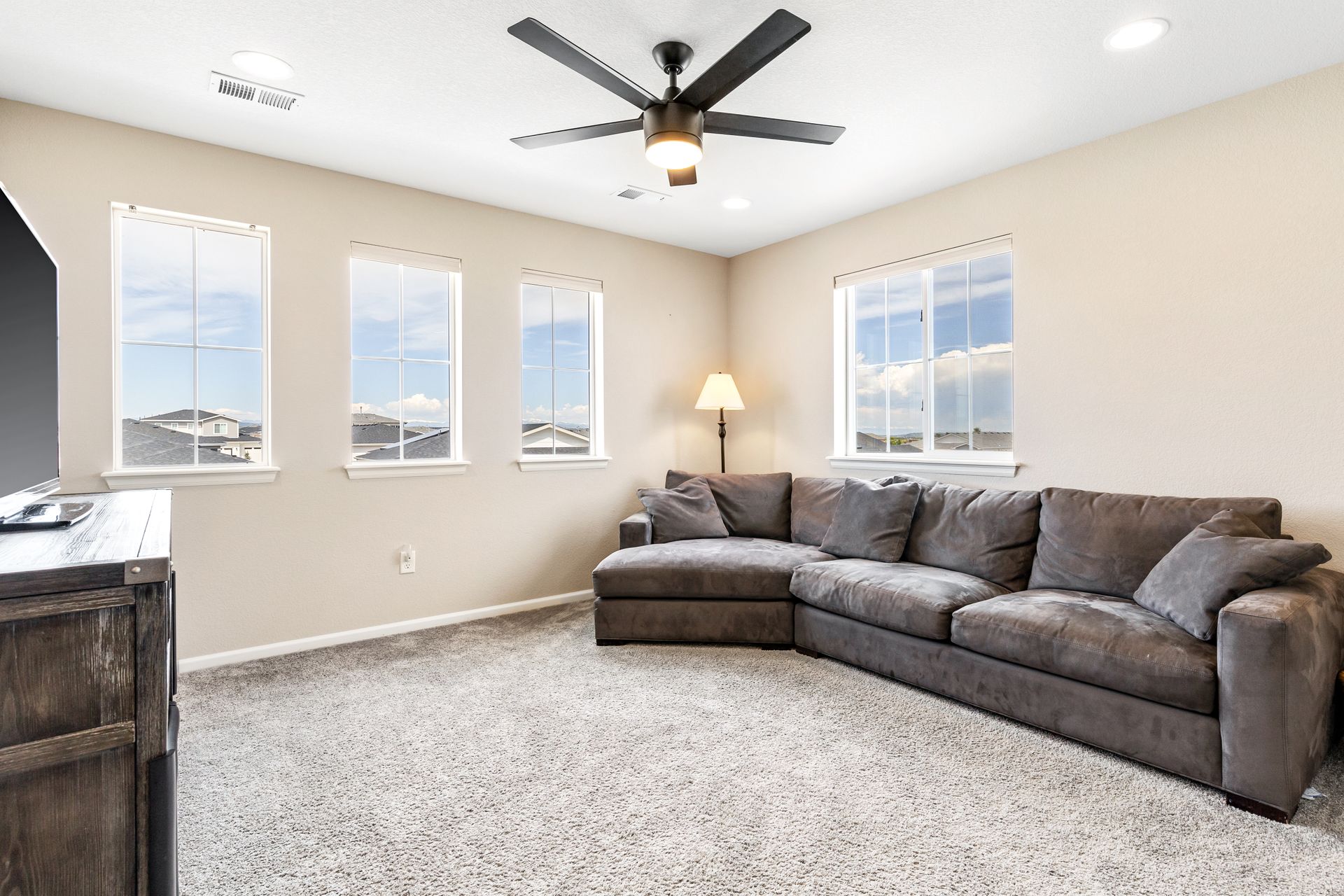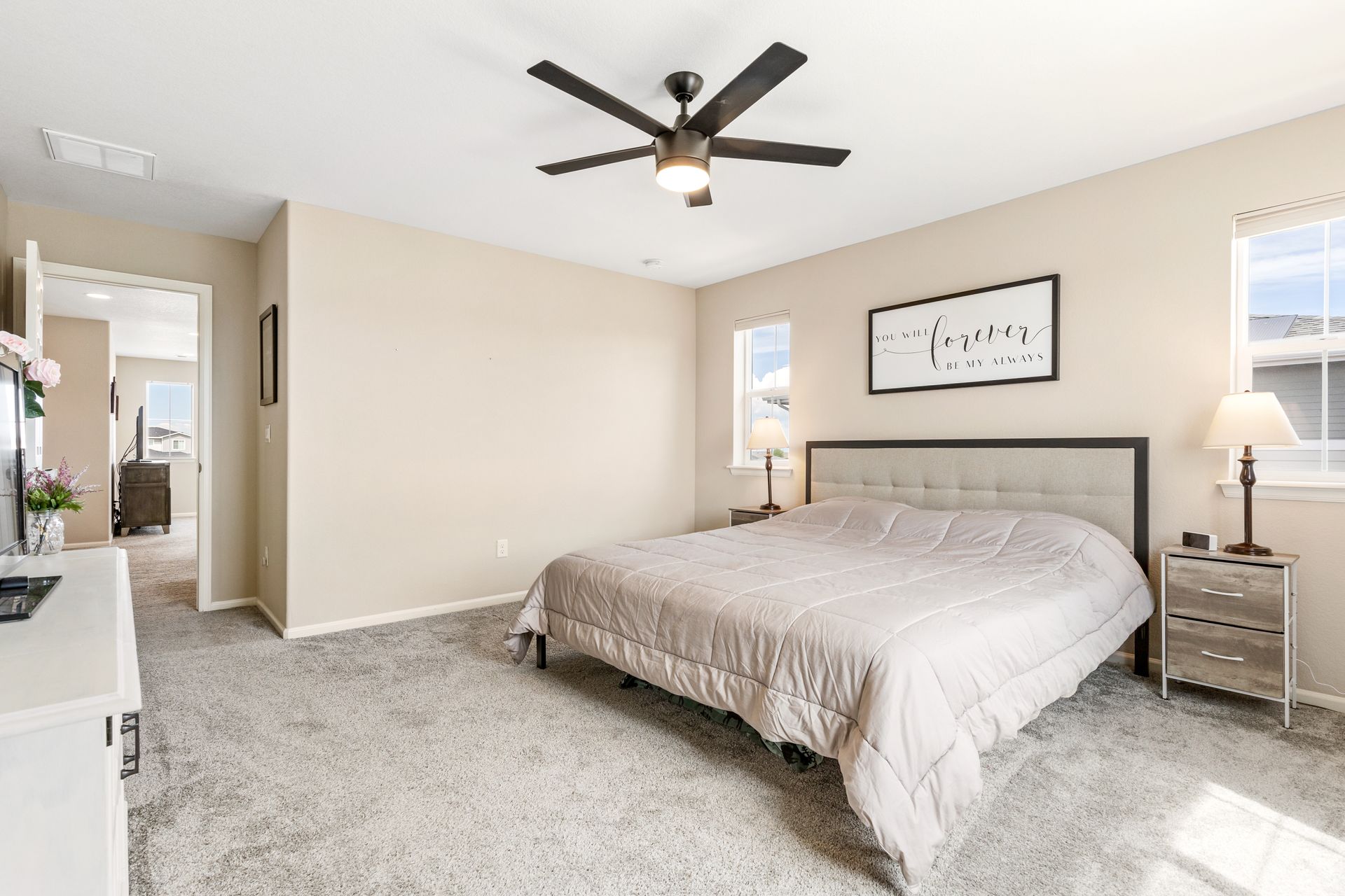 This picture-perfect home is one of the largest in the neighborhood and features a large lot complete with french drain, flagstone walkway, raised garden beds, and numerous trees and shrubs along the perimeter of the fully fenced back yard. Outdoor living is at its best with a convenient hot tub area, and an impressive covered patio running the full length of the home with recessed lights, sun shades, gas line for a grill, and built-in speakers. Inside the home, a foyer with high ceilings and beautiful floors sits at the base of the staircase. A main floor bedroom, currently used as an office, and full bathroom allows for many options for work, guests, or other living arrangements. Within the open concept living area awaits a light and bright kitchen with tiled backsplash, stainless steel appliances, gas range, pantry, built-in speakers, and quartz countertops. The living area features a modern linear fireplace aside the dining area which leads seamlessly through double 8' slider doors to the covered patio. Upstairs, an airy loft with tons of natural light and mountain views creates an additional living/work/recreation space. A large laundry room and linen closet sit conveniently outside of the primary suite. The private primary suite is accompanied by an enormous walk-in closet, and bathroom with raised vanities with double sinks and Corian counters. A thoughtful third full bathroom with double sinks, and three additional bedrooms grace the upper level, one with a large walk-in closet. This home was upgraded beyond the builder's options after move-in. Additional features include a whole house humidifier with two-zone damper system, a full crawl space, solar lease with low monthly payment, and transferable structural warranty. Polishing off this fantastic home is the oversized, insulated, and drywalled 3-car garage with floor coating, 220v, hanging storage, and access to the backyard.