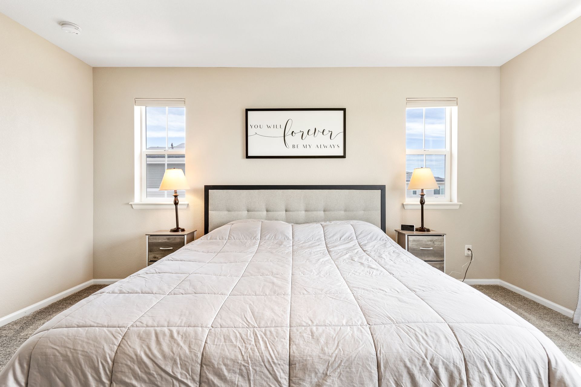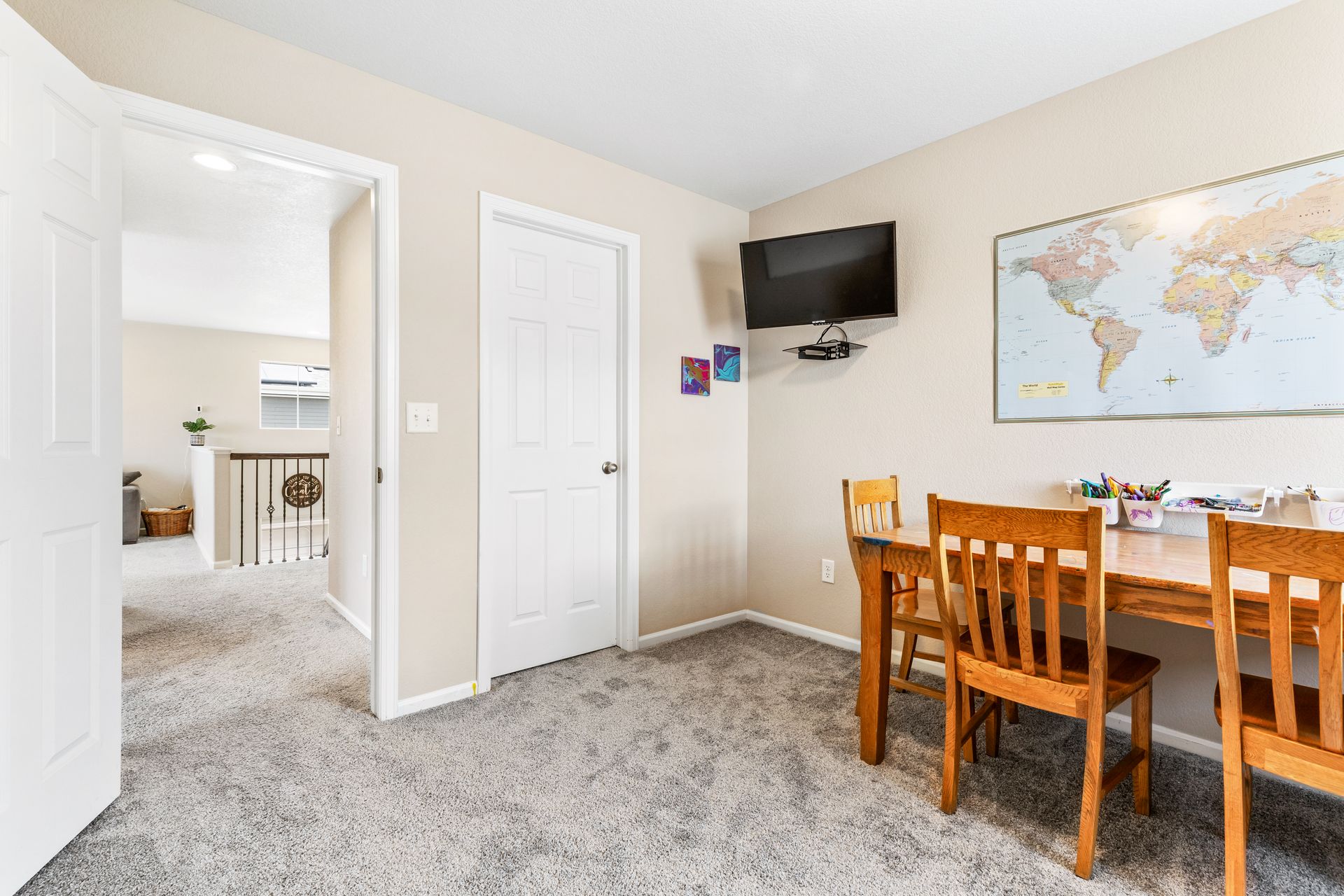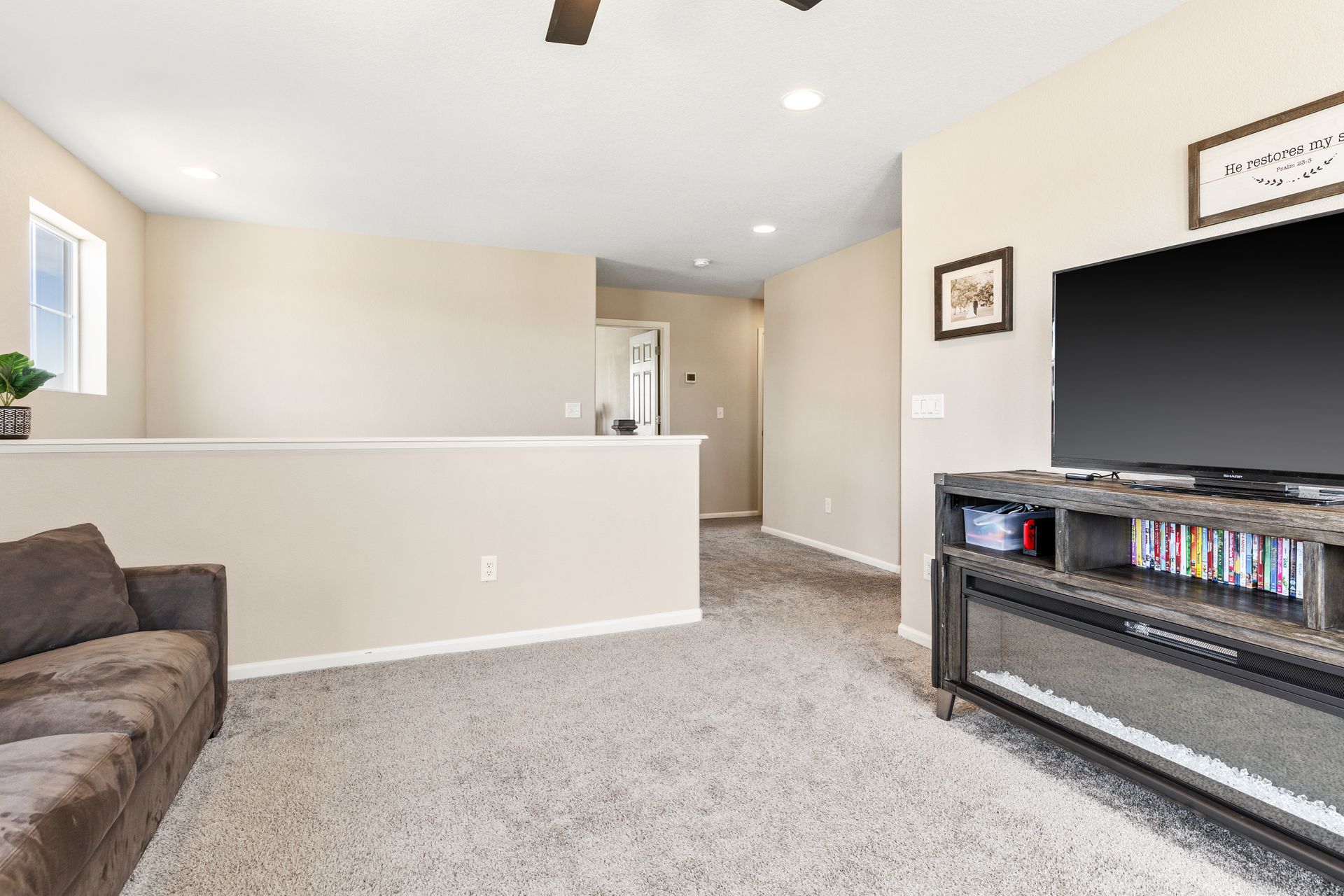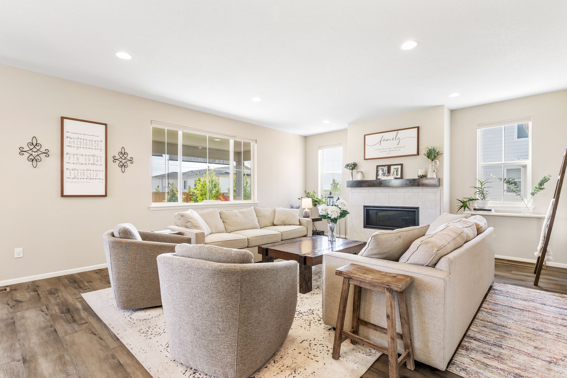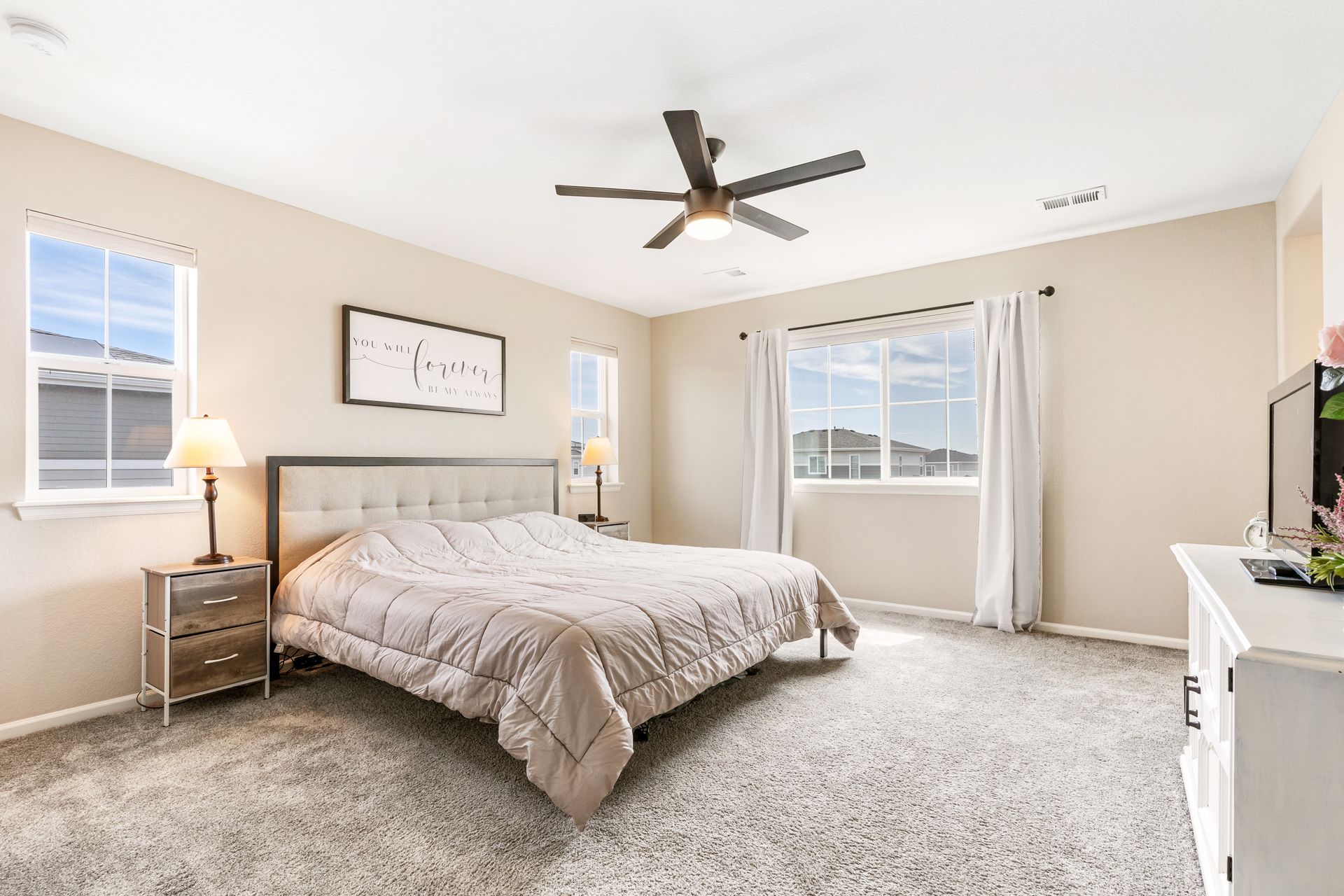 This picture-perfect home is one of the largest in the neighborhood and features a large lot complete with french drain, flagstone walkway, raised garden beds, and numerous trees and shrubs along the perimeter of the fully fenced back yard. Outdoor living is at its best with a convenient hot tub area, and an impressive covered patio running the full length of the home with recessed lights, sun shades, gas line for a grill, and built-in speakers. Inside the home, a foyer with high ceilings and beautiful floors sits at the base of the staircase. A main floor bedroom, currently used as an office, and full bathroom allows for many options for work, guests, or other living arrangements. Within the open concept living area awaits a light and bright kitchen with tiled backsplash, stainless steel appliances, gas range, pantry, built-in speakers, and quartz countertops. The living area features a modern linear fireplace aside the dining area which leads seamlessly through double 8' slider doors to the covered patio. Upstairs, an airy loft with tons of natural light and mountain views creates an additional living/work/recreation space. A large laundry room and linen closet sit conveniently outside of the primary suite. The private primary suite is accompanied by an enormous walk-in closet, and bathroom with raised vanities with double sinks and Corian counters. A thoughtful third full bathroom with double sinks, and three additional bedrooms grace the upper level, one with a large walk-in closet. This home was upgraded beyond the builder's options after move-in. Additional features include a whole house humidifier with two-zone damper system, a full crawl space, solar lease with low monthly payment, and transferable structural warranty. Polishing off this fantastic home is the oversized, insulated, and drywalled 3-car garage with floor coating, 220v, hanging storage, and access to the backyard.