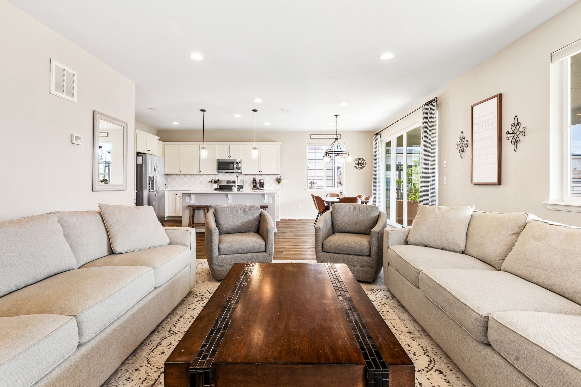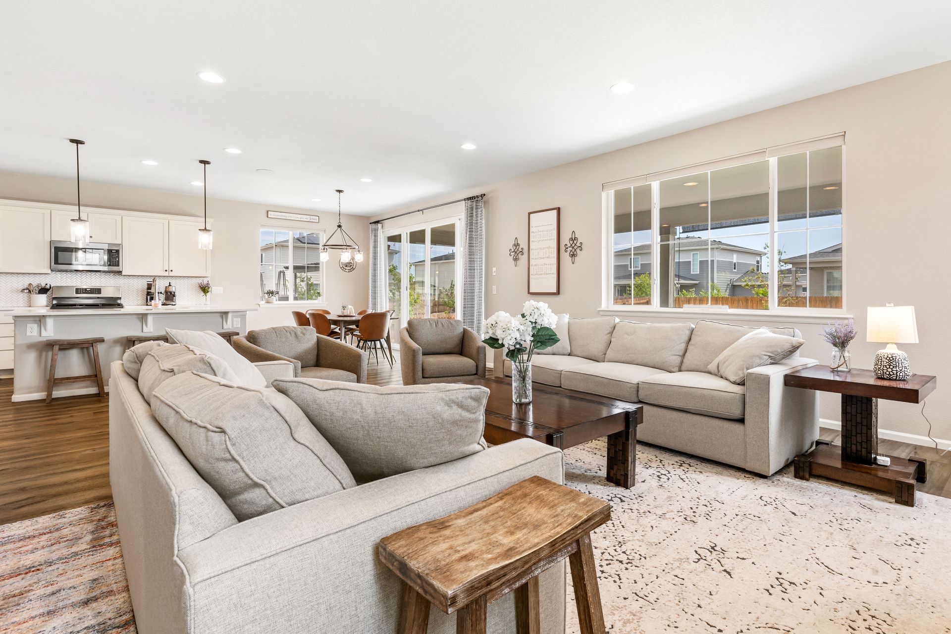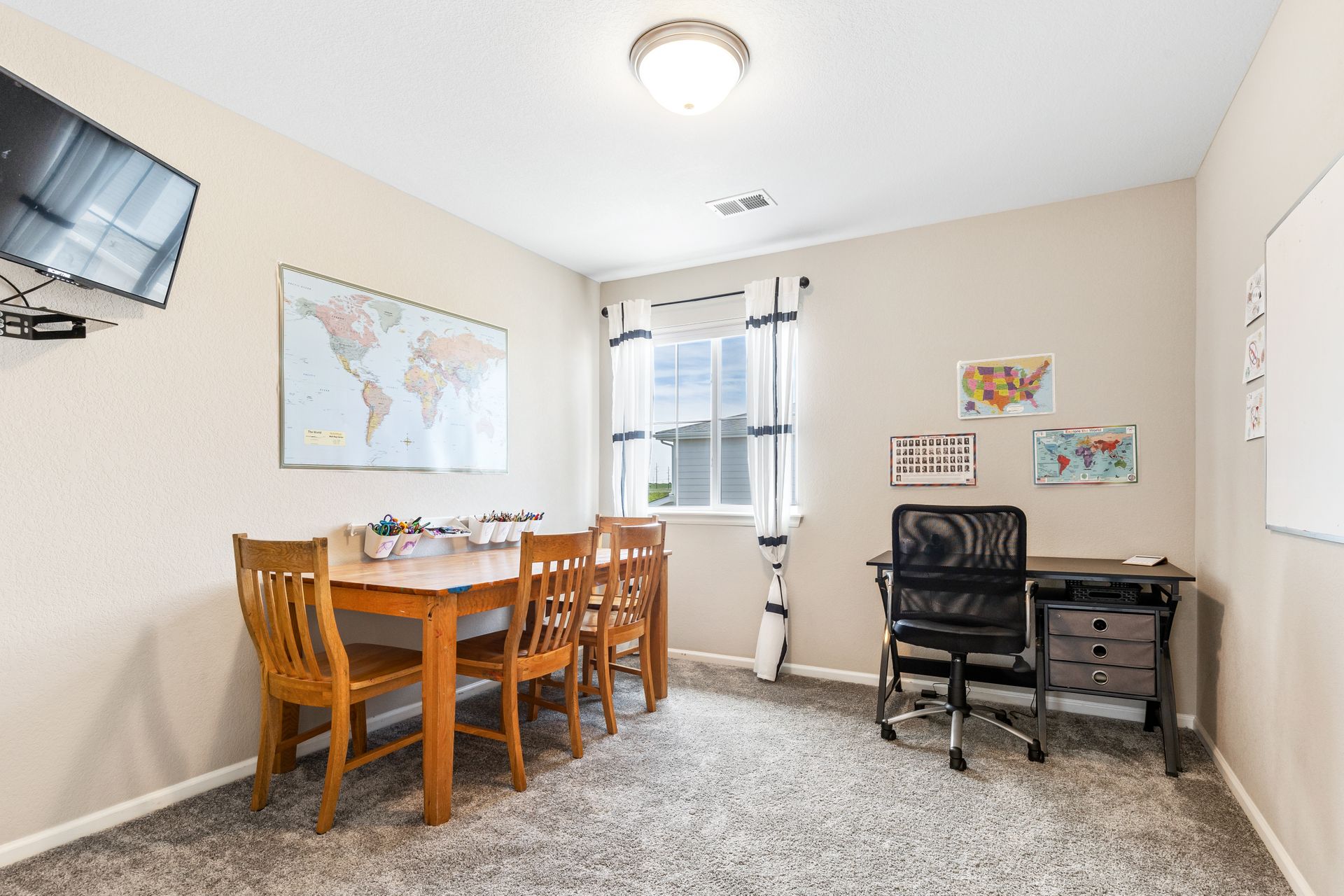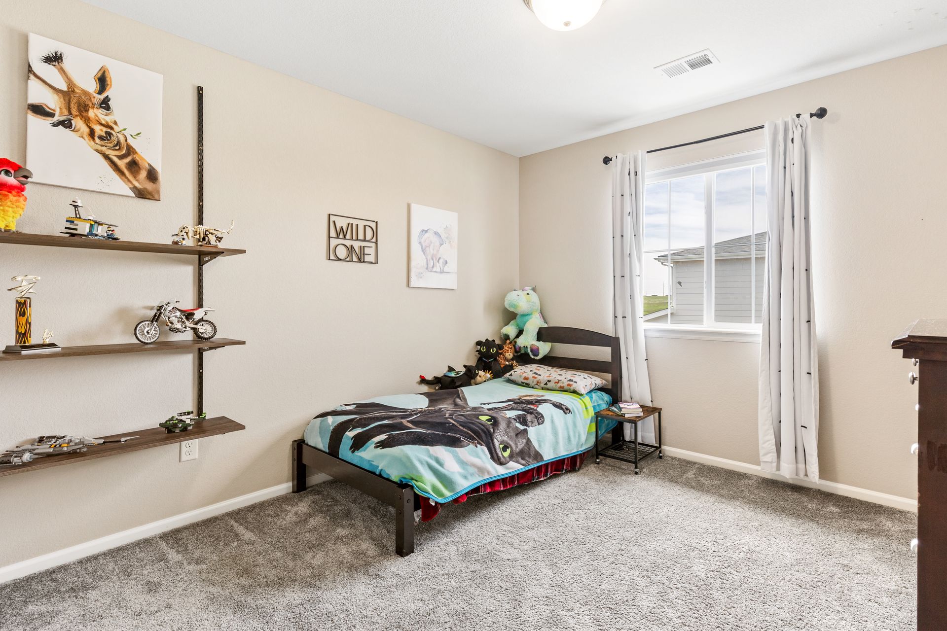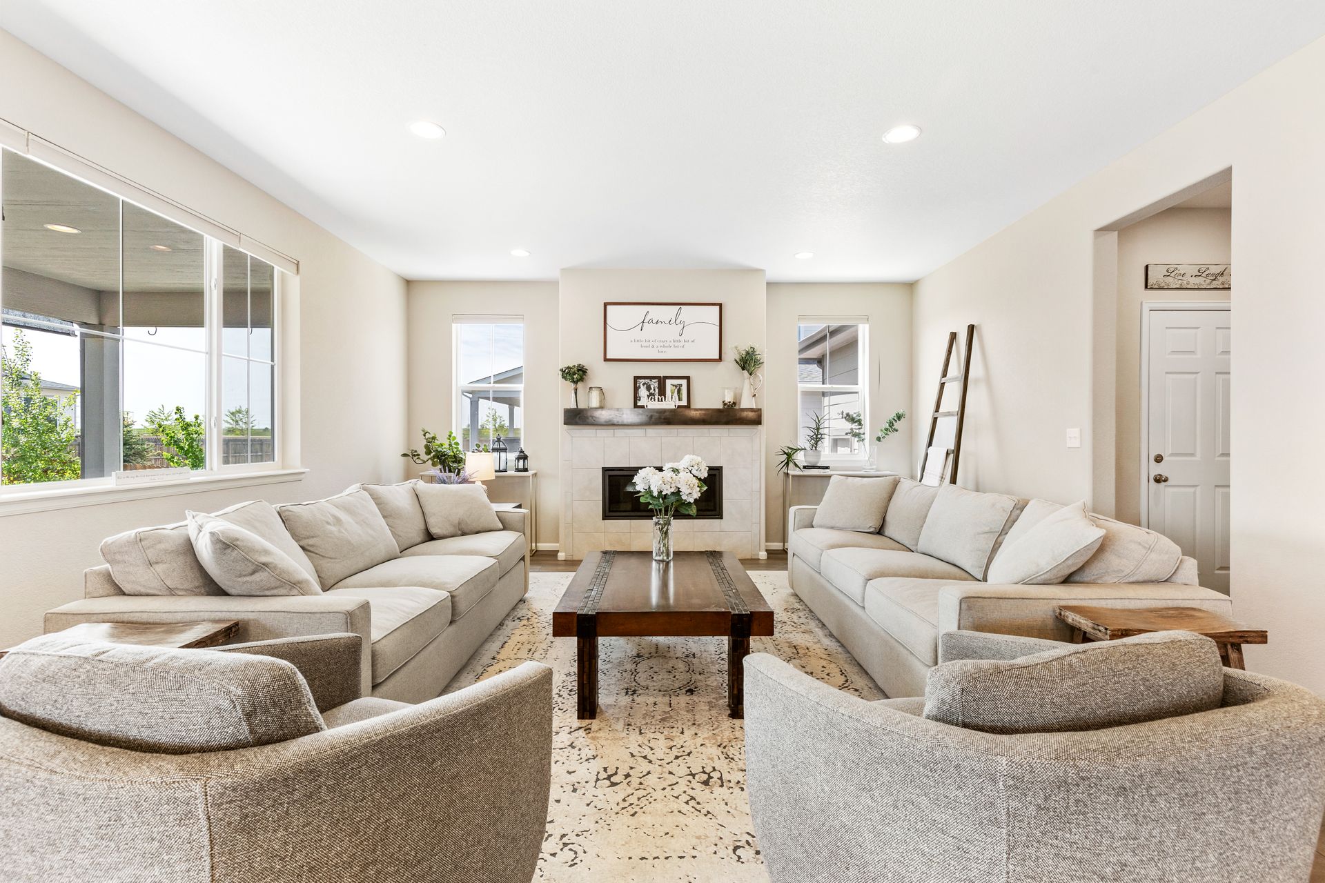 This picture-perfect home is one of the largest in the neighborhood and features a large lot complete with french drain, flagstone walkway, raised garden beds, and numerous trees and shrubs along the perimeter of the fully fenced back yard. Outdoor living is at its best with a convenient hot tub area, and an impressive covered patio running the full length of the home with recessed lights, sun shades, gas line for a grill, and built-in speakers. Inside the home, a foyer with high ceilings and beautiful floors sits at the base of the staircase. A main floor bedroom, currently used as an office, and full bathroom allows for many options for work, guests, or other living arrangements. Within the open concept living area awaits a light and bright kitchen with tiled backsplash, stainless steel appliances, gas range, pantry, built-in speakers, and quartz countertops. The living area features a modern linear fireplace aside the dining area which leads seamlessly through double 8' slider doors to the covered patio. Upstairs, an airy loft with tons of natural light and mountain views creates an additional living/work/recreation space. A large laundry room and linen closet sit conveniently outside of the primary suite. The private primary suite is accompanied by an enormous walk-in closet, and bathroom with raised vanities with double sinks and Corian counters. A thoughtful third full bathroom with double sinks, and three additional bedrooms grace the upper level, one with a large walk-in closet. This home was upgraded beyond the builder's options after move-in. Additional features include a whole house humidifier with two-zone damper system, a full crawl space, solar lease with low monthly payment, and transferable structural warranty. Polishing off this fantastic home is the oversized, insulated, and drywalled 3-car garage with floor coating, 220v, hanging storage, and access to the backyard.