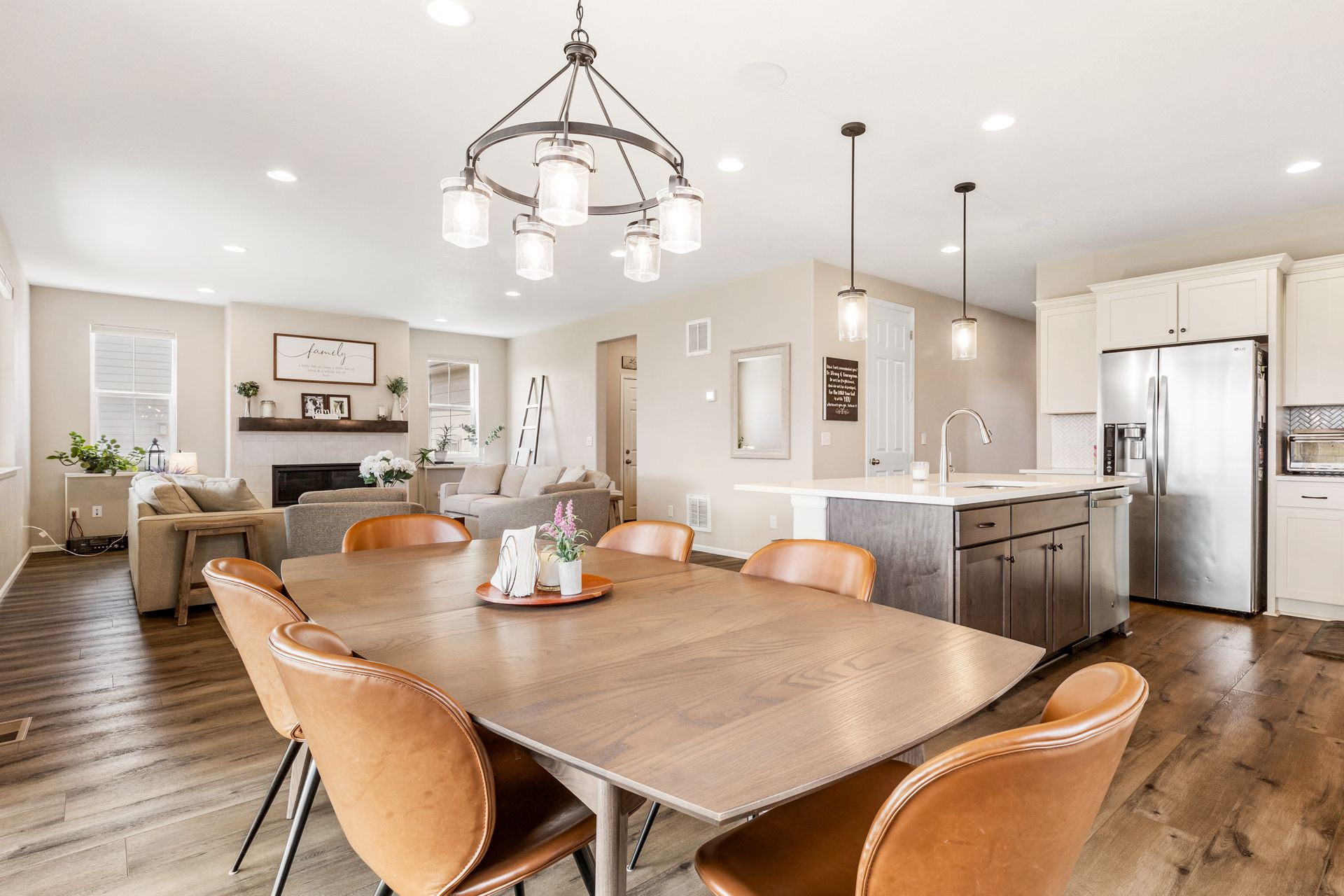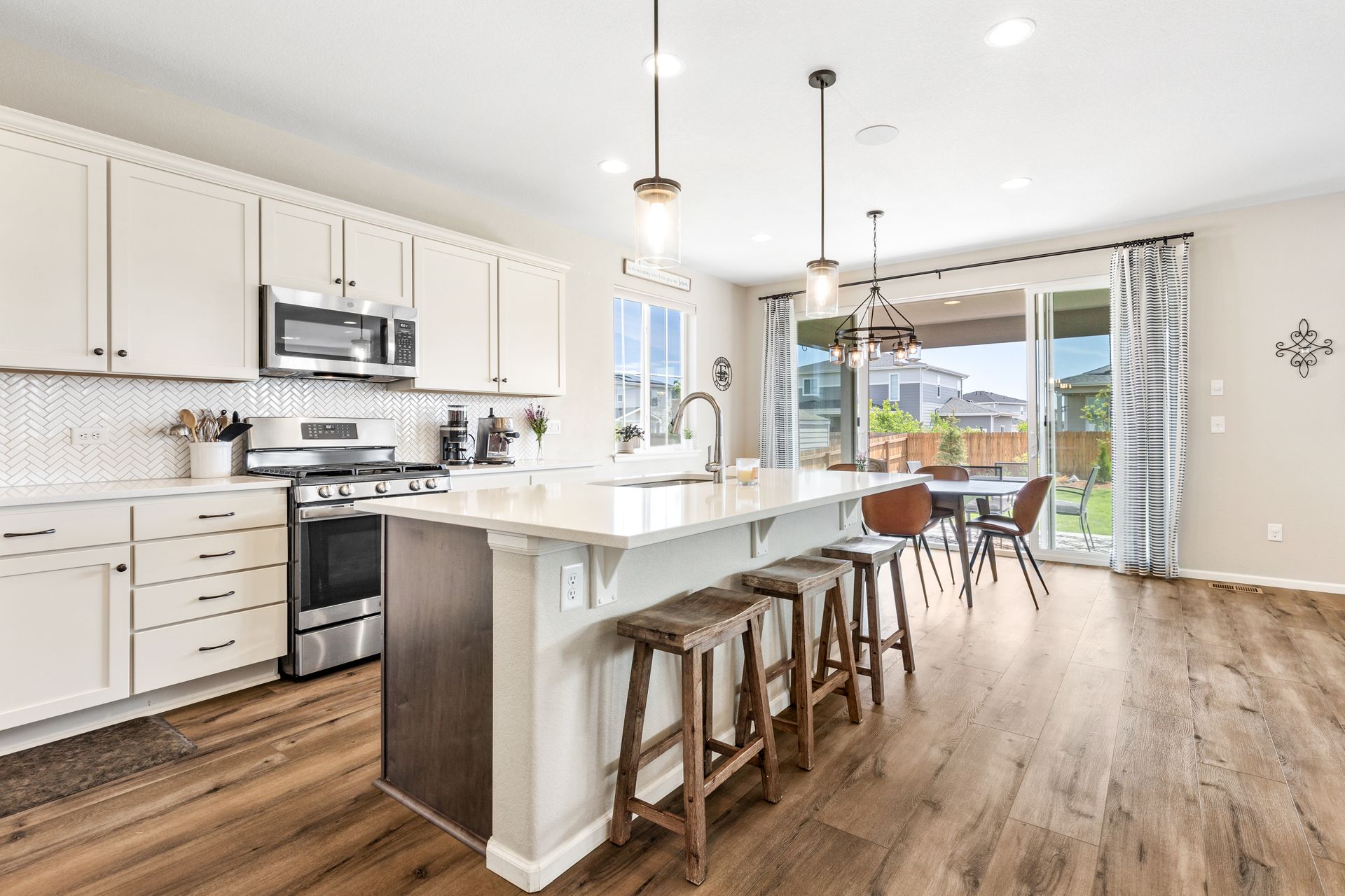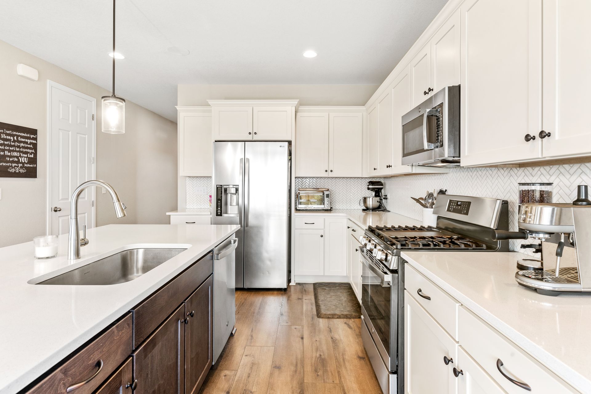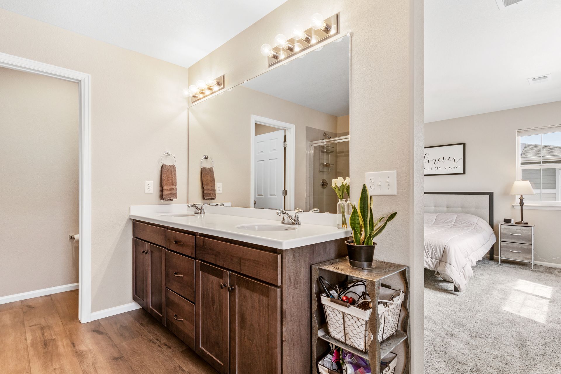 This picture-perfect home is one of the largest in the neighborhood and features a large lot complete with french drain, flagstone walkway, raised garden beds, and numerous trees and shrubs along the perimeter of the fully fenced back yard. Outdoor living is at its best with a convenient hot tub area, and an impressive covered patio running the full length of the home with recessed lights, sun shades, gas line for a grill, and built-in speakers. Inside the home, a foyer with high ceilings and beautiful floors sits at the base of the staircase. A main floor bedroom, currently used as an office, and full bathroom allows for many options for work, guests, or other living arrangements. Within the open concept living area awaits a light and bright kitchen with tiled backsplash, stainless steel appliances, gas range, pantry, built-in speakers, and quartz countertops. The living area features a modern linear fireplace aside the dining area which leads seamlessly through double 8' slider doors to the covered patio. Upstairs, an airy loft with tons of natural light and mountain views creates an additional living/work/recreation space. A large laundry room and linen closet sit conveniently outside of the primary suite. The private primary suite is accompanied by an enormous walk-in closet, and bathroom with raised vanities with double sinks and Corian counters. A thoughtful third full bathroom with double sinks, and three additional bedrooms grace the upper level, one with a large walk-in closet. This home was upgraded beyond the builder's options after move-in. Additional features include a whole house humidifier with two-zone damper system, a full crawl space, solar lease with low monthly payment, and transferable structural warranty. Polishing off this fantastic home is the oversized, insulated, and drywalled 3-car garage with floor coating, 220v, hanging storage, and access to the backyard.