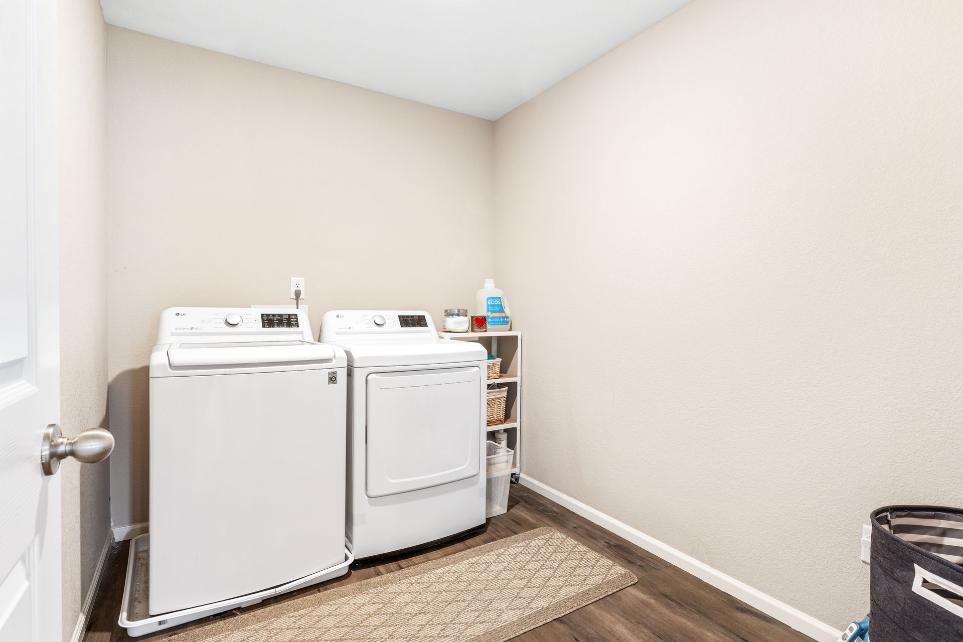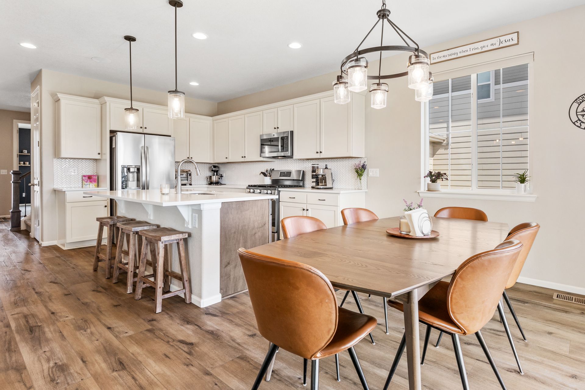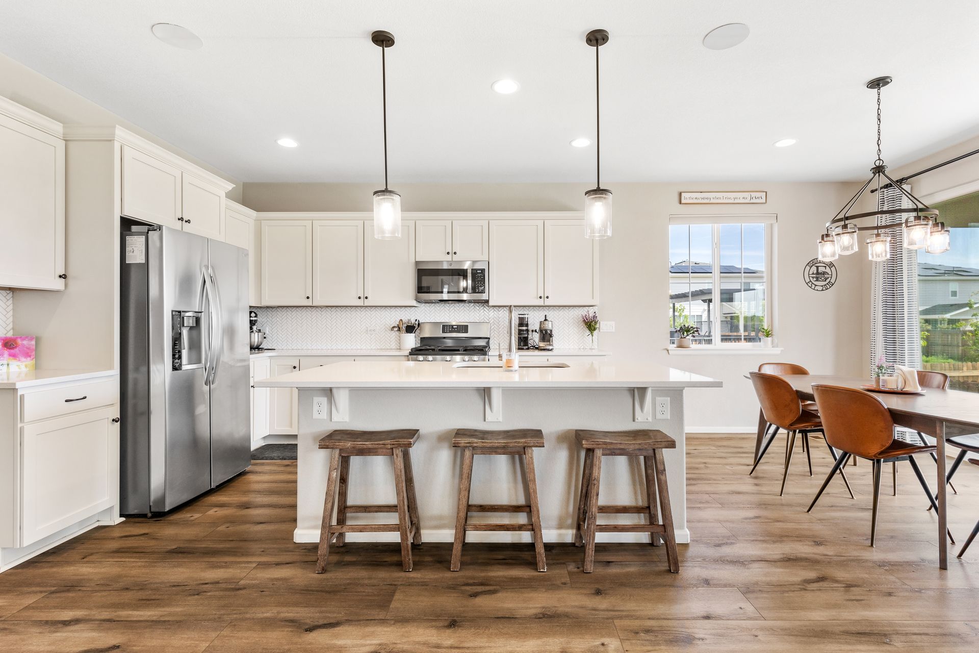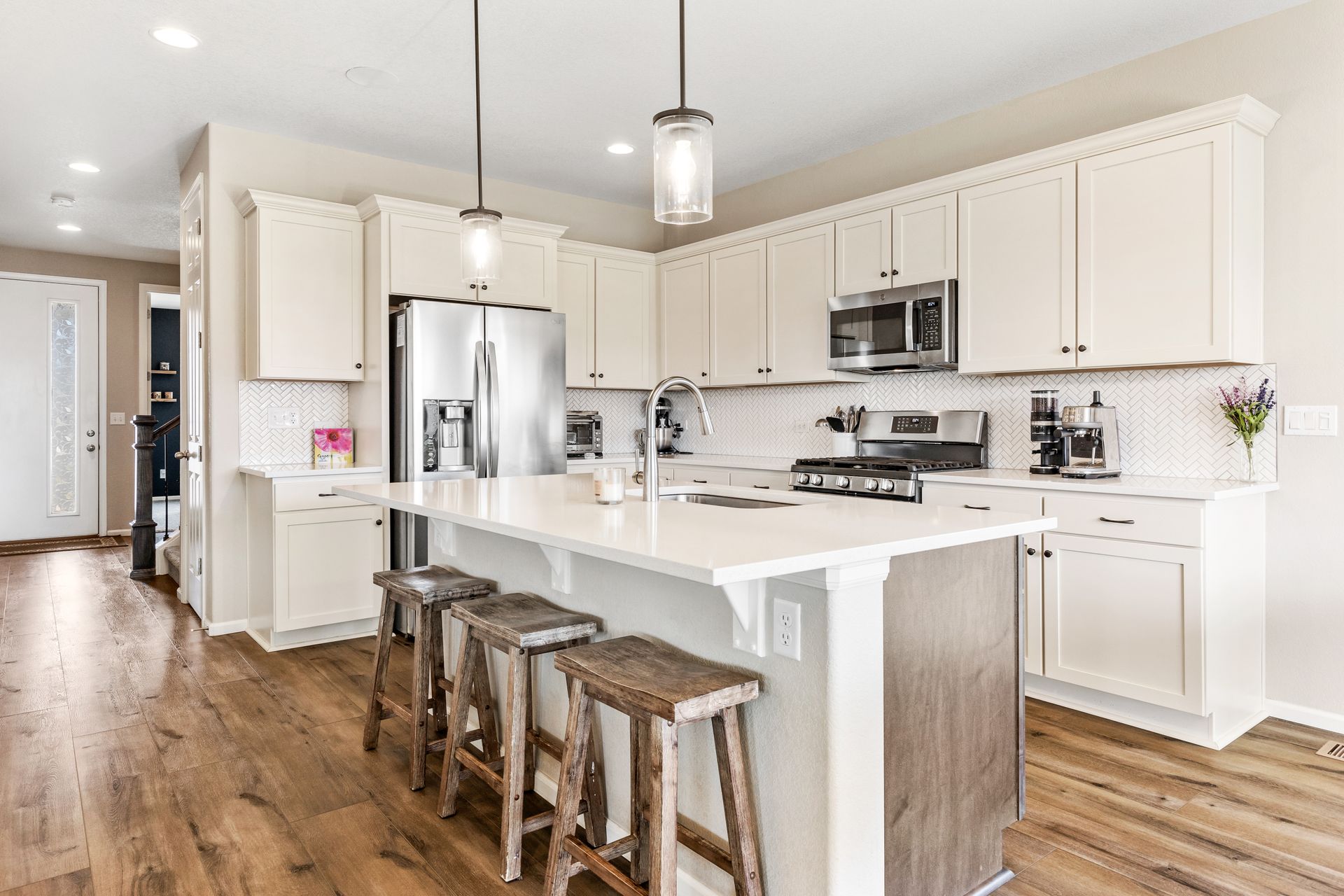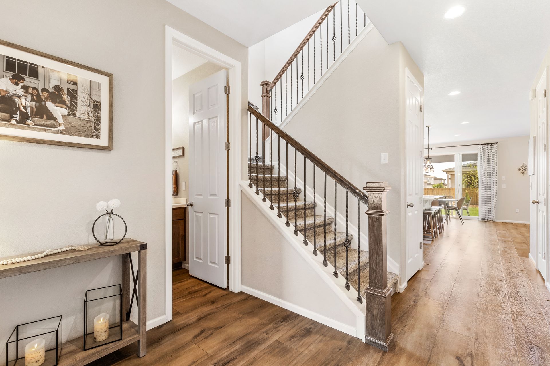This picture-perfect home is one of the largest in the neighborhood and features a large lot complete with french drain, flagstone walkway, raised garden beds, and numerous trees and shrubs along the perimeter of the fully fenced back yard. Outdoor living is at its best with a convenient hot tub area, and an impressive covered patio running the full length of the home with recessed lights, sun shades, gas line for a grill, and built-in speakers. Inside the home, a foyer with high ceilings and beautiful floors sits at the base of the staircase. A main floor bedroom, currently used as an office, and full bathroom allows for many options for work, guests, or other living arrangements. Within the open concept living area awaits a light and bright kitchen with tiled backsplash, stainless steel appliances, gas range, pantry, built-in speakers, and quartz countertops. The living area features a modern linear fireplace aside the dining area which leads seamlessly through double 8' slider doors to the covered patio. Upstairs, an airy loft with tons of natural light and mountain views creates an additional living/work/recreation space. A large laundry room and linen closet sit conveniently outside of the primary suite. The private primary suite is accompanied by an enormous walk-in closet, and bathroom with raised vanities with double sinks and Corian counters. A thoughtful third full bathroom with double sinks, and three additional bedrooms grace the upper level, one with a large walk-in closet. This home was upgraded beyond the builder's options after move-in. Additional features include a whole house humidifier with two-zone damper system, a full crawl space, solar lease with low monthly payment, and transferable structural warranty. Polishing off this fantastic home is the oversized, insulated, and drywalled 3-car garage with floor coating, 220v, hanging storage, and access to the backyard.