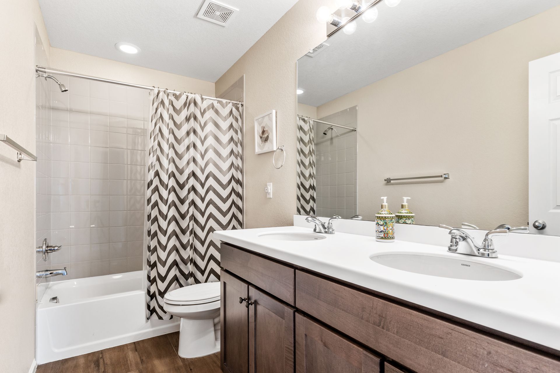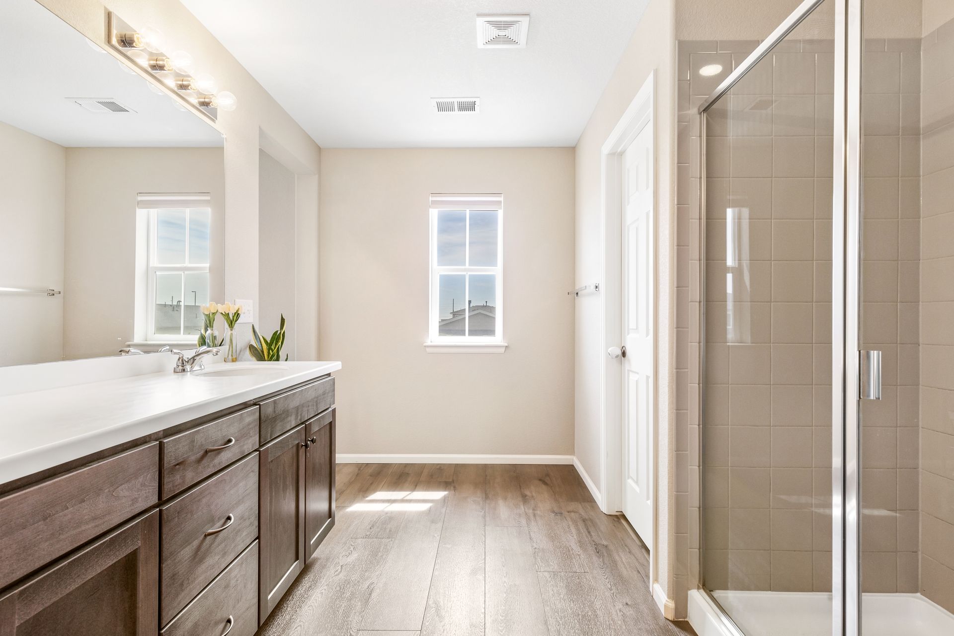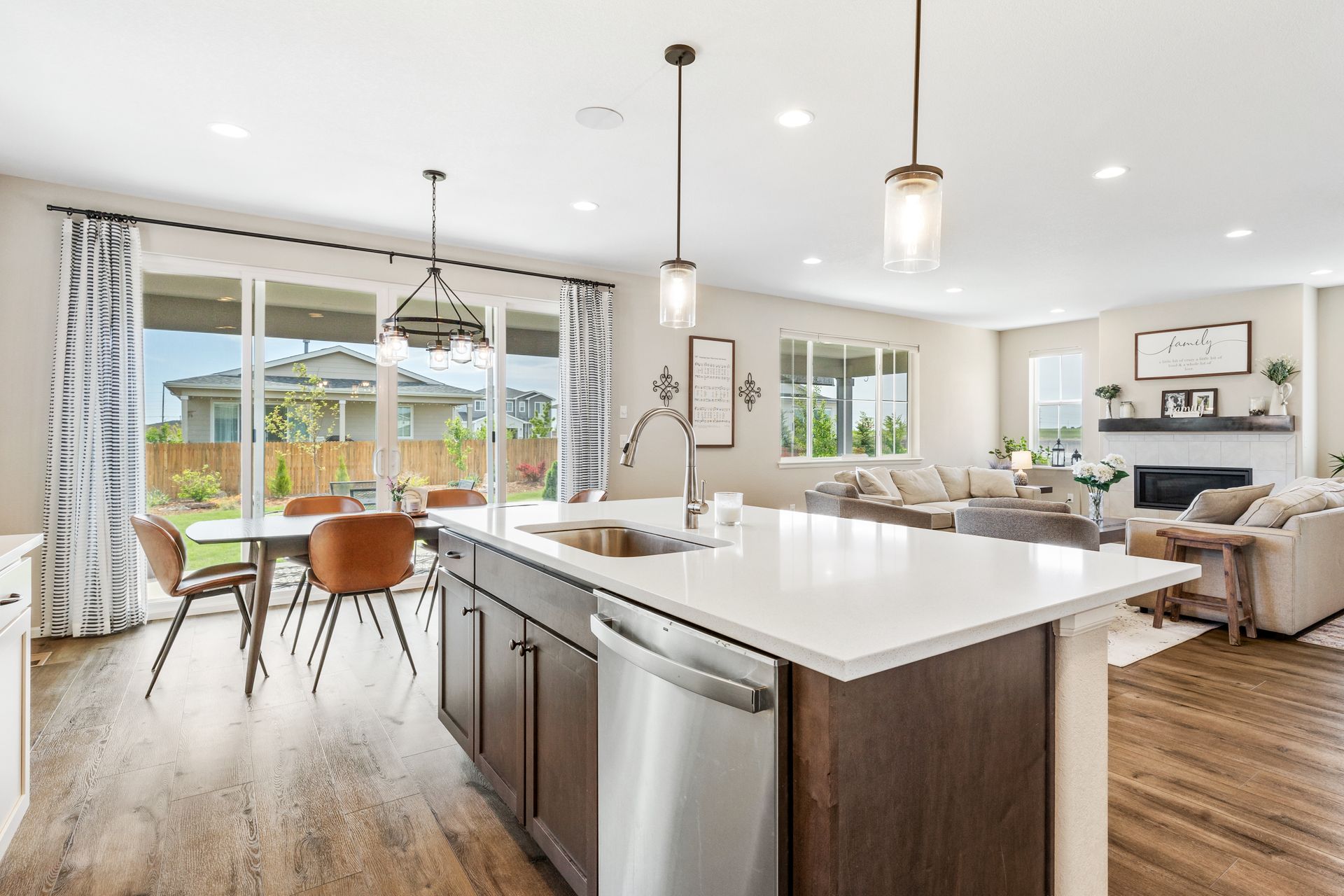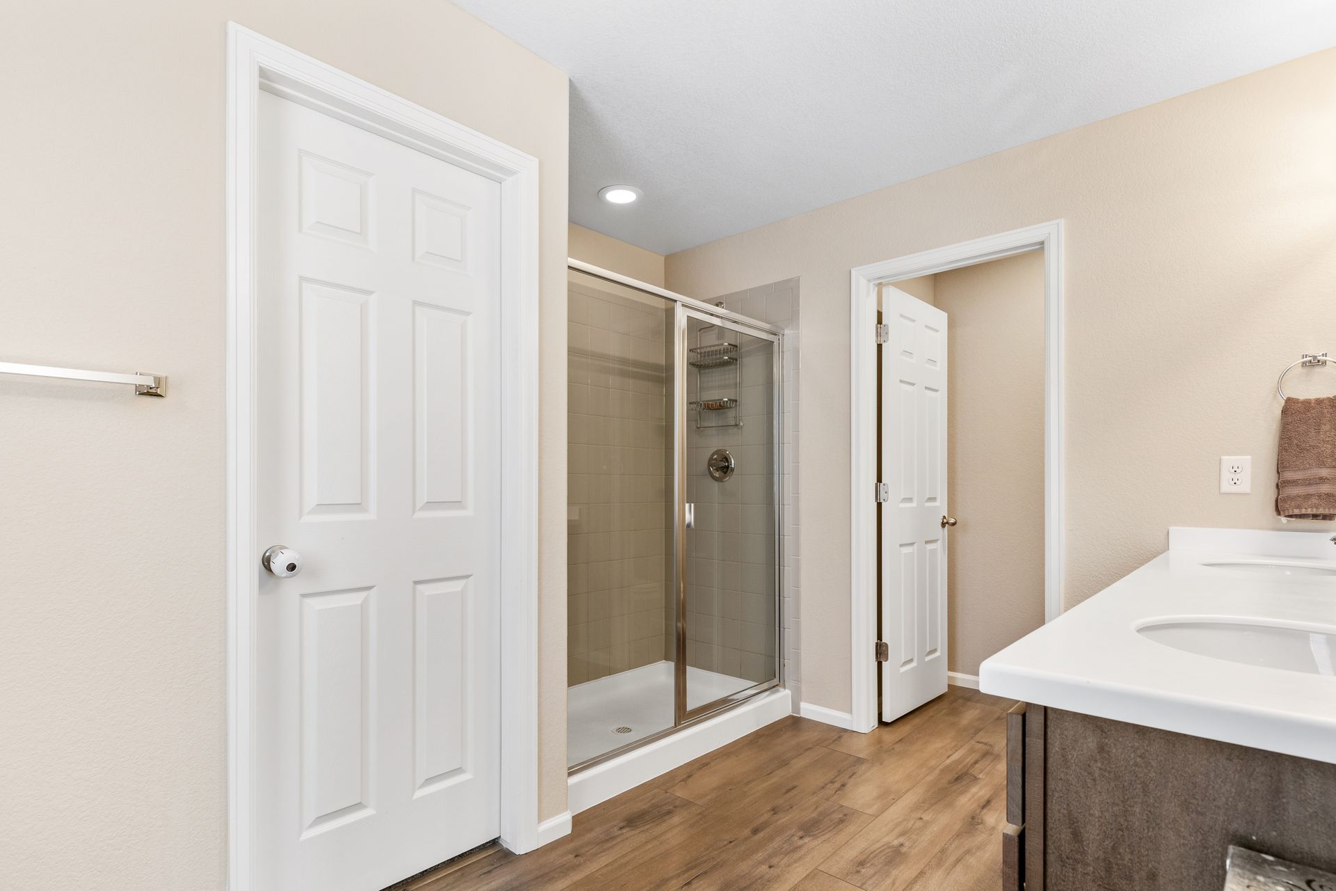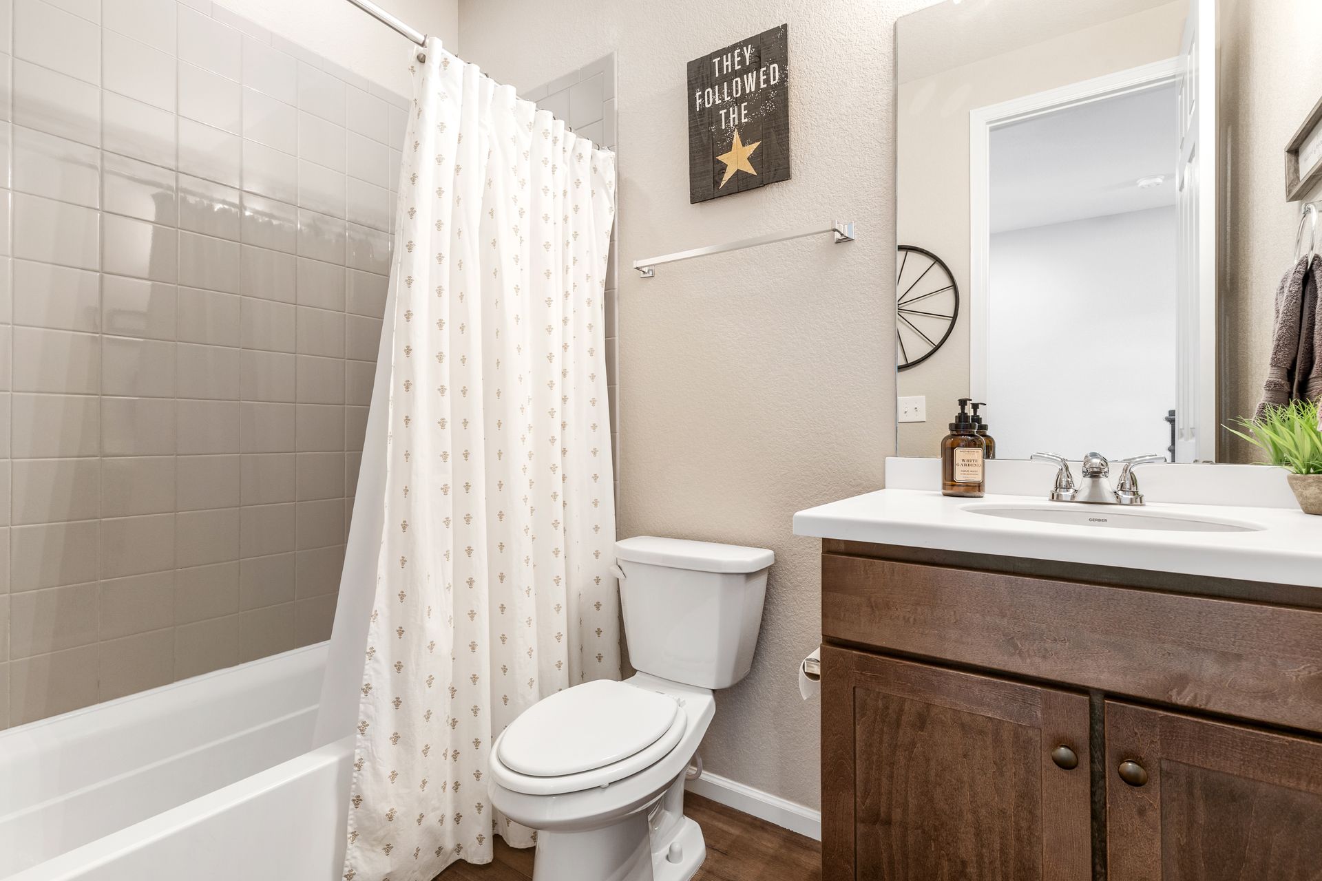 This picture-perfect home is one of the largest in the neighborhood and features a large lot complete with french drain, flagstone walkway, raised garden beds, and numerous trees and shrubs along the perimeter of the fully fenced back yard. Outdoor living is at its best with a convenient hot tub area, and an impressive covered patio running the full length of the home with recessed lights, sun shades, gas line for a grill, and built-in speakers. Inside the home, a foyer with high ceilings and beautiful floors sits at the base of the staircase. A main floor bedroom, currently used as an office, and full bathroom allows for many options for work, guests, or other living arrangements. Within the open concept living area awaits a light and bright kitchen with tiled backsplash, stainless steel appliances, gas range, pantry, built-in speakers, and quartz countertops. The living area features a modern linear fireplace aside the dining area which leads seamlessly through double 8' slider doors to the covered patio. Upstairs, an airy loft with tons of natural light and mountain views creates an additional living/work/recreation space. A large laundry room and linen closet sit conveniently outside of the primary suite. The private primary suite is accompanied by an enormous walk-in closet, and bathroom with raised vanities with double sinks and Corian counters. A thoughtful third full bathroom with double sinks, and three additional bedrooms grace the upper level, one with a large walk-in closet. This home was upgraded beyond the builder's options after move-in. Additional features include a whole house humidifier with two-zone damper system, a full crawl space, solar lease with low monthly payment, and transferable structural warranty. Polishing off this fantastic home is the oversized, insulated, and drywalled 3-car garage with floor coating, 220v, hanging storage, and access to the backyard.