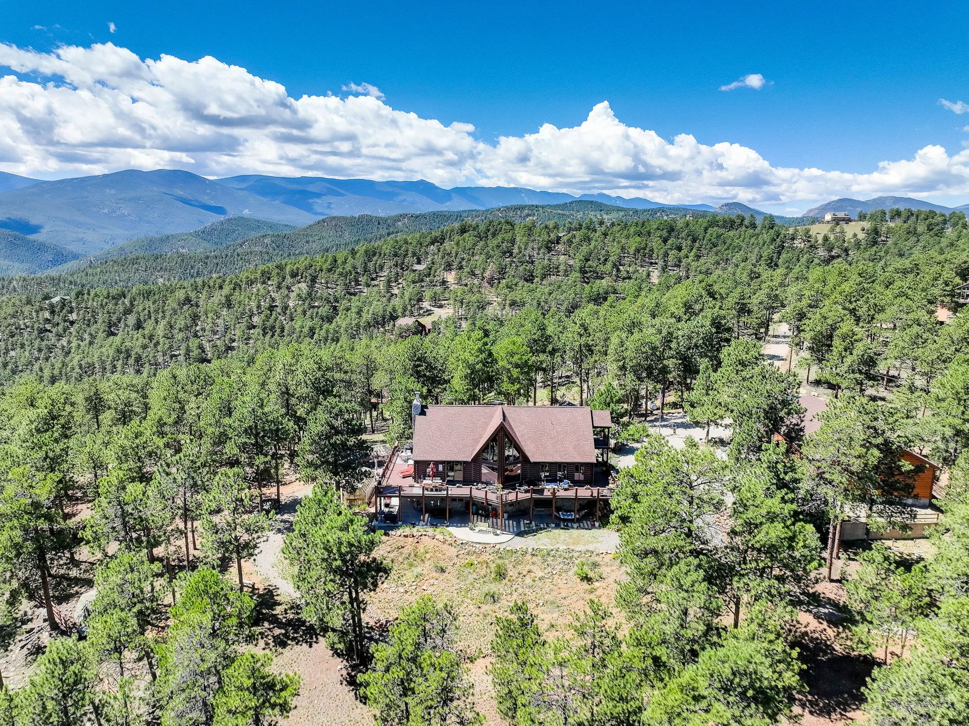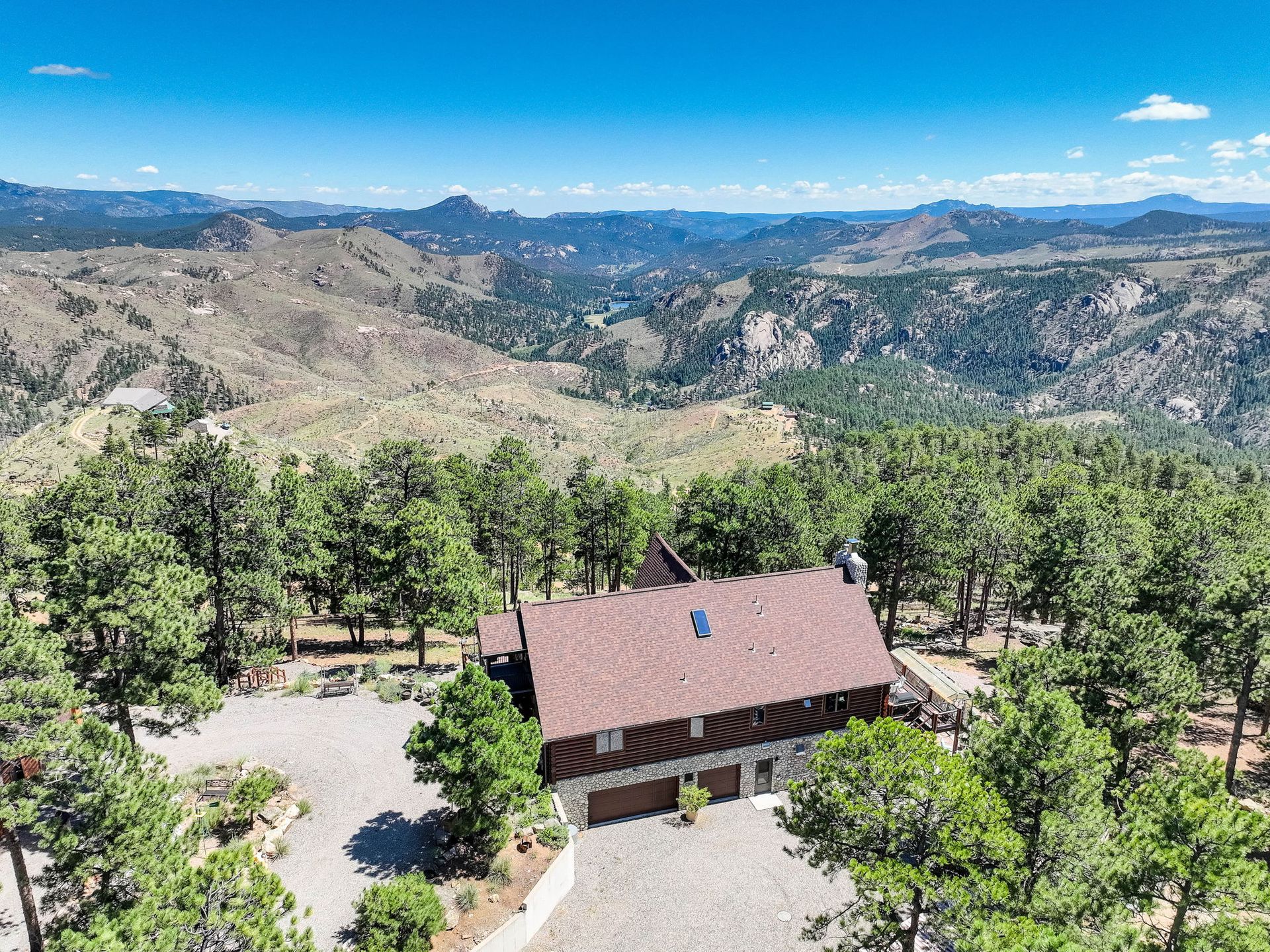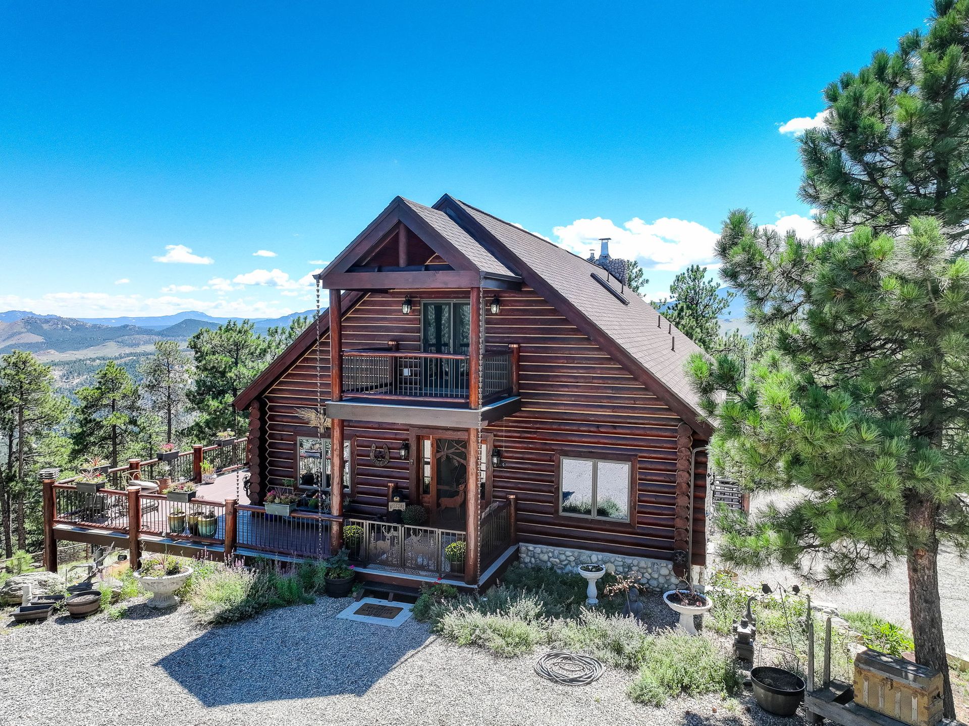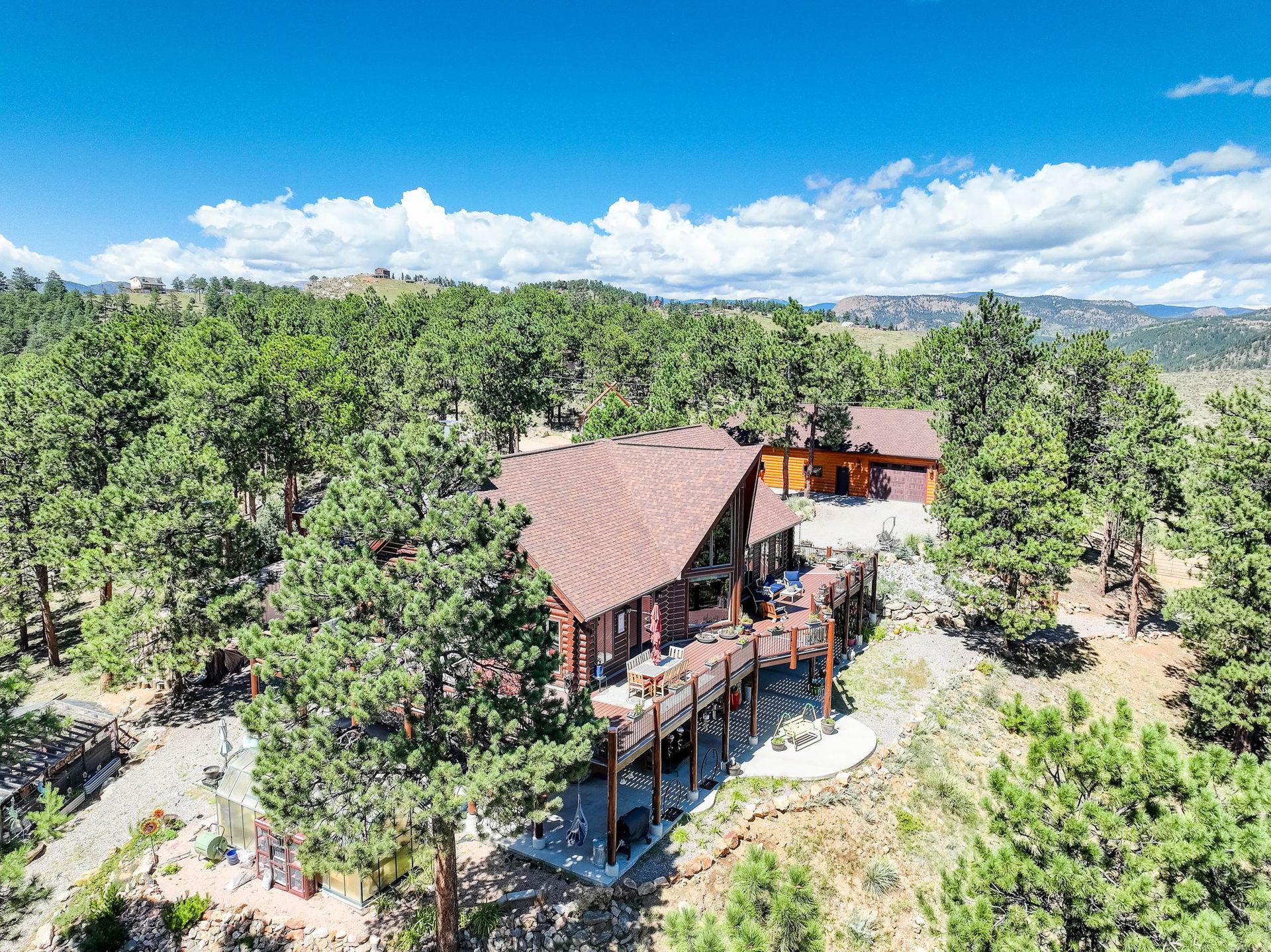 A spectacular 20-acre property that sits above Pine Lake and has private access to the Platte River. You simply cannot find a more ideal Rocky Mountain Getaway. The exterior is gated and fenced with amazing landscaping and attention to detail. A greenhouse and an enclosed outdoor garden are great for all you gardeners. The perfectly stained and sealed log home has a composite wrap-around deck with log posts capped in copper: Jaw-Dropping views! The interior is built around open-concept living with a newly renovated kitchen, high-end appliances and a butler's pantry. The main floor has two bedrooms and a full bathroom. The primary suite loft has a private covered porch for year-round enjoyment. The walk-out lower level is an entertainer's dream and comes nicely equipped with a log bar and a log Murphy bed as well as a log poker table. Two River Rock encased fireplaces provide great heat and ambiance in the winter and the radiant in-floor heat keeps everyone warm and cozy year-round. The house is on natural gas but also has a backup generator powered by propane to make sure no matter what happens you do not skip a beat. A three-car attached and a massive eight-car detached garage...this home has so much to offer, schedule your private showing before it's gone!