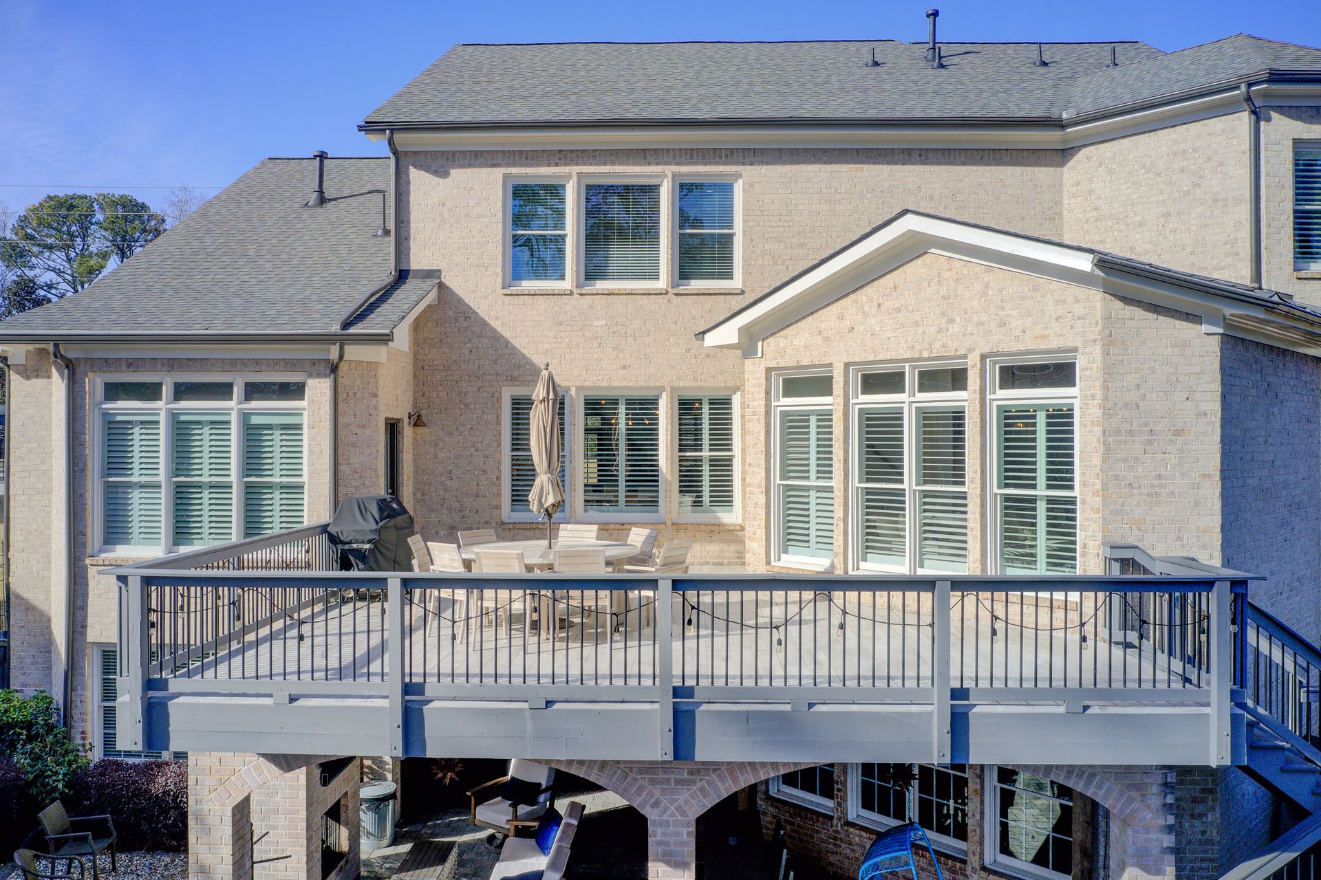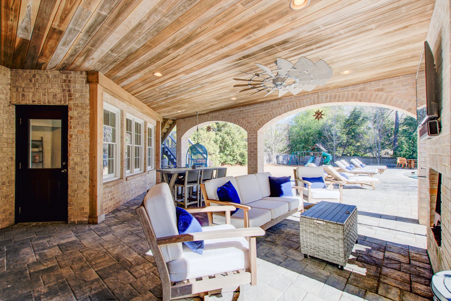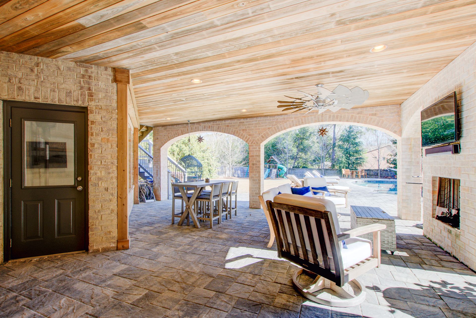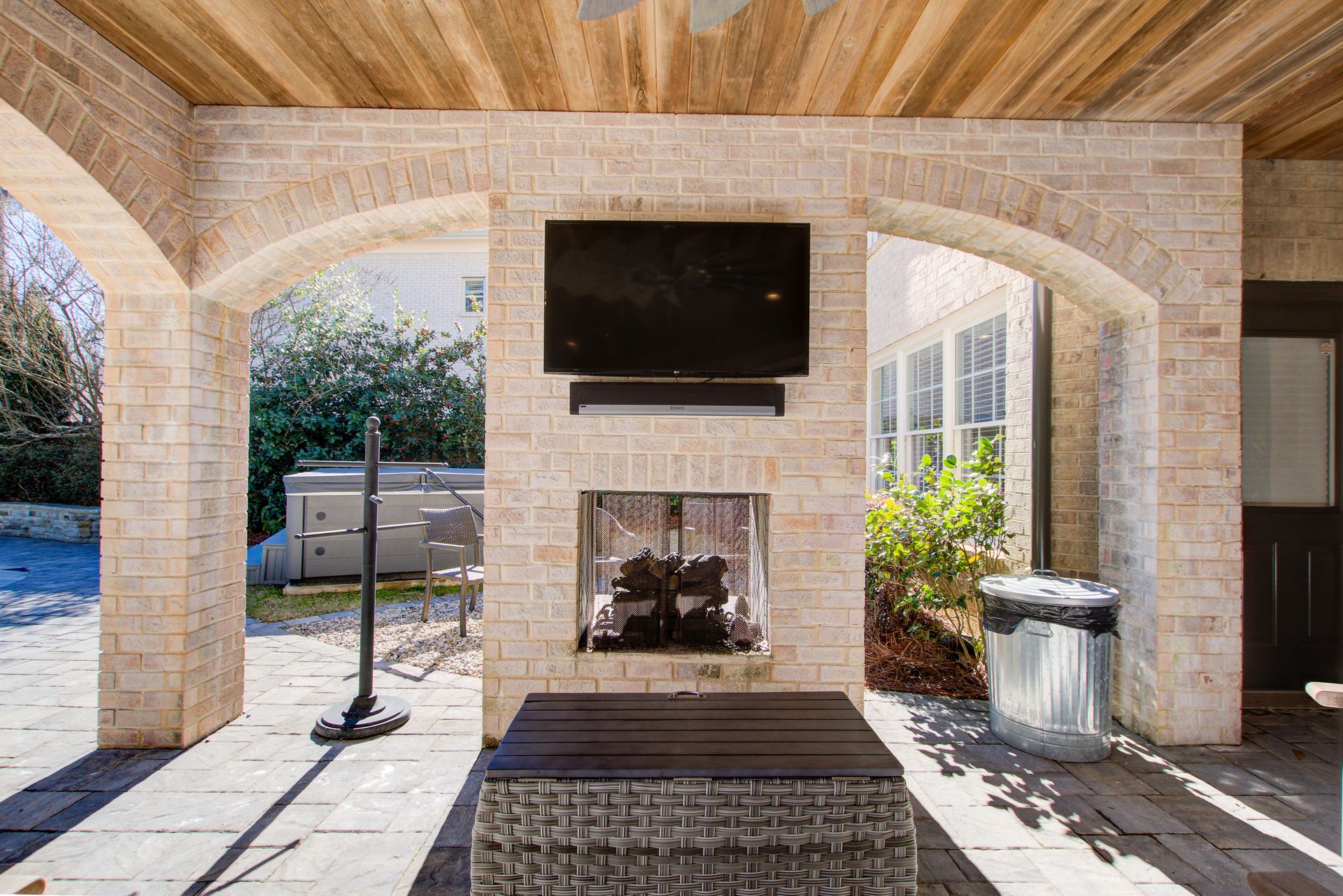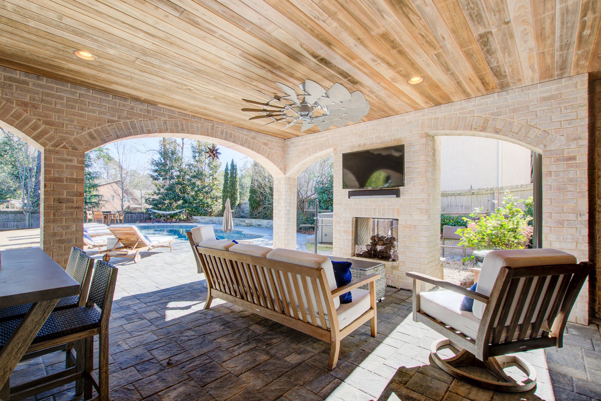Just outside the lower level, step into the covered outdoor entertaining area, complete with a cozy fireplace, a seating area for gathering, and a perfect place to enjoy the big game on your outdoor TV.