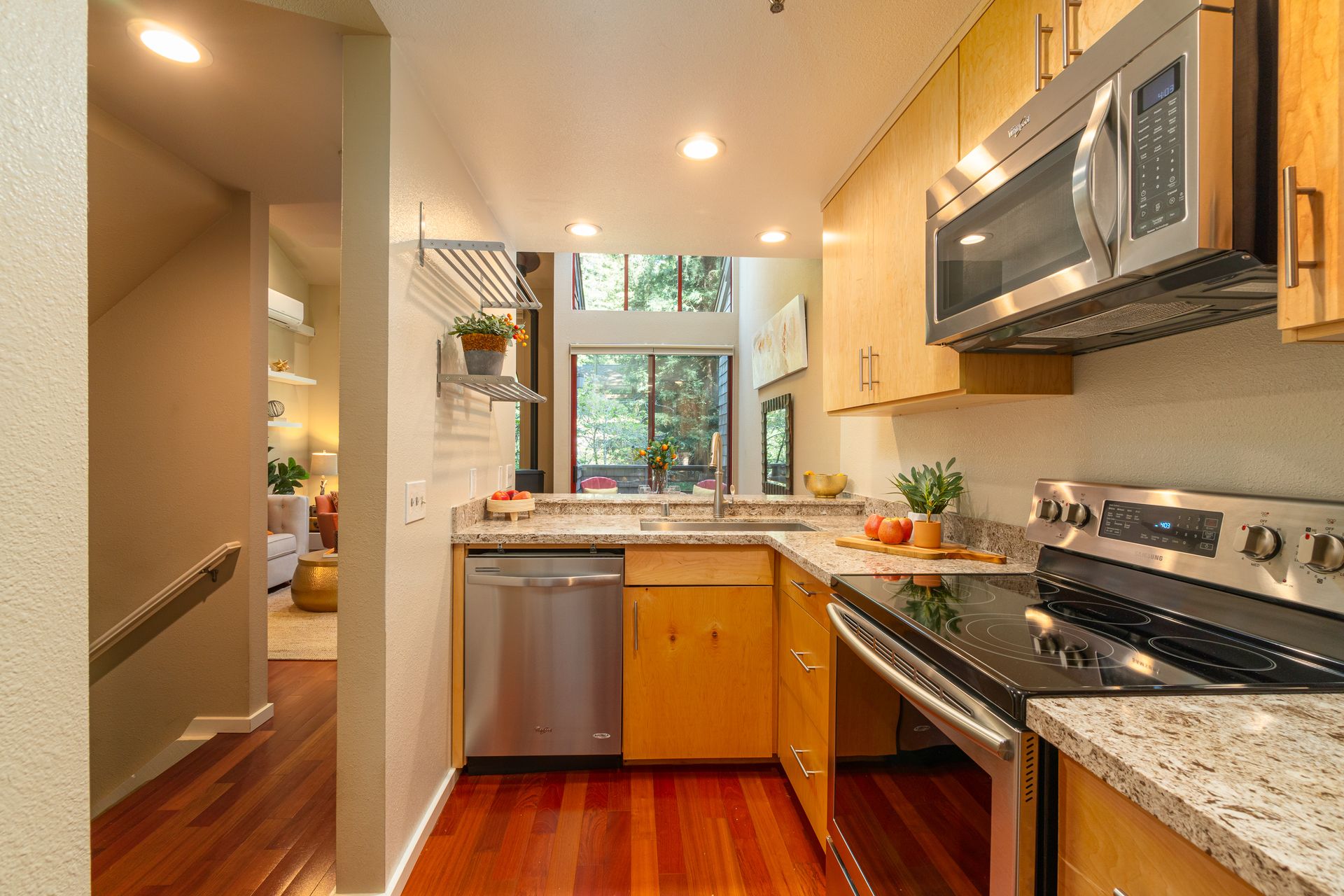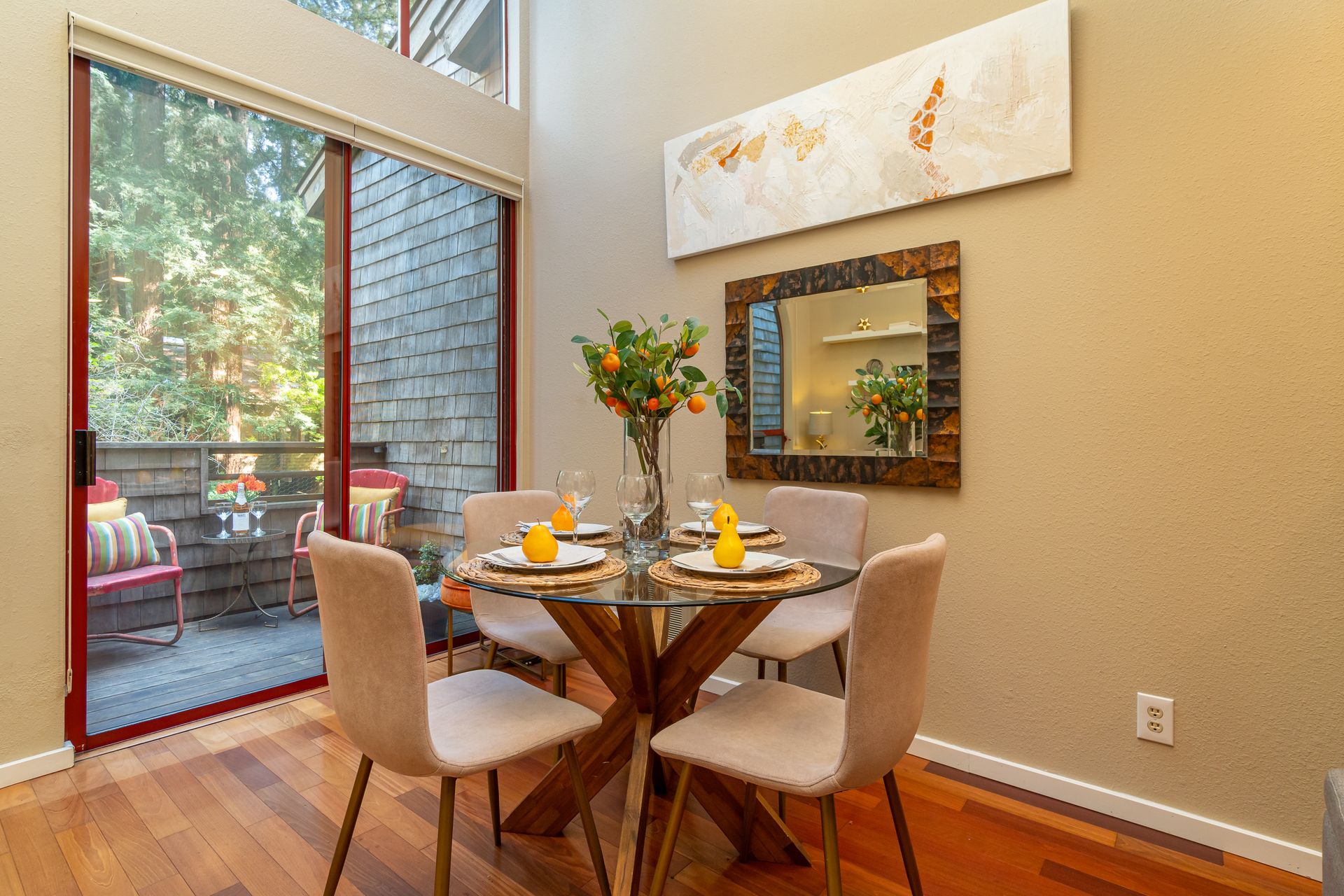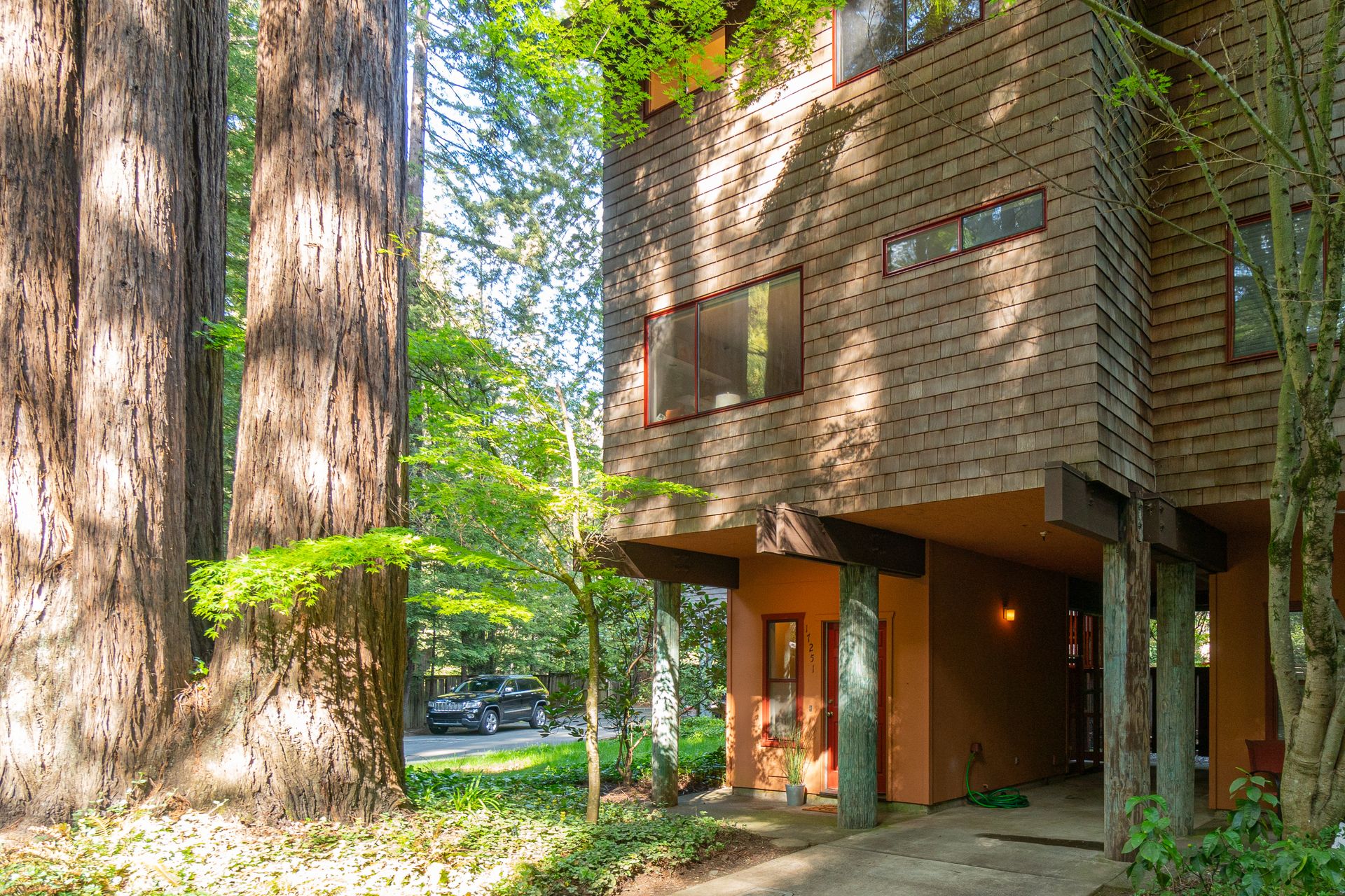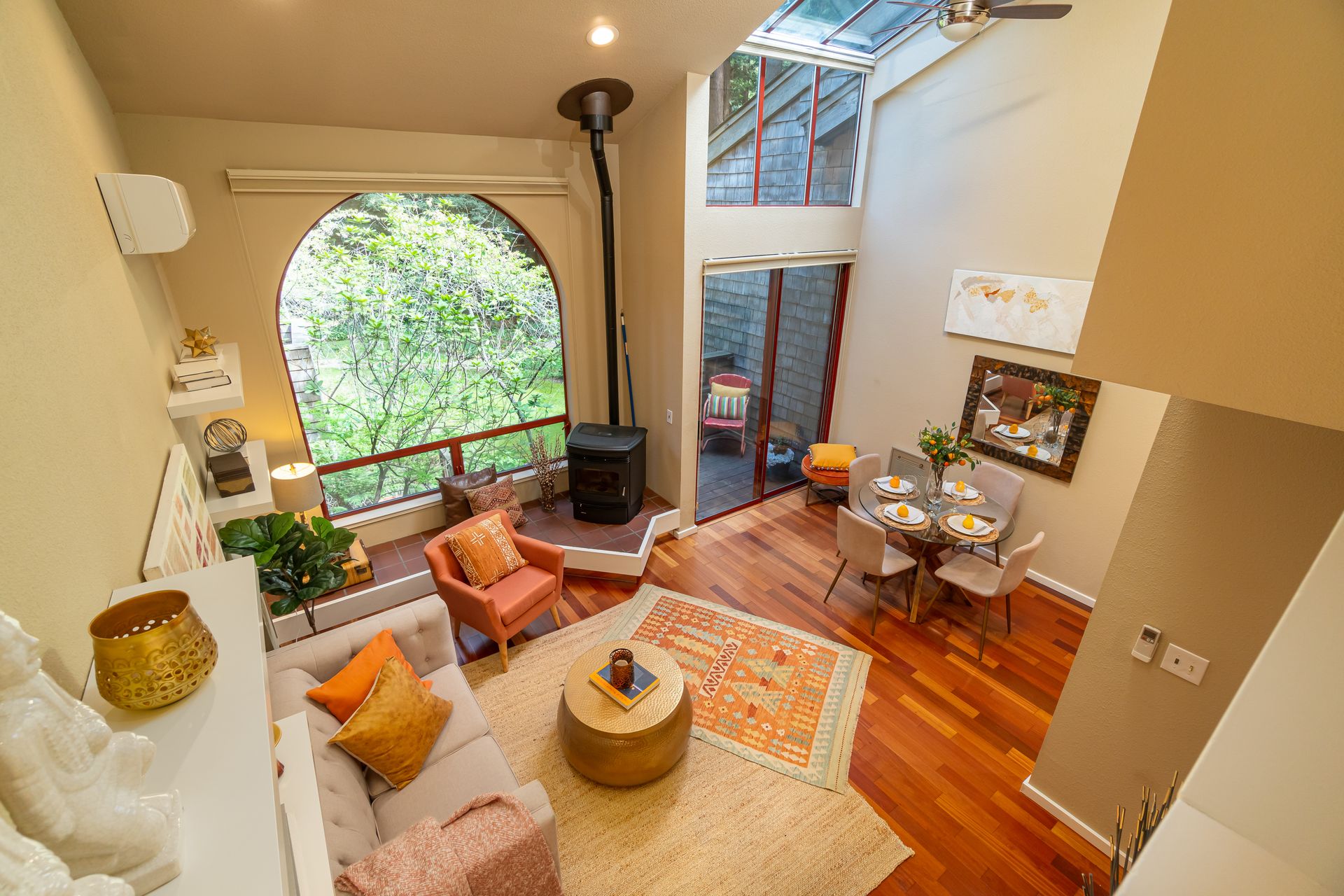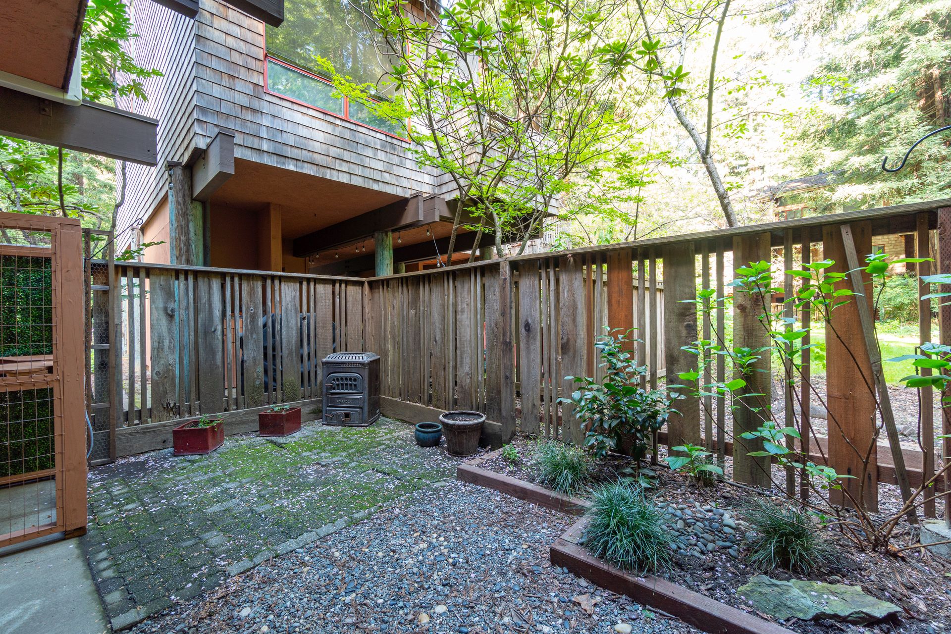 With only one shared wall, this end-unit townhouse feels like a standalone home! The main level includes a sensible combined living and dining area, bedroom and en-suite full bath. An updated kitchen with quartz countertops offers potential bar seating, making hosting effortless. Impressively designed windows capture views of the sublime redwood setting and a private deck off the living area brings the surrounding elements to life. Leading into the primary suite, a loft-style landing on the third level makes for a nice office or reading nook. The penthouse style primary suite will transport you into your own private oasis.