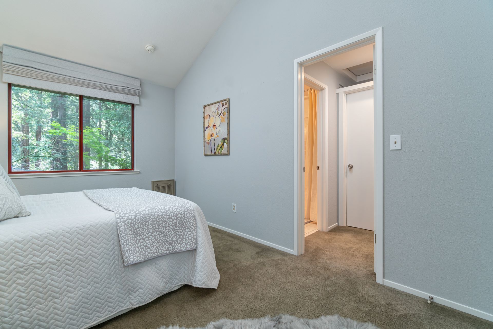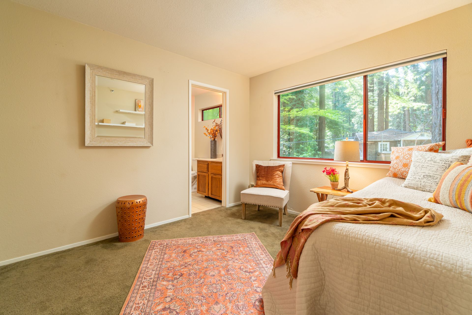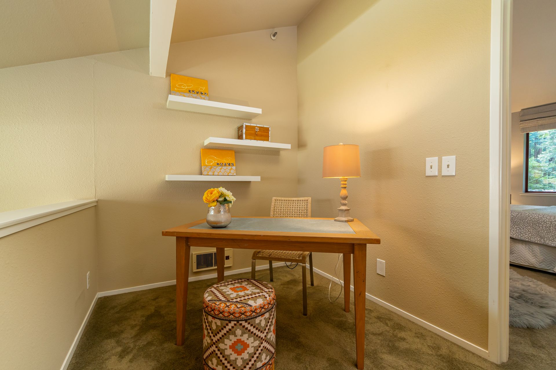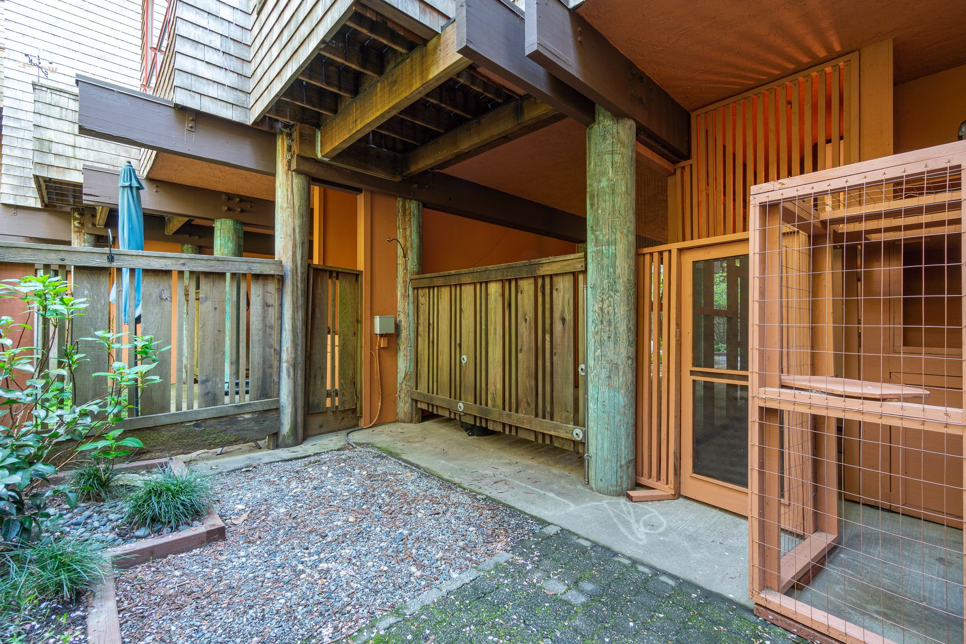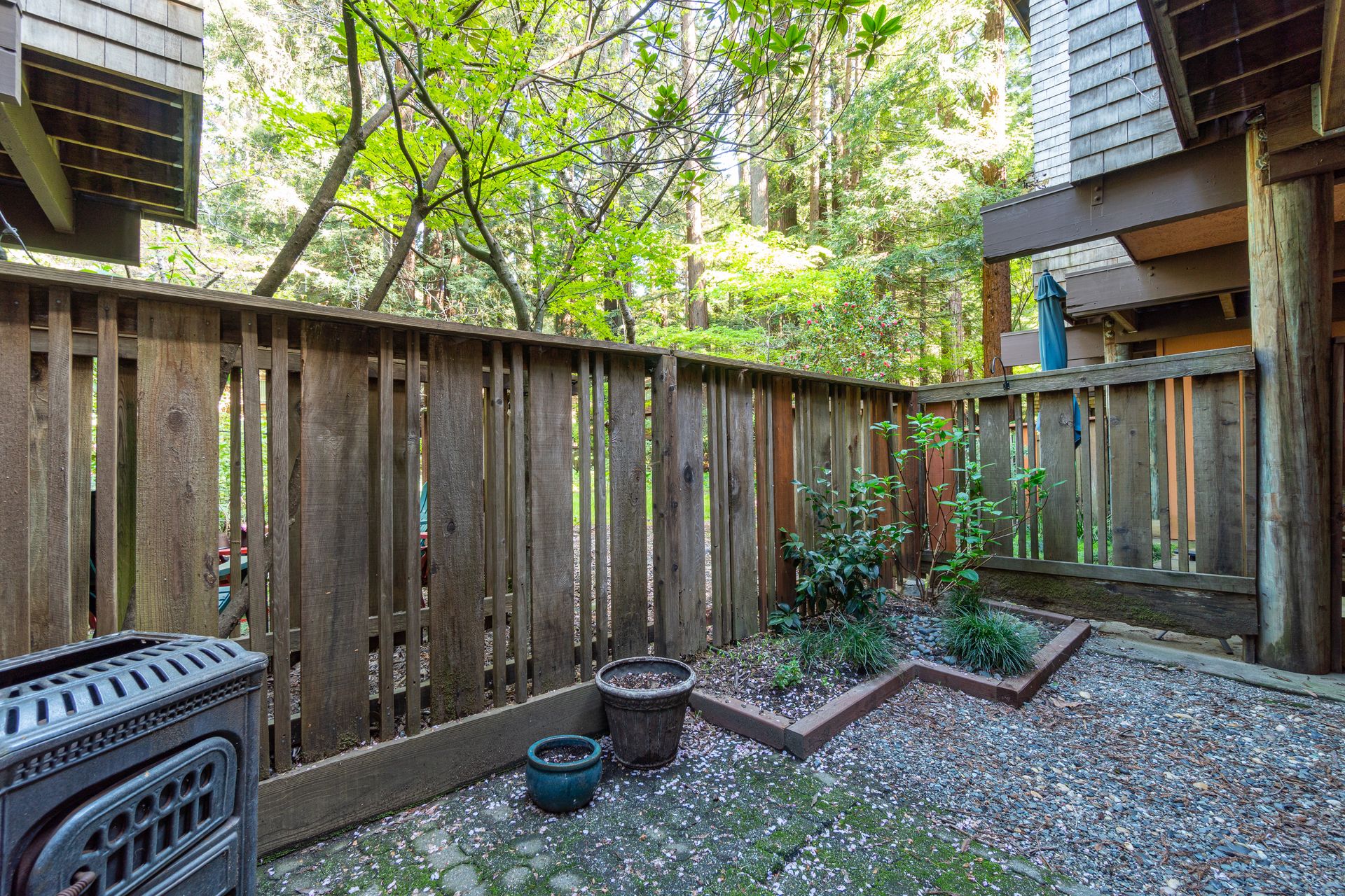 With only one shared wall, this end-unit townhouse feels like a standalone home! The main level includes a sensible combined living and dining area, bedroom and en-suite full bath. An updated kitchen with quartz countertops offers potential bar seating, making hosting effortless. Impressively designed windows capture views of the sublime redwood setting and a private deck off the living area brings the surrounding elements to life. Leading into the primary suite, a loft-style landing on the third level makes for a nice office or reading nook. The penthouse style primary suite will transport you into your own private oasis.