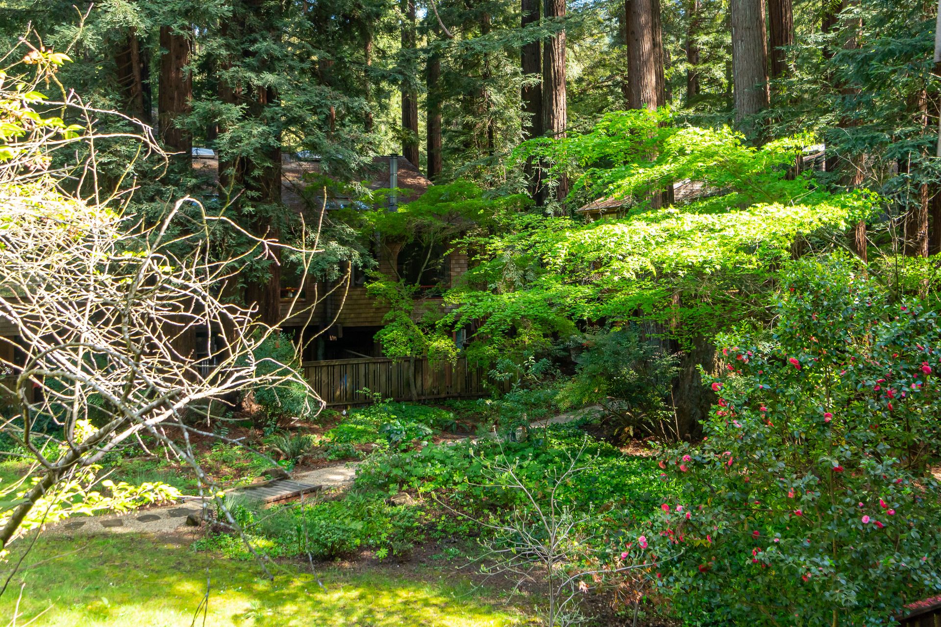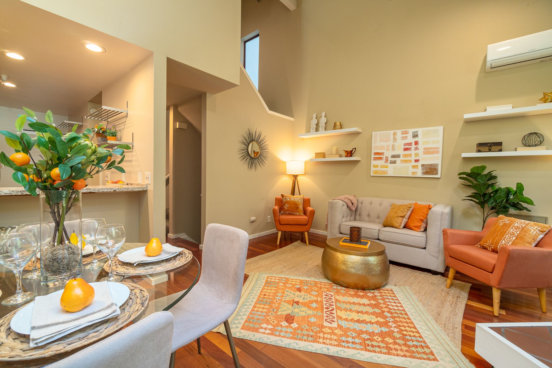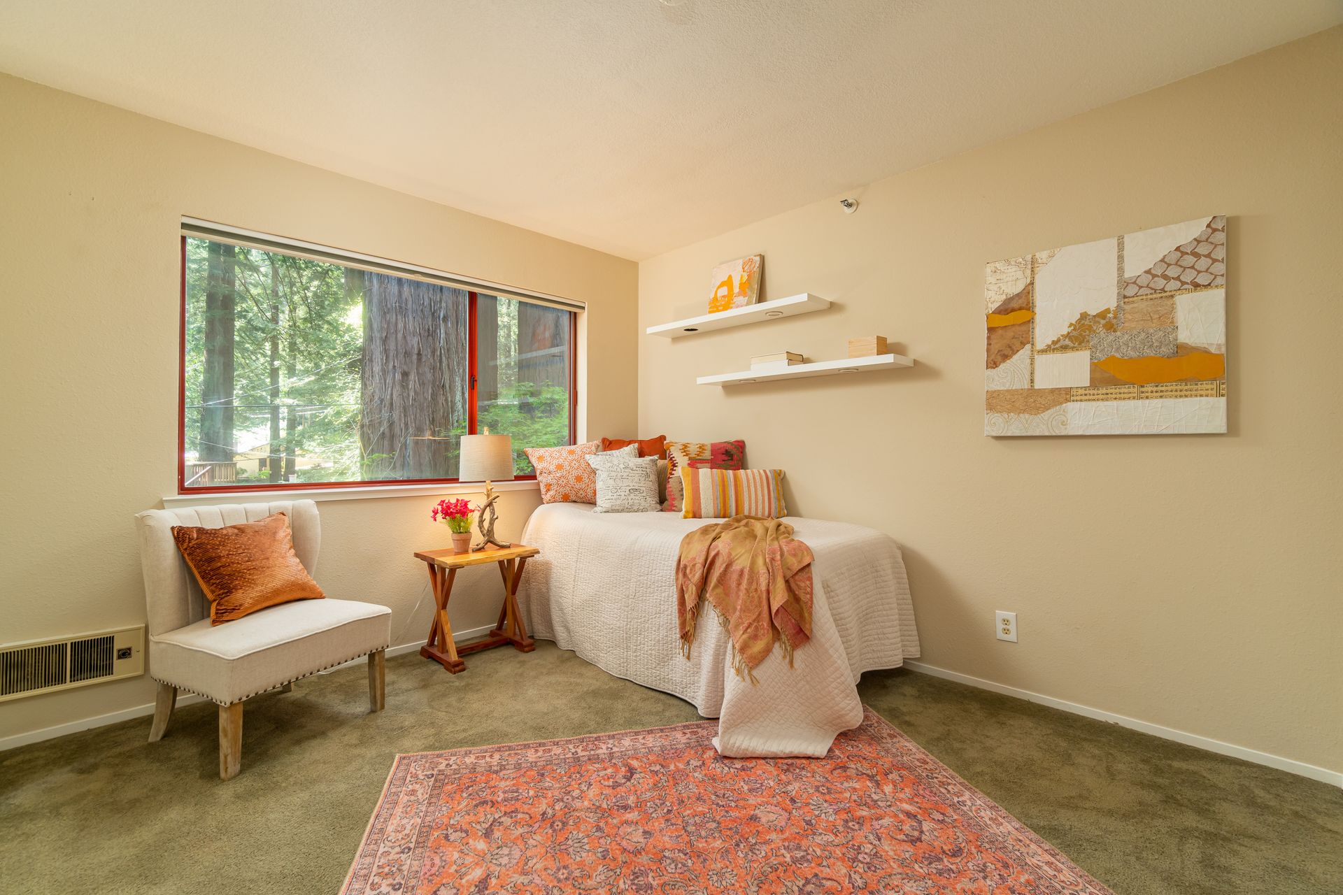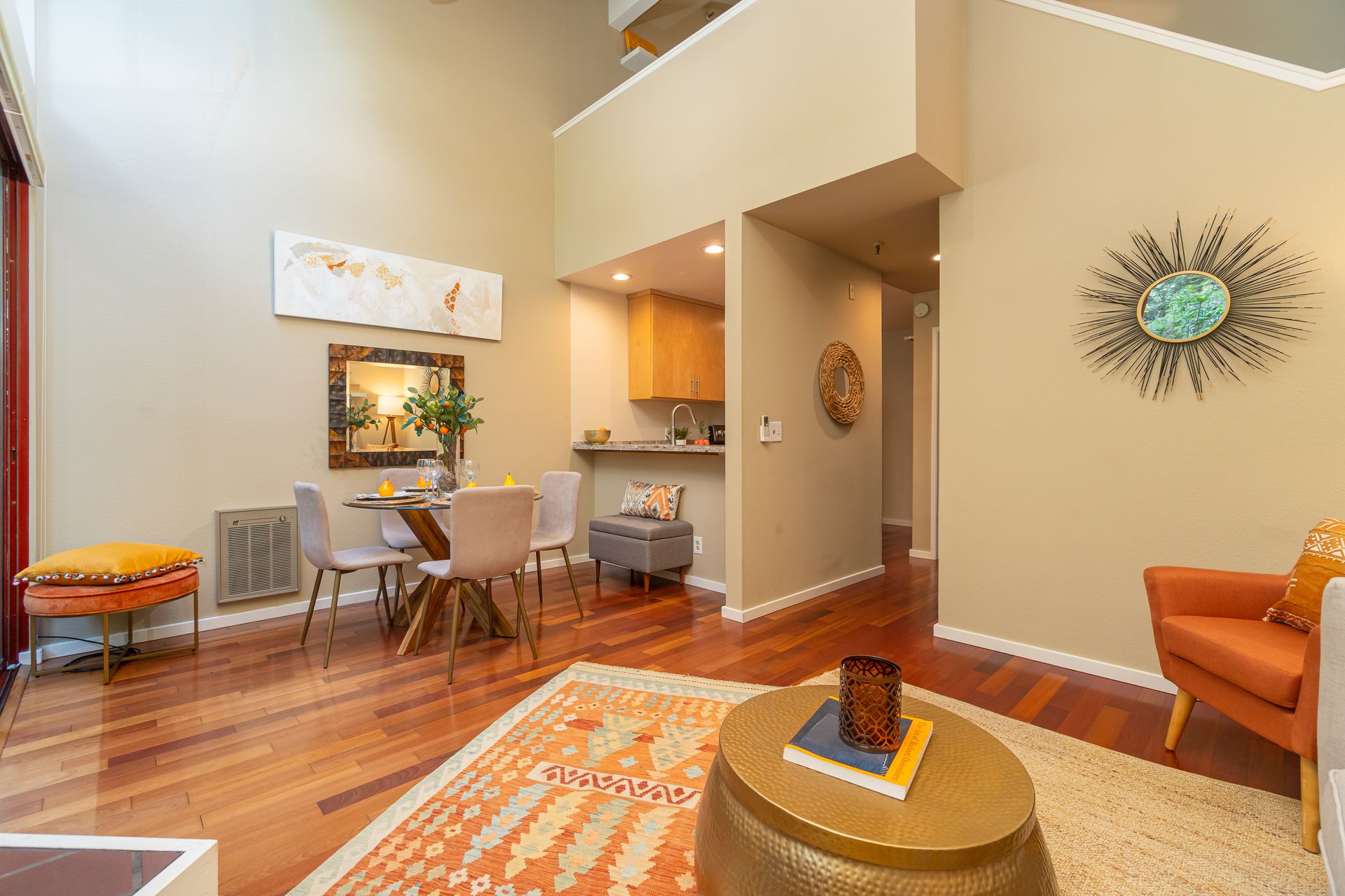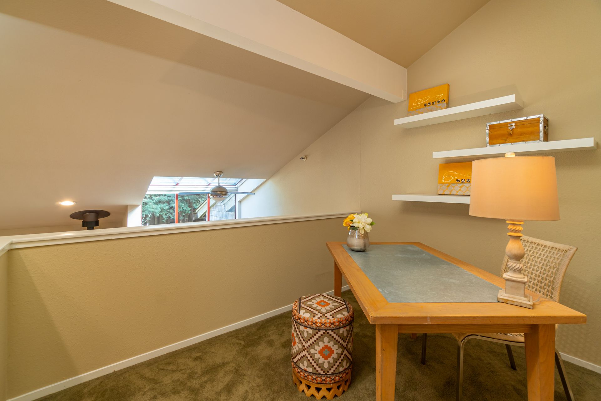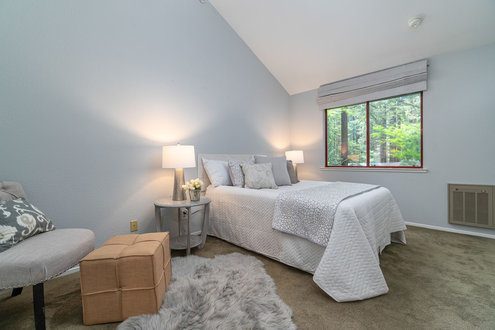 With only one shared wall, this end-unit townhouse feels like a standalone home! The main level includes a sensible combined living and dining area, bedroom and en-suite full bath. An updated kitchen with quartz countertops offers potential bar seating, making hosting effortless. Impressively designed windows capture views of the sublime redwood setting and a private deck off the living area brings the surrounding elements to life. Leading into the primary suite, a loft-style landing on the third level makes for a nice office or reading nook. The penthouse style primary suite will transport you into your own private oasis.