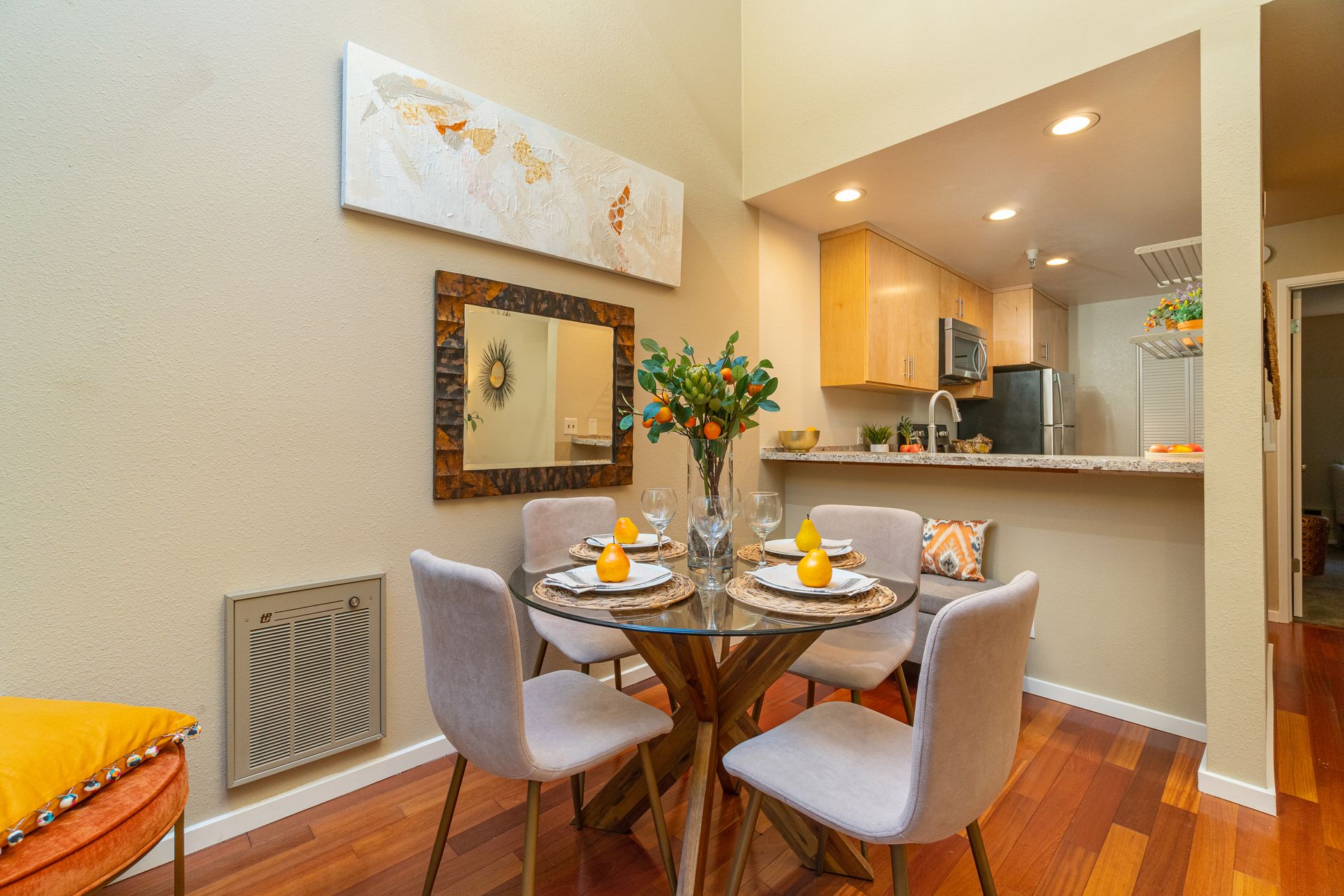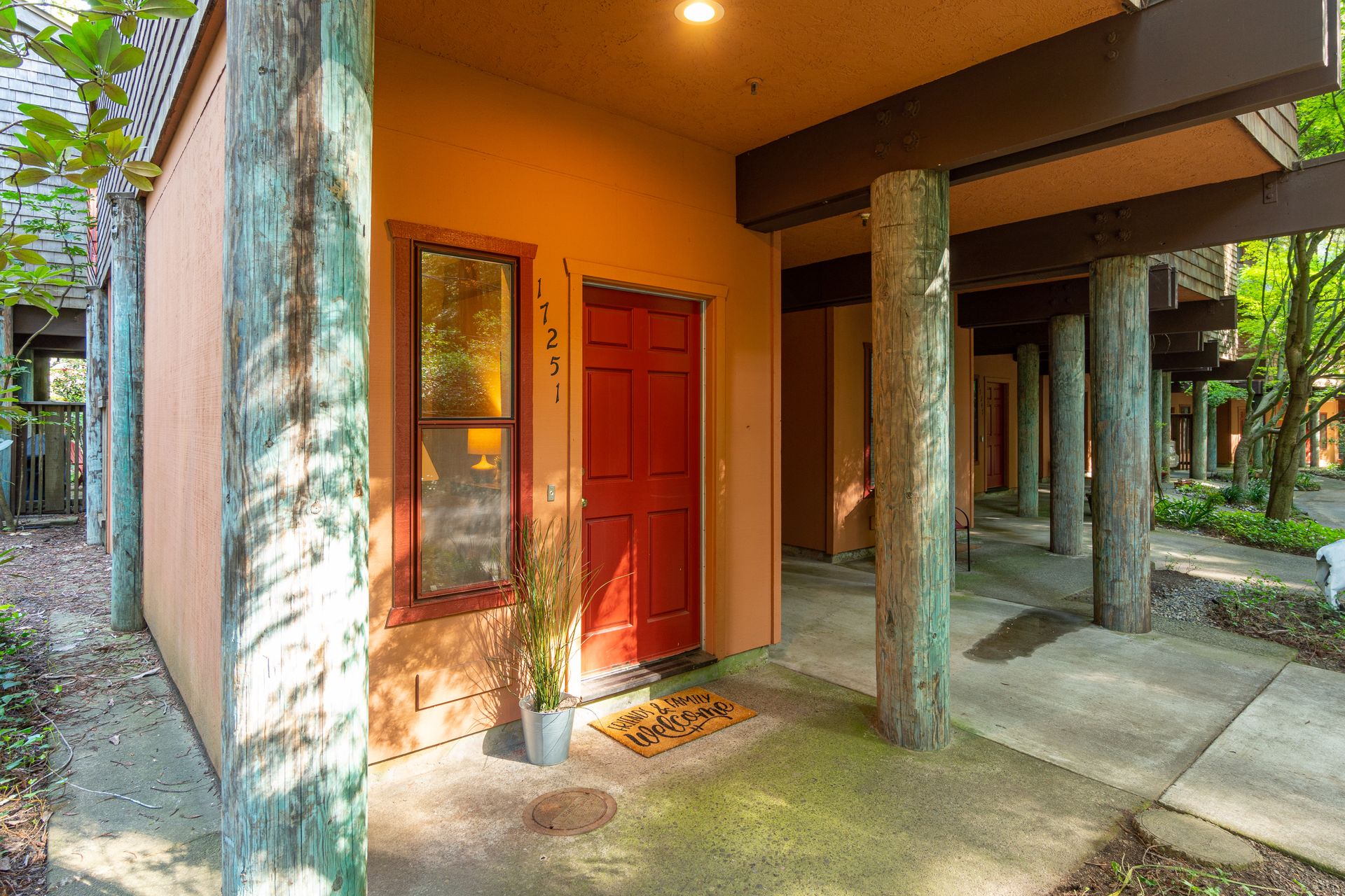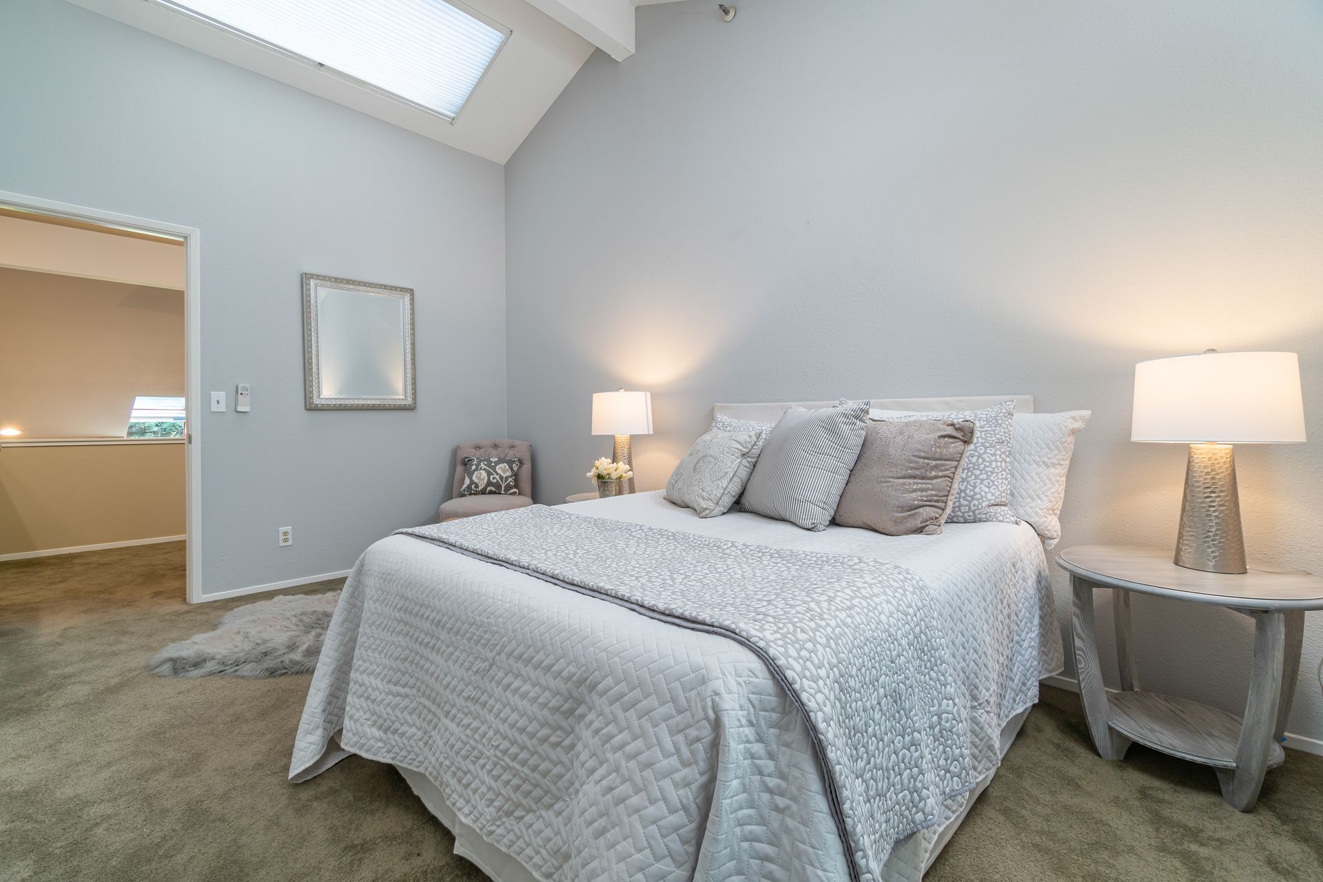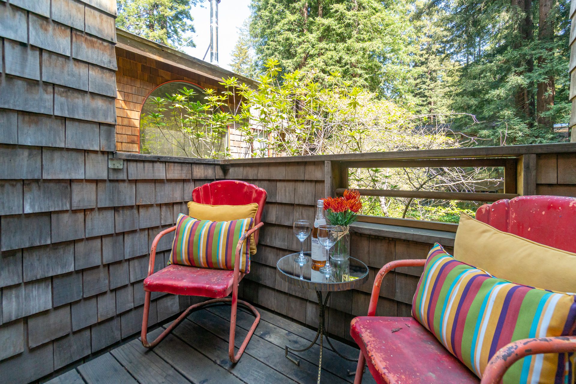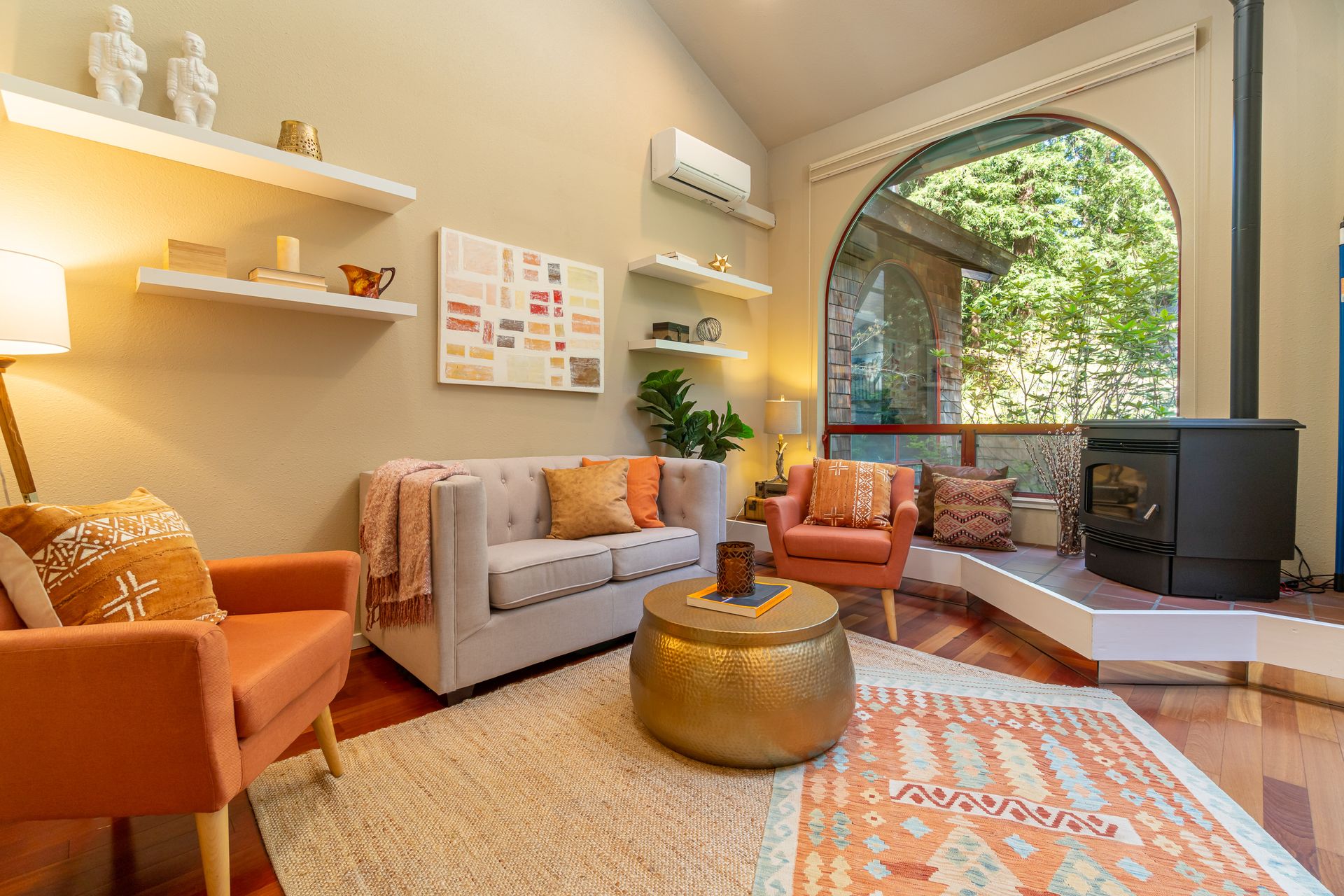 With only one shared wall, this end-unit townhouse feels like a standalone home! The main level includes a sensible combined living and dining area, bedroom and en-suite full bath. An updated kitchen with quartz countertops offers potential bar seating, making hosting effortless. Impressively designed windows capture views of the sublime redwood setting and a private deck off the living area brings the surrounding elements to life. Leading into the primary suite, a loft-style landing on the third level makes for a nice office or reading nook. The penthouse style primary suite will transport you into your own private oasis.