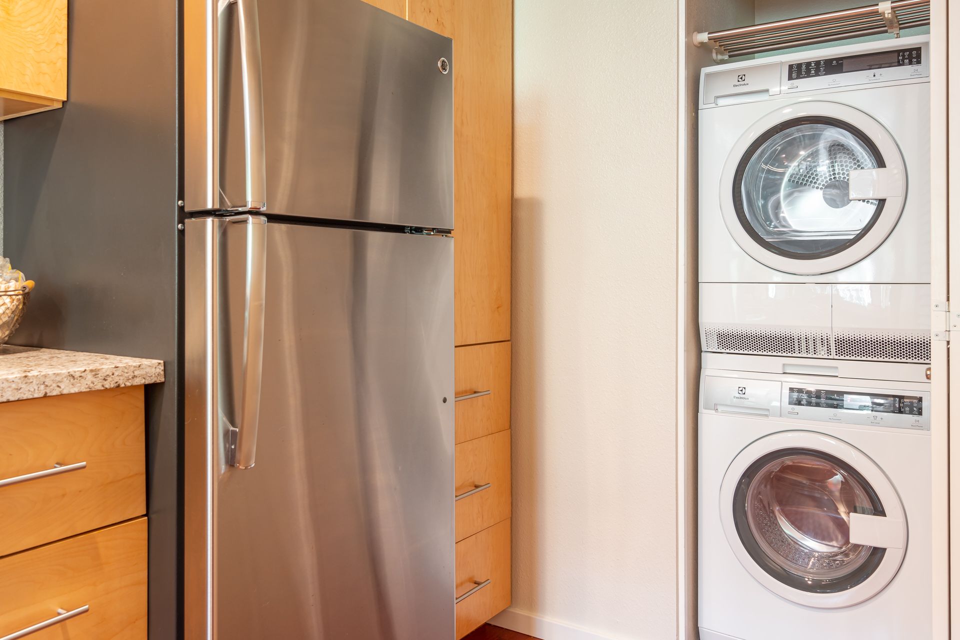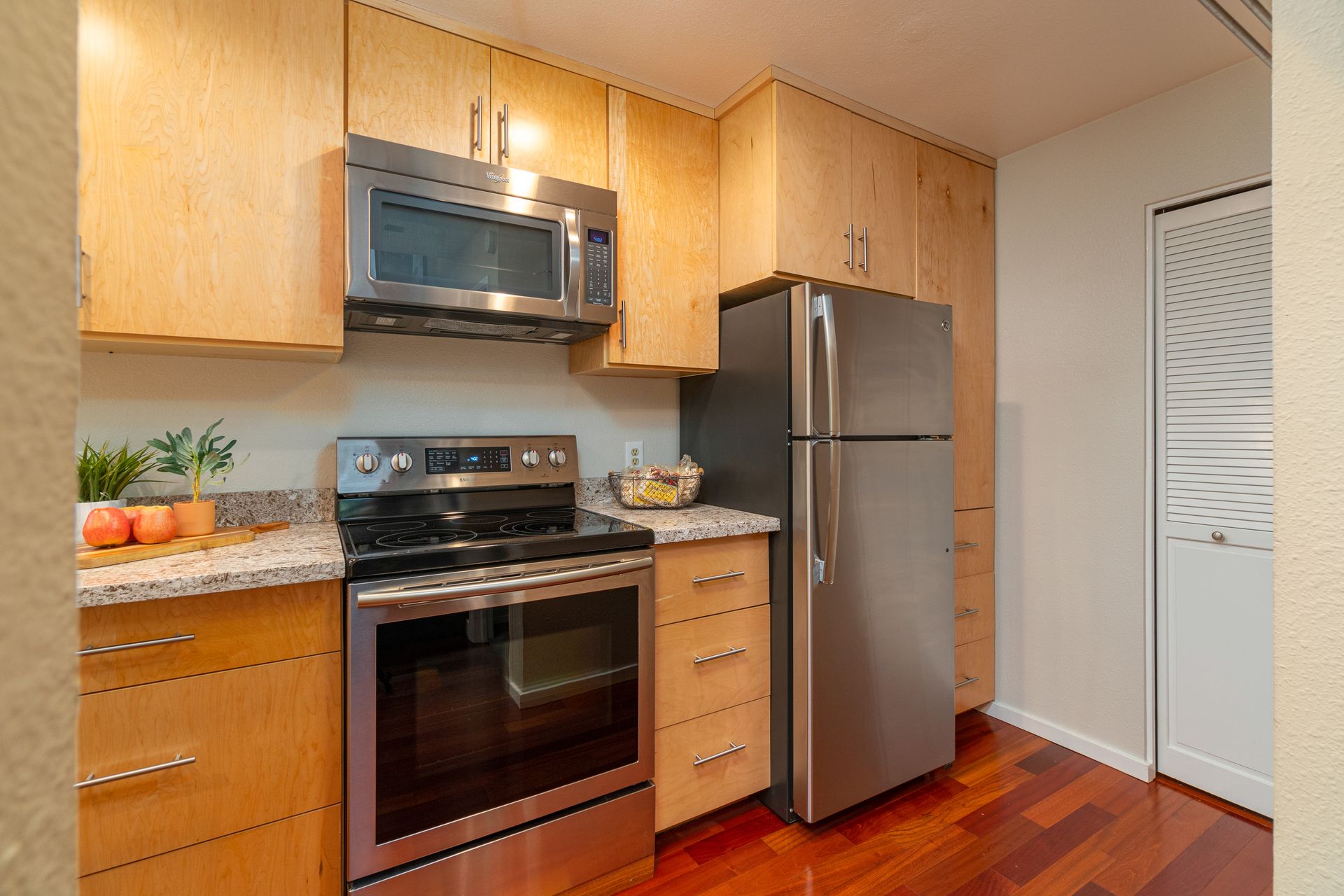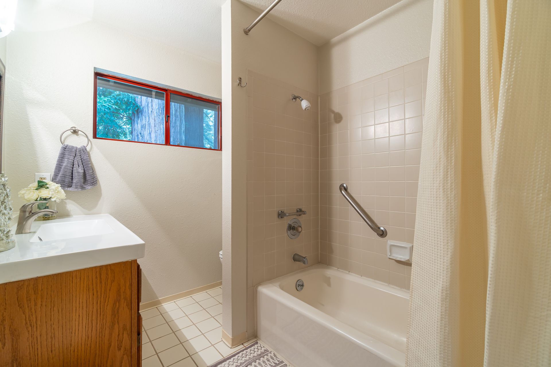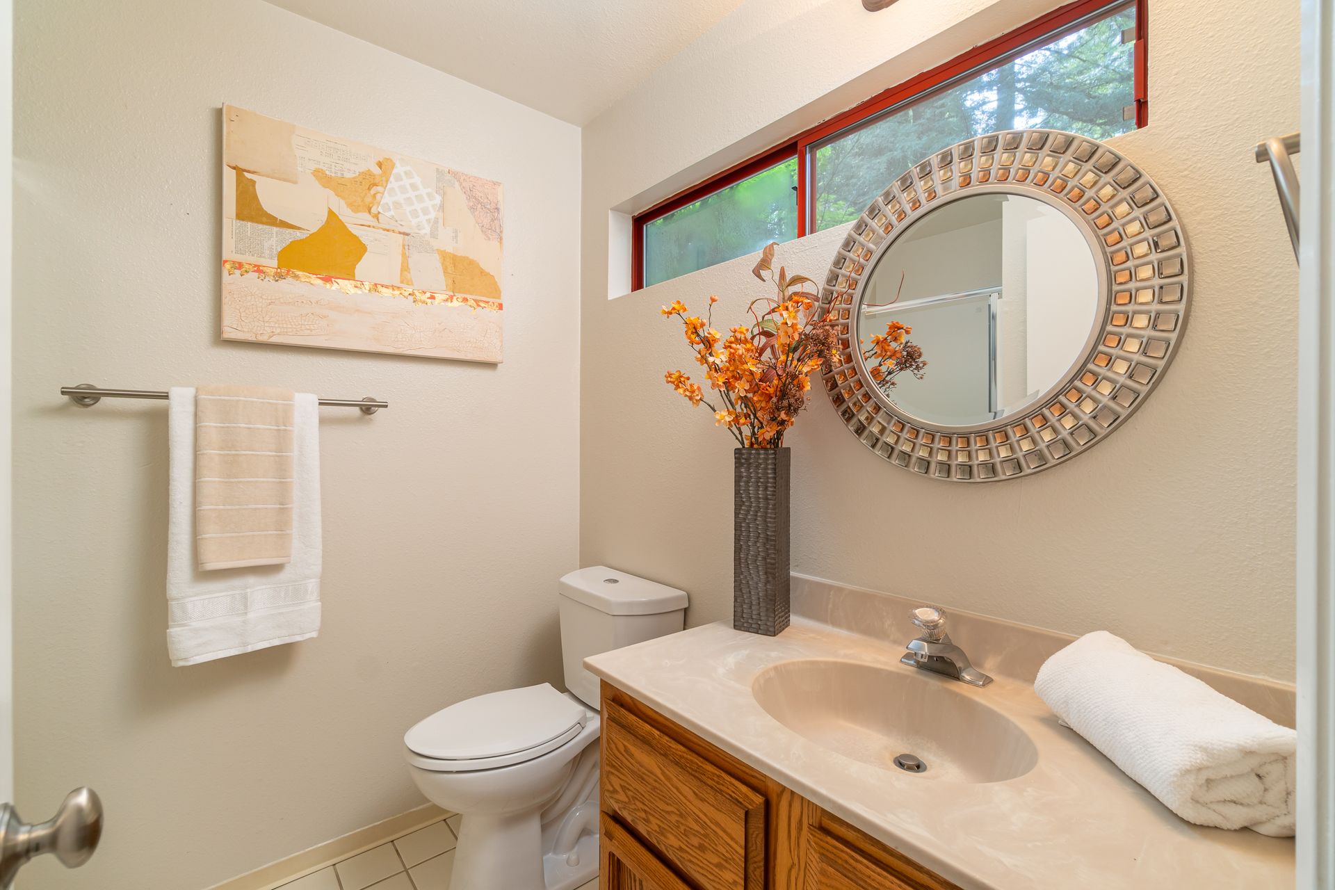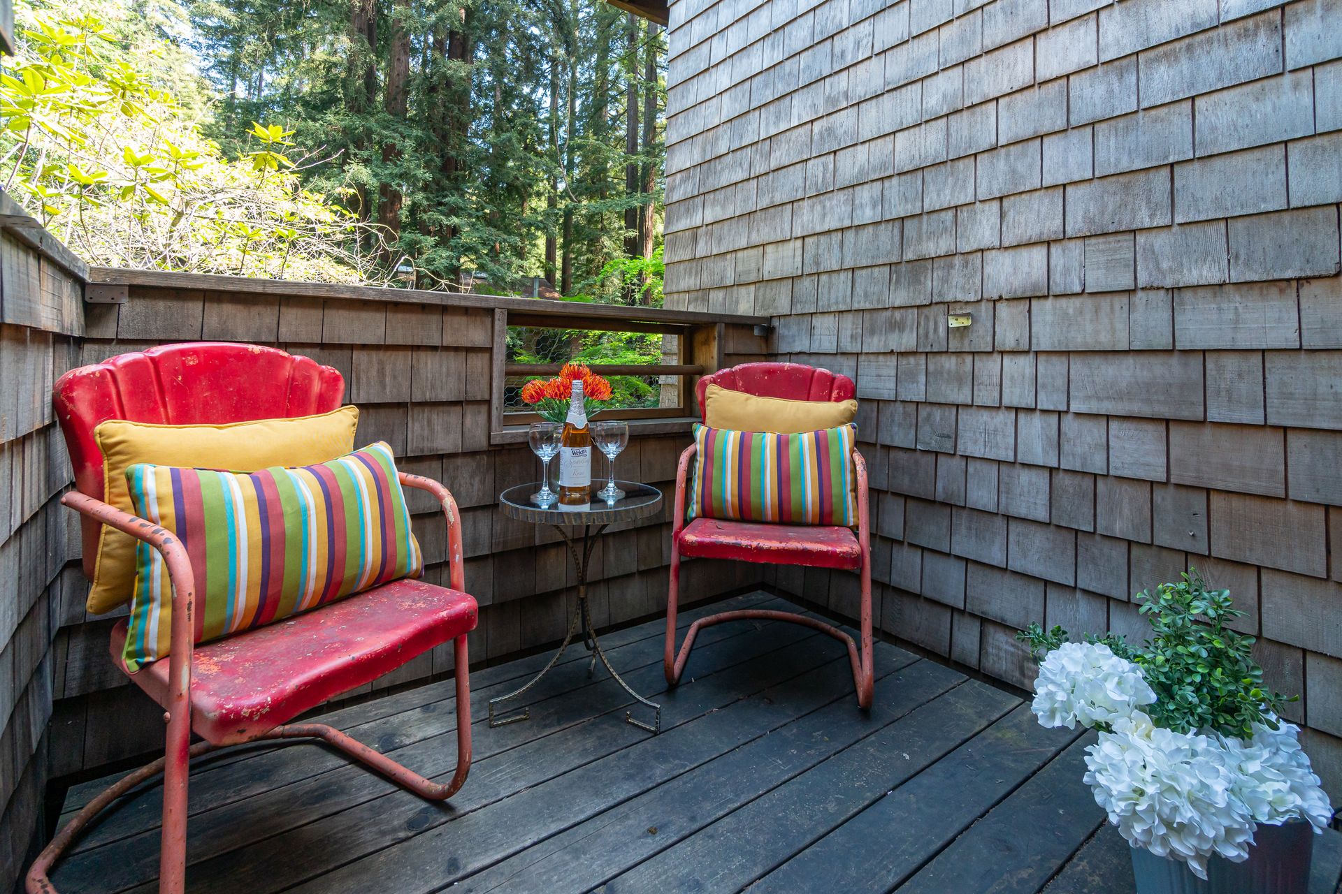 With only one shared wall, this end-unit townhouse feels like a standalone home! The main level includes a sensible combined living and dining area, bedroom and en-suite full bath. An updated kitchen with quartz countertops offers potential bar seating, making hosting effortless. Impressively designed windows capture views of the sublime redwood setting and a private deck off the living area brings the surrounding elements to life. Leading into the primary suite, a loft-style landing on the third level makes for a nice office or reading nook. The penthouse style primary suite will transport you into your own private oasis.