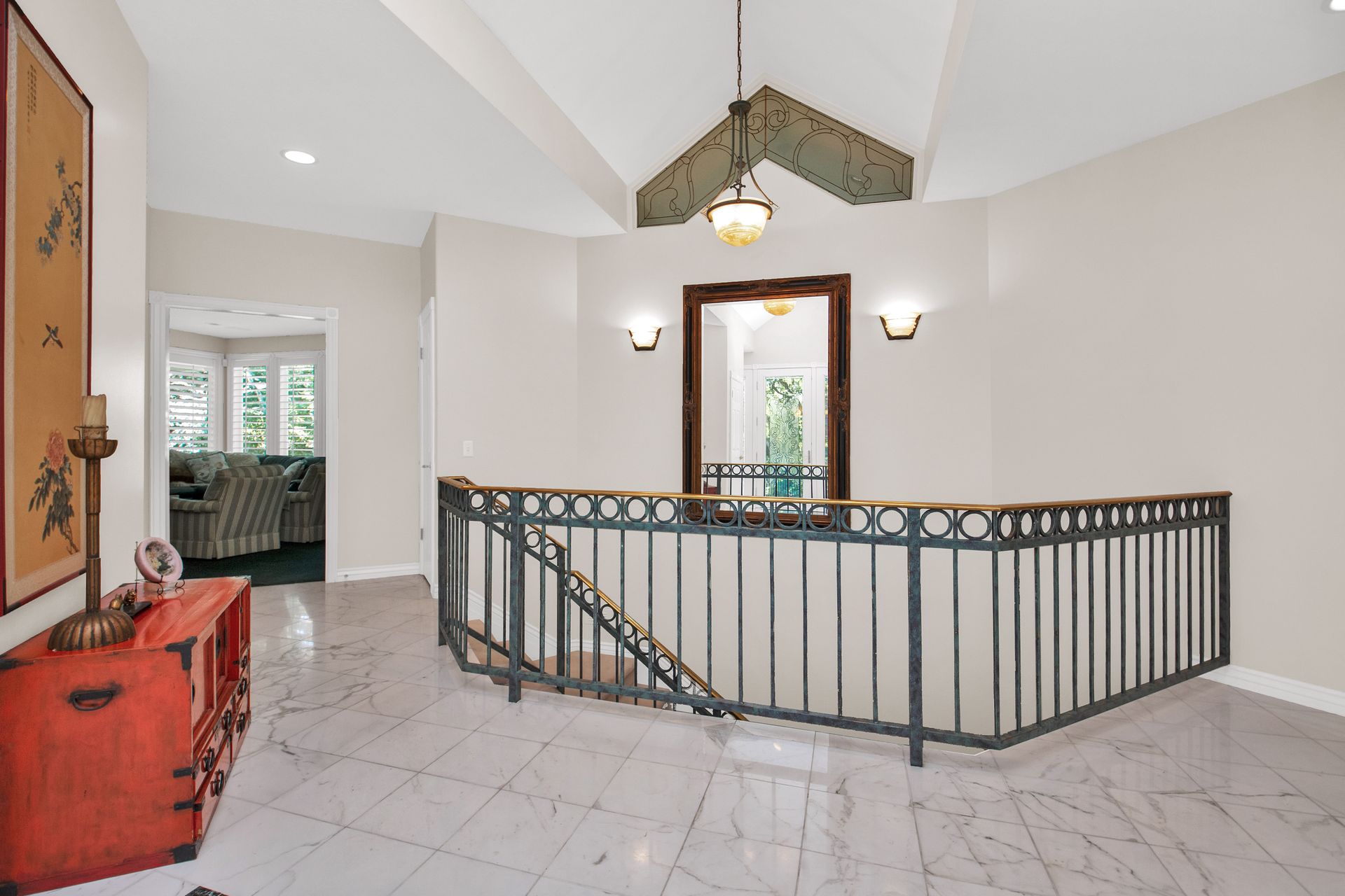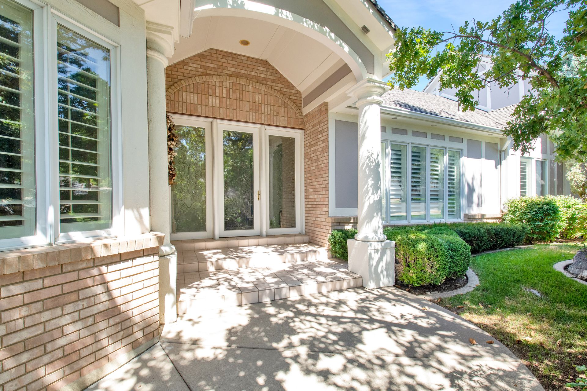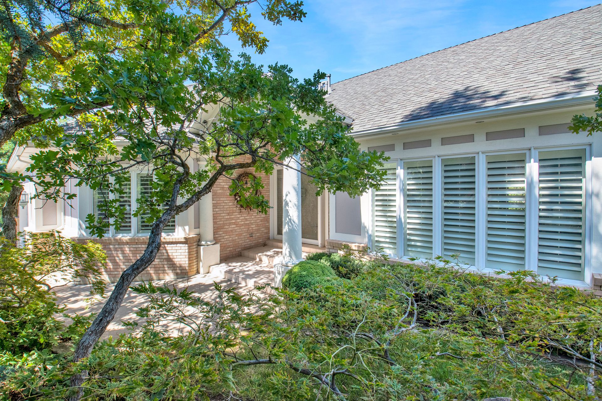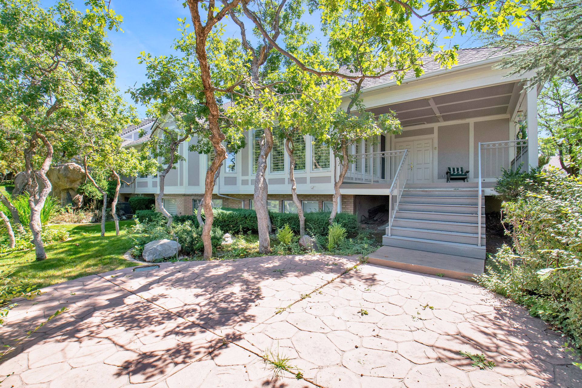 An elegant entry greets you through a lead glass door with matching side lights when you approach. Enter into a beautiful marble floor entry and take in the pillared formal living room with a spacious coffered ceiling. There are plantation shutter window coverings throughout. This home was appointed with the touch of a well-known interior decorator Kaylee Lott. An impressive kitchen with a vaulted ceiling, Corian countertop with an inset range, and unique cabinetry is located next to a breakfast nook and a cozy gathering room with a door that leads to a large deck that includes attached storage. Entertain guests with fine dining served in the comfy dining room. The primary suite is exquisite with the unique elevated ceiling, windows and an en-suite bathroom that has jetted tub and separate shower to enjoy. The lower level is well planned with two bedrooms, two bathrooms, a den, a wet bar and an extra room with a closet, bedroom size but does not have a window for egress or ingress. Come and see if this home feels right for you.