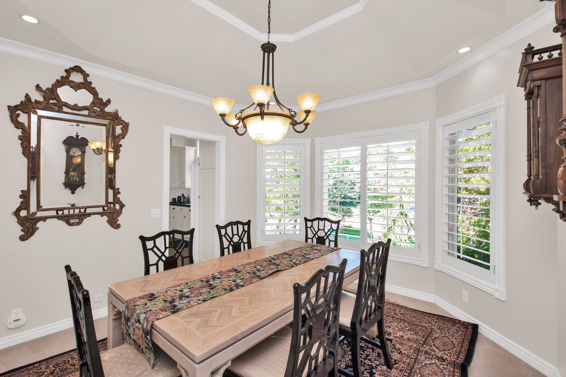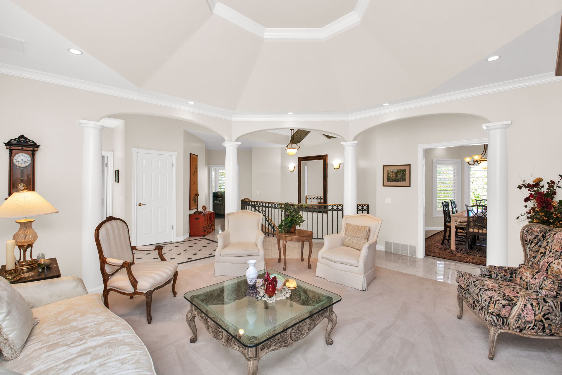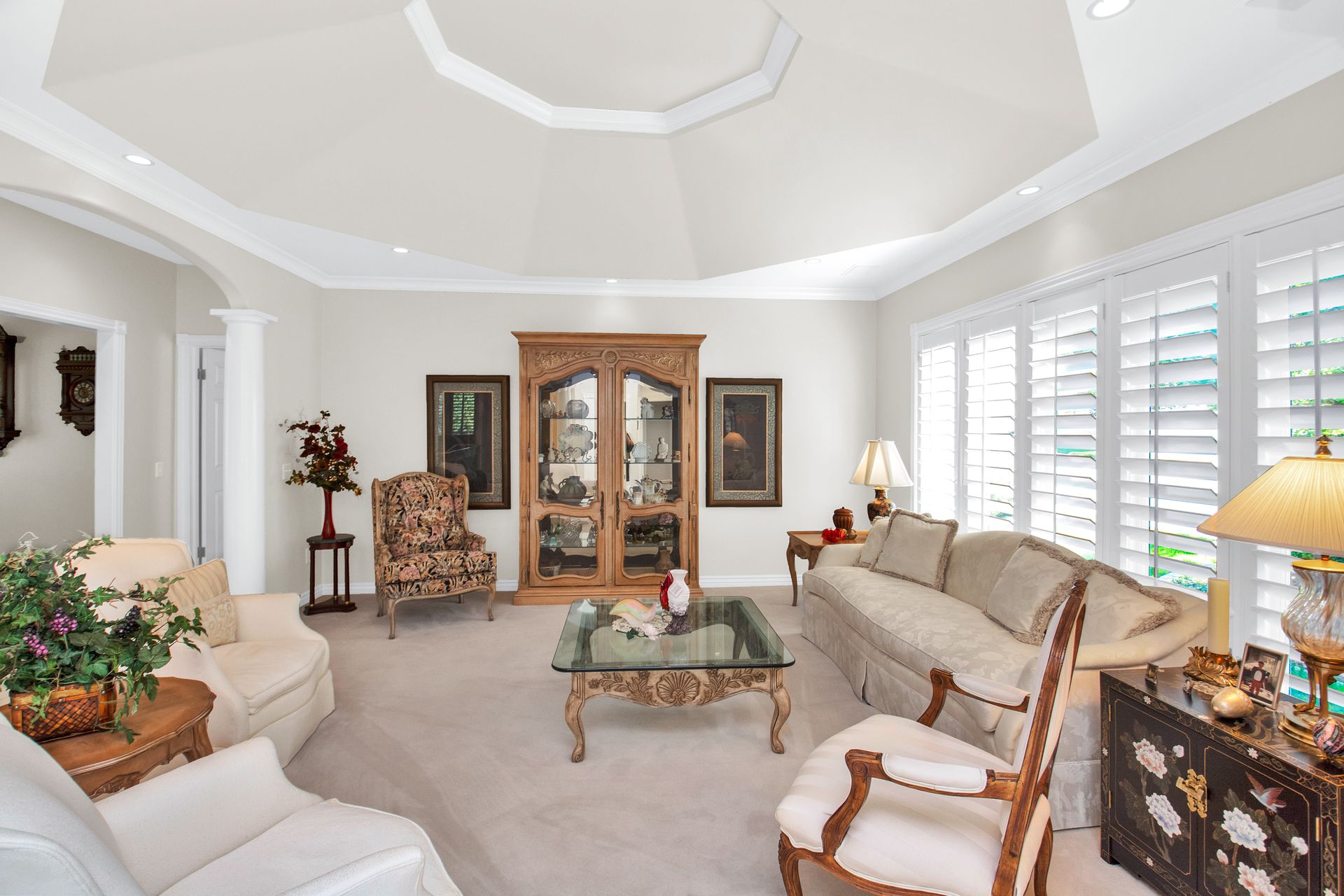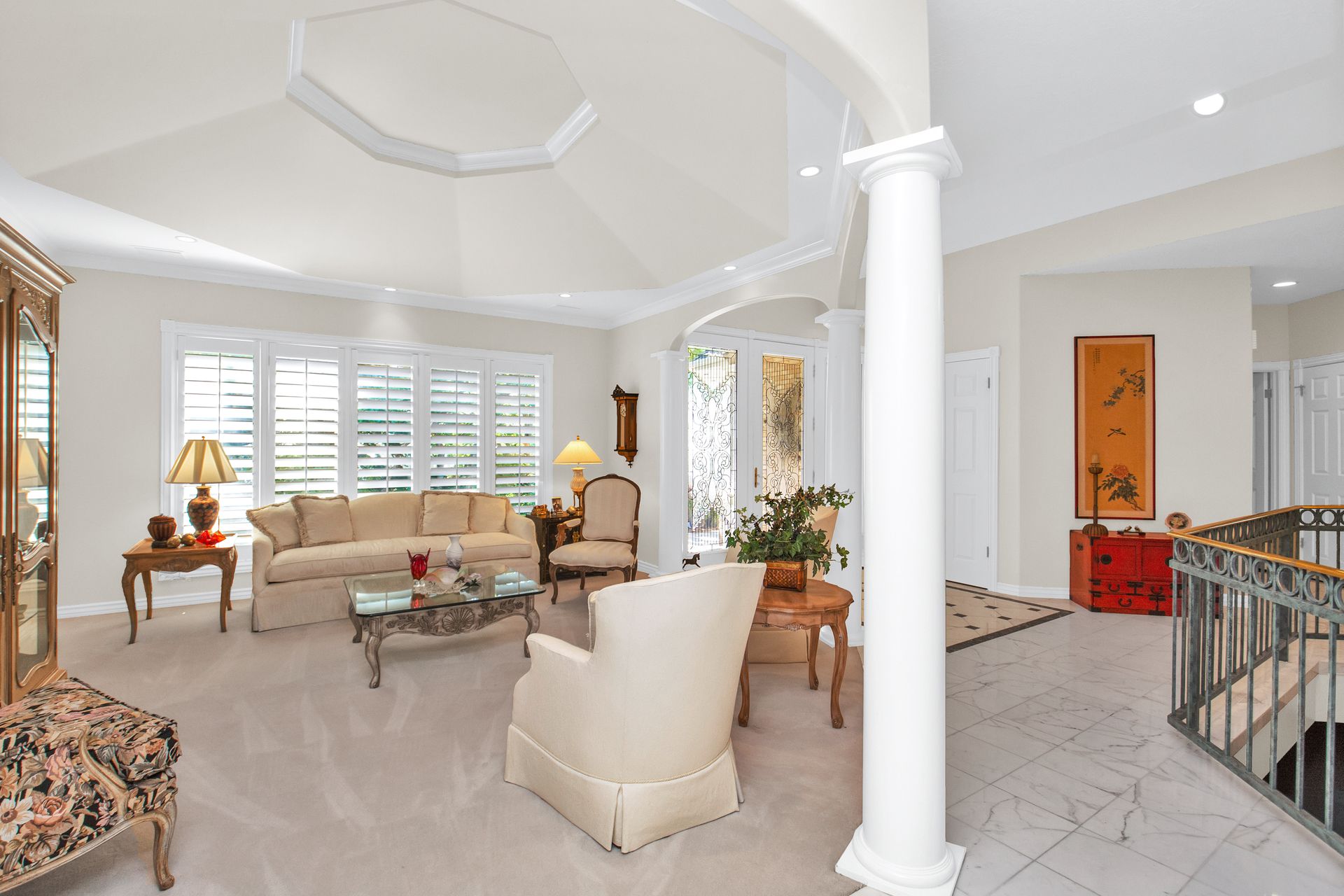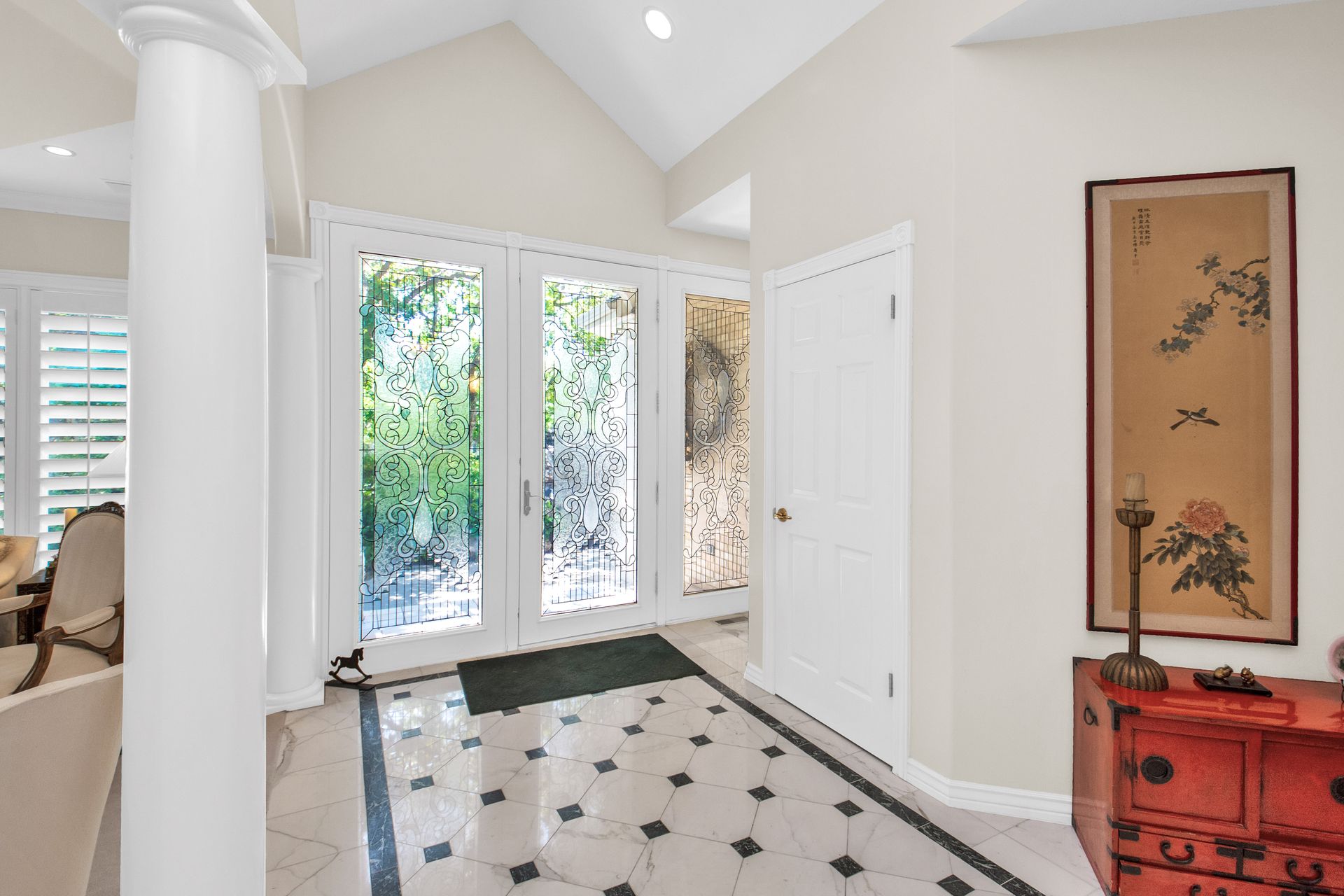 An elegant entry greets you through a lead glass door with matching side lights when you approach. Enter into a beautiful marble floor entry and take in the pillared formal living room with a spacious coffered ceiling. There are plantation shutter window coverings throughout. This home was appointed with the touch of a well-known interior decorator Kaylee Lott. An impressive kitchen with a vaulted ceiling, Corian countertop with an inset range, and unique cabinetry is located next to a breakfast nook and a cozy gathering room with a door that leads to a large deck that includes attached storage. Entertain guests with fine dining served in the comfy dining room. The primary suite is exquisite with the unique elevated ceiling, windows and an en-suite bathroom that has jetted tub and separate shower to enjoy. The lower level is well planned with two bedrooms, two bathrooms, a den, a wet bar and an extra room with a closet, bedroom size but does not have a window for egress or ingress. Come and see if this home feels right for you.