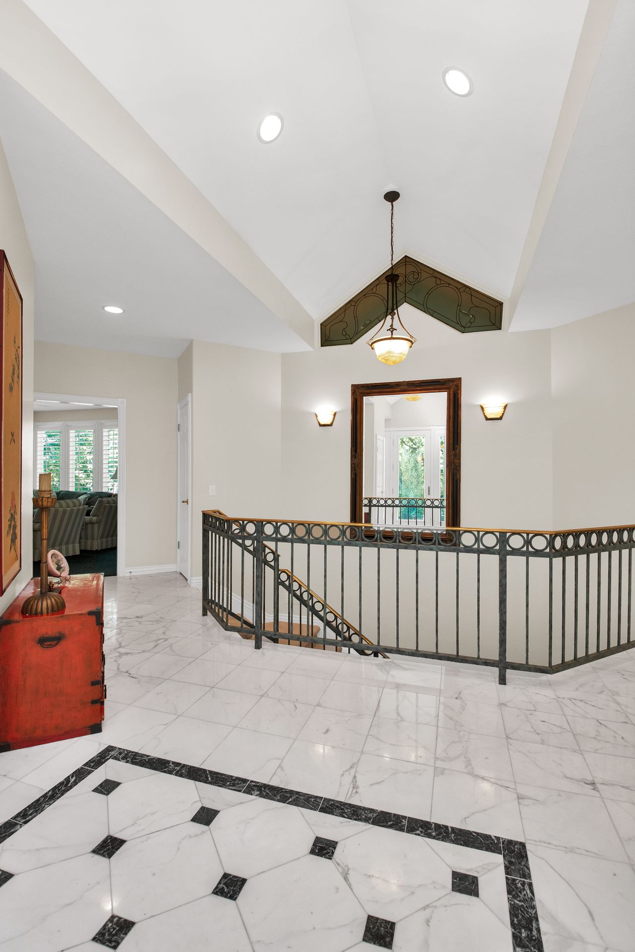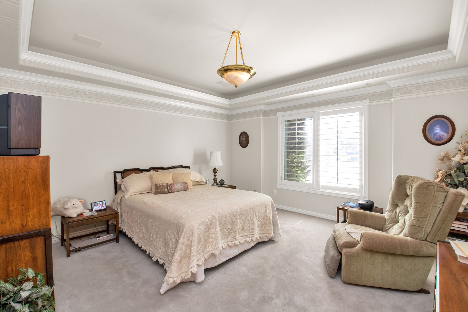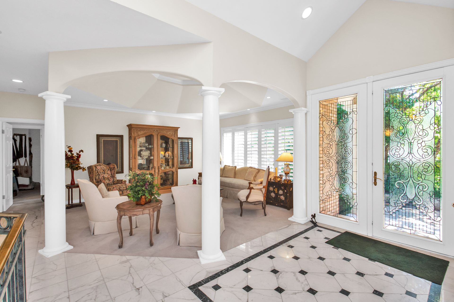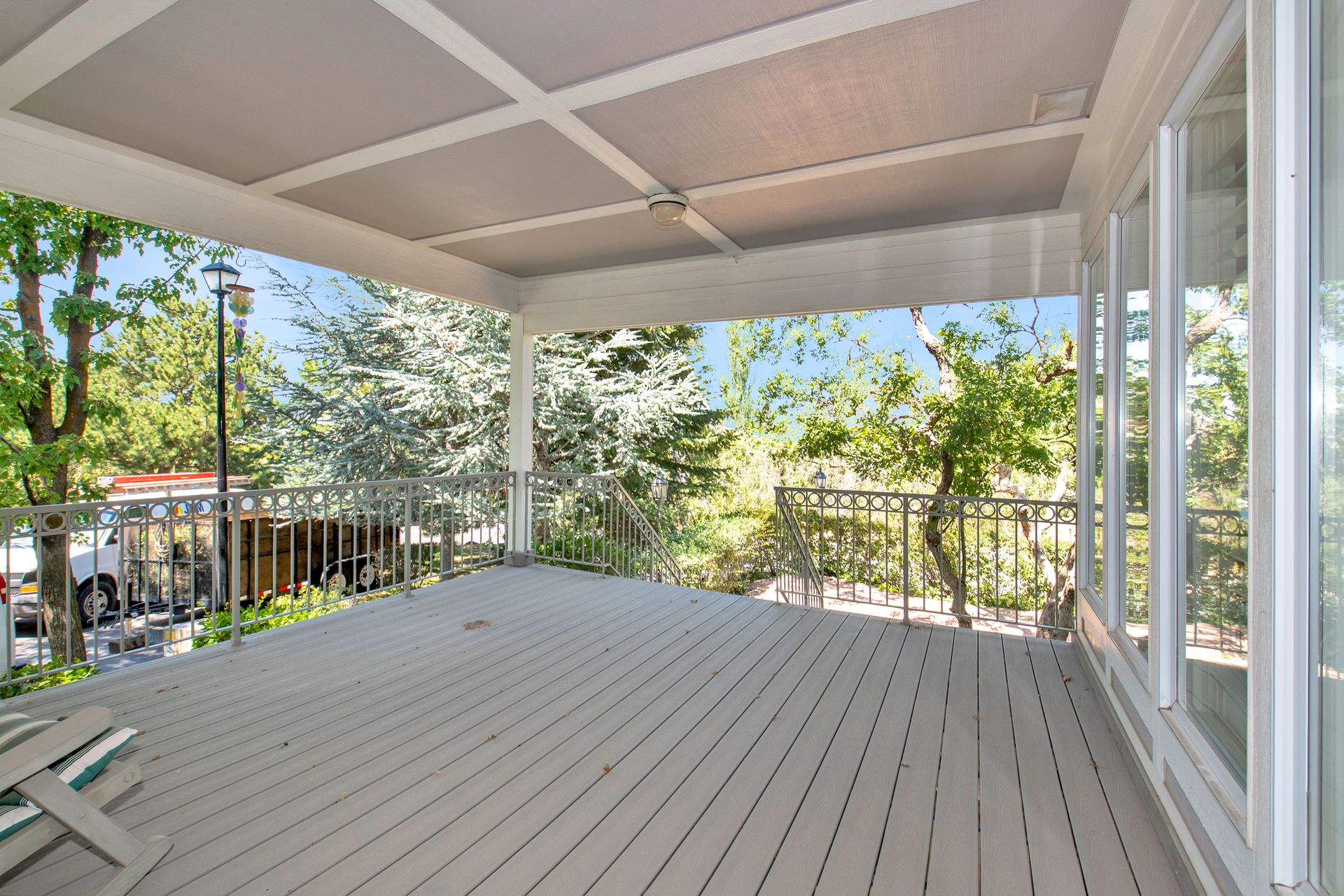 An elegant entry greets you through a lead glass door with matching side lights when you approach. Enter into a beautiful marble floor entry and take in the pillared formal living room with a spacious coffered ceiling. There are plantation shutter window coverings throughout. This home was appointed with the touch of a well-known interior decorator Kaylee Lott. An impressive kitchen with a vaulted ceiling, Corian countertop with an inset range, and unique cabinetry is located next to a breakfast nook and a cozy gathering room with a door that leads to a large deck that includes attached storage. Entertain guests with fine dining served in the comfy dining room. The primary suite is exquisite with the unique elevated ceiling, windows and an en-suite bathroom that has jetted tub and separate shower to enjoy. The lower level is well planned with two bedrooms, two bathrooms, a den, a wet bar and an extra room with a closet, bedroom size but does not have a window for egress or ingress. Come and see if this home feels right for you.