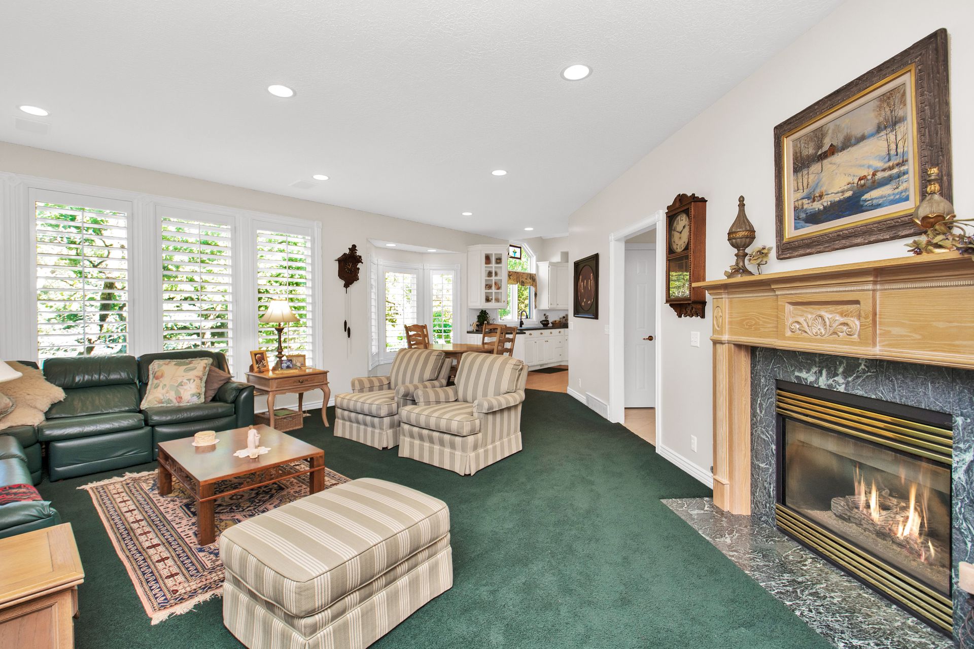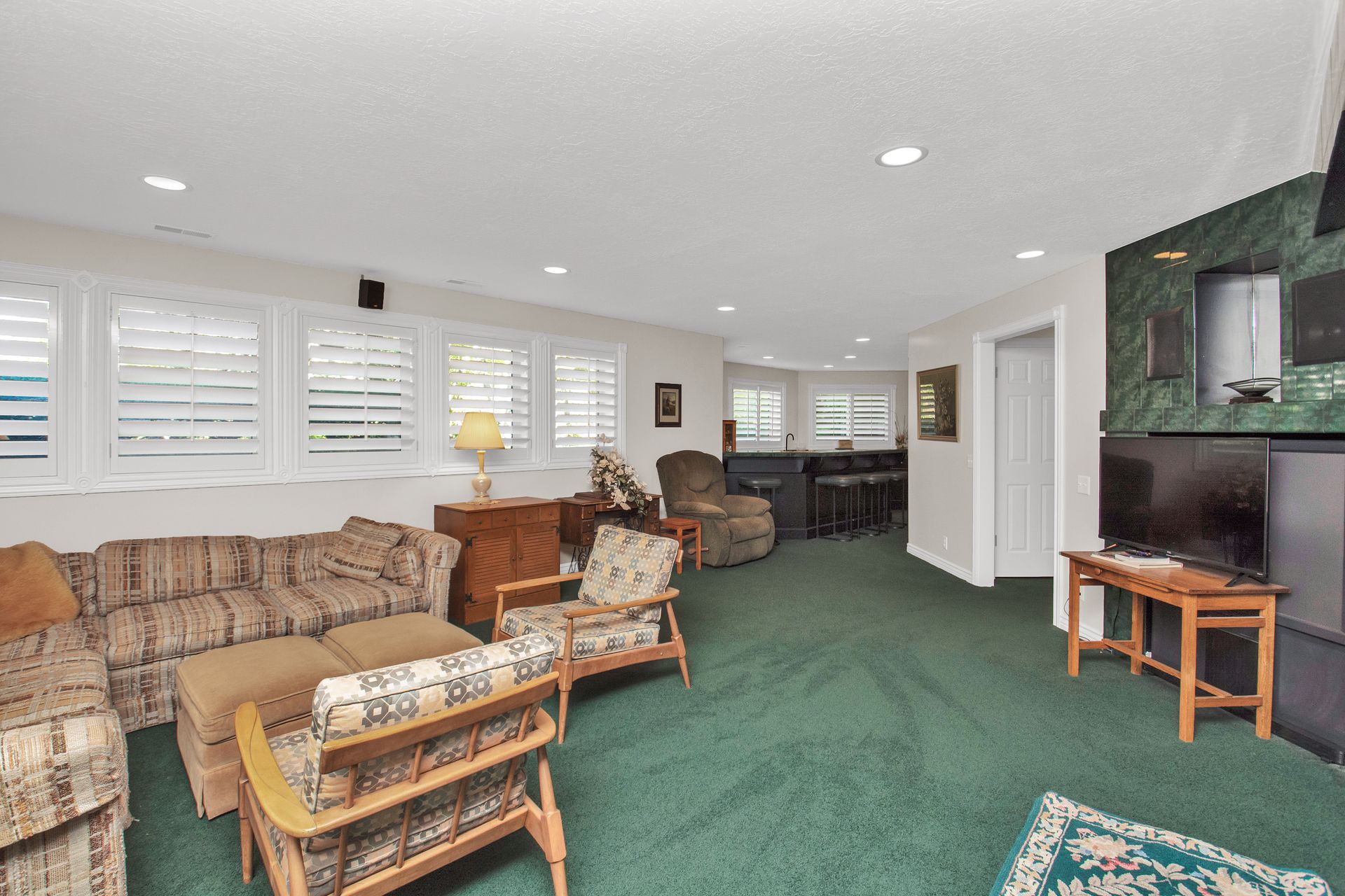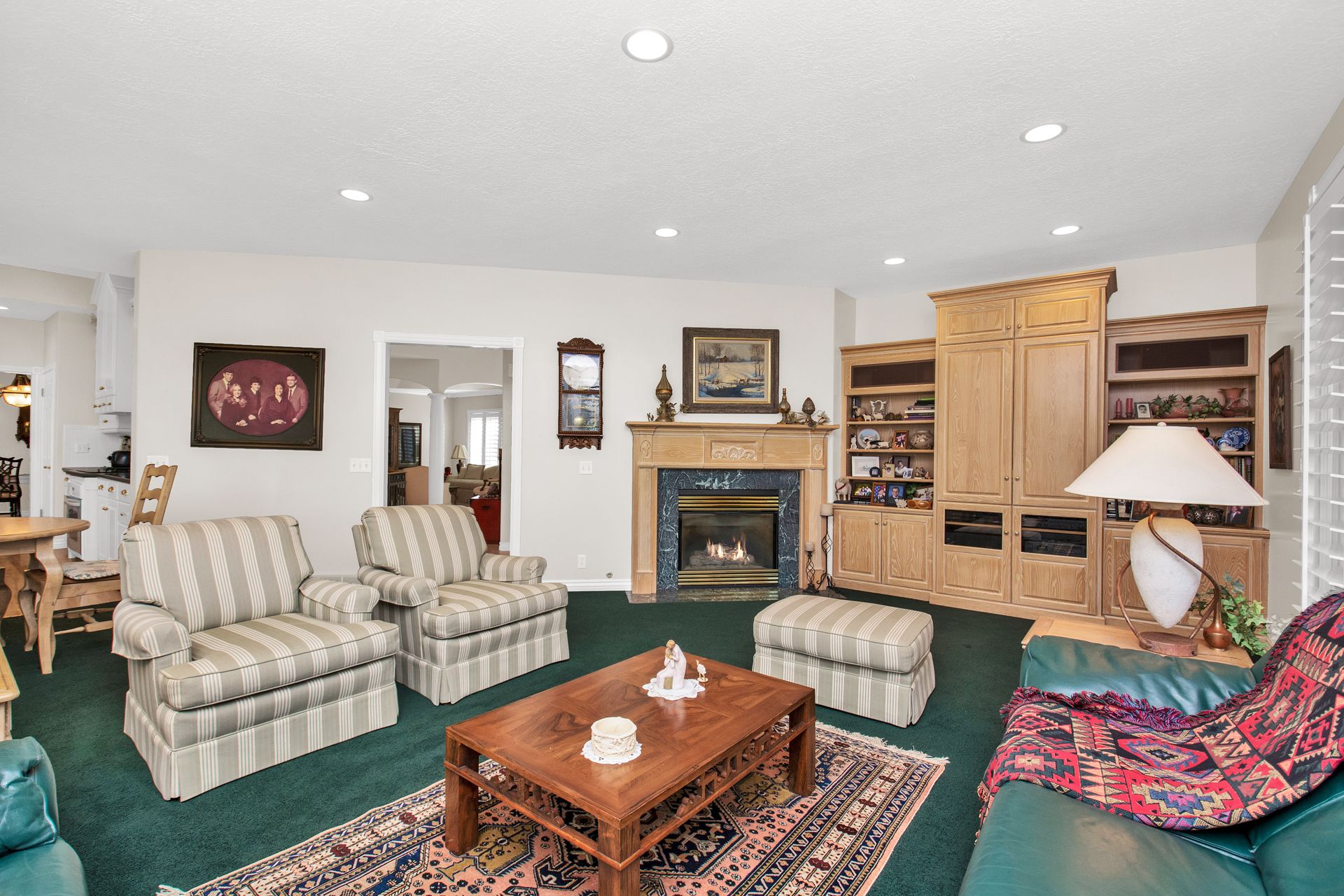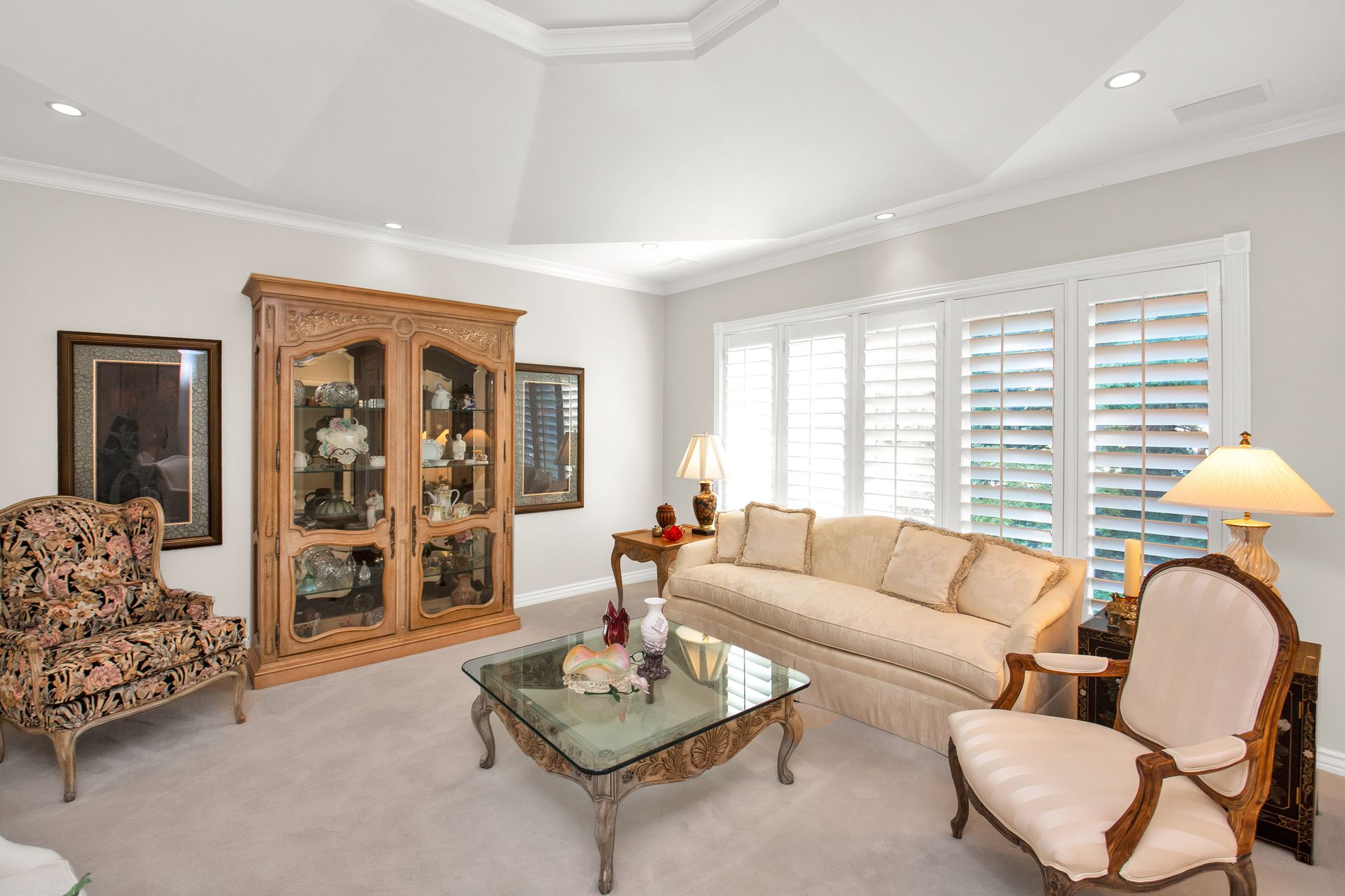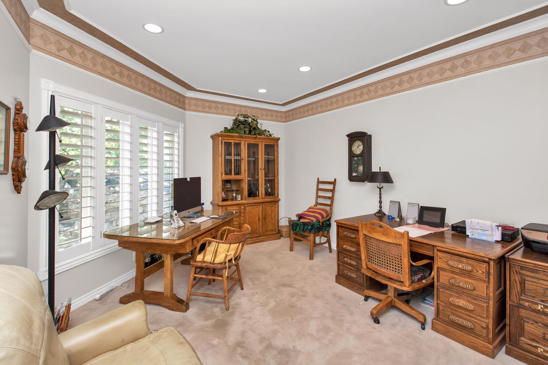 An elegant entry greets you through a lead glass door with matching side lights when you approach. Enter into a beautiful marble floor entry and take in the pillared formal living room with a spacious coffered ceiling. There are plantation shutter window coverings throughout. This home was appointed with the touch of a well-known interior decorator Kaylee Lott. An impressive kitchen with a vaulted ceiling, Corian countertop with an inset range, and unique cabinetry is located next to a breakfast nook and a cozy gathering room with a door that leads to a large deck that includes attached storage. Entertain guests with fine dining served in the comfy dining room. The primary suite is exquisite with the unique elevated ceiling, windows and an en-suite bathroom that has jetted tub and separate shower to enjoy. The lower level is well planned with two bedrooms, two bathrooms, a den, a wet bar and an extra room with a closet, bedroom size but does not have a window for egress or ingress. Come and see if this home feels right for you.
