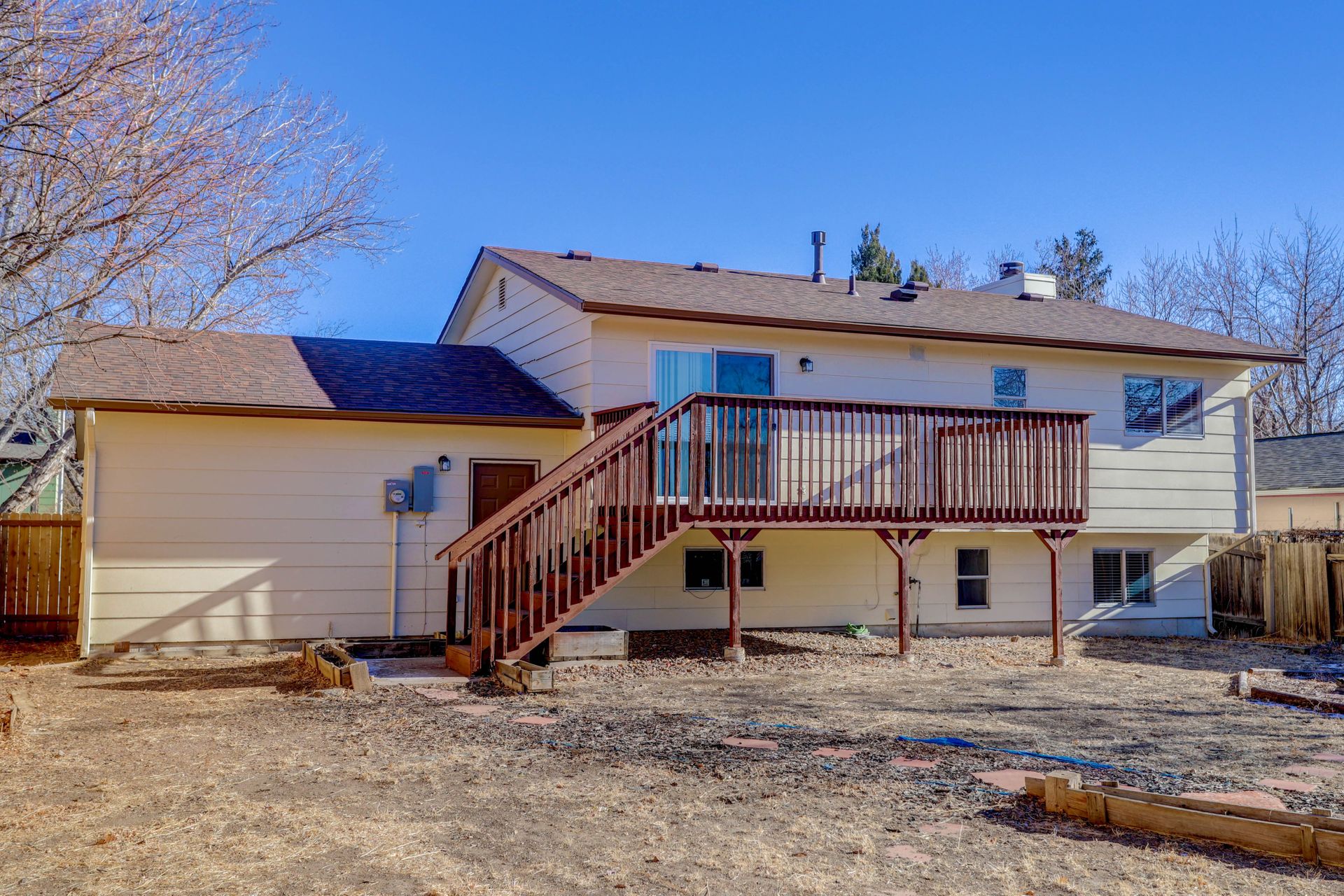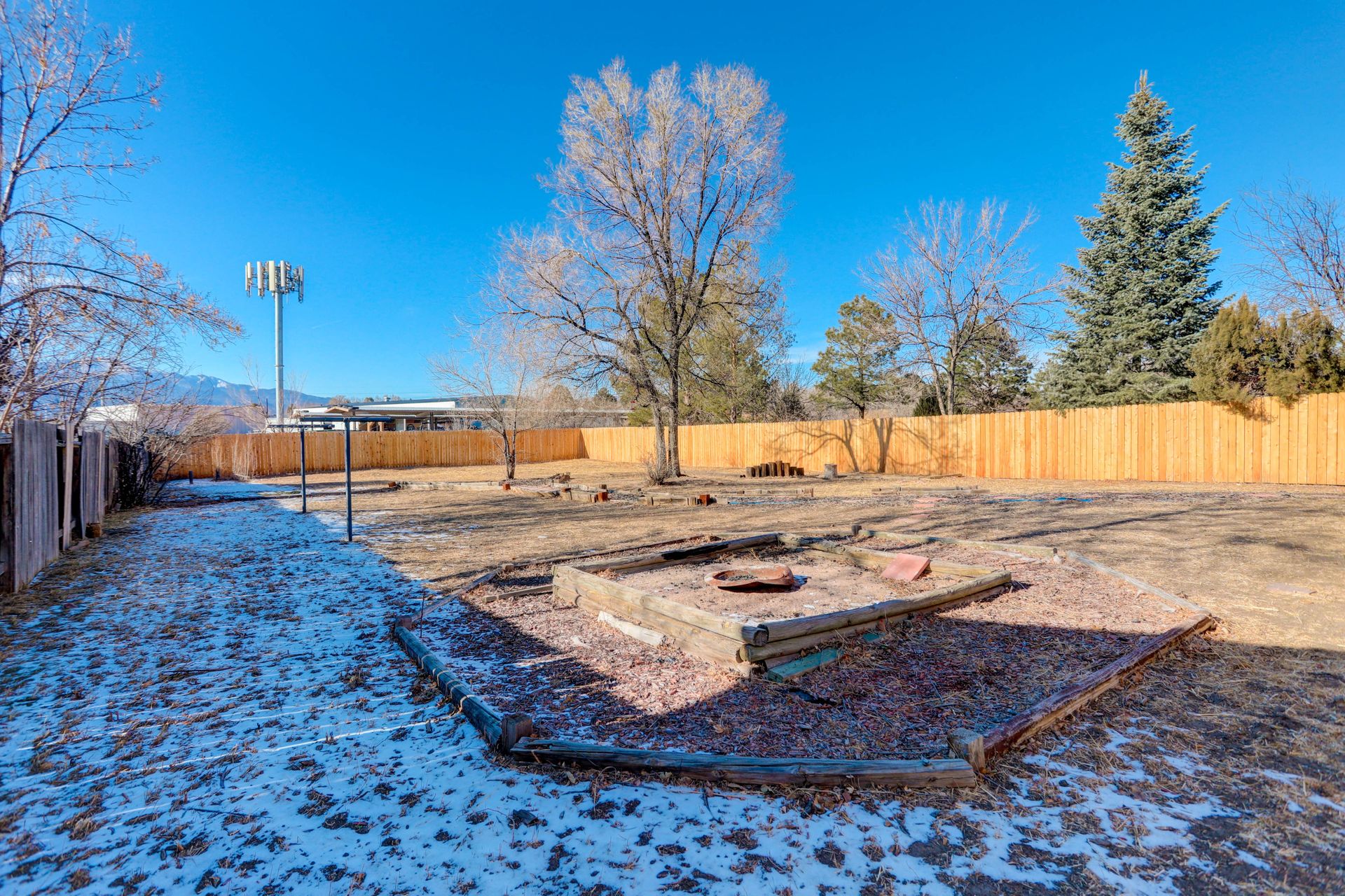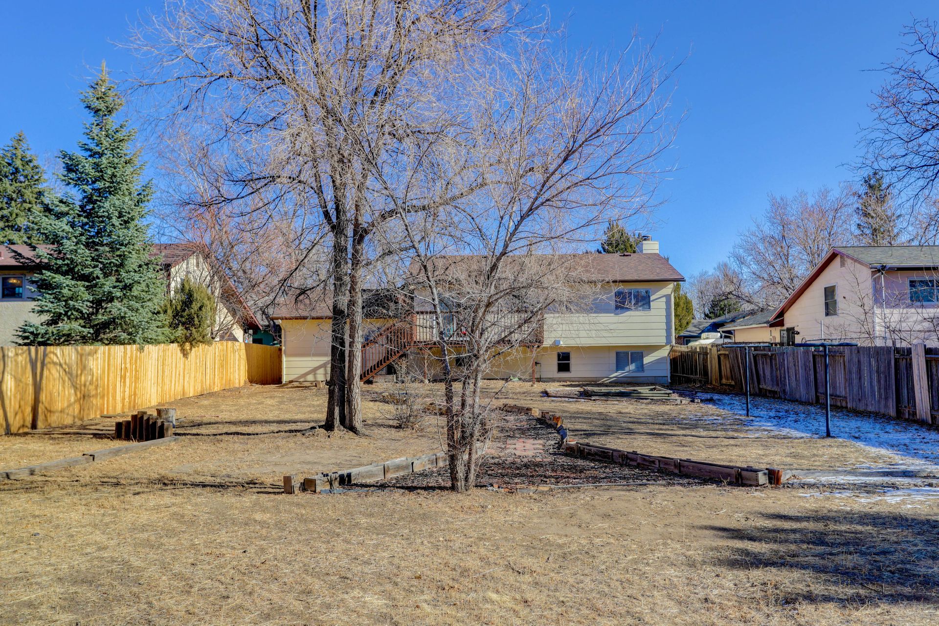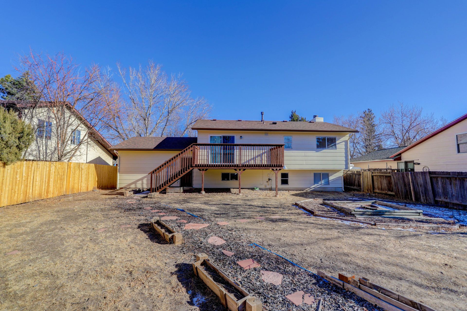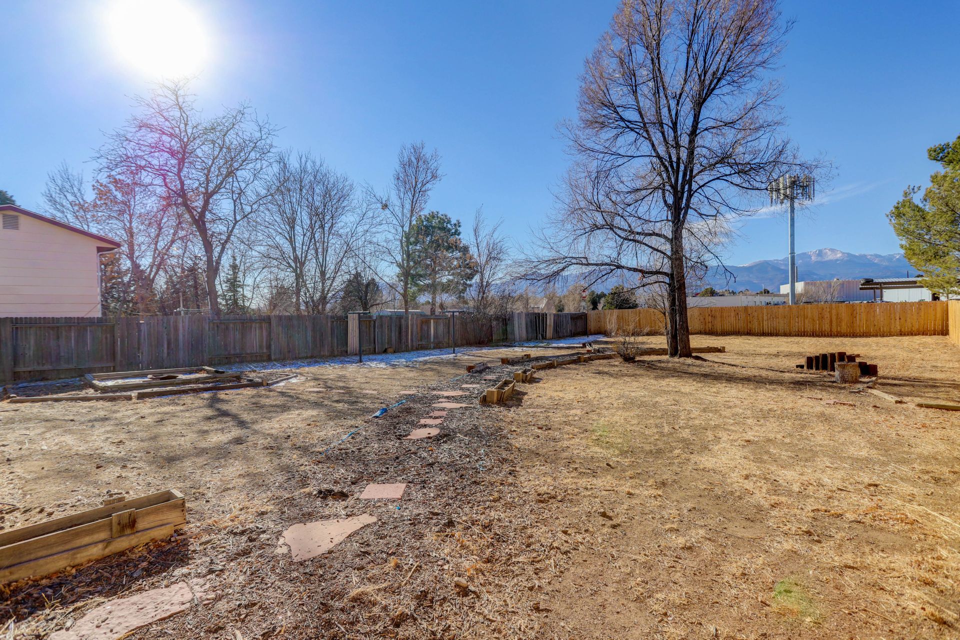This bright, sunny home is just south of Rock Island Trail and has LVP flooring, quality carpet, 6-panel doors throughout and features...living room with vaulted ceilings...open concept kitchen with single-basin SS sink, quartz counters, subway tile backsplash and ample counter space...spacious dining area that walks out to the 10x14 deck with mountain views...primary bedroom with Pikes Peak views, large closet and access to the full hall bath...and 10x12 2nd bedroom that overlooks the front yard. The lower level features the well-lit 13x25 family room with full wall wood-burning fireplace...sunny 3rd bedroom...3/4 bath with linen shelving...and large laundry/mech/storage room. Outside imagine the possibilities in the HUGE, fenced backyard. In its heyday, there was a firepit area perfectly positioned to take in the Pikes Peak views, paver pathway lined with planter boxes to the west half of the yard and garden area, and plenty of room left over for play structures. The mature trees on and adjacent to the property offer privacy and shade. Walking distance to the top-performing K-12 Thomas MacLaren school, and easy driving access to the restaurants, retail and shopping on Academy and Powers.