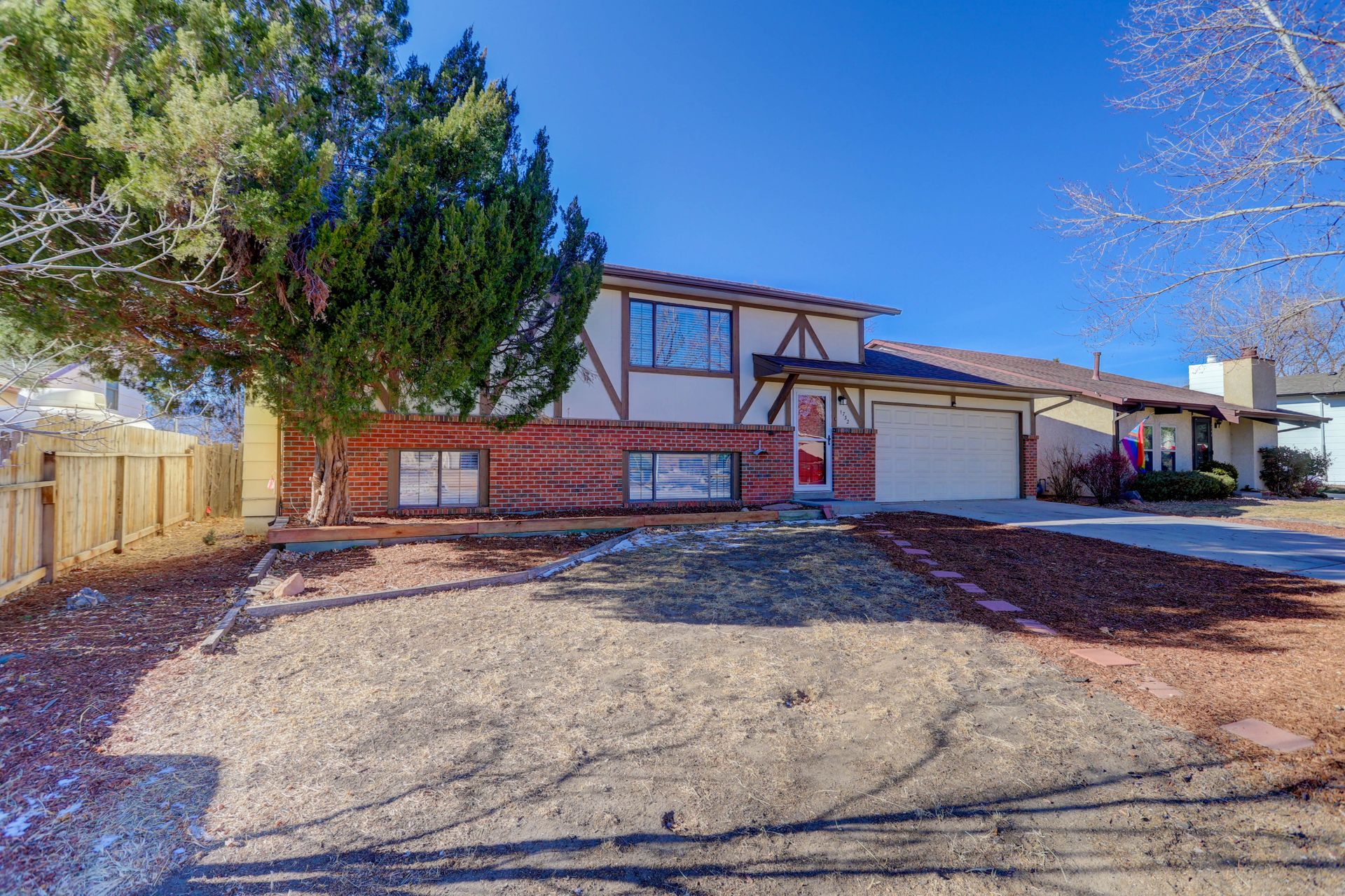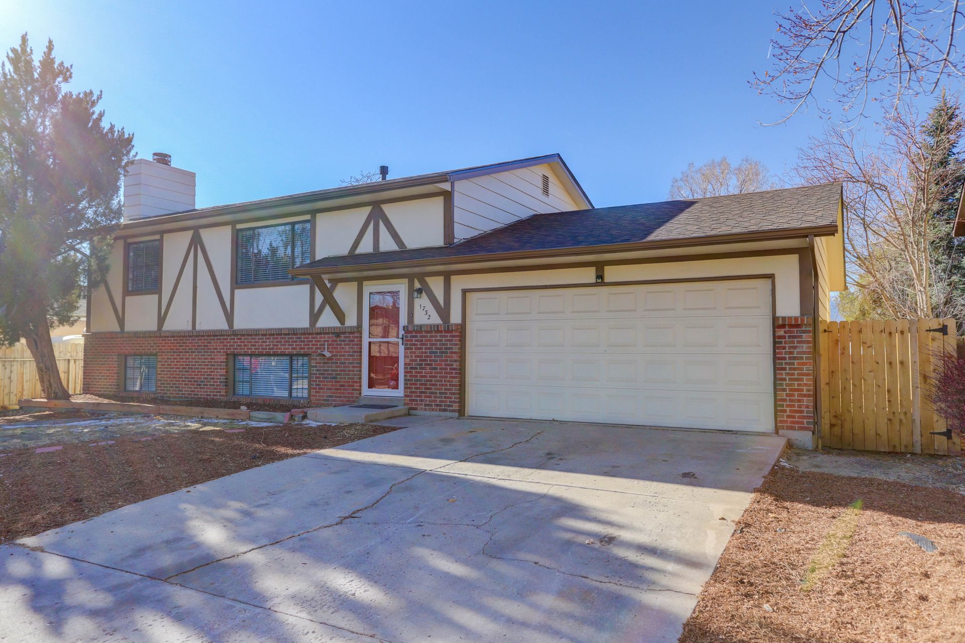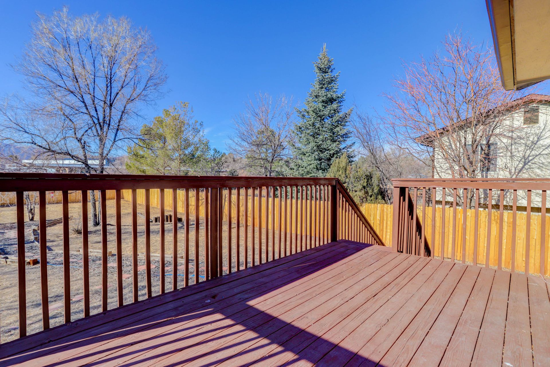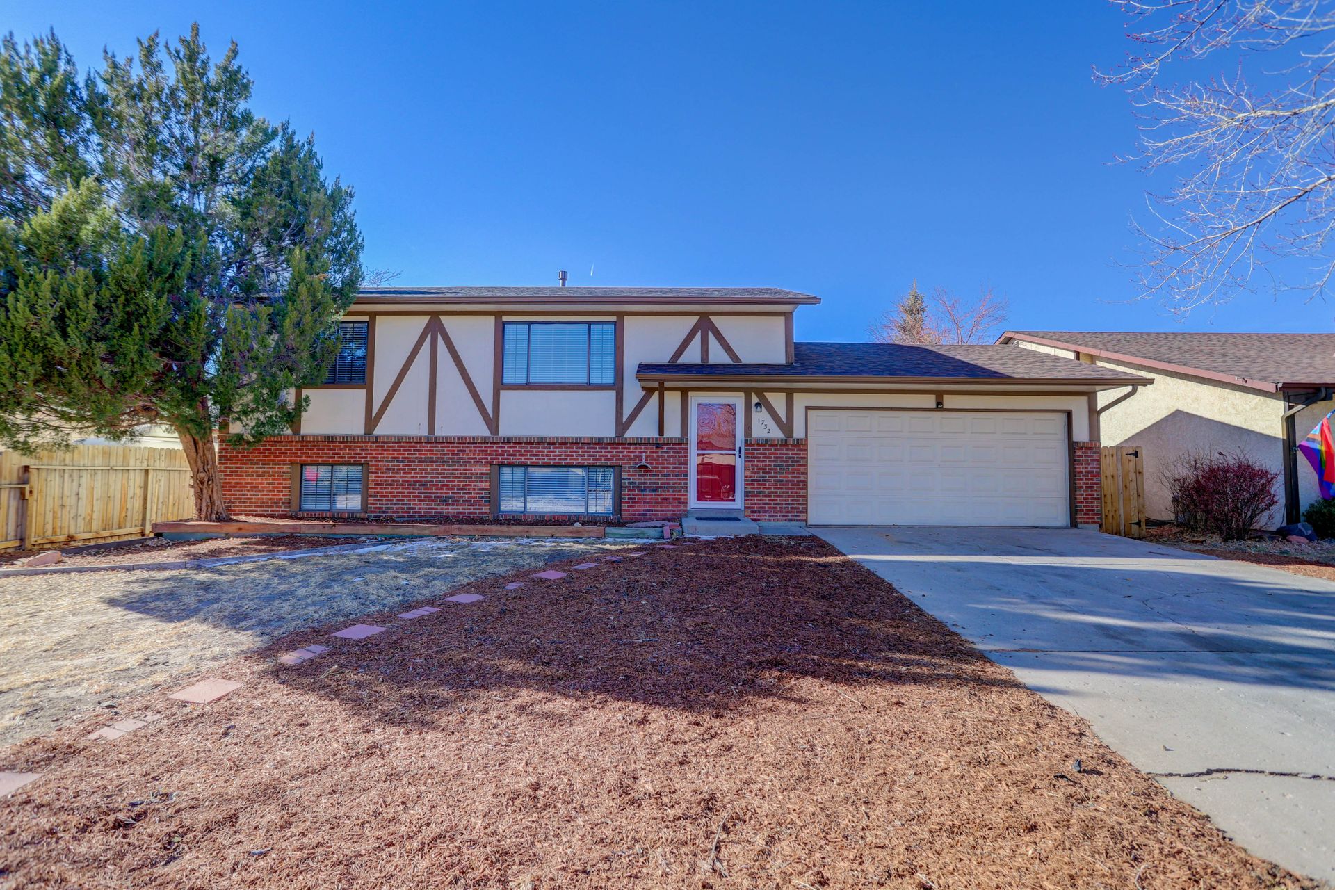 This bright, sunny home is just south of Rock Island Trail and has LVP flooring, quality carpet, 6-panel doors throughout and features...living room with vaulted ceilings...open concept kitchen with single-basin SS sink, quartz counters, subway tile backsplash and ample counter space...spacious dining area that walks out to the 10x14 deck with mountain views...primary bedroom with Pikes Peak views, large closet and access to the full hall bath...and 10x12 2nd bedroom that overlooks the front yard. The lower level features the well-lit 13x25 family room with full wall wood-burning fireplace...sunny 3rd bedroom...3/4 bath with linen shelving...and large laundry/mech/storage room. Outside imagine the possibilities in the HUGE, fenced backyard. In its heyday, there was a firepit area perfectly positioned to take in the Pikes Peak views, paver pathway lined with planter boxes to the west half of the yard and garden area, and plenty of room left over for play structures. The mature trees on and adjacent to the property offer privacy and shade. Walking distance to the top-performing K-12 Thomas MacLaren school, and easy driving access to the restaurants, retail and shopping on Academy and Powers.