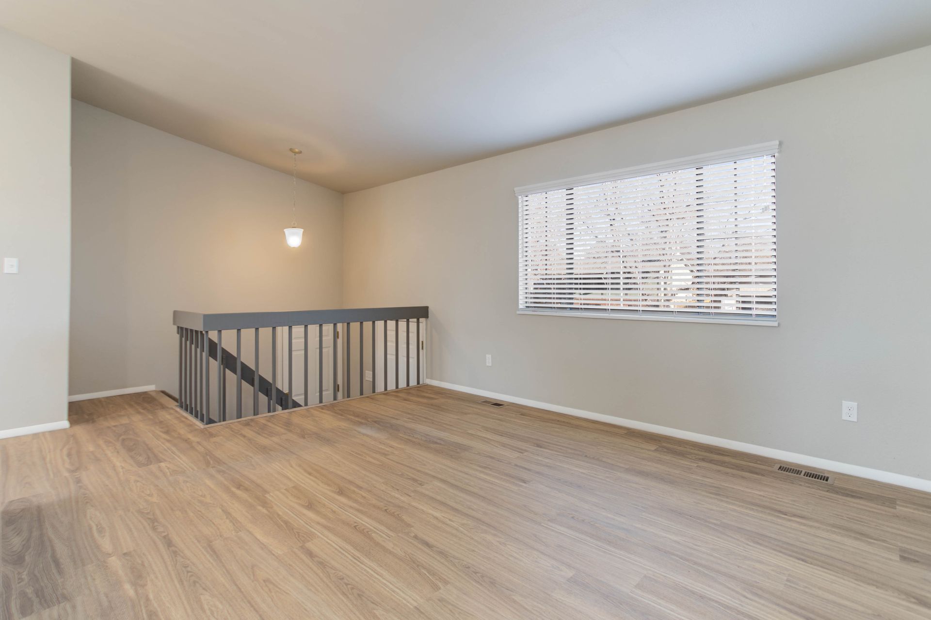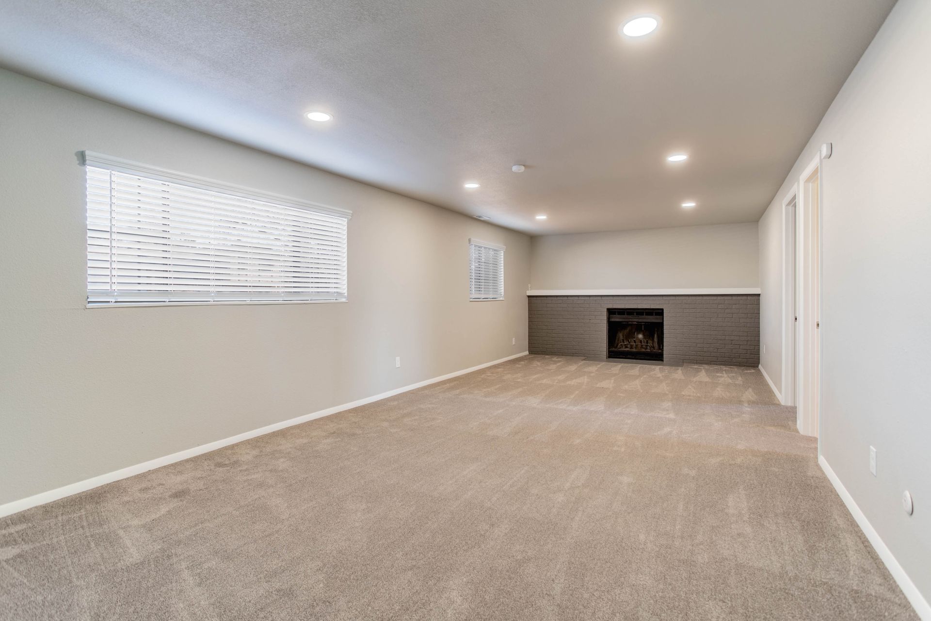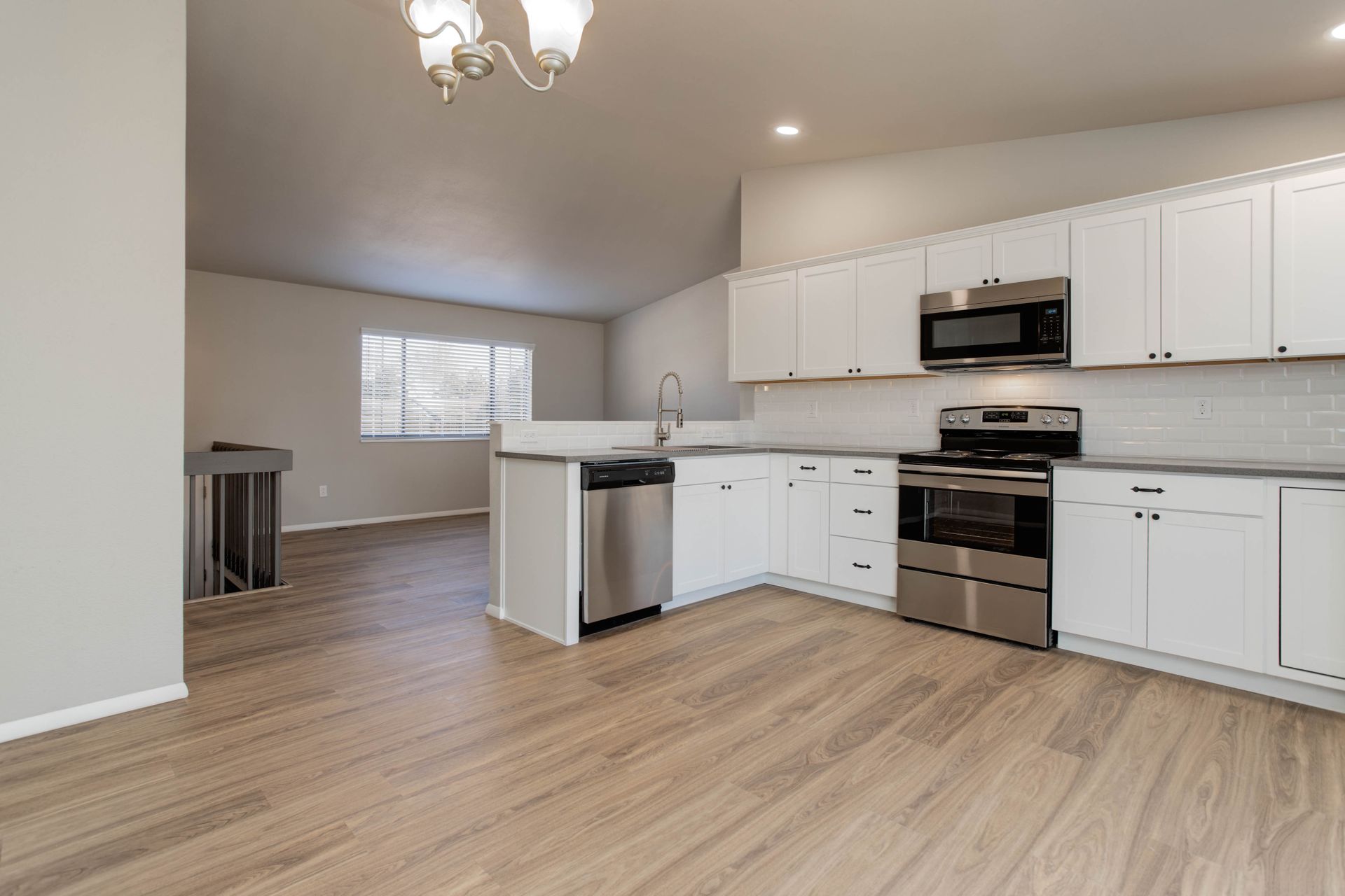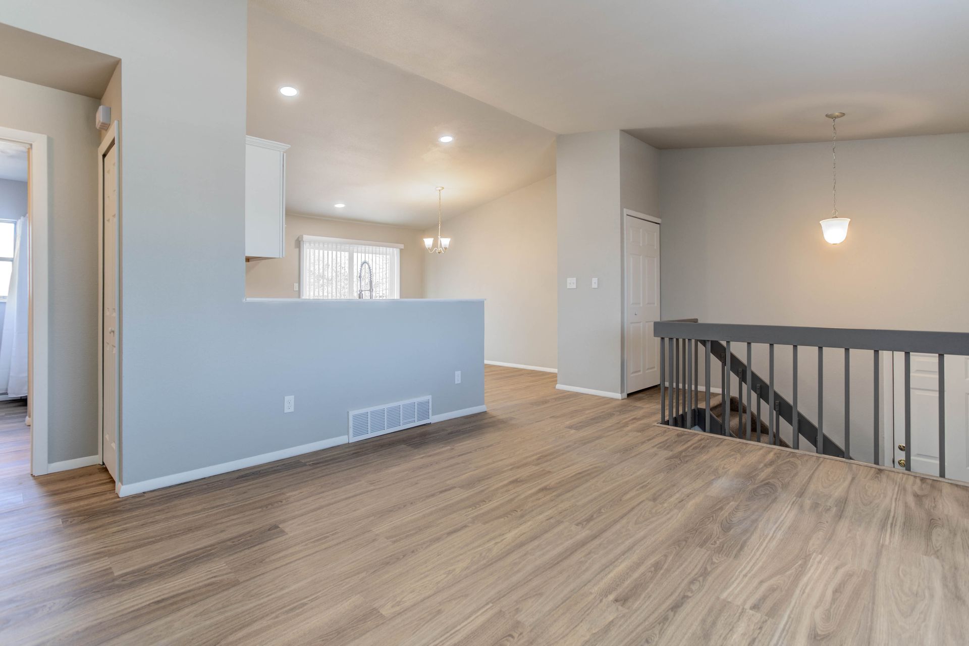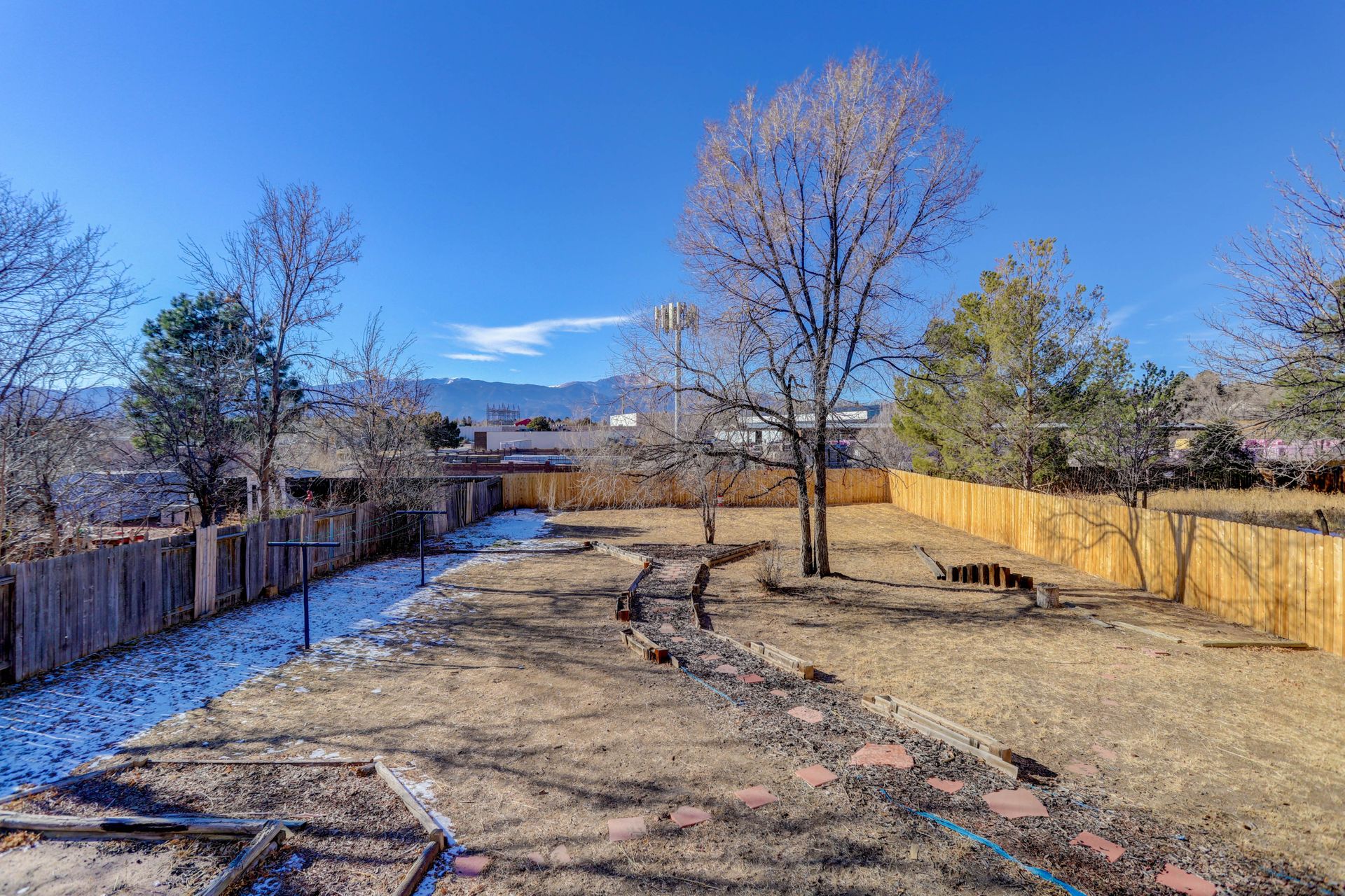 This bright, sunny home is just south of Rock Island Trail and has LVP flooring, quality carpet, 6-panel doors throughout and features...living room with vaulted ceilings...open concept kitchen with single-basin SS sink, quartz counters, subway tile backsplash and ample counter space...spacious dining area that walks out to the 10x14 deck with mountain views...primary bedroom with Pikes Peak views, large closet and access to the full hall bath...and 10x12 2nd bedroom that overlooks the front yard. The lower level features the well-lit 13x25 family room with full wall wood-burning fireplace...sunny 3rd bedroom...3/4 bath with linen shelving...and large laundry/mech/storage room. Outside imagine the possibilities in the HUGE, fenced backyard. In its heyday, there was a firepit area perfectly positioned to take in the Pikes Peak views, paver pathway lined with planter boxes to the west half of the yard and garden area, and plenty of room left over for play structures. The mature trees on and adjacent to the property offer privacy and shade. Walking distance to the top-performing K-12 Thomas MacLaren school, and easy driving access to the restaurants, retail and shopping on Academy and Powers.