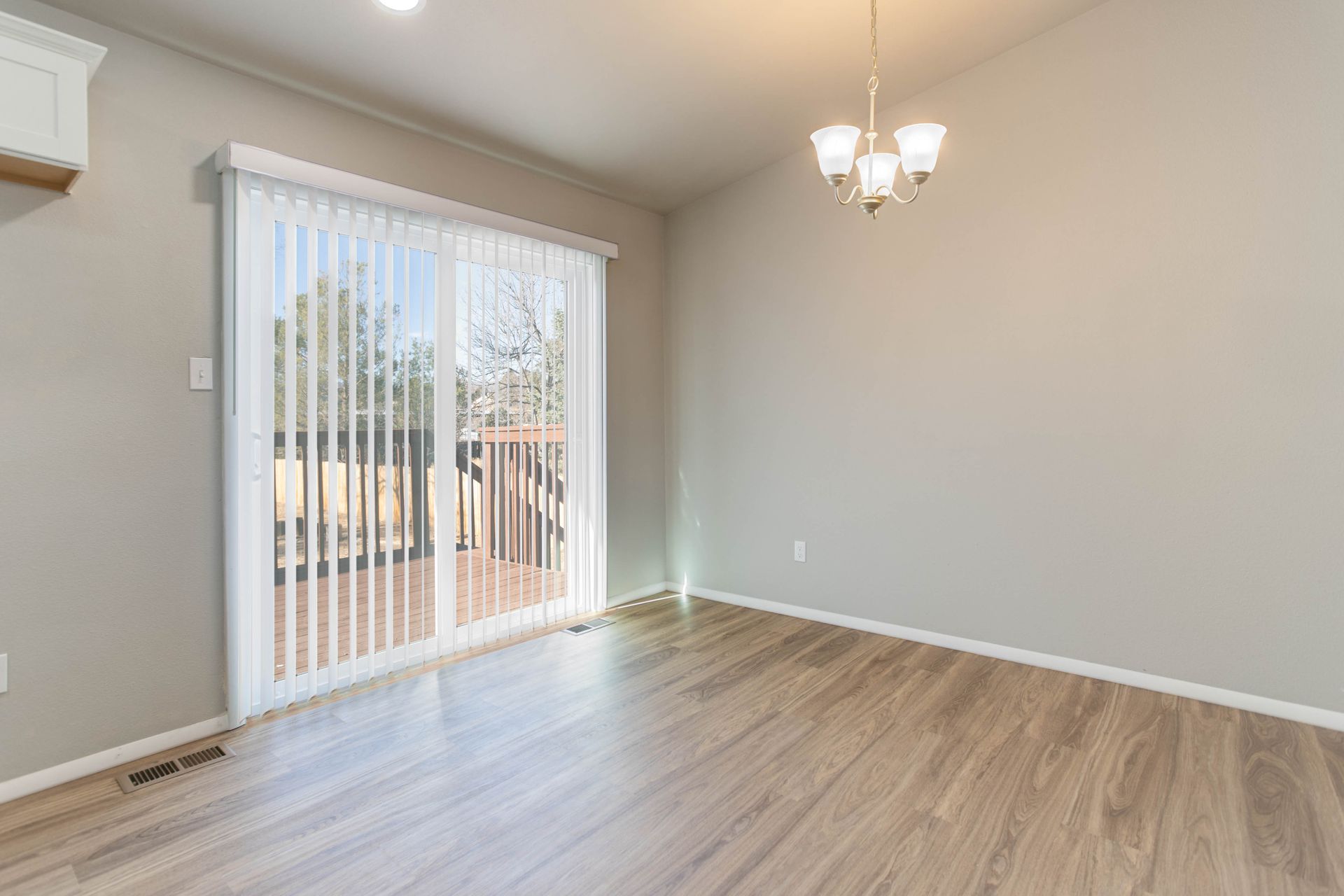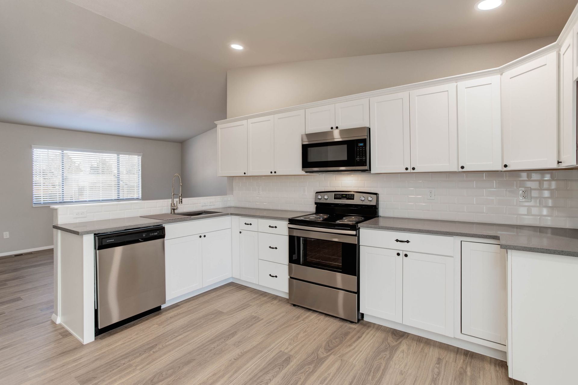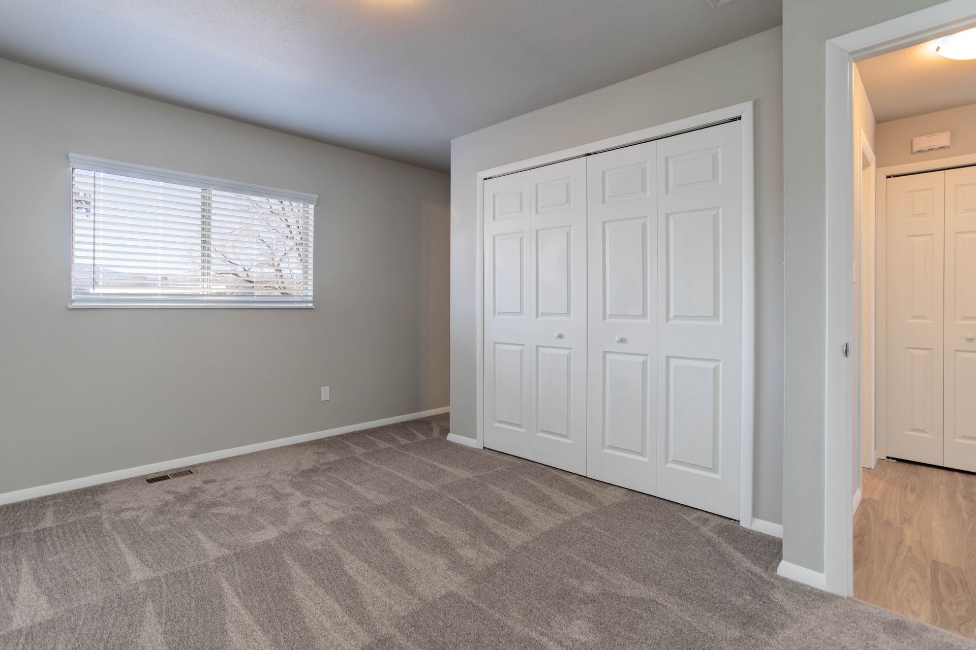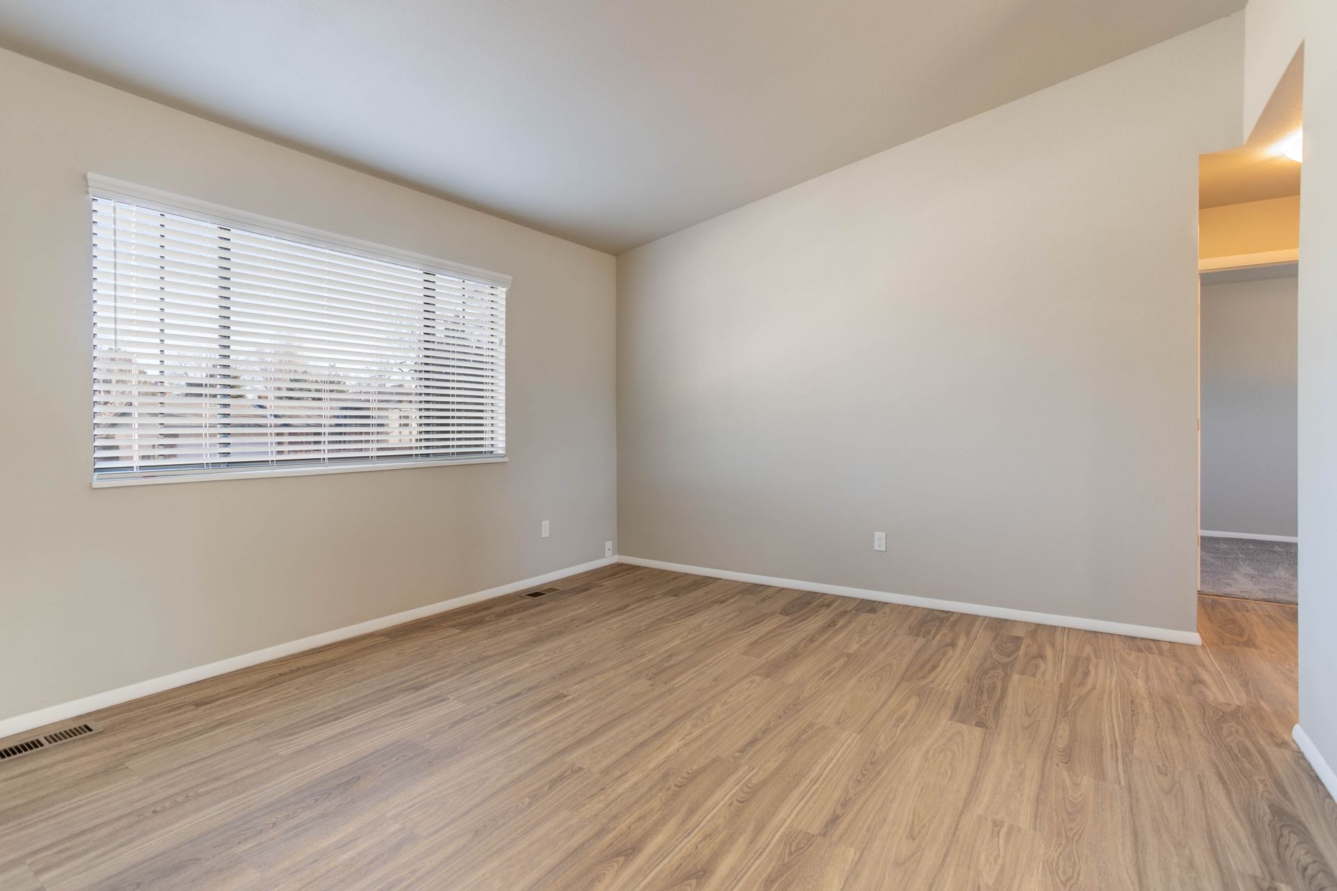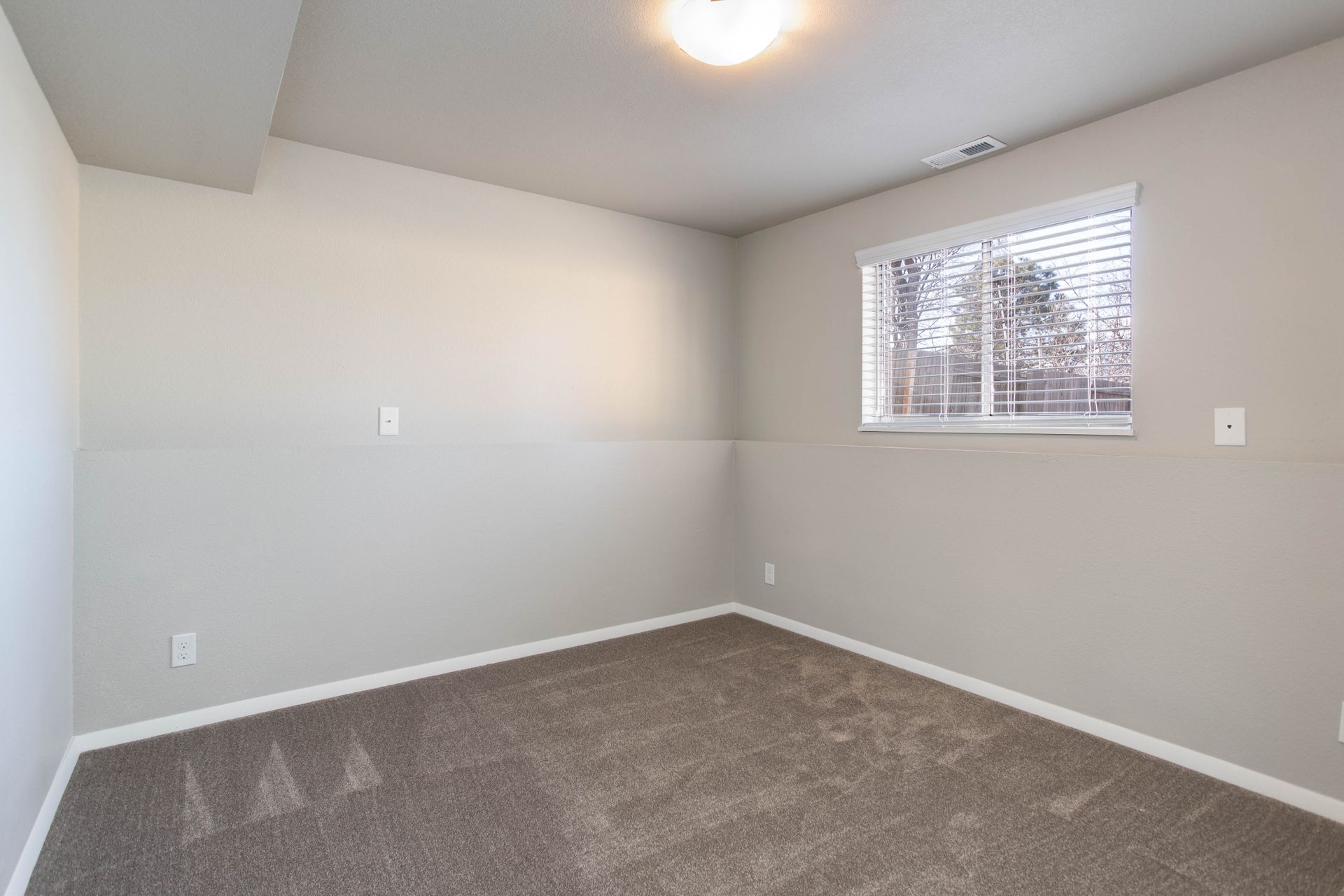 This bright, sunny home is just south of Rock Island Trail and has LVP flooring, quality carpet, 6-panel doors throughout and features...living room with vaulted ceilings...open concept kitchen with single-basin SS sink, quartz counters, subway tile backsplash and ample counter space...spacious dining area that walks out to the 10x14 deck with mountain views...primary bedroom with Pikes Peak views, large closet and access to the full hall bath...and 10x12 2nd bedroom that overlooks the front yard. The lower level features the well-lit 13x25 family room with full wall wood-burning fireplace...sunny 3rd bedroom...3/4 bath with linen shelving...and large laundry/mech/storage room. Outside imagine the possibilities in the HUGE, fenced backyard. In its heyday, there was a firepit area perfectly positioned to take in the Pikes Peak views, paver pathway lined with planter boxes to the west half of the yard and garden area, and plenty of room left over for play structures. The mature trees on and adjacent to the property offer privacy and shade. Walking distance to the top-performing K-12 Thomas MacLaren school, and easy driving access to the restaurants, retail and shopping on Academy and Powers.
