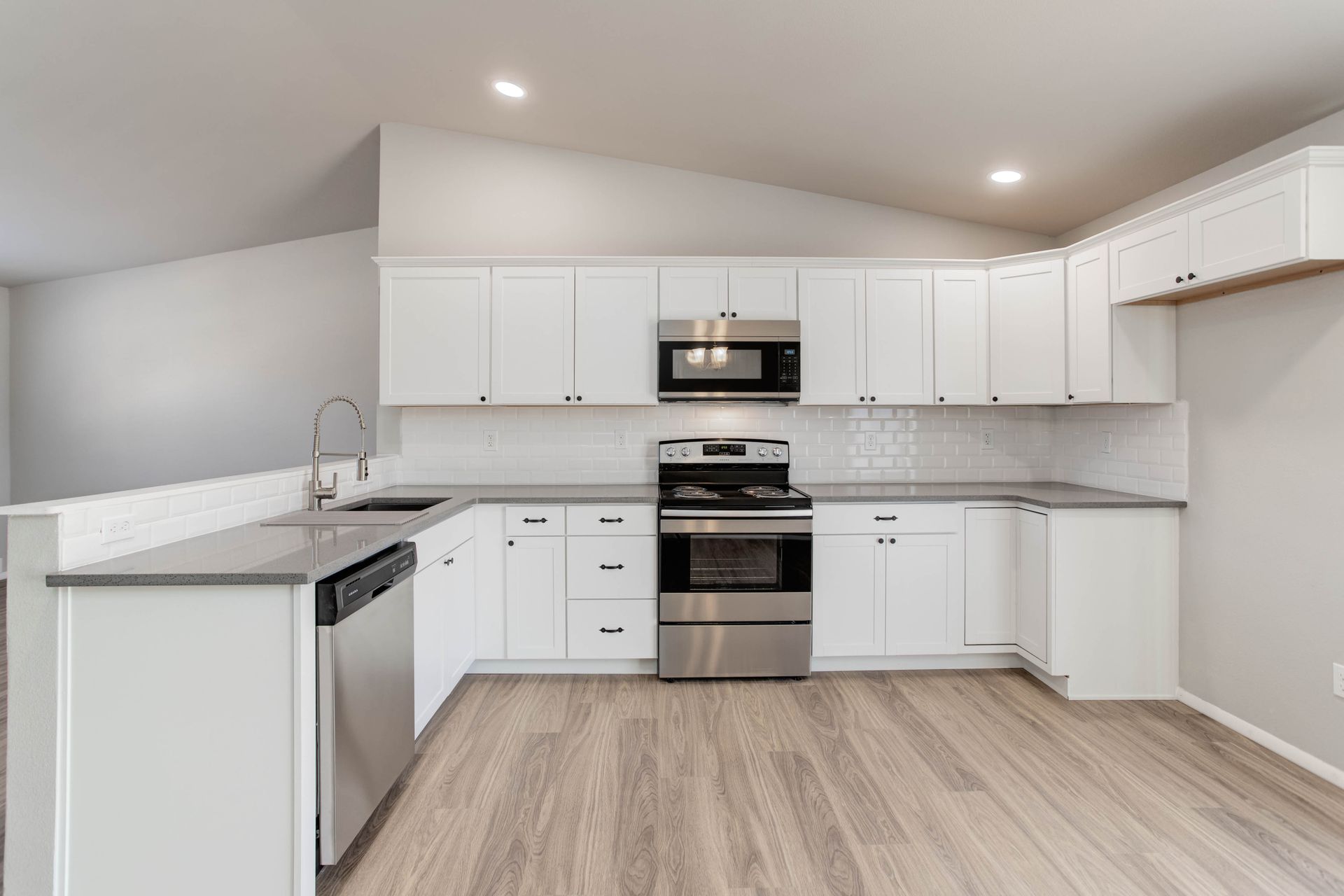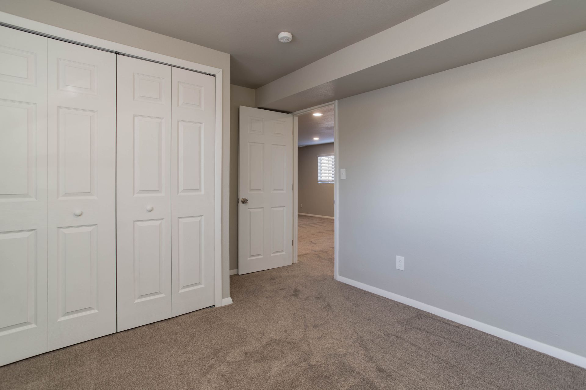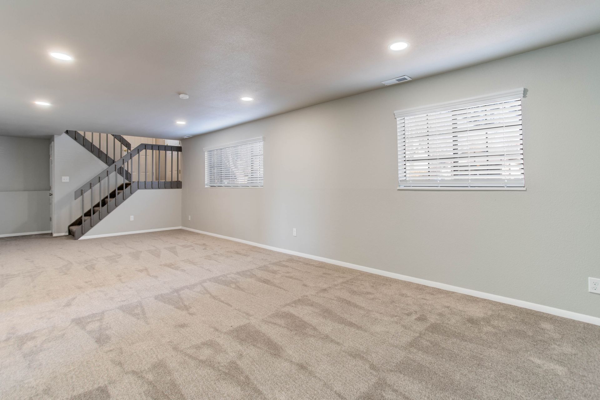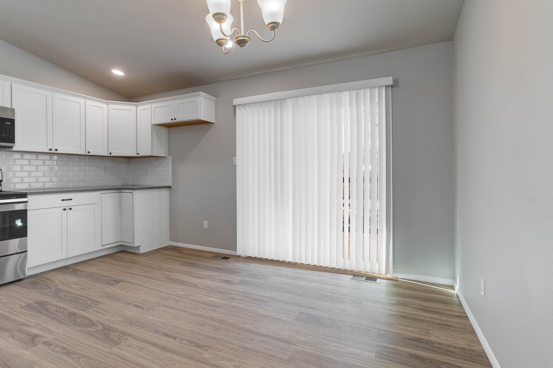 This bright, sunny home is just south of Rock Island Trail and has LVP flooring, quality carpet, 6-panel doors throughout and features...living room with vaulted ceilings...open concept kitchen with single-basin SS sink, quartz counters, subway tile backsplash and ample counter space...spacious dining area that walks out to the 10x14 deck with mountain views...primary bedroom with Pikes Peak views, large closet and access to the full hall bath...and 10x12 2nd bedroom that overlooks the front yard. The lower level features the well-lit 13x25 family room with full wall wood-burning fireplace...sunny 3rd bedroom...3/4 bath with linen shelving...and large laundry/mech/storage room. Outside imagine the possibilities in the HUGE, fenced backyard. In its heyday, there was a firepit area perfectly positioned to take in the Pikes Peak views, paver pathway lined with planter boxes to the west half of the yard and garden area, and plenty of room left over for play structures. The mature trees on and adjacent to the property offer privacy and shade. Walking distance to the top-performing K-12 Thomas MacLaren school, and easy driving access to the restaurants, retail and shopping on Academy and Powers.