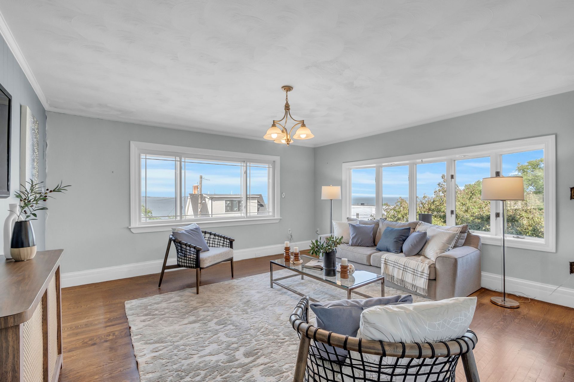 The ground floor unit features 2 bedrooms, 1 bath, a cozy fireplace, and a newly renovated kitchen. The top floor unit offers 3 bedrooms, 1 bath, high ceilings, and gleaming hardwood floors, all framed by spectacular ocean views.