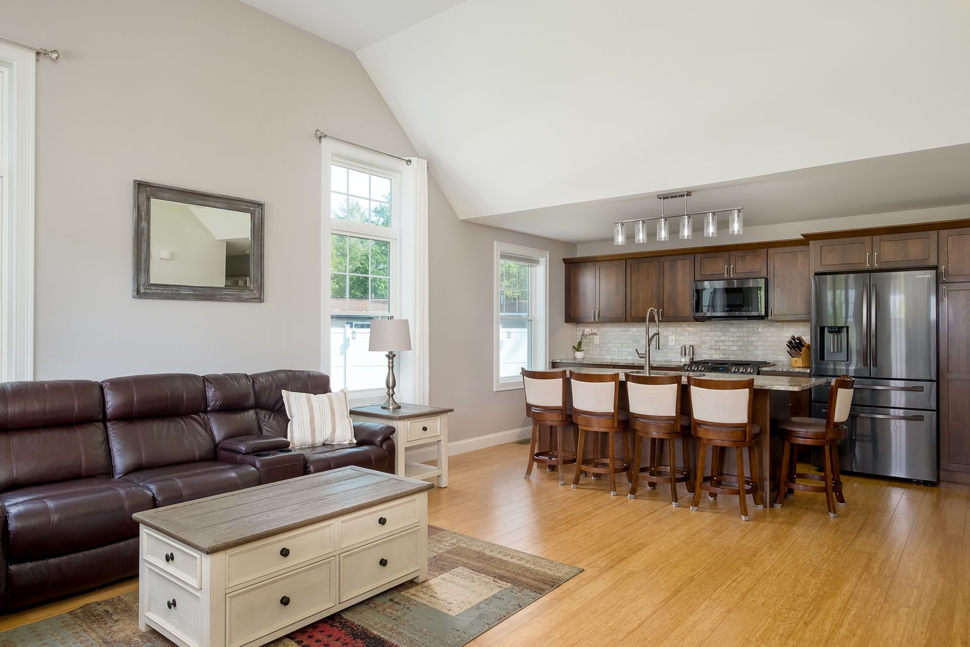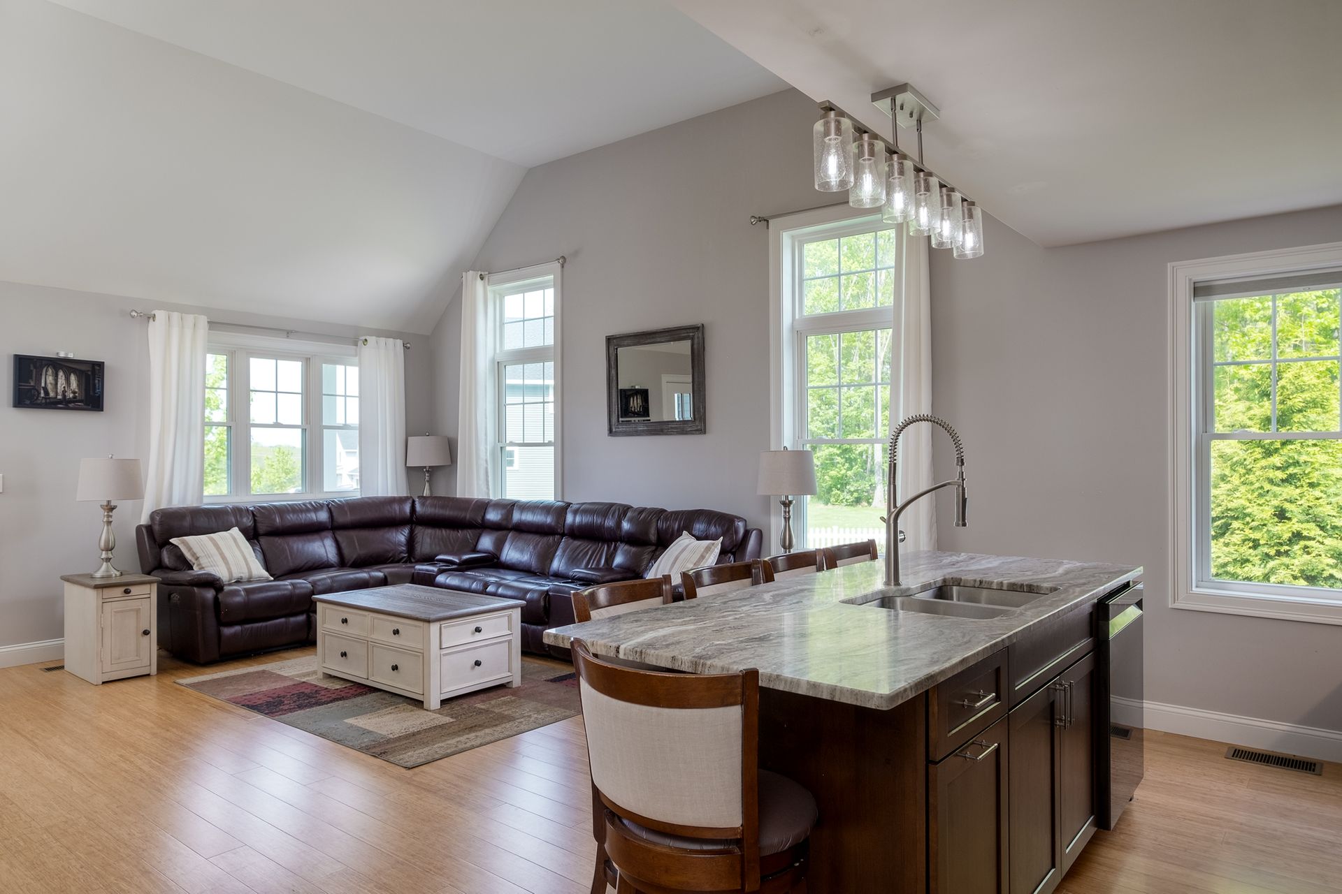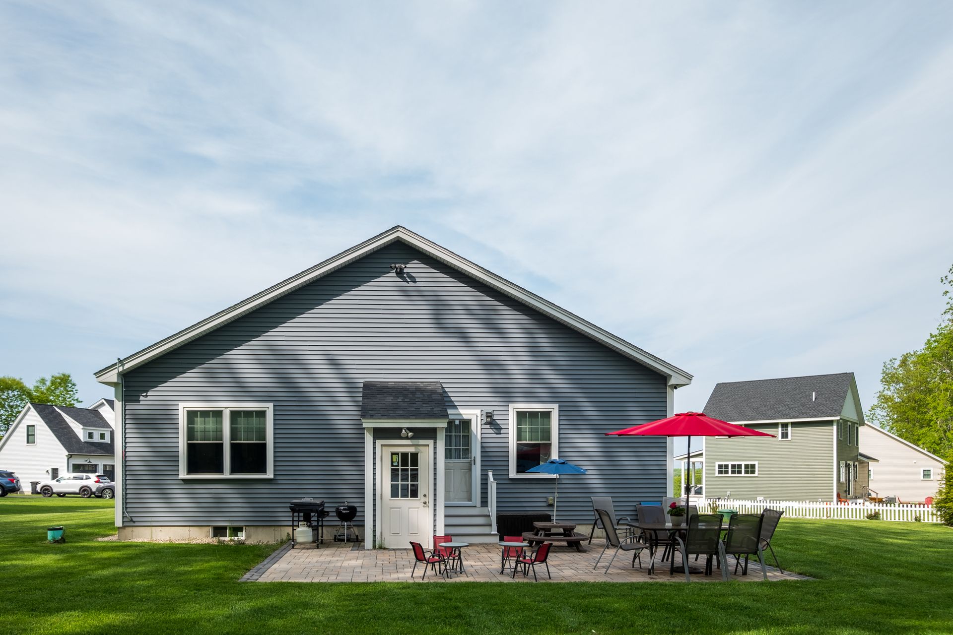 First-floor living in this exquisite Ranch-style home in desirable South Dover Point, NH. Nestled at the end of a tranquil cul-de-sac in Beaumont Village, it overlooks picturesque farmland and offers convenient access to major commuting roads connecting Portland, Boston, and Nashua. The home features two bedrooms and two full baths, providing ample space for comfortable living. As you step inside, bamboo floors lead to a spacious living area with expansive windows and a beautifully appointed high shed ceiling. The well-designed kitchen boasts stainless steel appliances, elegant granite countertops, warm wood cabinets, and a tiled backsplash. Primary bedroom includes an ensuite bathroom with double vanity, and custom-tiled walk-in shower with a heated floor. The partially finished full-size basement includes an entertainment-ready bar, workshop, and ample storage. An attached two-car garage adds convenience. Outside, an expansive lawn features a generous stone patio for outdoor gatherings. Enjoy breathtaking sunsets from the front covered cottage porch. This eco-friendly home is equipped with new solar panels, an on-demand hot water heater, thermal doors and windows and central air conditioning. Don’t miss this opportunity to make it yours!